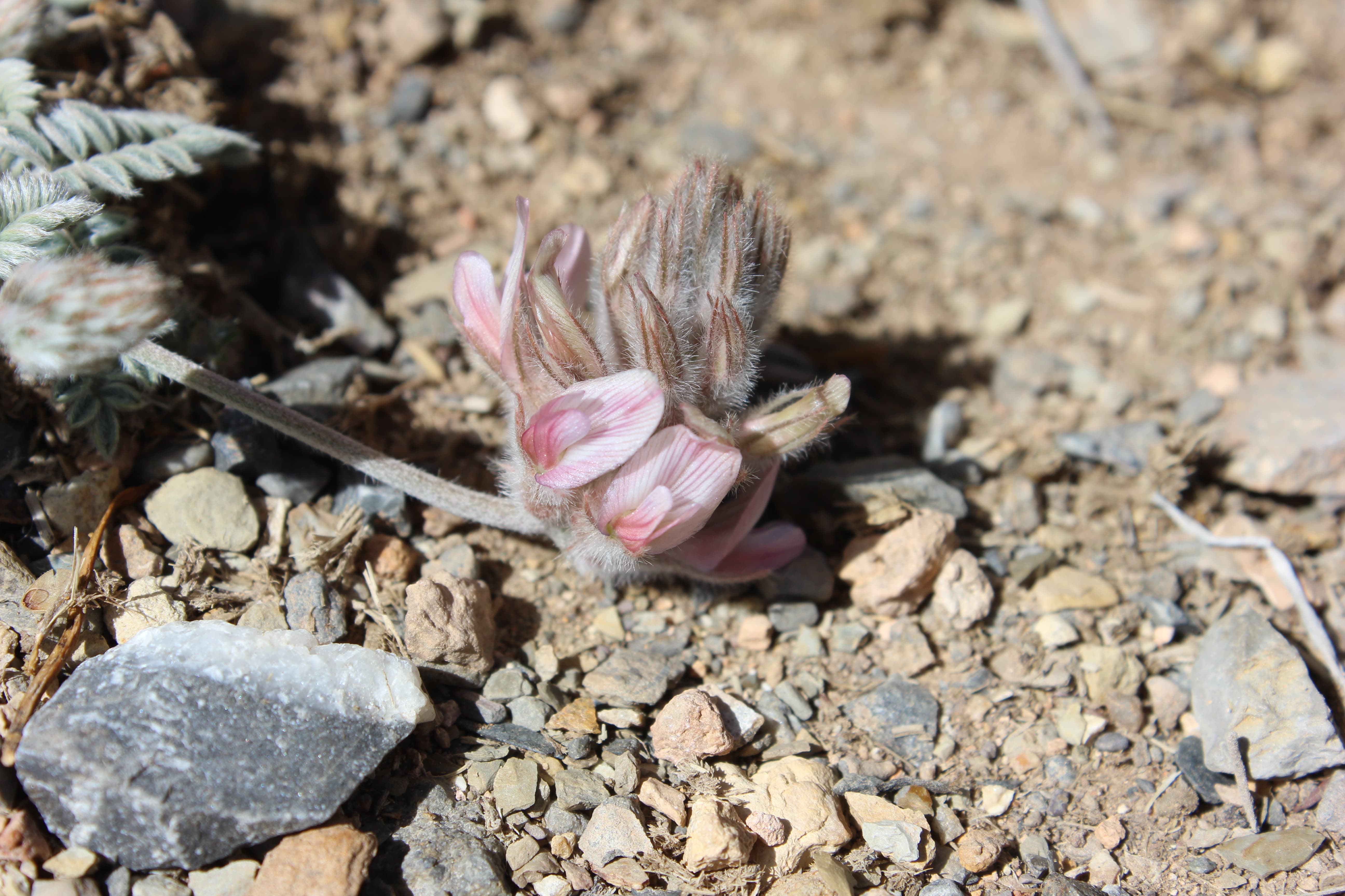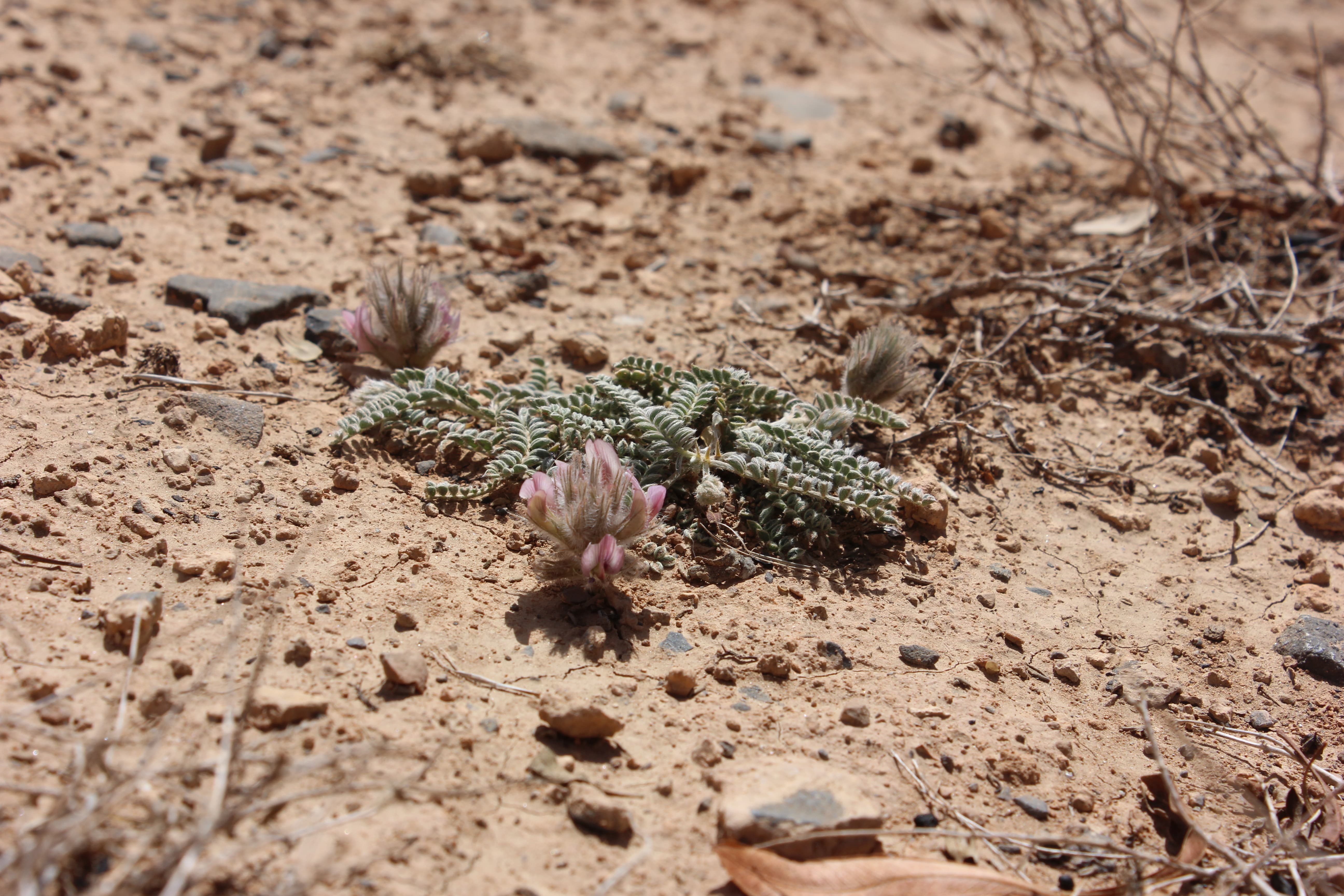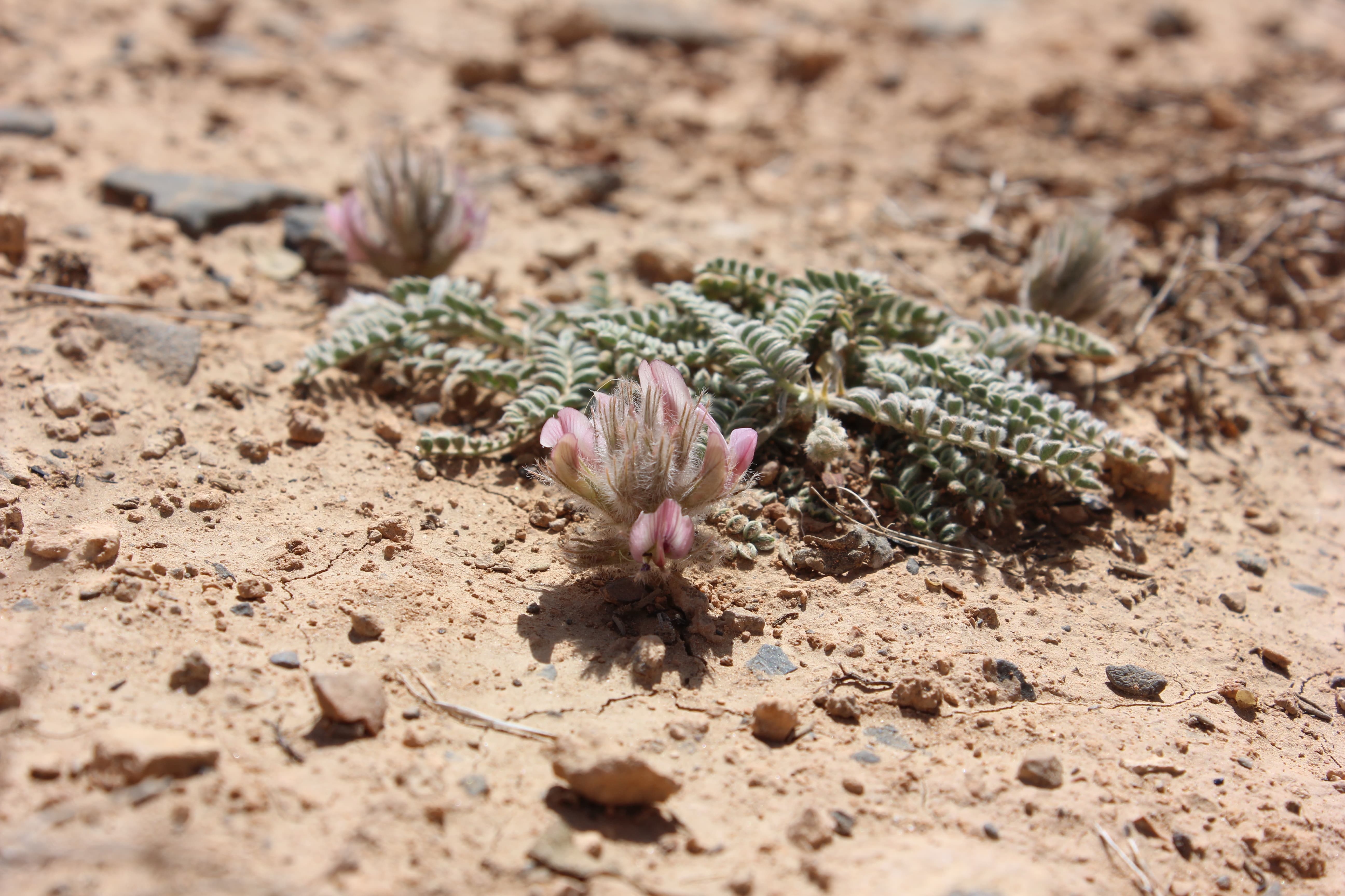 Annual herb with a woody rootstock . Stems short , the whole plant densely white-pilose . Leaves 3-4 , arising from the base , paripinnate , 6-8 cm long with 12-17 pairs of leaflets ; leaflets 5-8 x 2-3 mm , apical leaflets smaller in size , elliptic , white-pilose on both surfaces . Inflorescences with short pedicels , in pedunculate spicate heads . Flowers pink-purple ; calyx 12-15 mm , 5-lobed , lobes linear , about as long as the calyx tube and almost reaching the corolla , densely pilose ; corolla pink-purple , 12-15 mm . Fruit pod . (Ref . Flora of Oman ; vol . 2) .