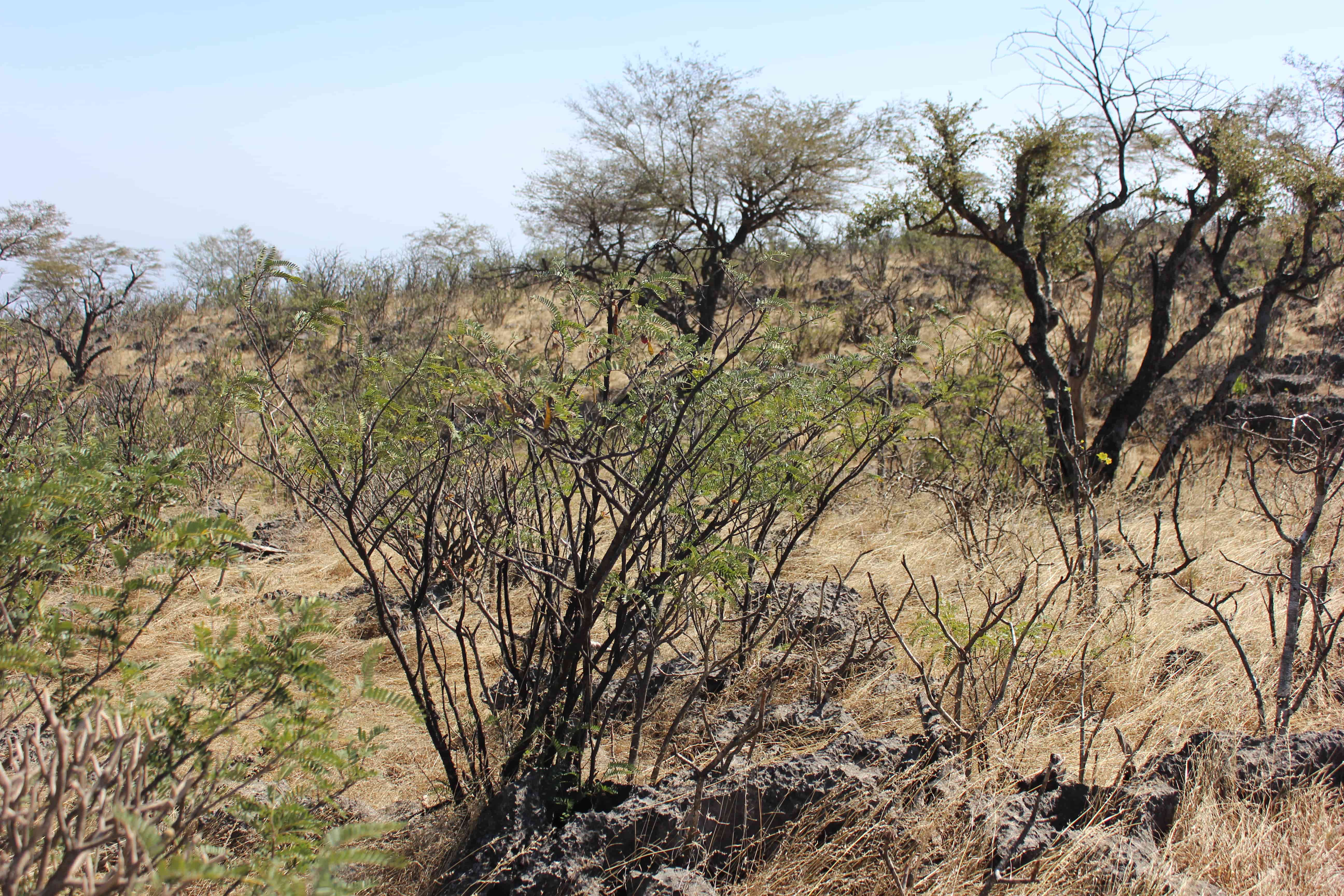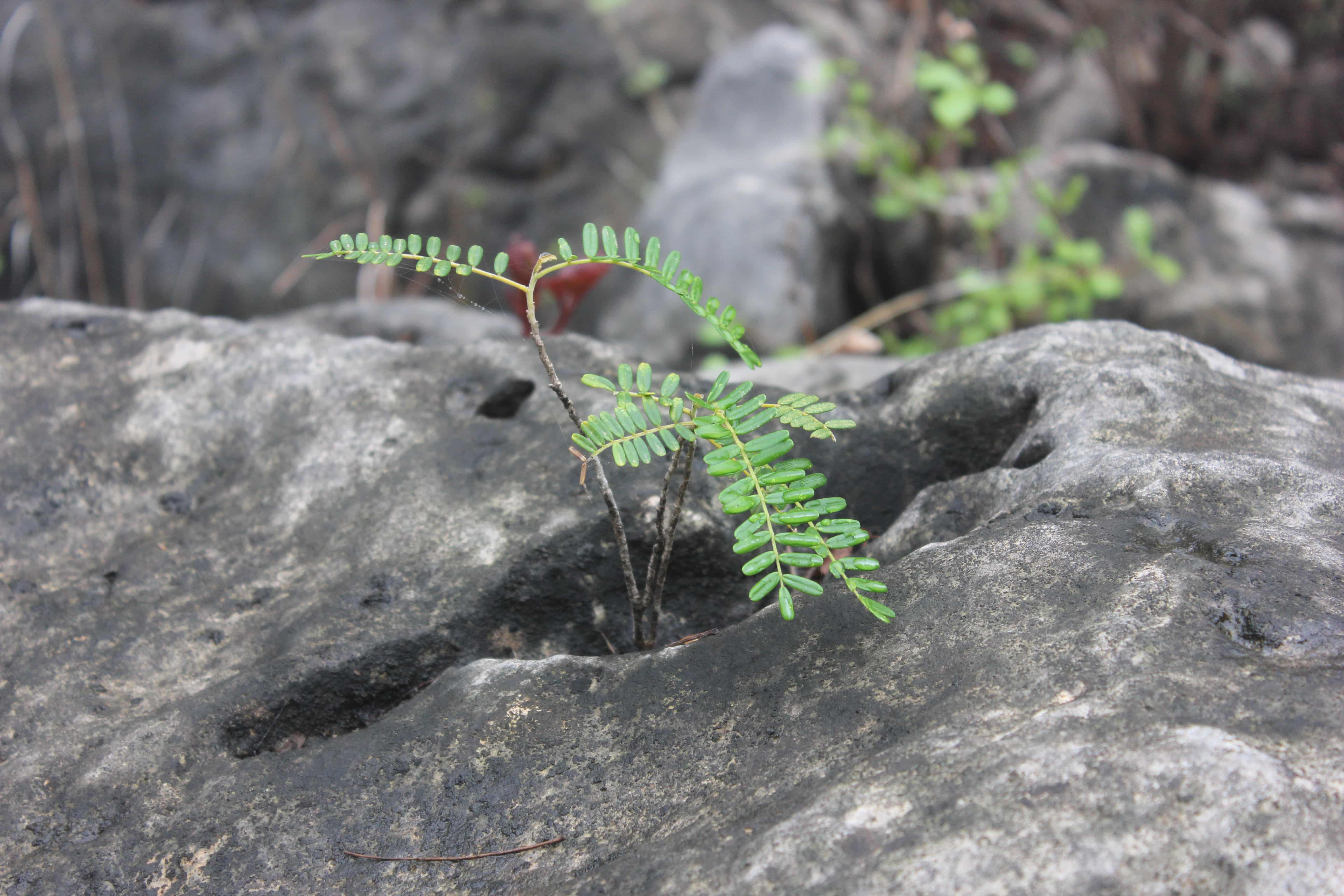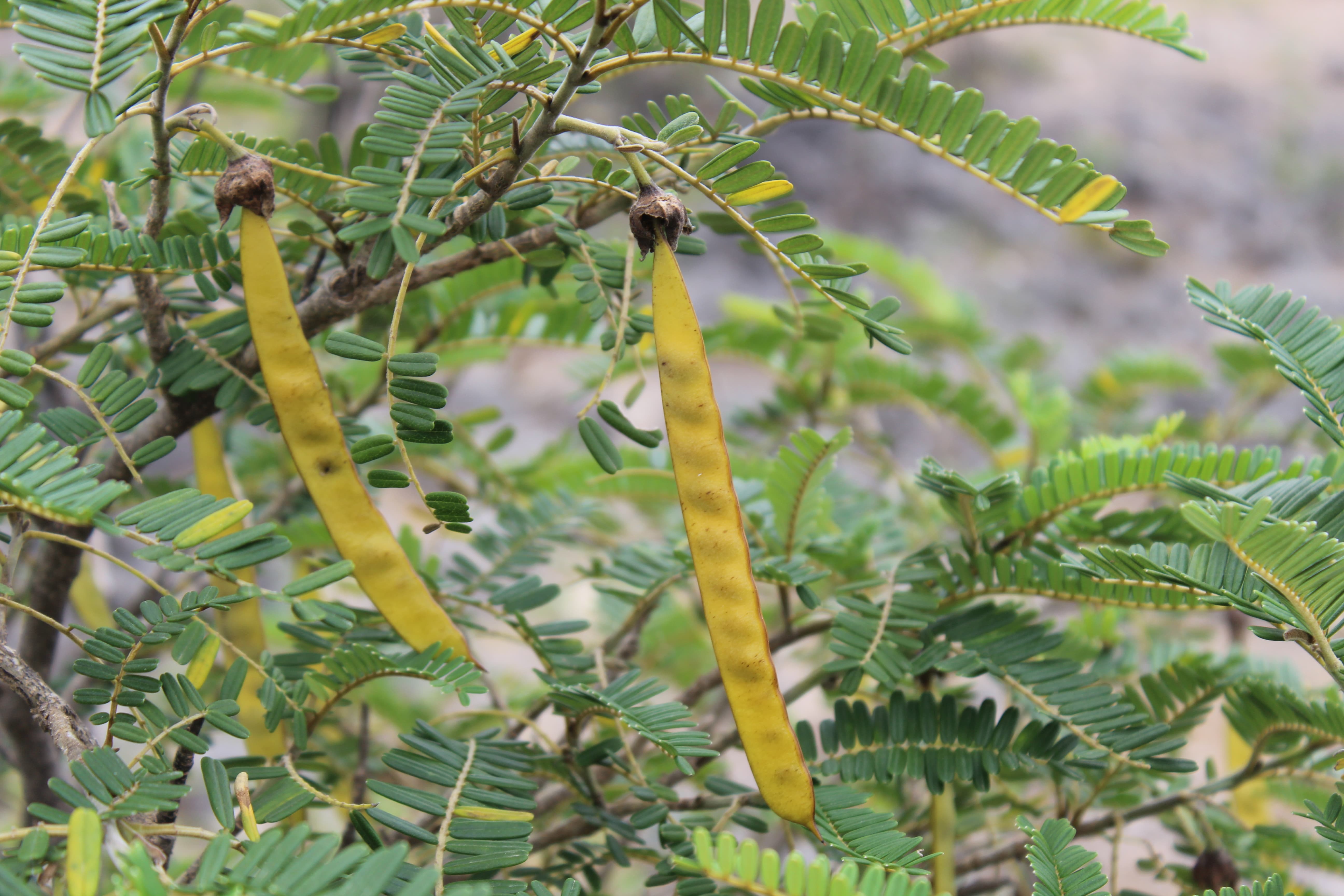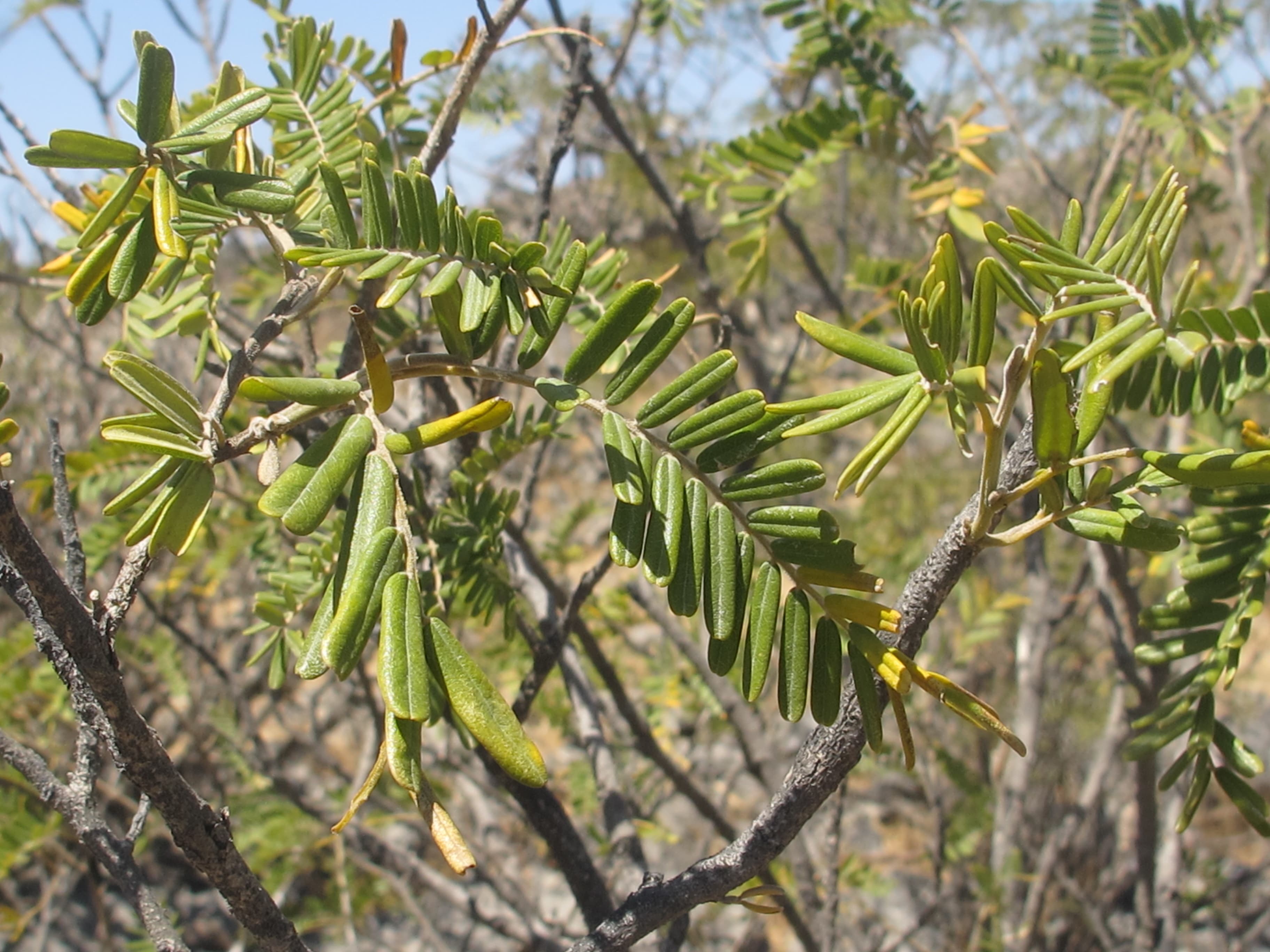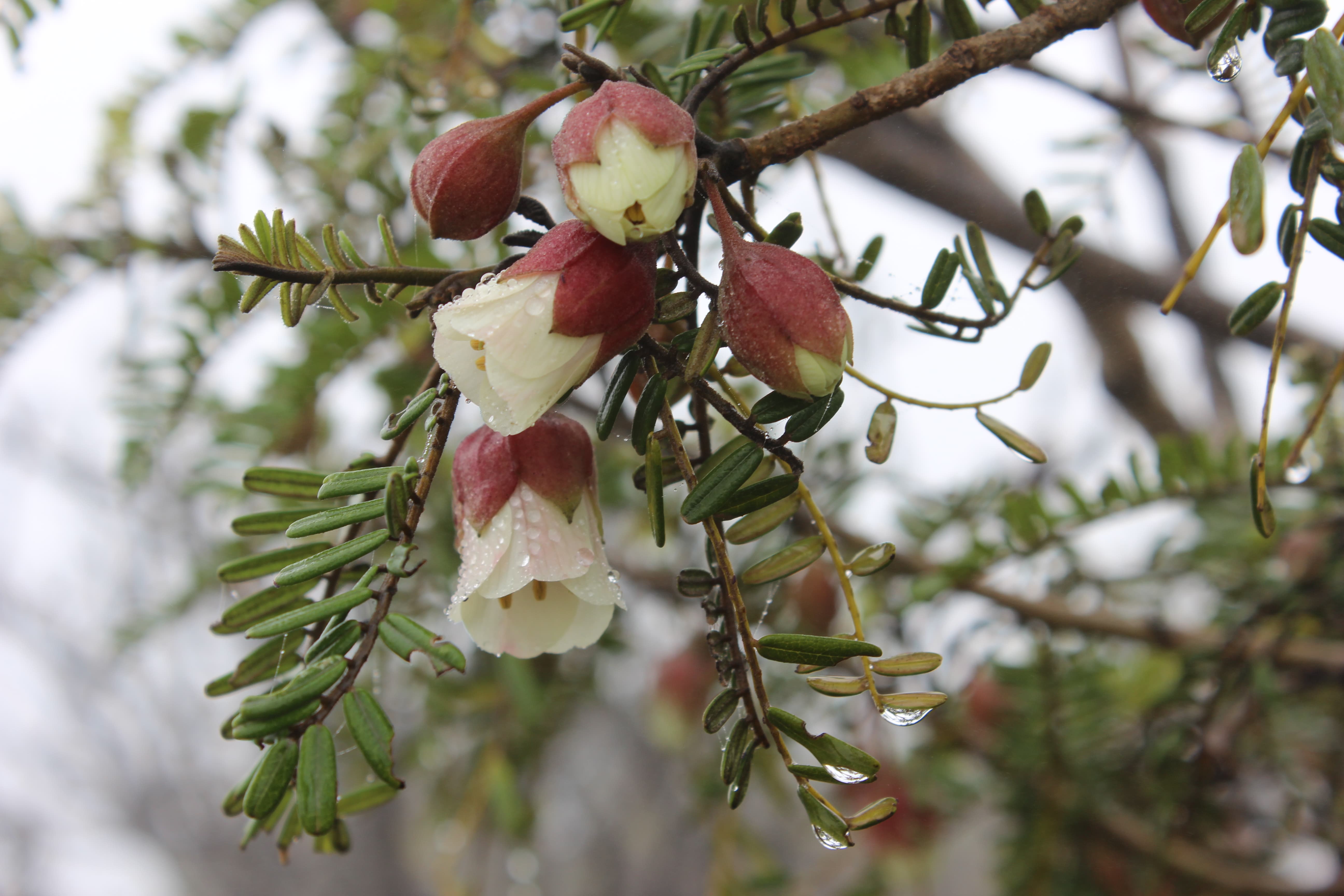 Unarmed shrub ; up to 1 . 5 m tall , with brown bark with narrow longitudinal cracks . Stems branched , leafy ; twigs brown , shortly appressed pubescent . Leaves imparipinnate with up to 50 pairs of leaflets ; leaflets 10-15 x 2-3 mm , opposite , subopposite or alternate on petiolules 1 mm long , oblong , emarginate at the apex , dark green and glabrous above , pale green and puberulous beneath on the midrib and margins , the terminal leaflet oblong-cuneate . Inflorescences on axillary short shoots 1–2 cm long hanging singly in the axils of one or more of the 2–4 bracts . Flowers pendulous ; calyx campanulate , 9-10 mm , lobes triangular , puberulous , dull pink ; petals oblong , subequal , 30 mm , white to cream aging pink to reddish , falling soon ; filaments borne on the rim of the receptacle , glabrous ; anthers 3 mm long ; ovary pale green , glabrous , ± 12 mm . long ; ovules 11–12 , transverse . Fruit pods , 12-13 x 1 . 1-1 . 3 cm , straight or slightly curved , glabrous ,