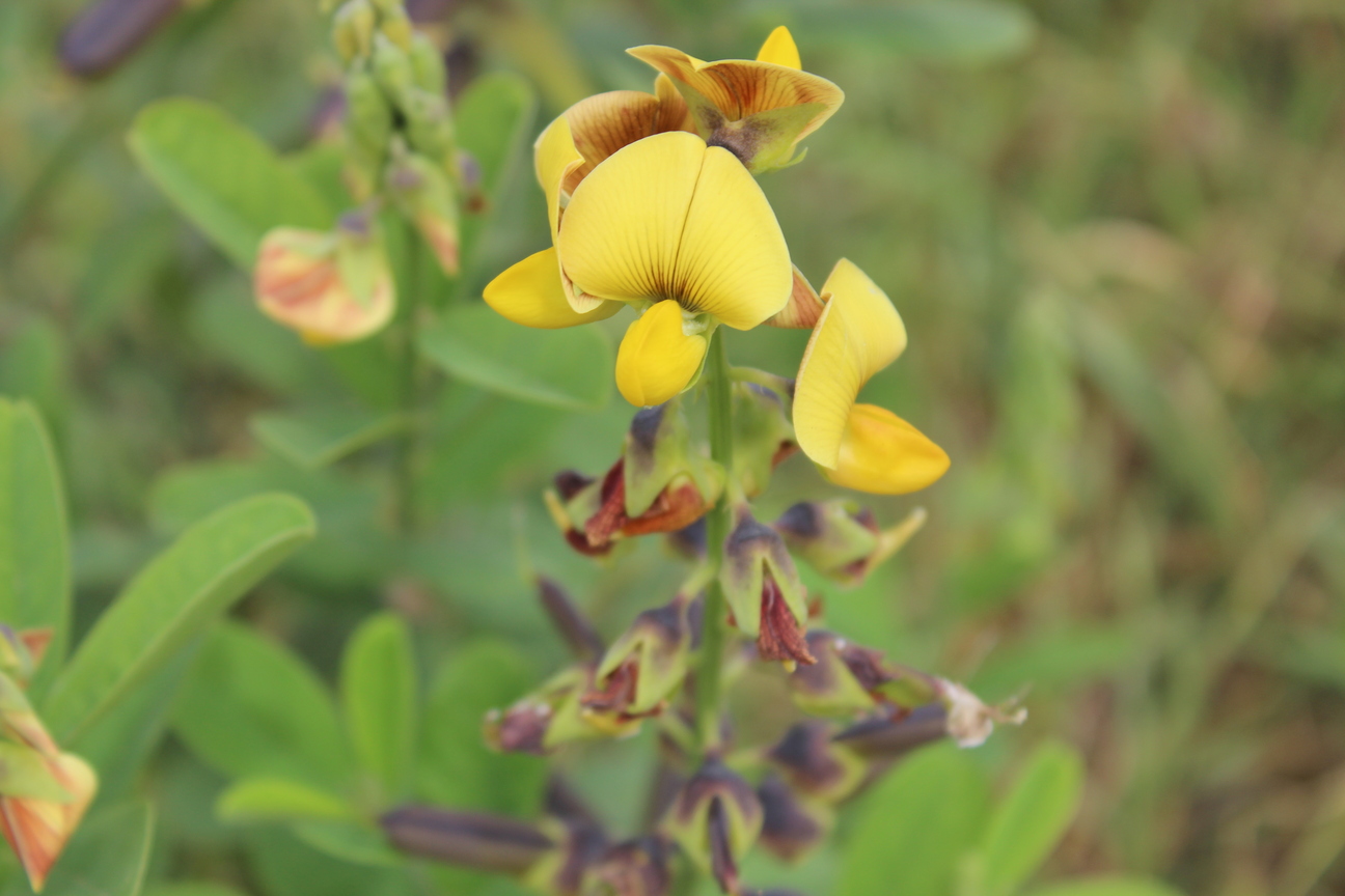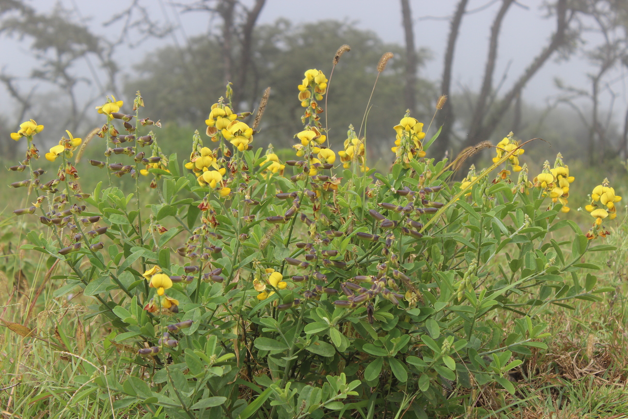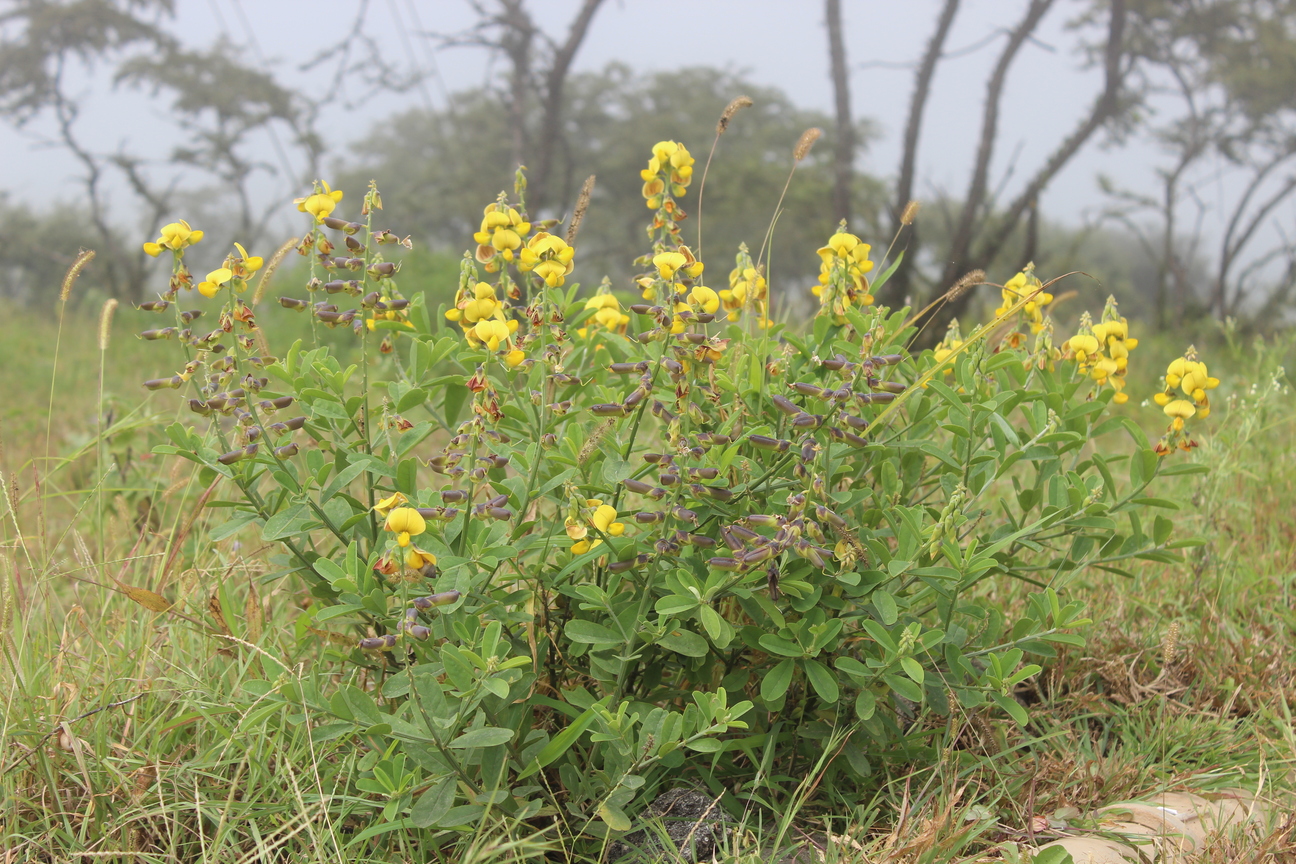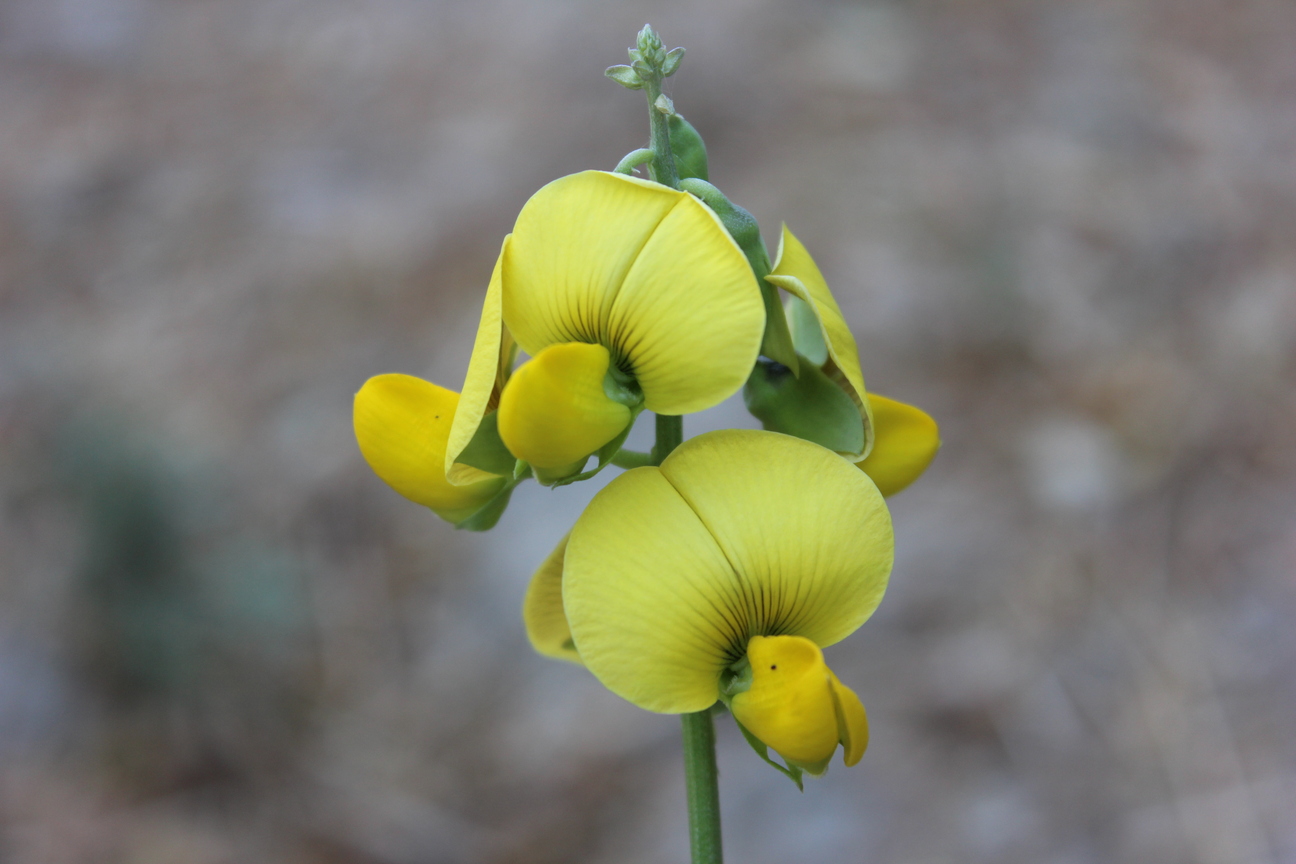 Bushy perennial ; up to 150 cm tall . Stems erect , woody , ribbed , unbranched , appressed pubescent . Leaves alternate , simple , 3-7 x 0 . 9-2 cm , oblong-obovate , rounded or emarginate at the apex , with entire margins , glabrous above , finely puberulous beneath . Inflorescences racemes 10–30 cm long , many-flowered . Flowers pea-like with red veins ; calyx 7-20 mm , 2-lipped , the upper lobes bigger , triangular-acute , appressed pubescent , persistent ; corolla with standard petal ± 2 cm , yellow with brown-red veins ; keel rounded , ± 15 mm , beak twisted ; stamens all joined with 5 long and 5 short anthers . Fruit pods , 30-35(-5) x ± 10 mm , blong , inflated , beaked , glabrous , reddish-brown , with many seeds , borne along the branches . Seeds c . 5–5 . 5 mm long , yellowish or brown , oblique-cordiform , with the narrow end strongly incurved , finely papillose . (Ref . Flora of Oman ; vol . 2) .