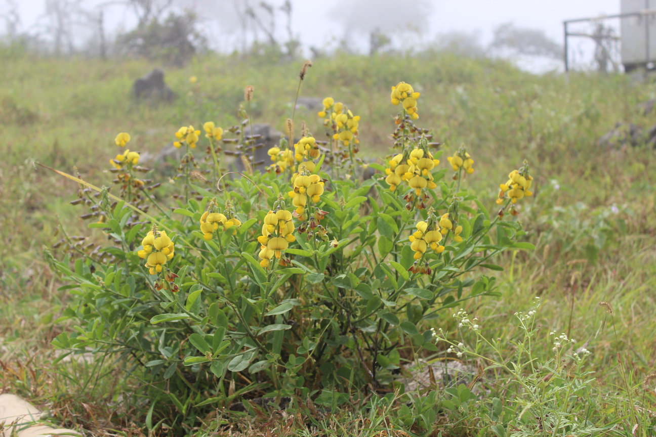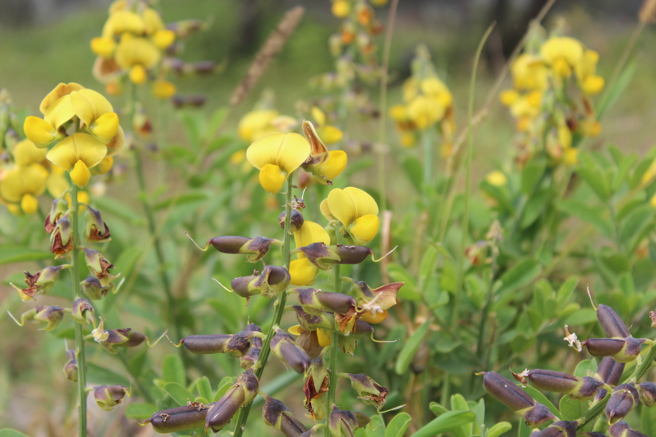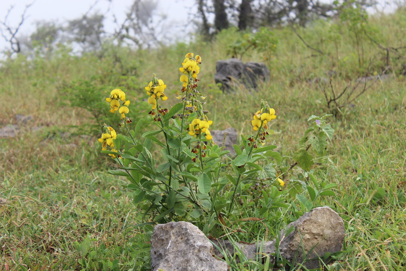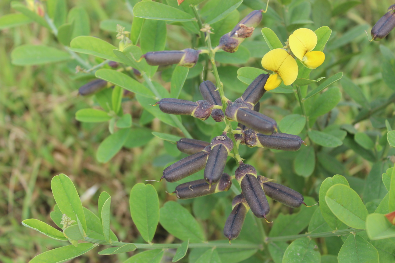 Bushy perennial ; up to 150 cm tall . Stems erect , woody , ribbed , unbranched , appressed pubescent . Leaves alternate , simple , 3-7 x 0 . 9-2 cm , oblong-obovate , rounded or emarginate at the apex , with entire margins , glabrous above , finely puberulous beneath . Inflorescences racemes 10–30 cm long , many-flowered . Flowers pea-like with red veins ; calyx 7-20 mm , 2-lipped , the upper lobes bigger , triangular-acute , appressed pubescent , persistent ; corolla with standard petal ± 2 cm , yellow with brown-red veins ; keel rounded , ± 15 mm , beak twisted ; stamens all joined with 5 long and 5 short anthers . Fruit pods , 30-35(-5) x ± 10 mm , blong , inflated , beaked , glabrous , reddish-brown , with many seeds , borne along the branches . Seeds c . 5–5 . 5 mm long , yellowish or brown , oblique-cordiform , with the narrow end strongly incurved , finely papillose . (Ref . Flora of Oman ; vol . 2) .