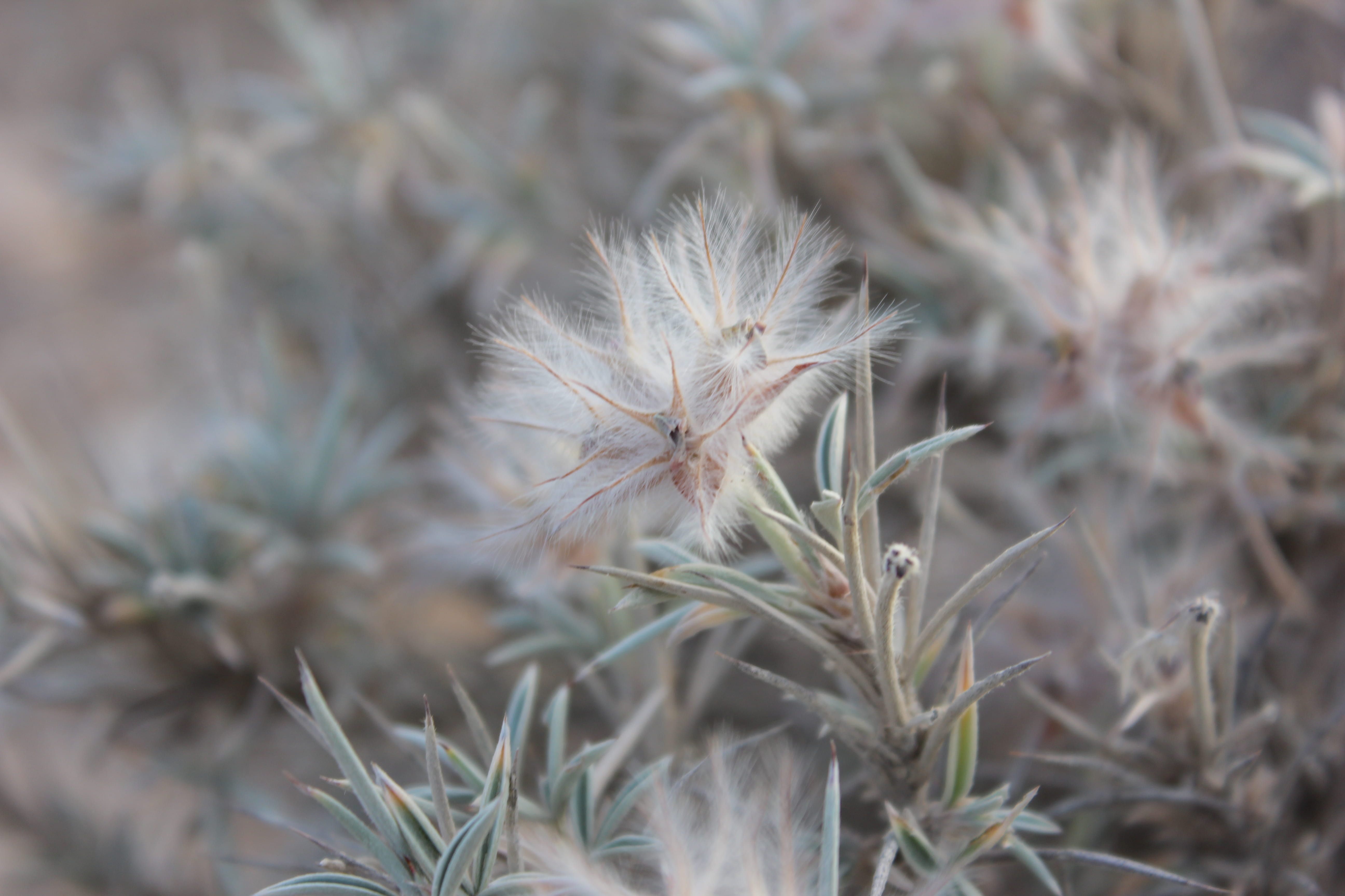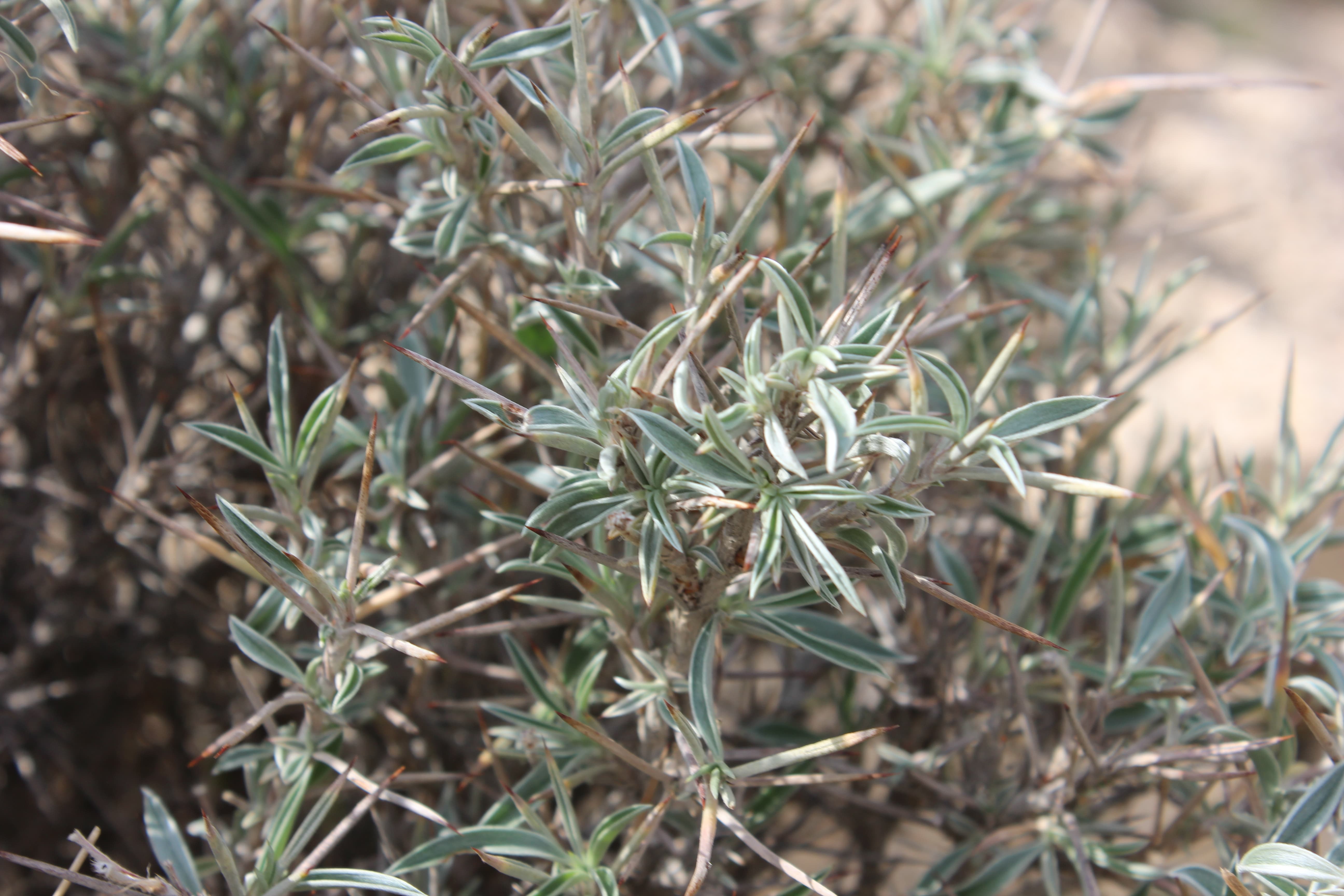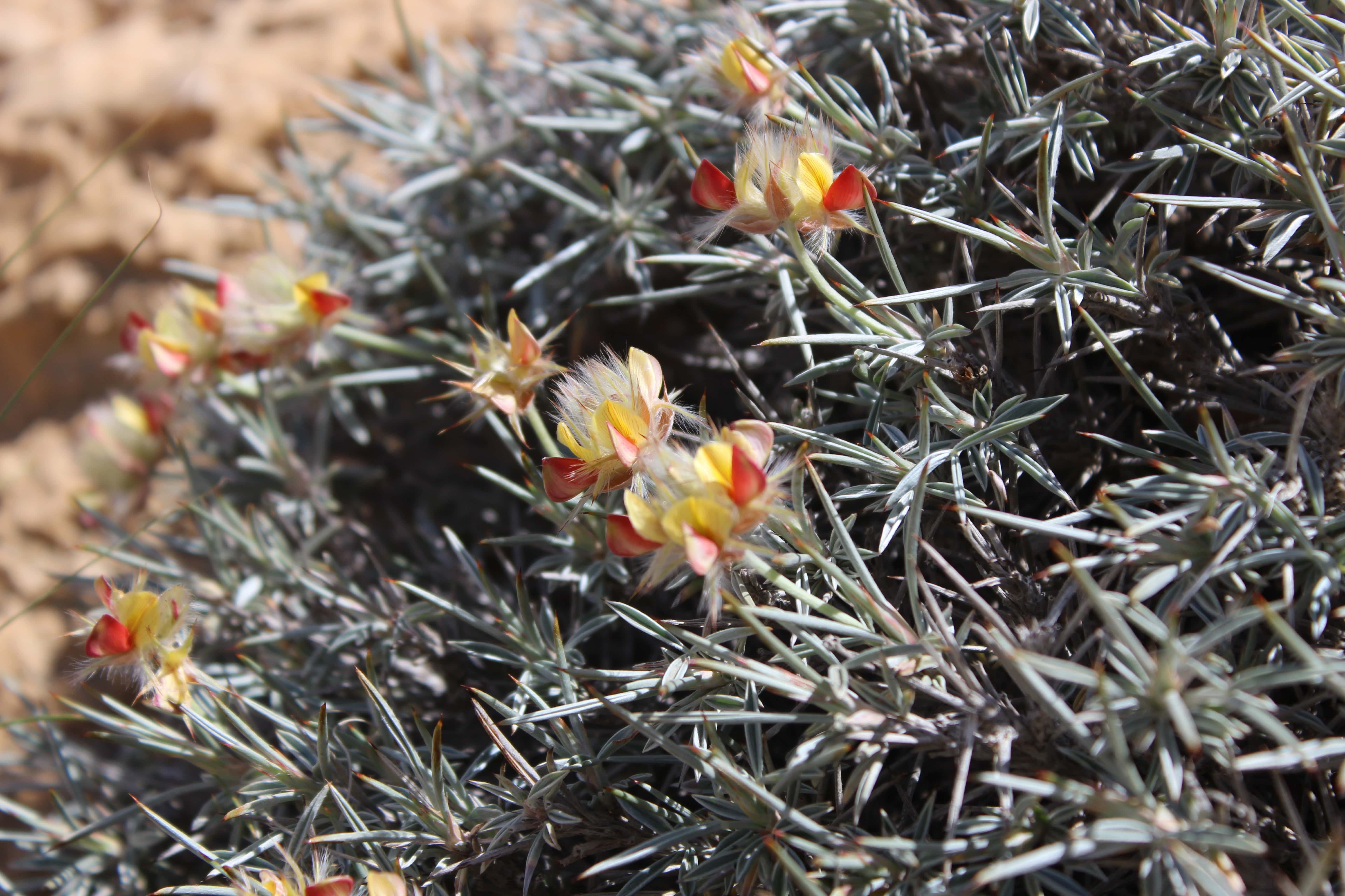 Cushion-forming subshrub ; up to 75 cm high , all parts brown or grey silky . Stems grey-white , hairy . Leaves (1-)3(-5)-foliolate , 15-25 x 1-1 . 5 mm , linear-lanceolate , tip spiny , entire , glaucous , densely pubescent on both sides . Inflorescences an axillary peduncled head ; peduncle 3-8 cm long . Flowers sessile , orange to red-yellow , wings yellow-orange , surrounded by an involucre of spine-tipped bracts ; calyx linear-lanceolate , pilose ; corolla with standard petal 5-6 mm , orange with red lines , wings yellow-orange , keel pale yellow . Fruit pod , 9-10 mm , flat , oblong , membranous , indehiscent , brown , enclosed in calyx , 1-seeded . (Ref . Flora of Oman ; vol . 2) .