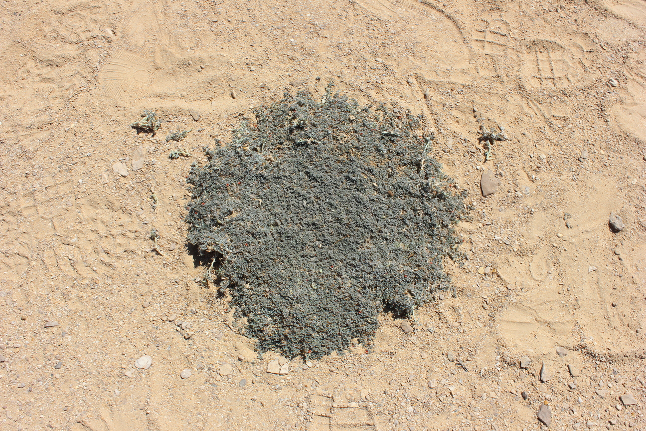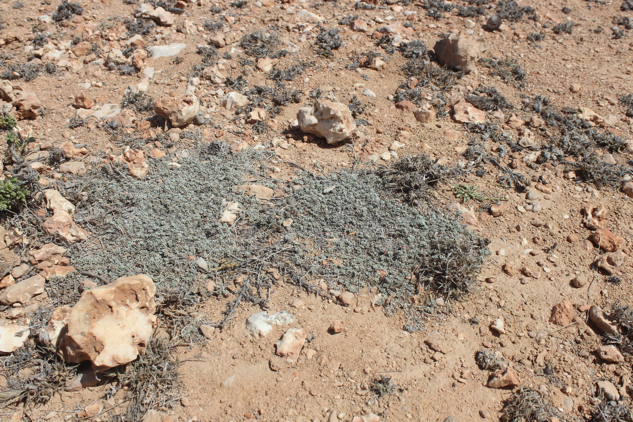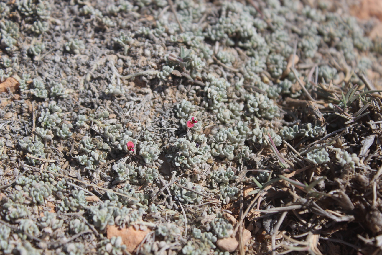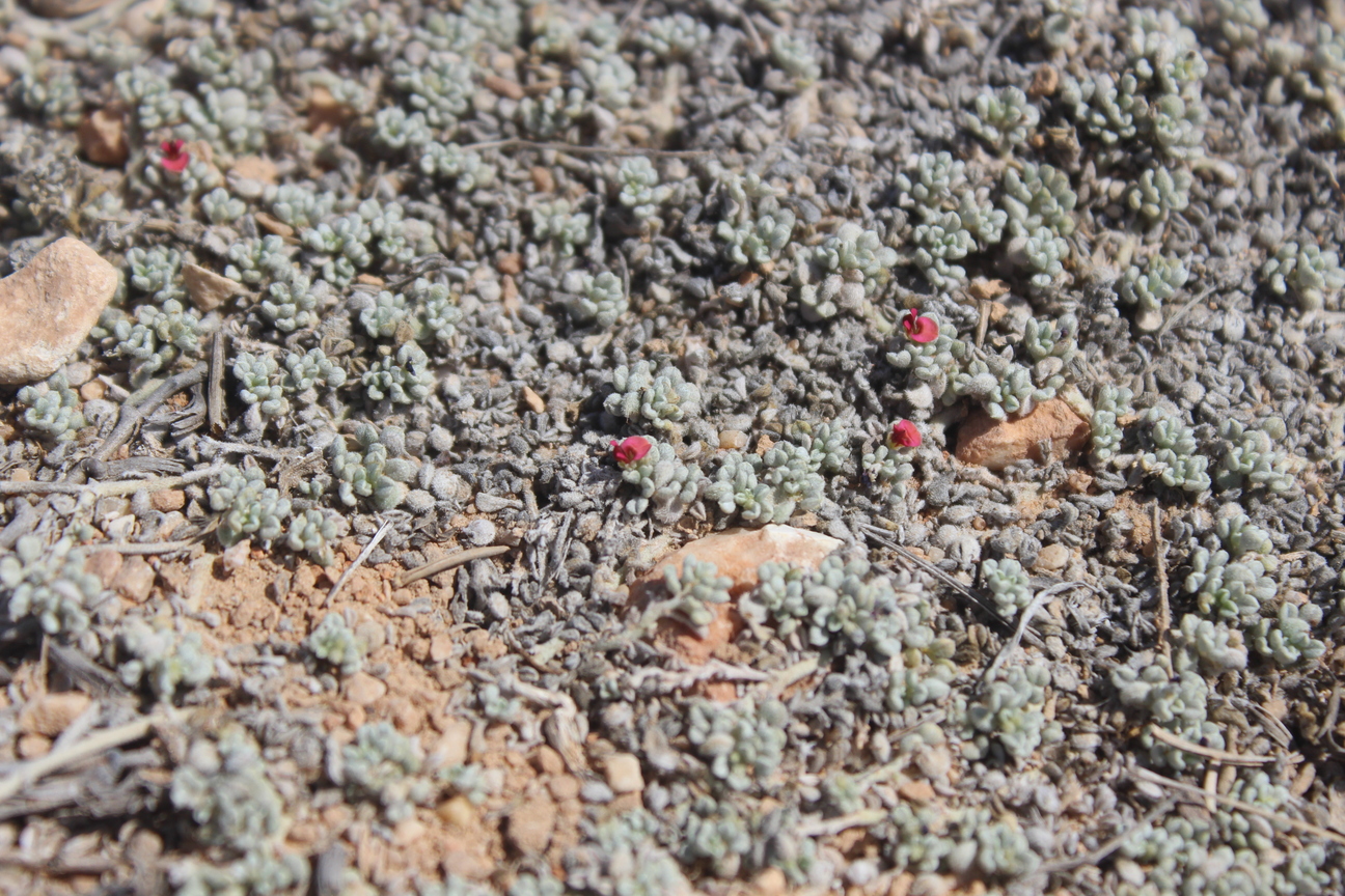 Annual herb often with a woody stock or a perennial herb with annual stems ; up to 30 cm long , the whole plant appear grey-green , appressed white-hairy . Stems ascending to prostrate , diffusely branched from the base . Leaves opposite , imparipinnate with 3-5 leaflets , or sometimes 1-foliolate ; leaflets 7-15 x 4-5 mm , oblong to oblong-lanceolate to obovate or elliptic , entire margins , obtuse often with a short mucro , base tapering , white-hairy . Inflorescences in axillary racemes , short peduncled , shorter than the leaf . Flowers ± sessile , red ; calyx sessile ± 1 mm , acute , densely white-hairy ; corolla with the standard ± 2 mm ; stamens c . 4 . 5 mm long . Fruit pods , 5-8 x 3-5 mm , flattened , grey-green , beaked , 2-5-seeded . (Ref . Flora of Oman ; vol . 2) .