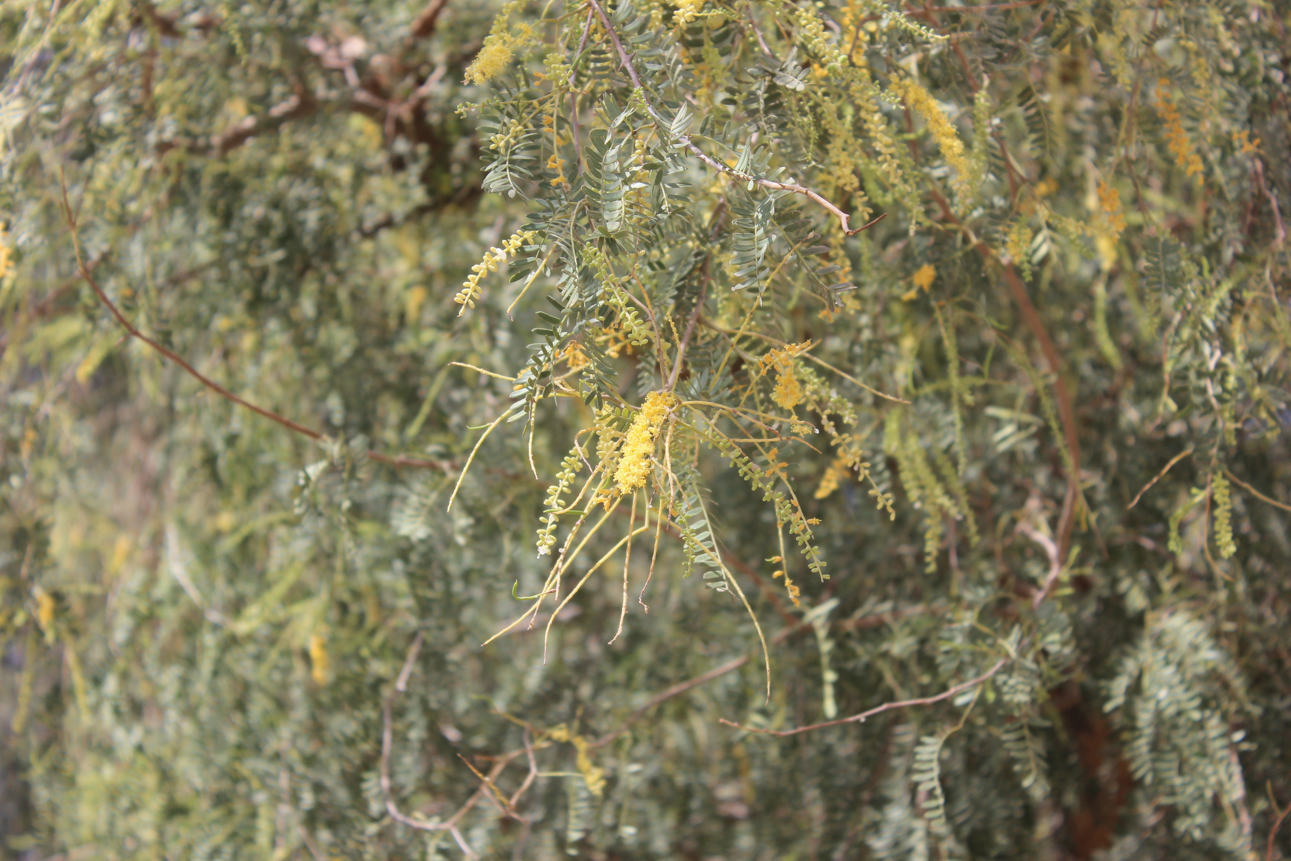 Large , evergreen tree ; up to 10 m high , with a dense often rounded crown , and fissured , thick , rough , grey bark . Stems and branches droop and bear many short spines between the leaf nodes . Leaves alternate , grey-green , drooping on the branches , compound , divided into two pinnae each with 6-16 paired leaflets . Inflorescences on cylindrical spikes borne in leaf axils ; spikes up to 5 cm long . Flowers small , pale yellow ; calyx 5-lobed ; stamens 10 , exserted . Fruit pod , 8-18 x 7-10 mm , reddish brown when mature , slightly curved , 5-15-seeded . (Ref . Flora of Oman ; vol . 2) .
