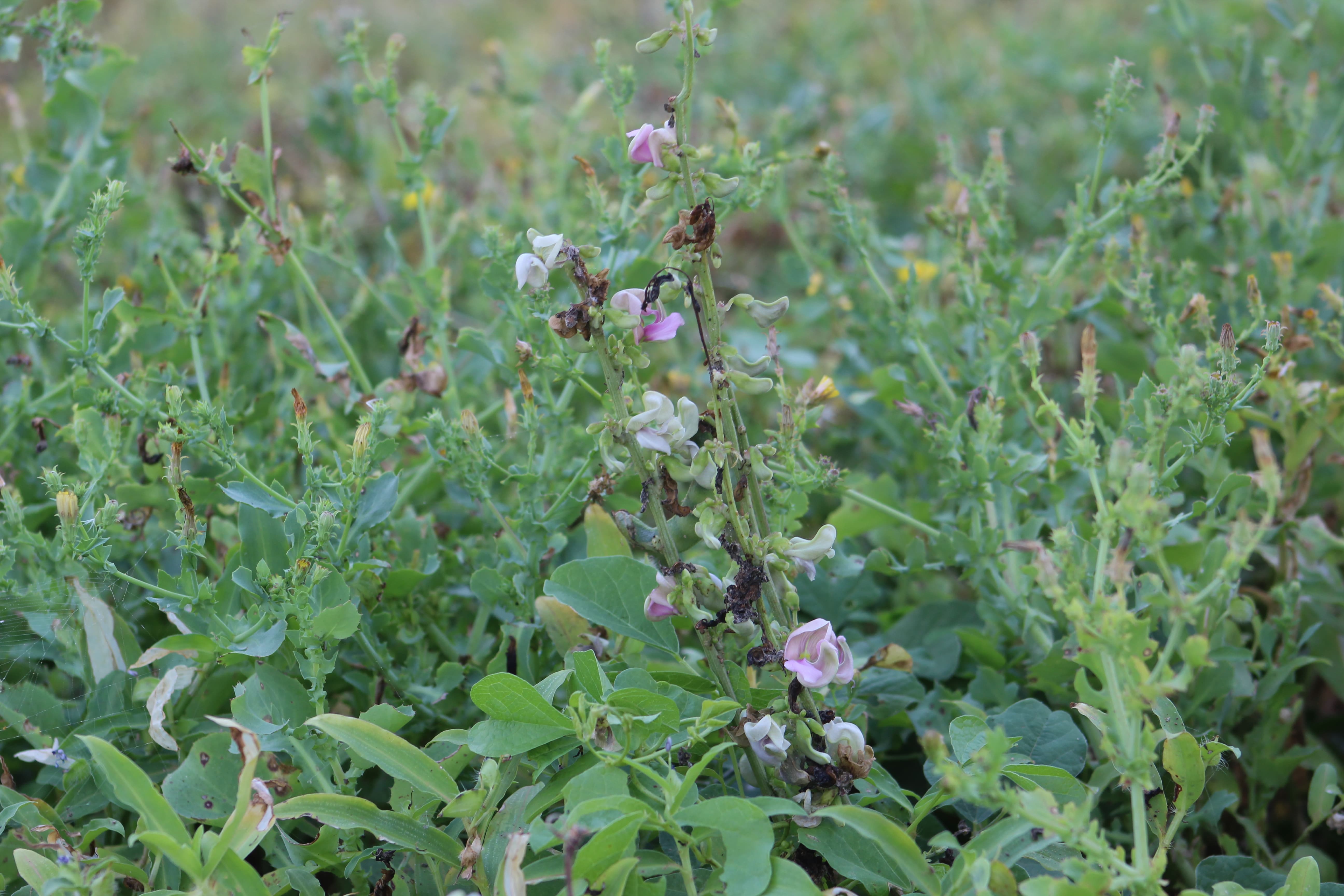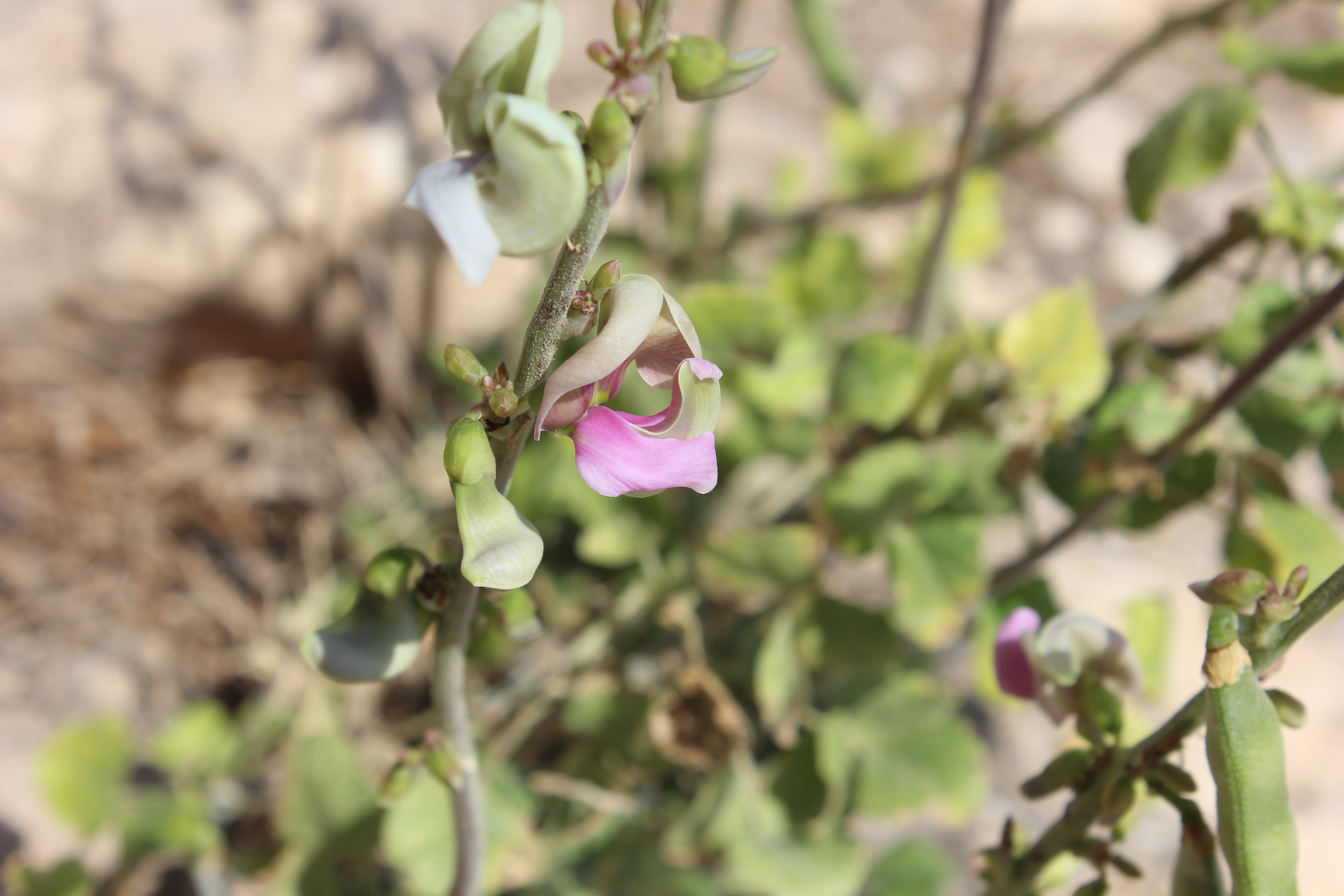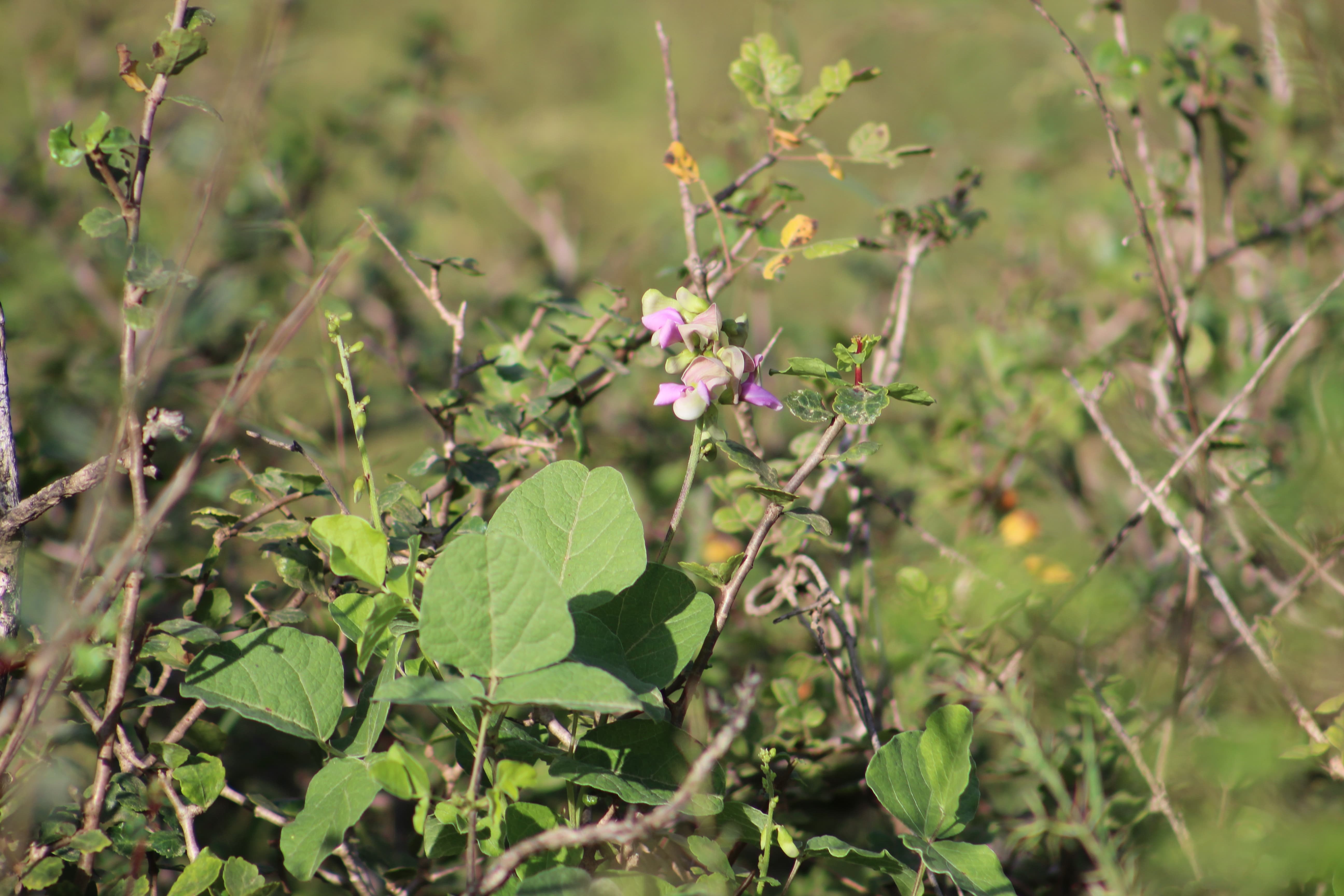Climbing perennial herb ; up to 1(-2)m long , woody below . Stems arising from a large tuber , branched , often pale reddish-brown , sparsely pubescent . Leaves 3-foliolate ; petiole up to 4 cm ; stipules ± 3 . 5 mm , oblong ; stiples minute ; leaflets up to 6 x 5 . 5 mm , ovate to ovate-rhomboid , apex rounded to acute , base oblique , sparsely appressed pubescent to glabrous . Inflorescences in erect , axillary racemes up to 30 cm long ; pedicels ± 2 mm . Flowers pale green to pink to pink-purple , twisted , c . 15 mm long ; calyx 2 . 5-3 mm , lobes ± 2 . 5 mm , upper two joined , ± emarginate , lower 3 rounded to ovate ; corolla with standard petal rotund , 18-20 mm long and broad , emarginate with 2 stiff appendages at base ; keel pale green , resupinate ; stamens 9 joined and vexillary stamen free ; style curved , hairy inside towards the apex , with a small reflexed appendage at the apex . Fruit pod , 6-7 x 1-1 . 5 mm , flattened , linear-oblong ,