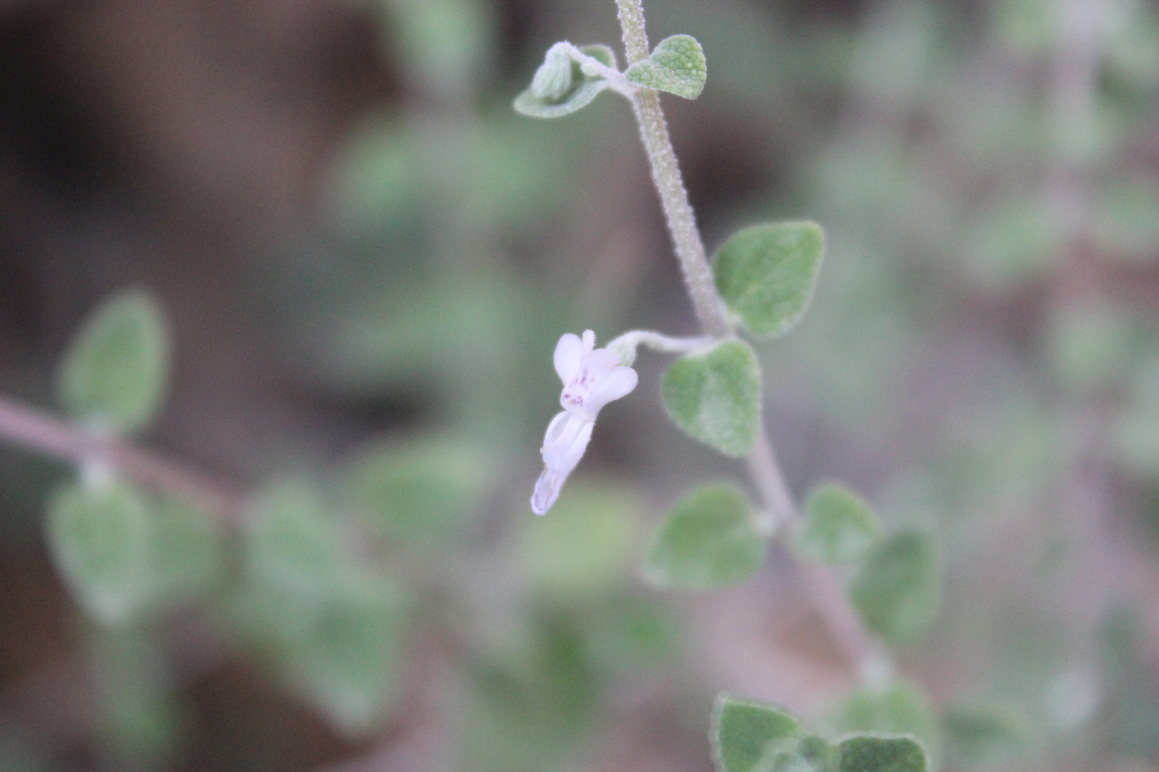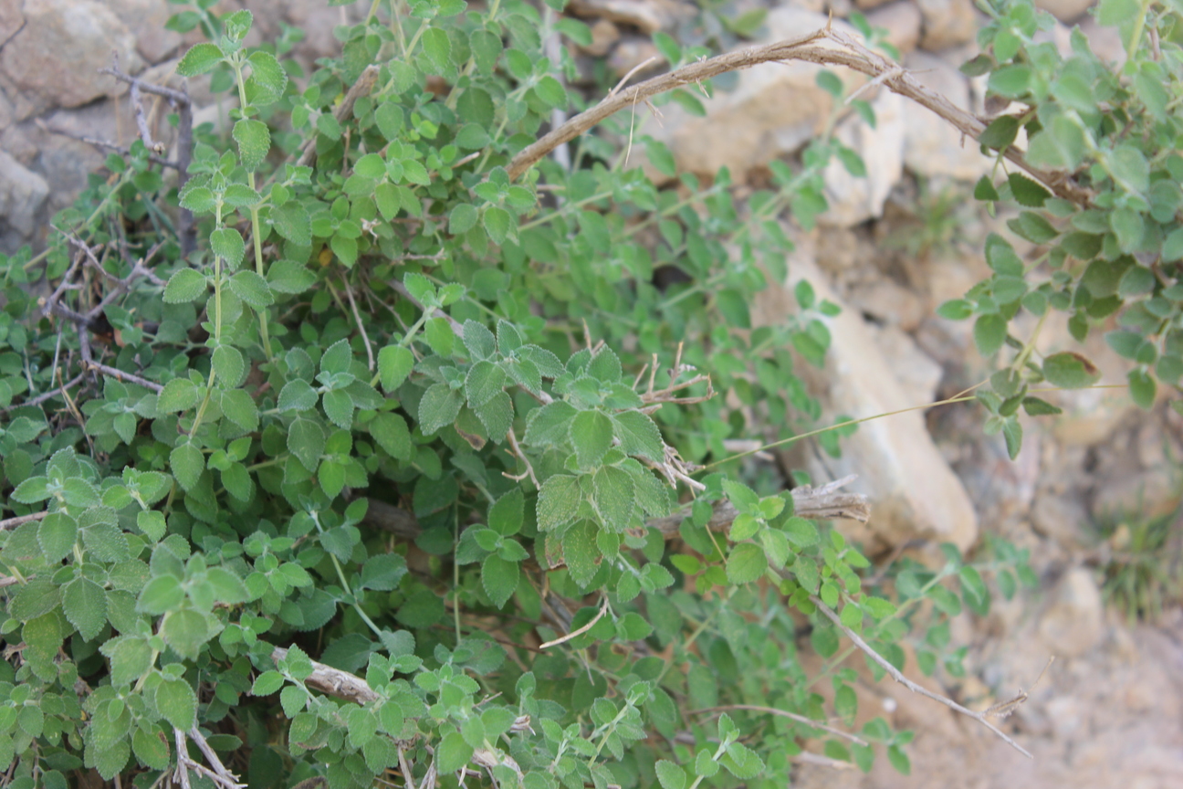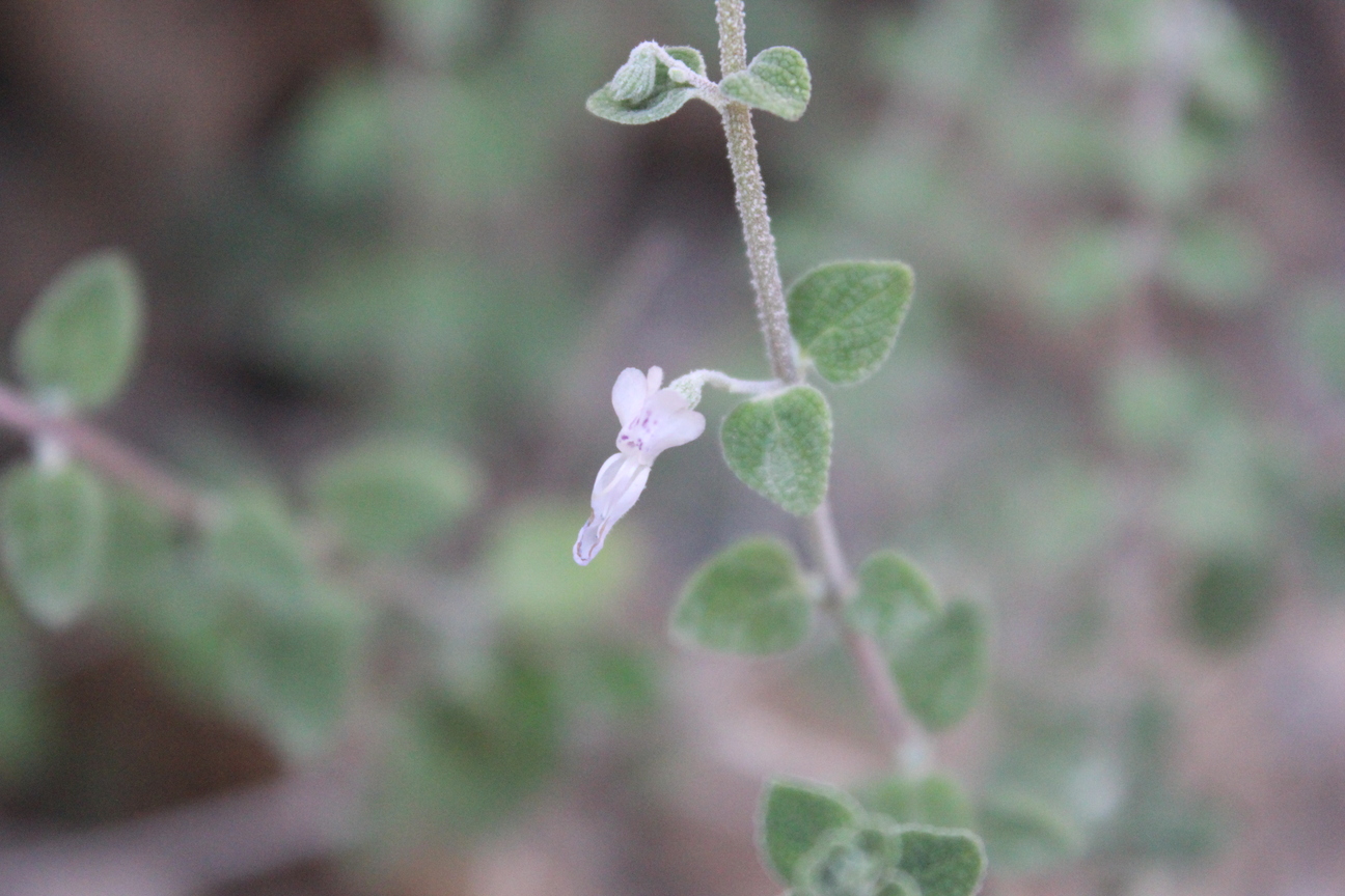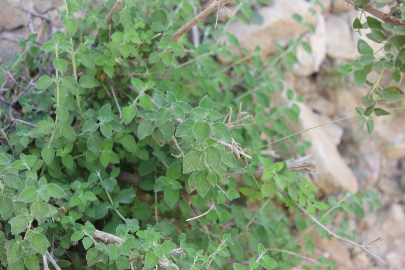 Aromatic shrub ; up to 100 cm tall . Stems erect , much branched , densely stellate tomentose ; branches , slender , quadrangular , leafy . Leaves opposite , broad-ovate to elliptic , rugose , usually green or dark above , densely tomentose , obtuse apex , broadly cuneate to rounded base , crenulate margin ; petiole up to 2 . 5 cms , usually much less . Inflorescences borne in cymes on slender lateral branches , lax , forming often leafy racemes . Flowers white tinged or spotted pink ; calyx 2-3 . 5 mm , campanulate ; teeth short , subequal , broad triangular ; corolla white tinged or spotted pink or violet . Fruit nutlets , 1 . 5 x 1 mm , pale to dark brown , oblong , triquetrous , glabrous , mucilaginous on wetting . (Ref . http://www . efloras . org) .