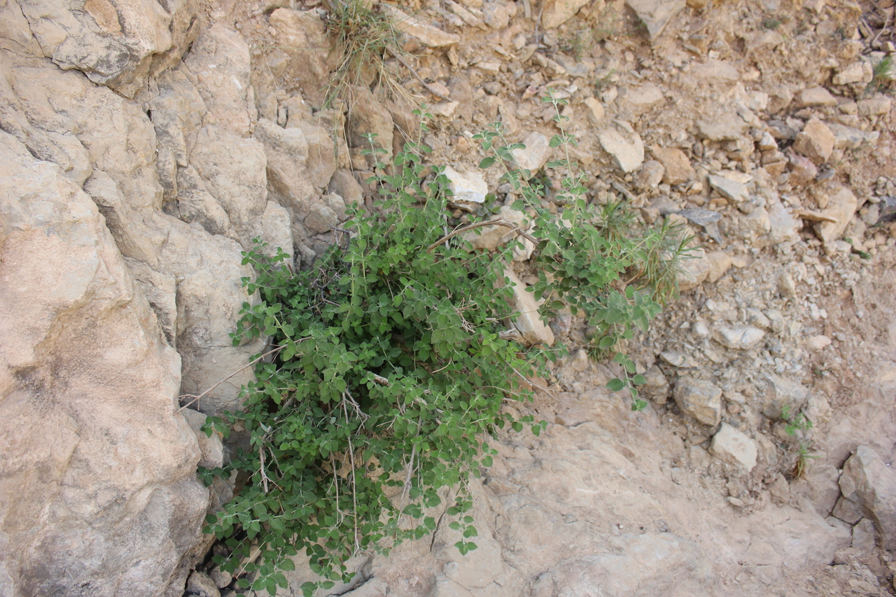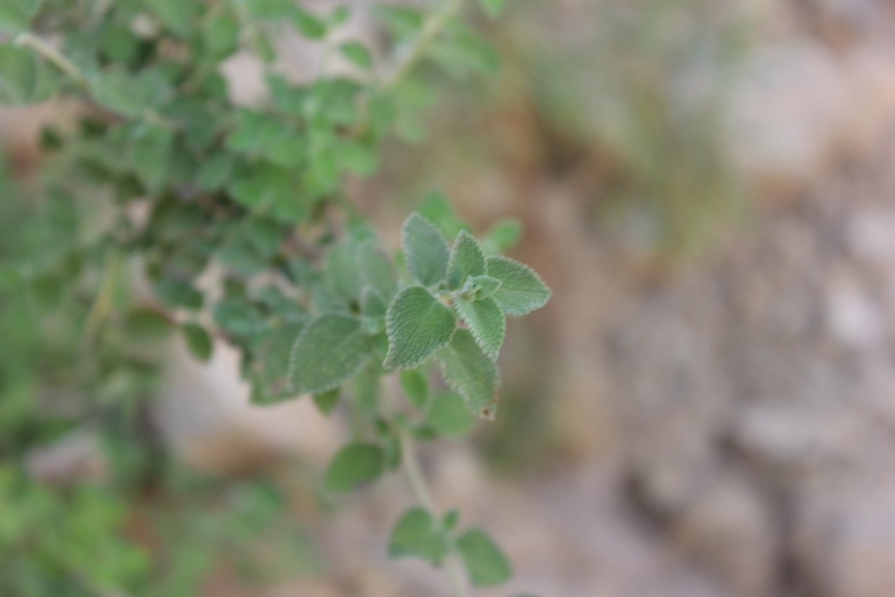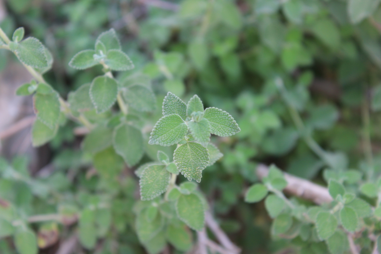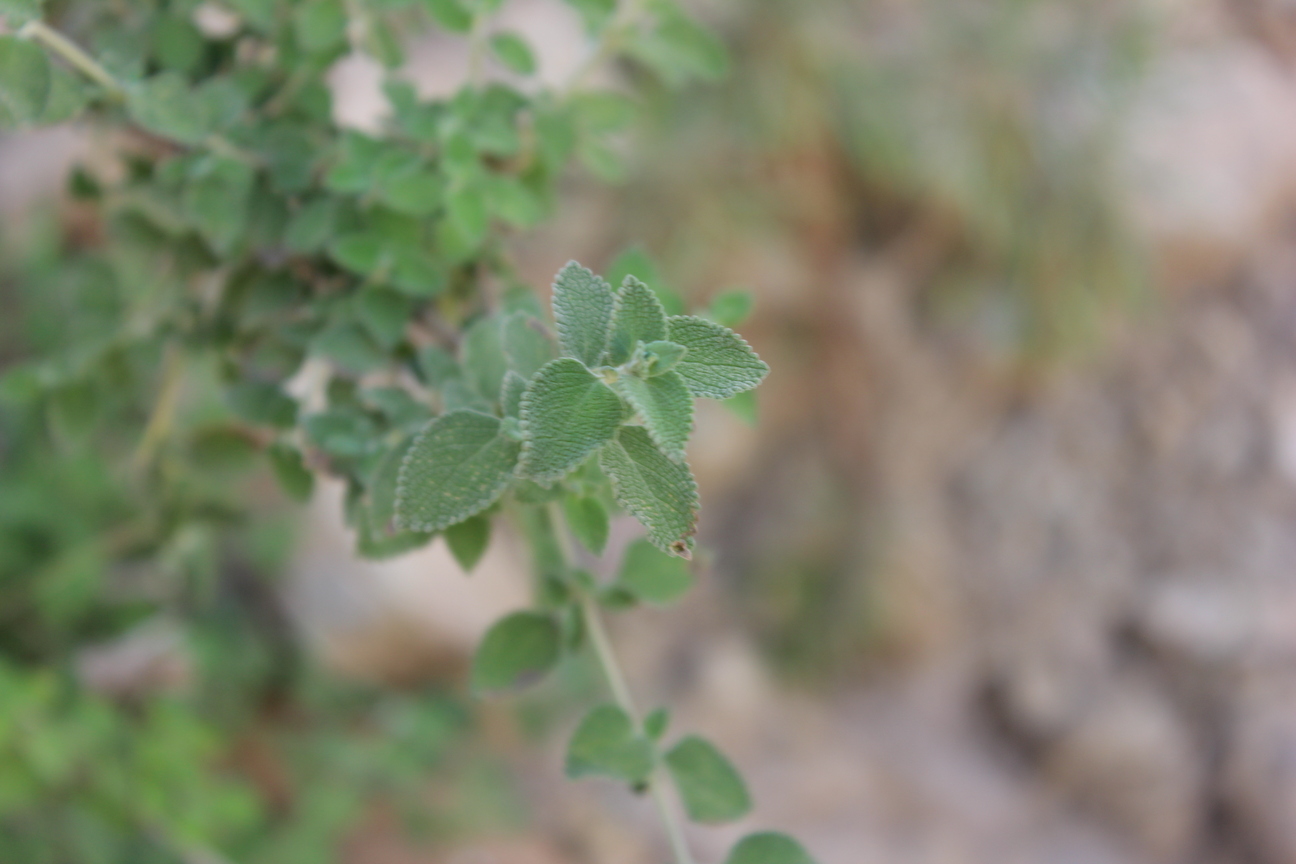 Aromatic shrub ; up to 100 cm tall . Stems erect , much branched , densely stellate tomentose ; branches , slender , quadrangular , leafy . Leaves opposite , broad-ovate to elliptic , rugose , usually green or dark above , densely tomentose , obtuse apex , broadly cuneate to rounded base , crenulate margin ; petiole up to 2 . 5 cms , usually much less . Inflorescences borne in cymes on slender lateral branches , lax , forming often leafy racemes . Flowers white tinged or spotted pink ; calyx 2-3 . 5 mm , campanulate ; teeth short , subequal , broad triangular ; corolla white tinged or spotted pink or violet . Fruit nutlets , 1 . 5 x 1 mm , pale to dark brown , oblong , triquetrous , glabrous , mucilaginous on wetting . (Ref . http://www . efloras . org) .