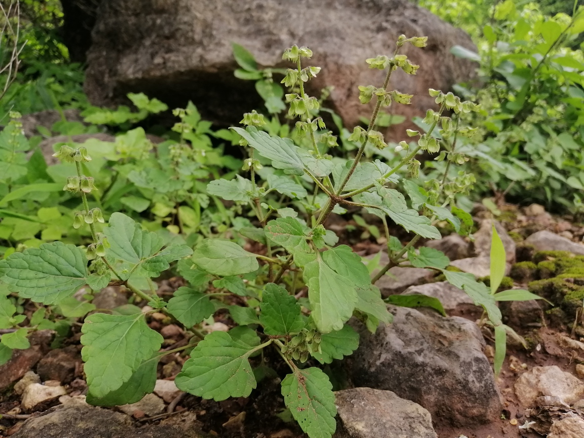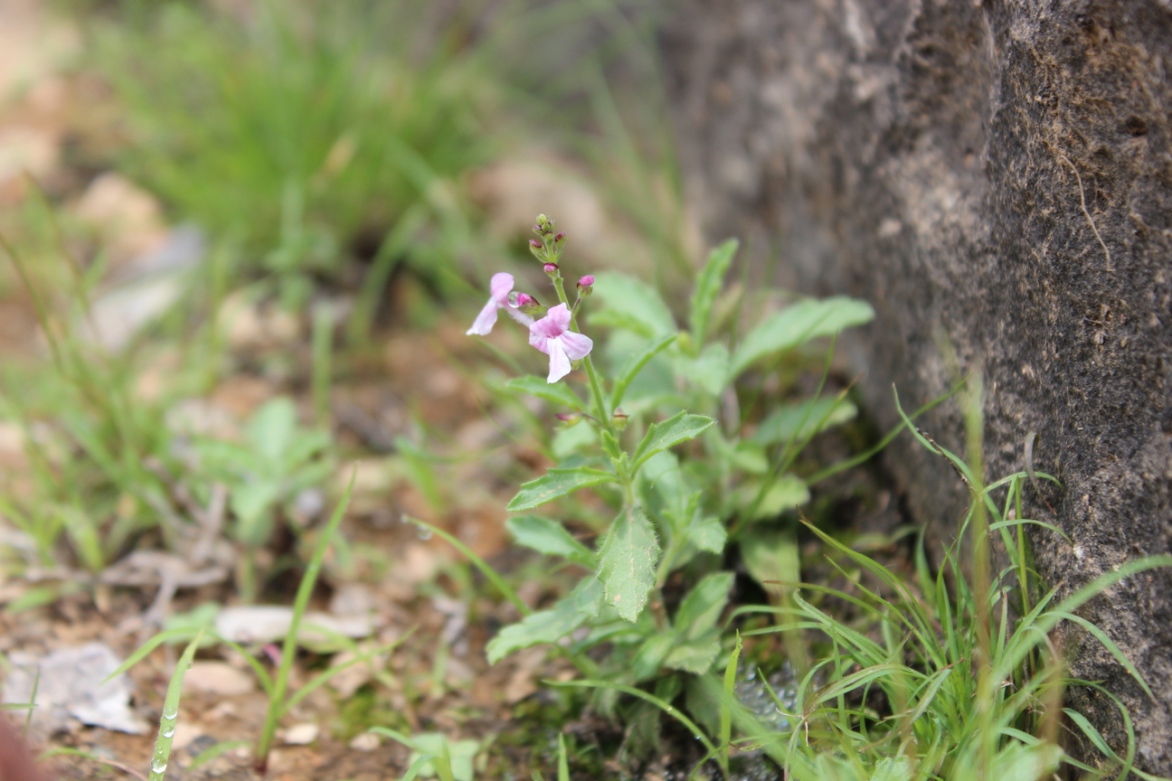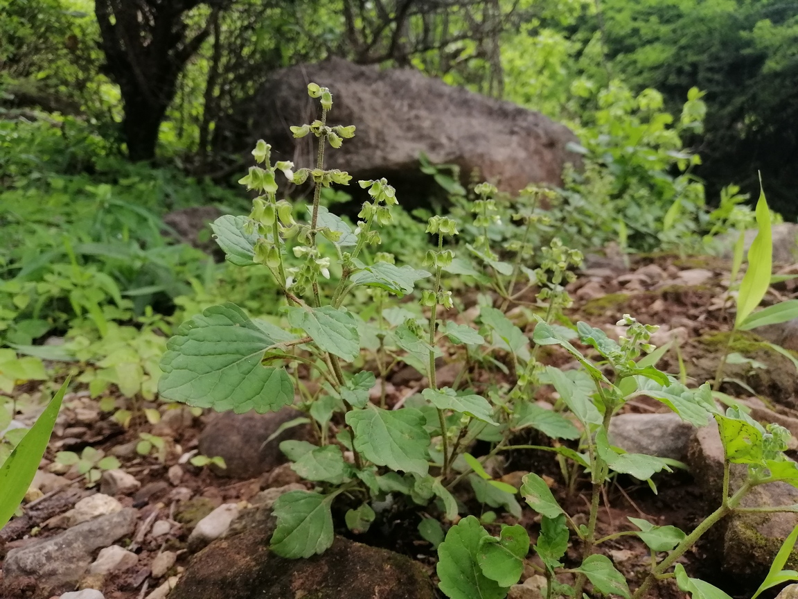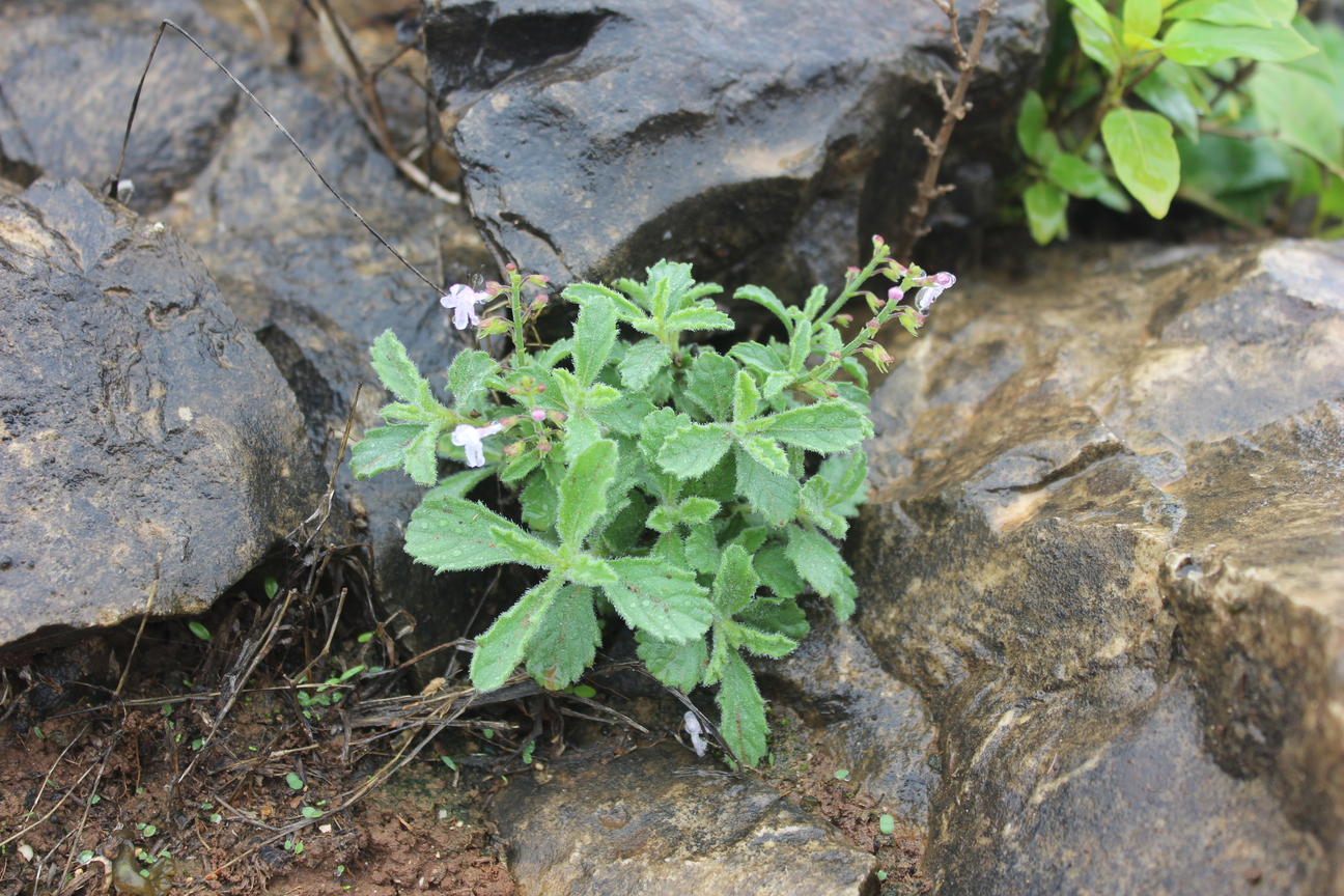 Annual or short-lived perennial herb ; up to 40 cm , with a woody base , not aromatic . Stems erect to ascending , quadrangular , slender , diffusely branched , pubescent with eglandular retrorse hairs , sometimes hairs patent on the inflorescence axis . Leaves 15-35 x 10-20(-30) mm , ovate , pale green , base attenuate , apex obtuse , margins crenate or obtusely serrate , glandular-punctate and pubescent with spreading hairs on veins on the under surface ; petiole 8-25 mm . Inflorescences (verticils) lax ; barcts ± 1 mm long ; pedicels ± 3 mm , patent , slightly flattened , curved distally . Flowers white or lilac , 5-6 mm ; calyx horizontal or downward-pointing , downward pointing when fruitin , 2-lipped , 6-7 mm ; upper lip ovate , entire ; lower lip 4-lobed with lateral lobes deltate , cuspidate , median lobes lanceolate , acuminate , pubescent , hairs long , sessile glands present ; corolla white , 2- lipped , tubular , 4-5 mm , dilating slightly towards throat ; upper lip 4-lobed with the median lobes narrower ; lower lip cucullate , enclosing stamens when young ; stamens