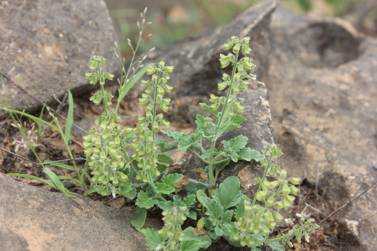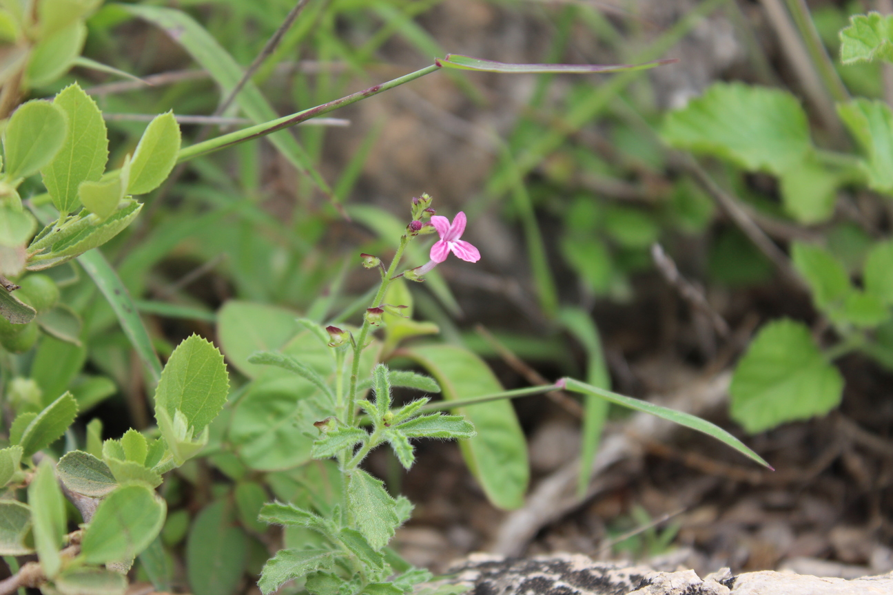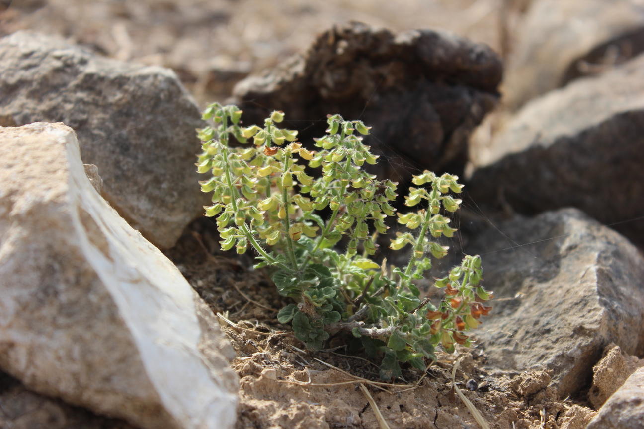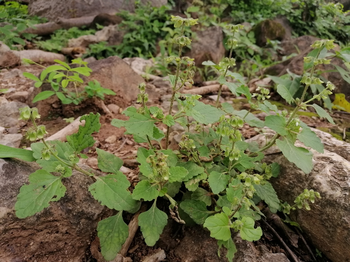 Annual or short-lived perennial herb ; up to 40 cm , with a woody base , not aromatic . Stems erect to ascending , quadrangular , slender , diffusely branched , pubescent with eglandular retrorse hairs , sometimes hairs patent on the inflorescence axis . Leaves 15-35 x 10-20(-30) mm , ovate , pale green , base attenuate , apex obtuse , margins crenate or obtusely serrate , glandular-punctate and pubescent with spreading hairs on veins on the under surface ; petiole 8-25 mm . Inflorescences (verticils) lax ; barcts ± 1 mm long ; pedicels ± 3 mm , patent , slightly flattened , curved distally . Flowers white or lilac , 5-6 mm ; calyx horizontal or downward-pointing , downward pointing when fruitin , 2-lipped , 6-7 mm ; upper lip ovate , entire ; lower lip 4-lobed with lateral lobes deltate , cuspidate , median lobes lanceolate , acuminate , pubescent , hairs long , sessile glands present ; corolla white , 2- lipped , tubular , 4-5 mm , dilating slightly towards throat ; upper lip 4-lobed with the median lobes narrower ; lower lip cucullate , enclosing stamens when young ; stamens