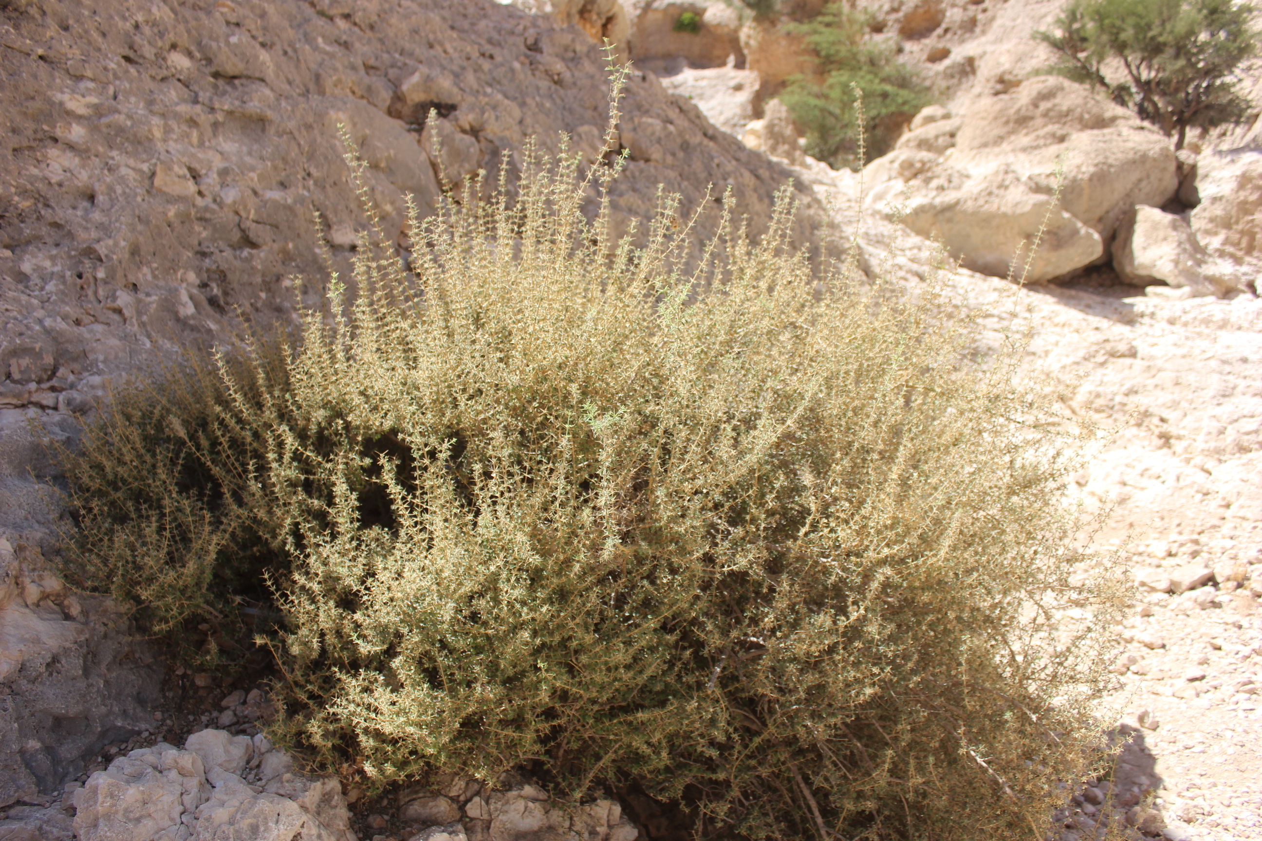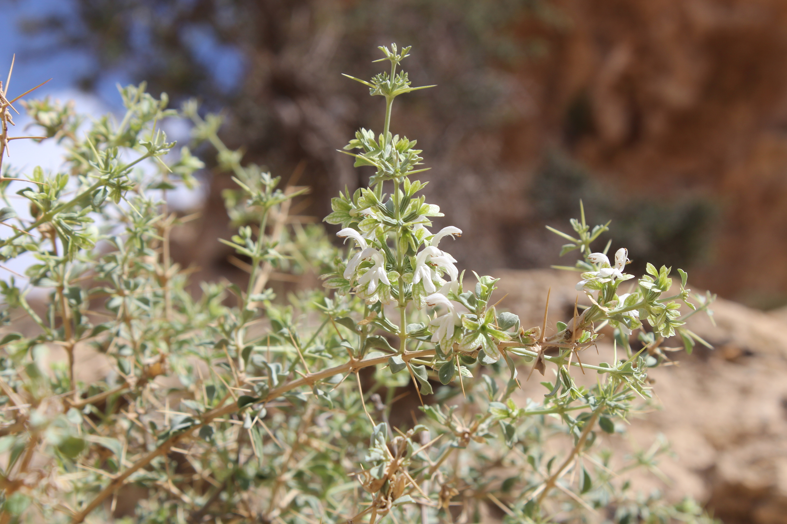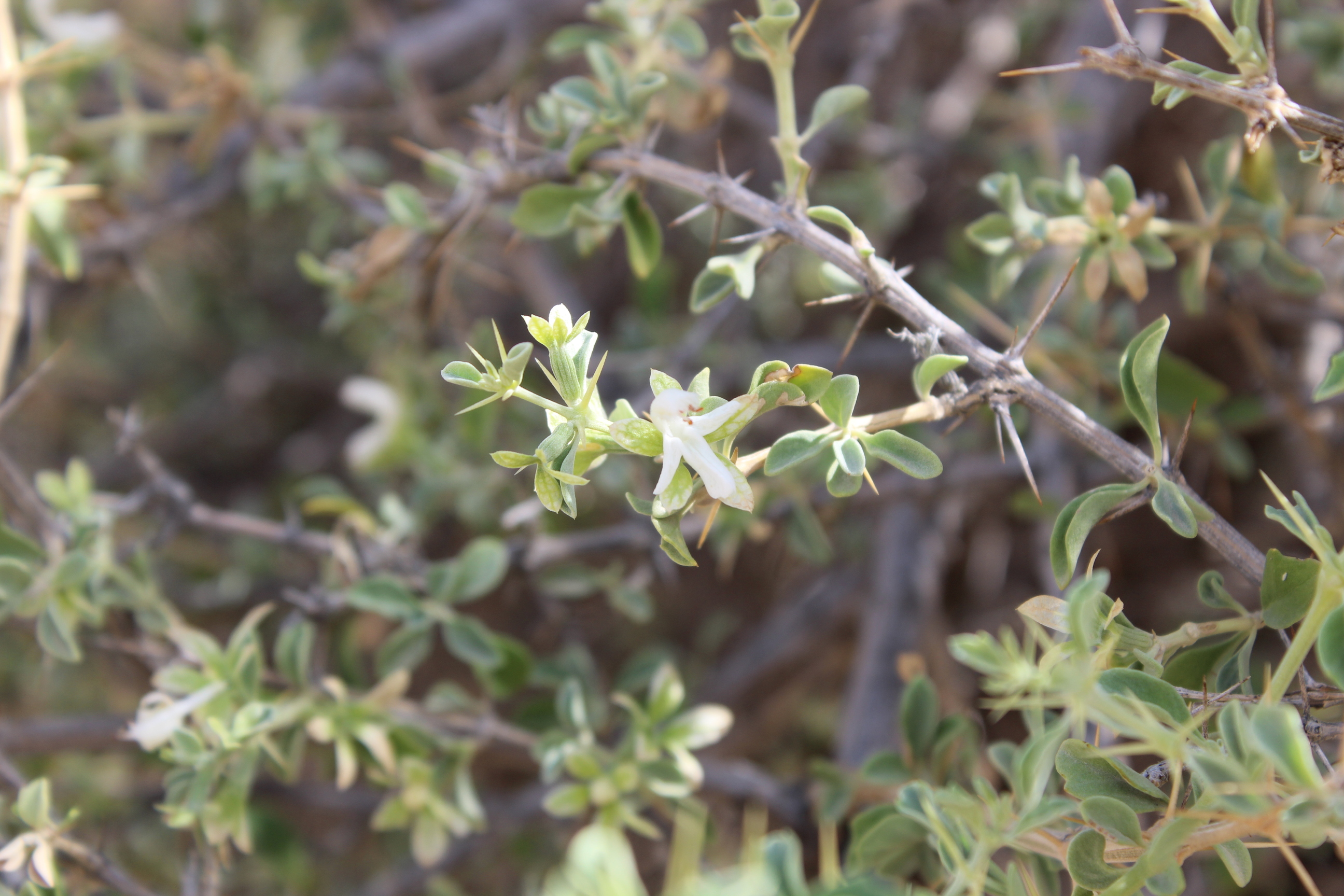 Spiny shrub ; up to 1 . 5 m tall . Stems branched , densely eglandular-pubescent . Leaves 10-12 x 10 mm , suborbicular to broadly obovate , base cuneate , apex obtuse , margins crenate to dentate with small spinules , densely pubescent with eglandular hairs and sessile glands ; petiole ± 10 mm ; spines up to 20 mm present in the axils of leaves . Inflorescences (Verticillasters) few-flowered , distantly placed ; bracts spiny , spreading . Flowers white ; calyx 10-ribbed , densely pilose , tube ± 8 mm , lower lip broadly ovate , spreading , irregularly lobed and toothed , scarious , straw-coloured ; upper lip small ; corolla white , ± 20 mm , 2-lipped ; tube about the same lenth as the calyx tube ; upper lip 10-11 mm , densely villous . Fruit nutlets , obovoid , with oil globules , often only one maturing ( ? ) . (Ref . Flora of Oman ; vol . 3) .