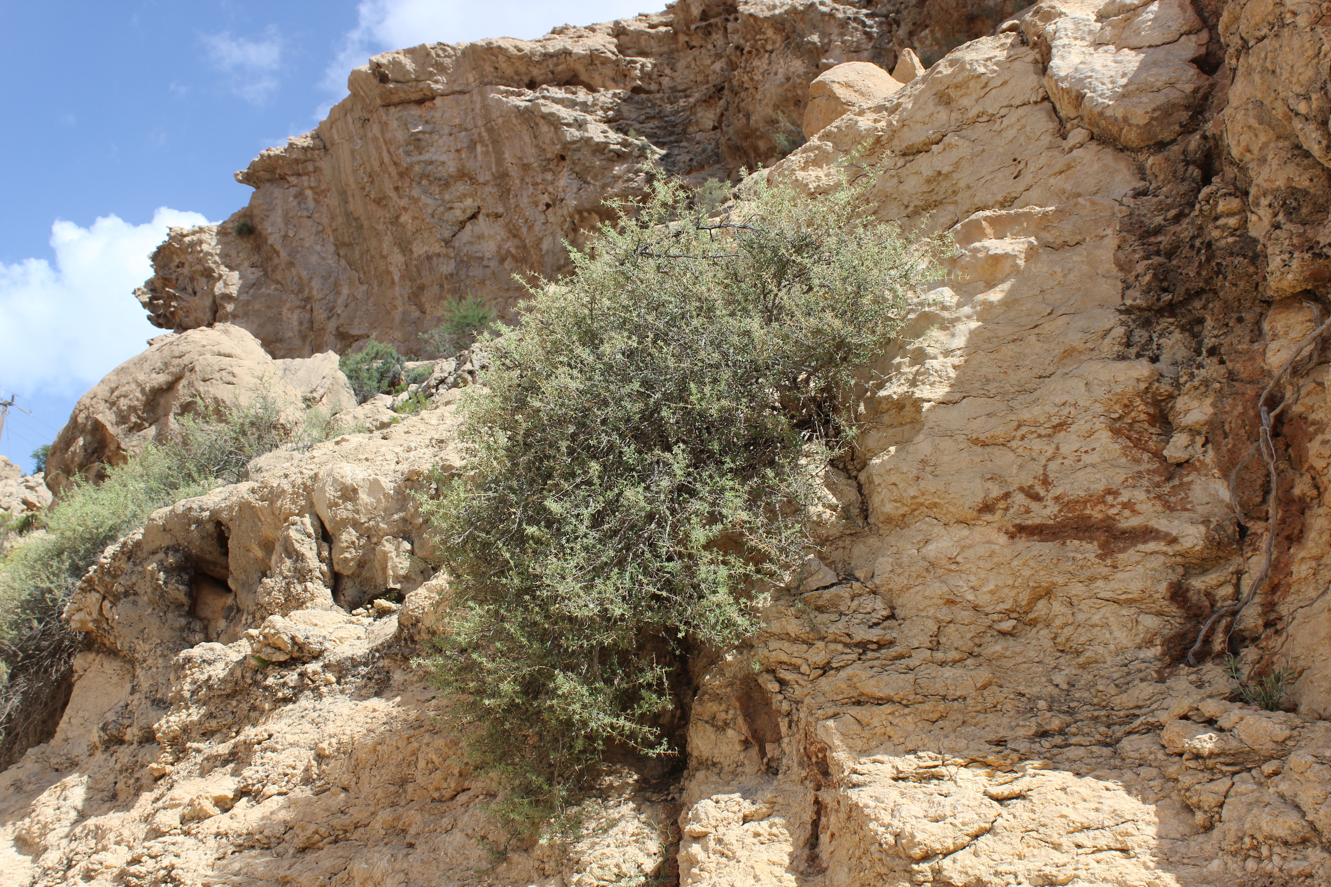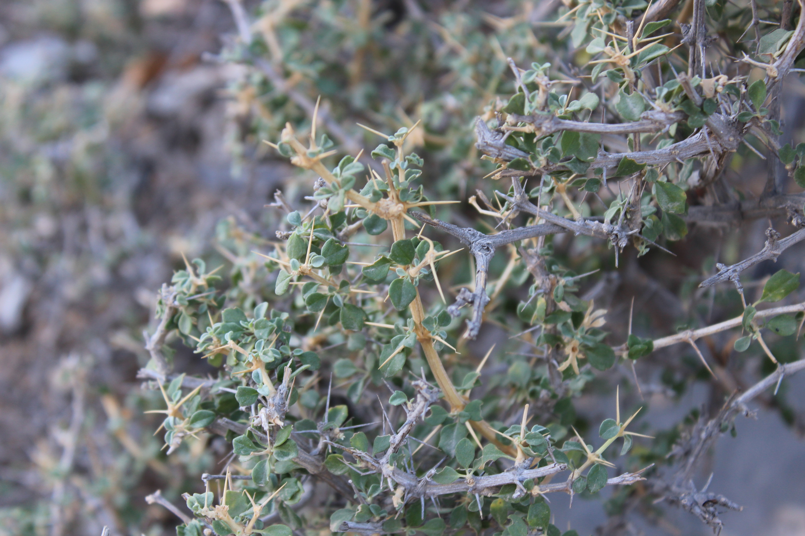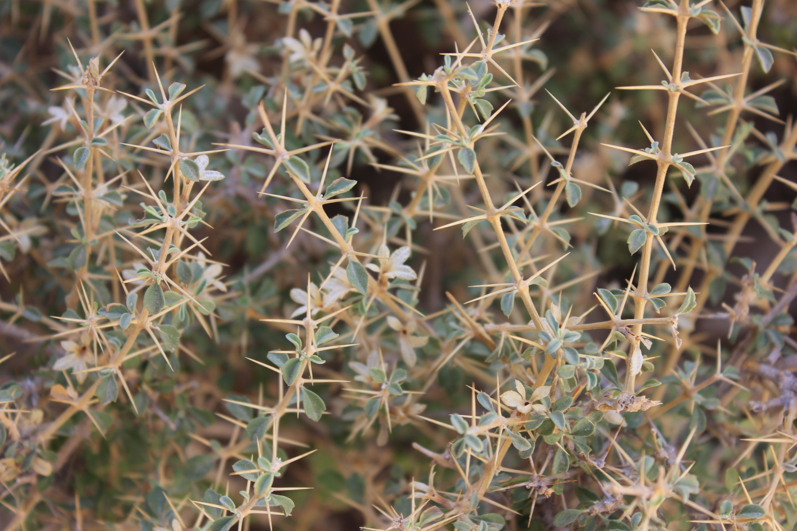 Spiny shrub ; up to 1 . 5 m tall . Stems branched , densely eglandular-pubescent . Leaves 10-12 x 10 mm , suborbicular to broadly obovate , base cuneate , apex obtuse , margins crenate to dentate with small spinules , densely pubescent with eglandular hairs and sessile glands ; petiole ± 10 mm ; spines up to 20 mm present in the axils of leaves . Inflorescences (Verticillasters) few-flowered , distantly placed ; bracts spiny , spreading . Flowers white ; calyx 10-ribbed , densely pilose , tube ± 8 mm , lower lip broadly ovate , spreading , irregularly lobed and toothed , scarious , straw-coloured ; upper lip small ; corolla white , ± 20 mm , 2-lipped ; tube about the same lenth as the calyx tube ; upper lip 10-11 mm , densely villous . Fruit nutlets , obovoid , with oil globules , often only one maturing ( ? ) . (Ref . Flora of Oman ; vol . 3) .