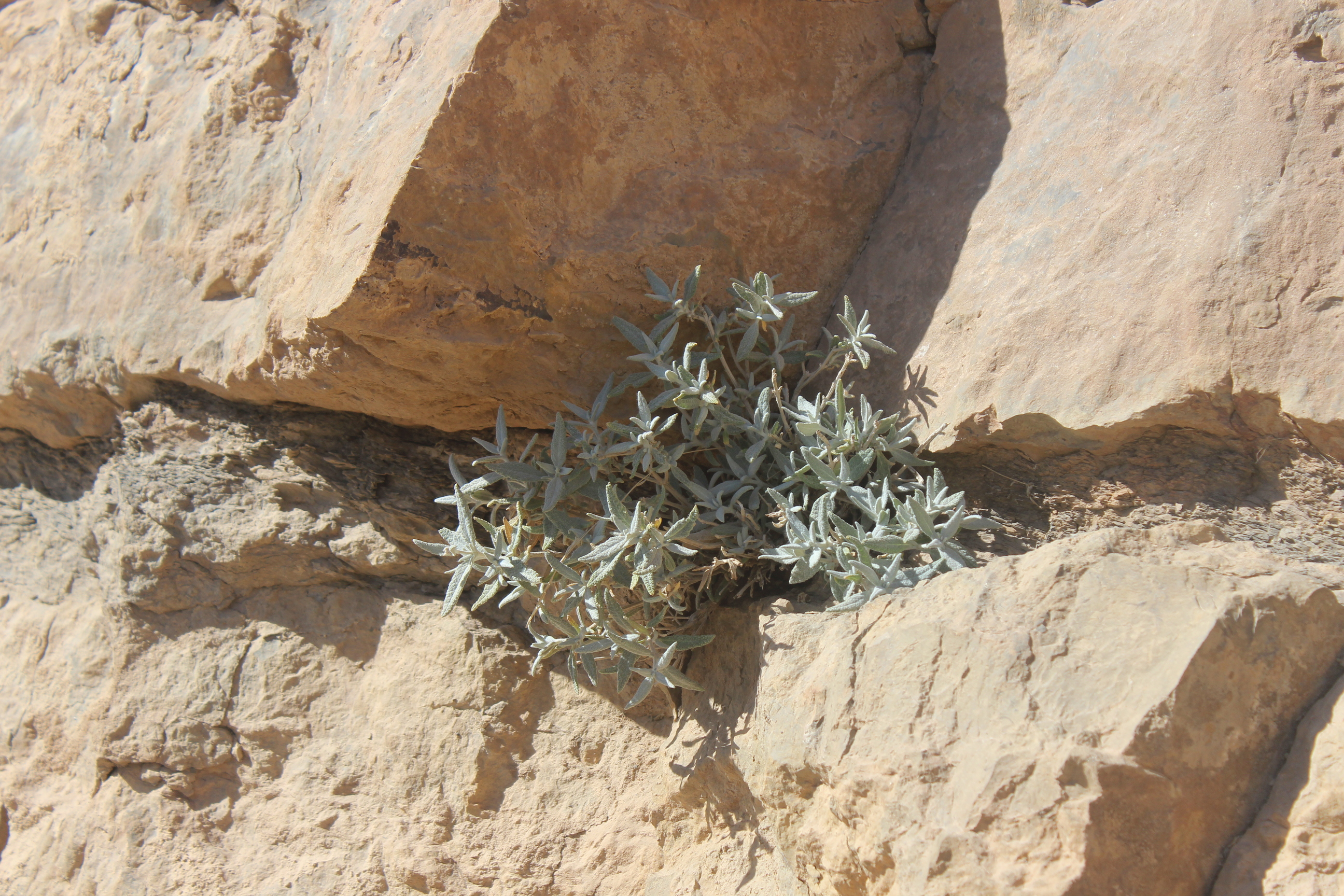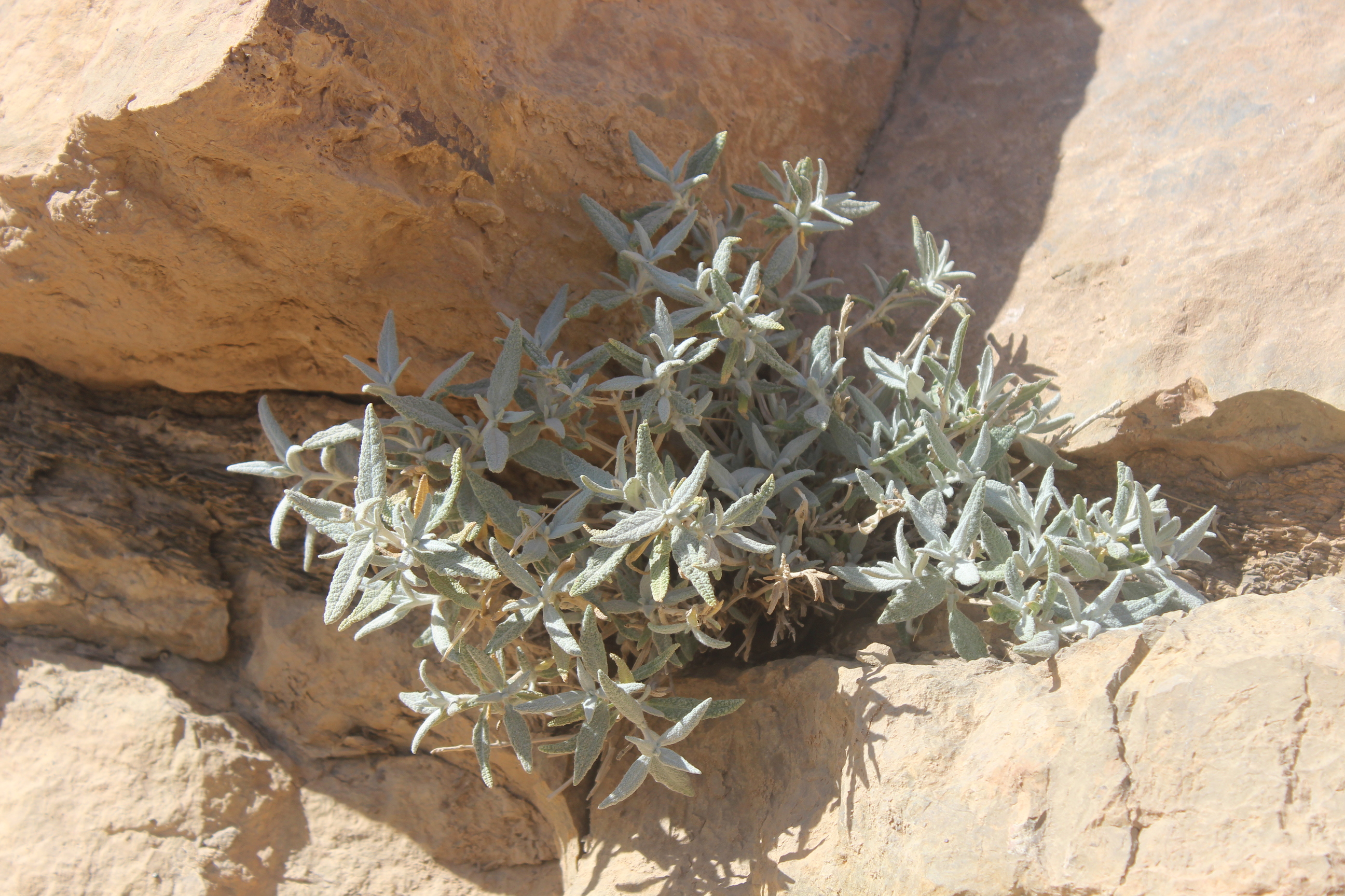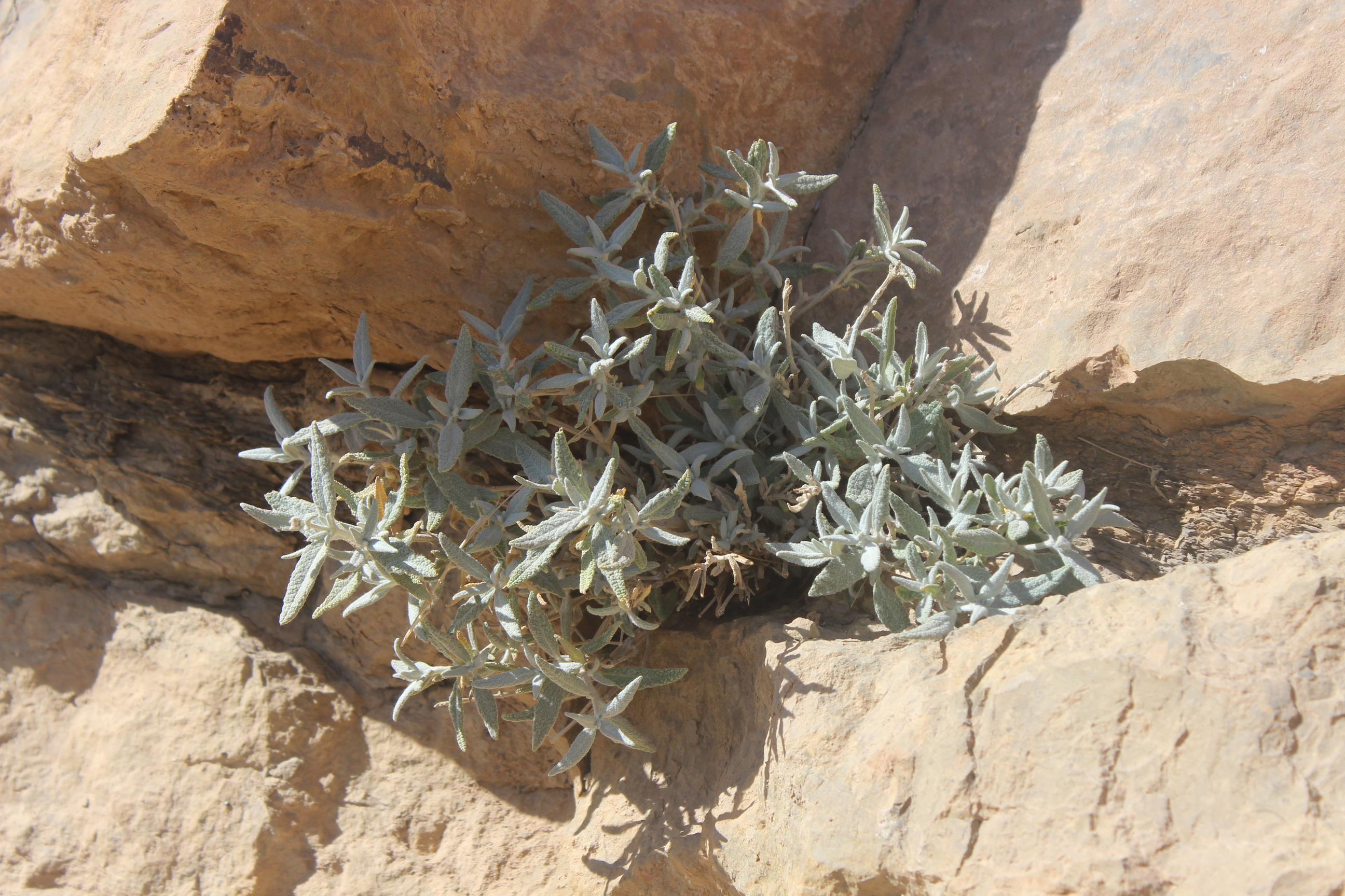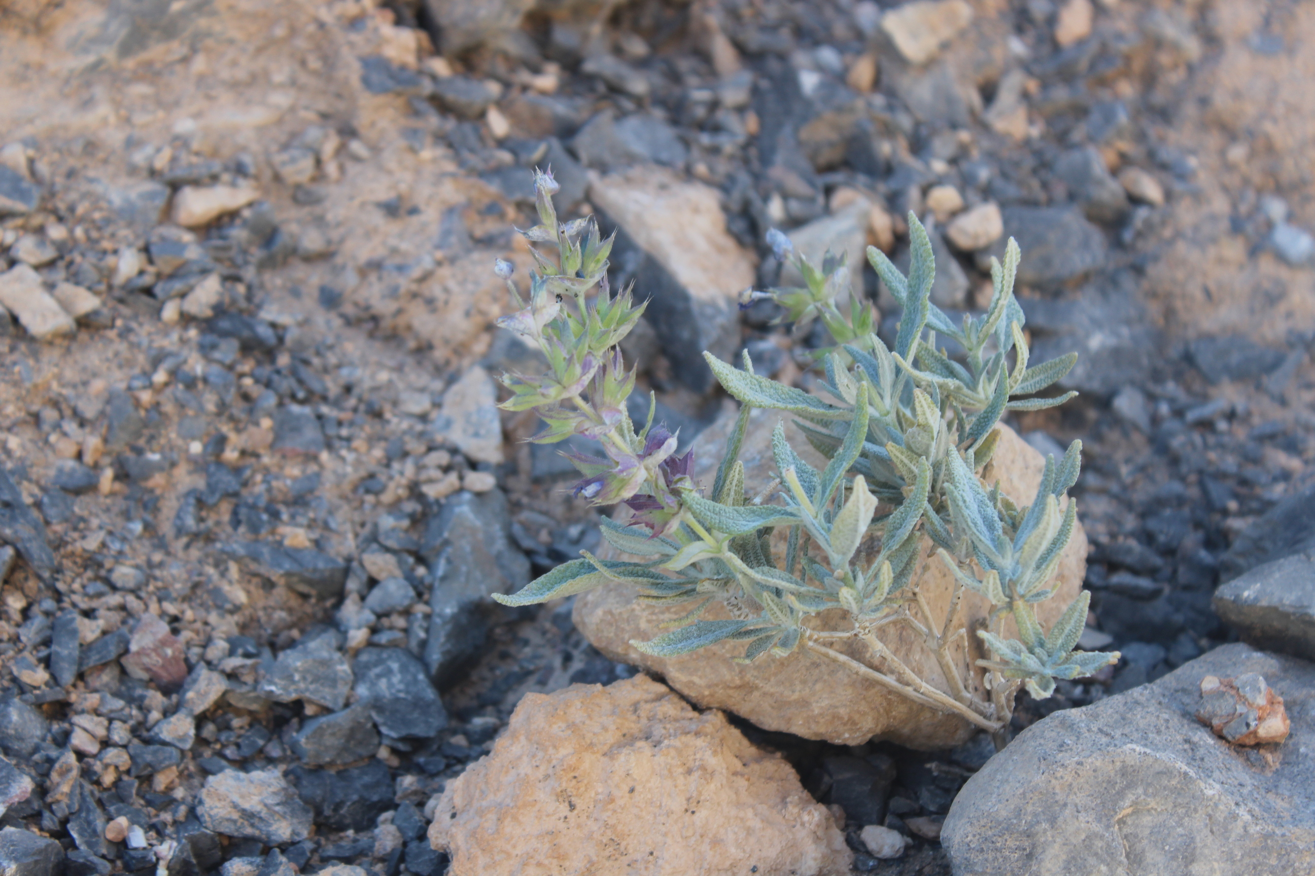 Subshrub ; up to 35 cm high , with woody basal stems , aromatic . Stems erect , quadrangular , ± branched from the base , white eglandular pilose below , densely glandular above with capitate glandular hairs and oil globules . Leaves opposite along the stem , 1 . 8-4 . 5 x 0 . 3-1 cm , grey-green , linear to linear-lanceolate , base cuneate , apex acute , margins entire , eglandular white-lanate , rugose on the upper surface ; petioles up to 4 mm . Inflorescences simple panicle , verticils 4–6-flowered ; bracts 10-12 mm , broadly ovate to suborbicular ; pedicels 1-2 mm , erect to spreading in fruit . Flowers white to violet ; calyx grey-green , tubular , 12-14 mm , elongating to ± 15 mm in fruit , 2-lipped , distinctly ribbed , glandular pilose ; upper lip with 3 acuminate teeth ; corolla white to violet , 2-lipped , 20-25 mm ; tube ± erect ; upper lip ± falcate , lower lip 3-lobed . Fruit nutlets not seen . (Ref . Flora of Oman ; vol . 3) .