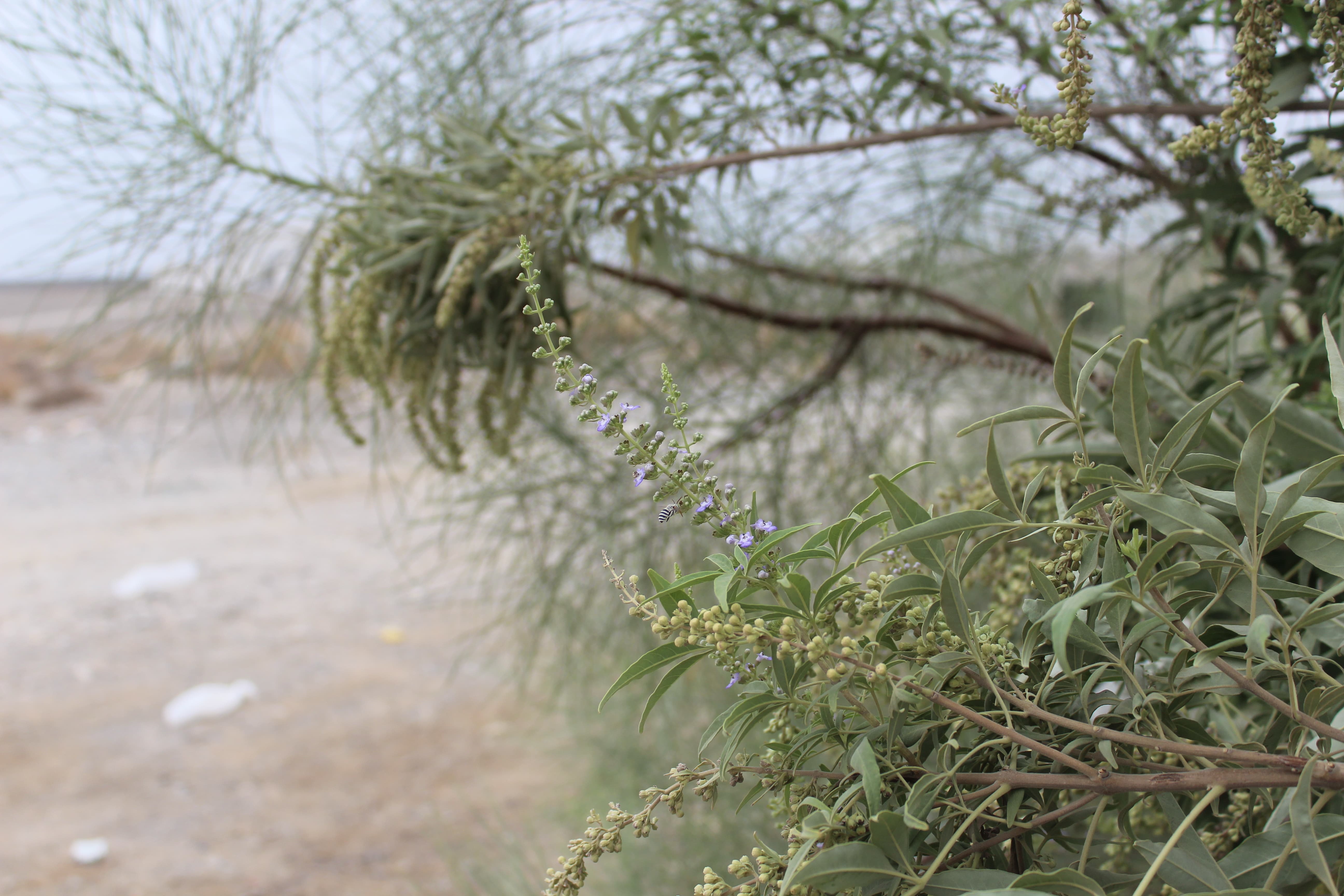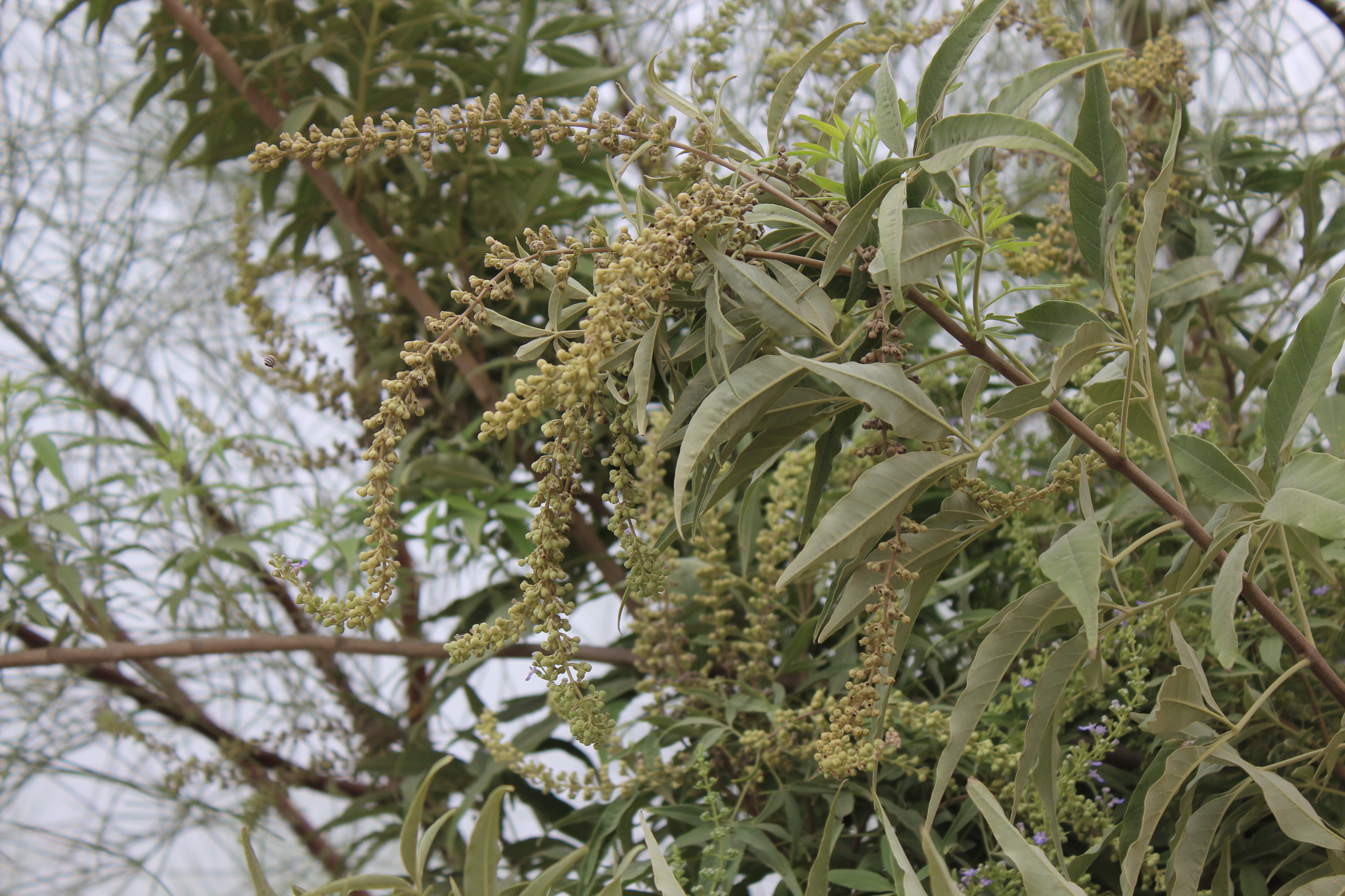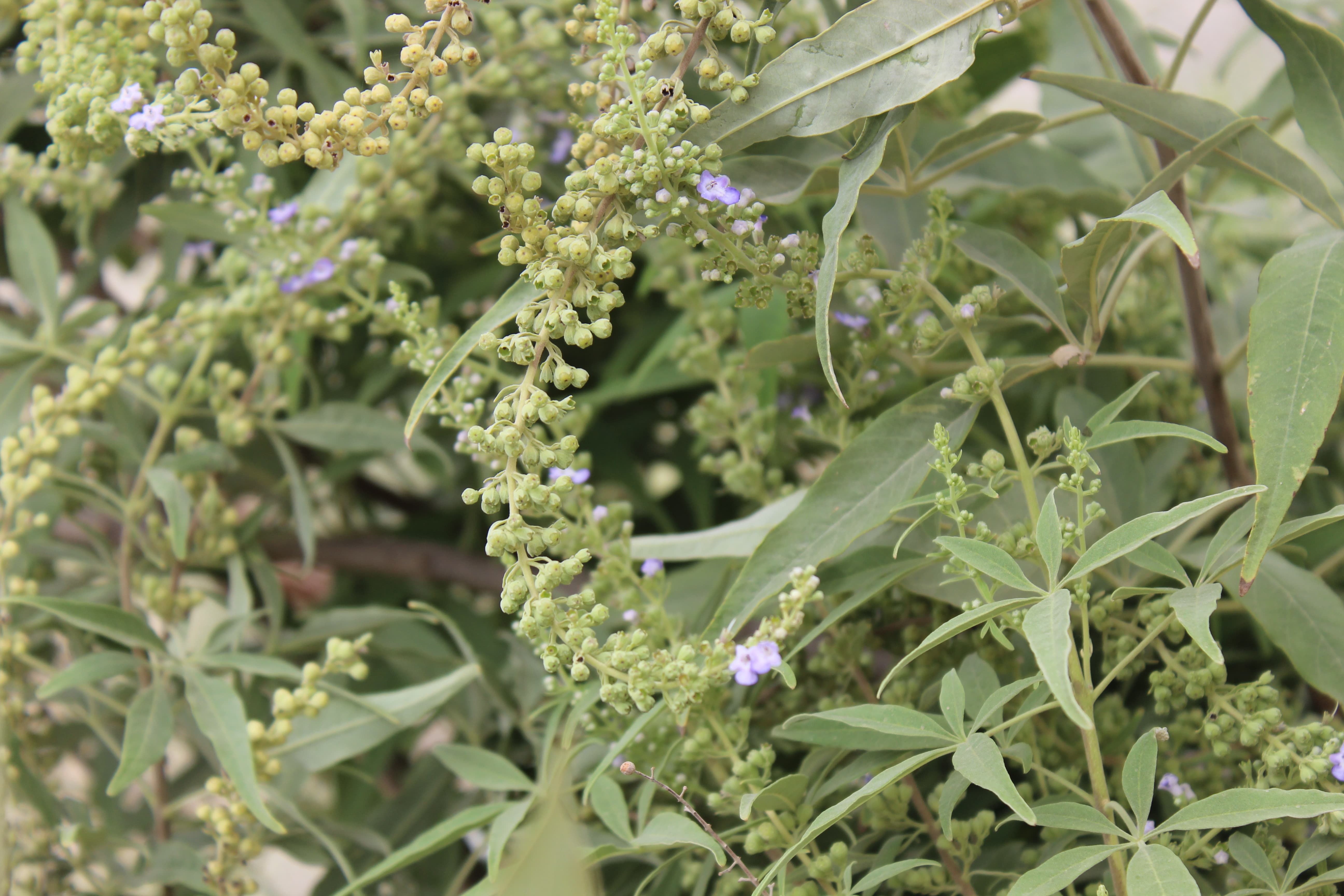 Small tree or deciduous shrub ; up to 2 m tall . Stems erect , branched . Leaves opposite , compound , palmate , grayish-green , 5-foliolate ; leaflets (2-)5-10(-12) x (4-)10-15(-20) mm , lanceolate , base tapering to a short petiole , apex ± acuminate , margins entire , white-tomentose . Inflorescences in long terminal or axillary cymes , spreading . Flowers tiny , fragrant , lavender to tiny , fragrant , lavender to pale violet ; calyx ± 3 mm , campanulate , 5-toothed , persistent , forming a cup-like structure below the fruit ; corolla white , blue or purple , 7-10 mm , 2-lipped , 4-lobed ; lower lobes ± pubescent ; stamens 4 , inserted in the corolla tube , exserted . Fruit drupe , ± 2 mm , 4-celled , indehiscent , fleshy , glabrous . (Ref . Flora of Oman ; vol . 3) .
