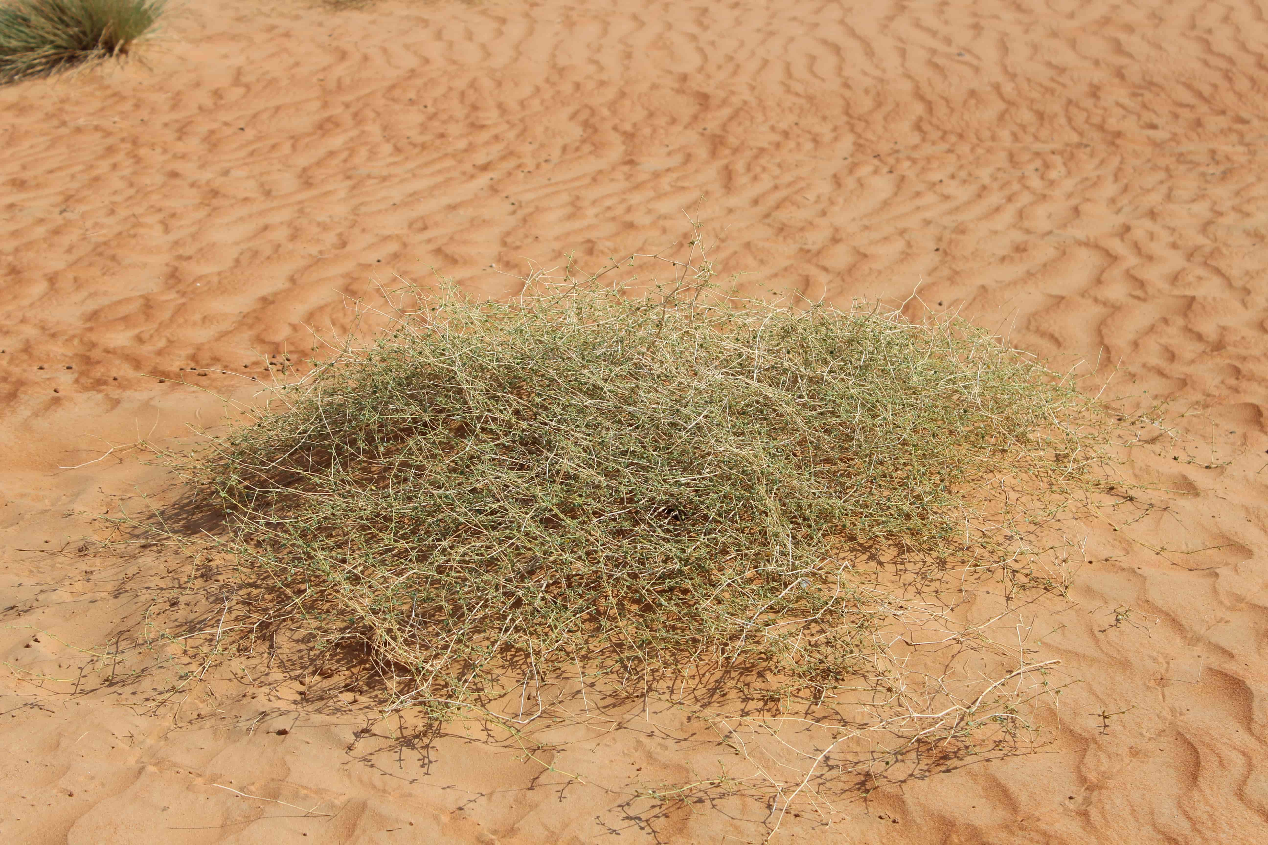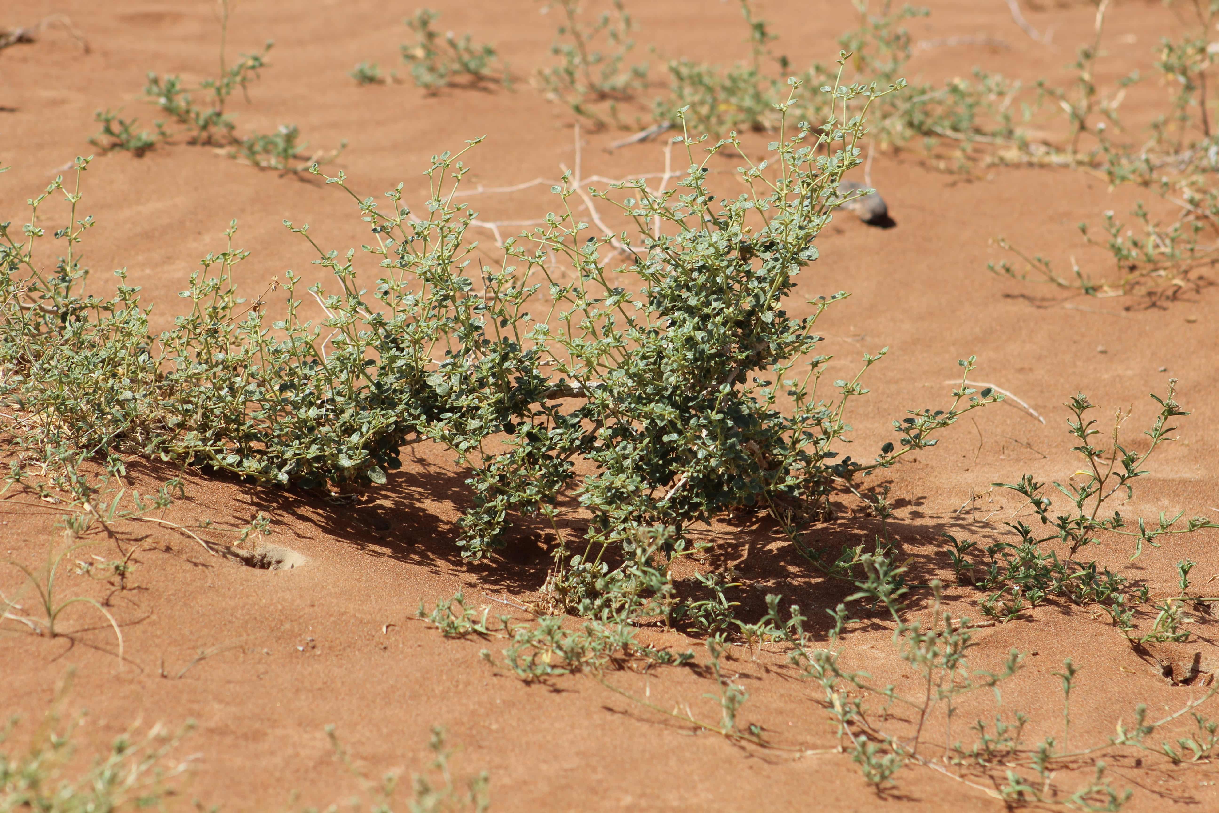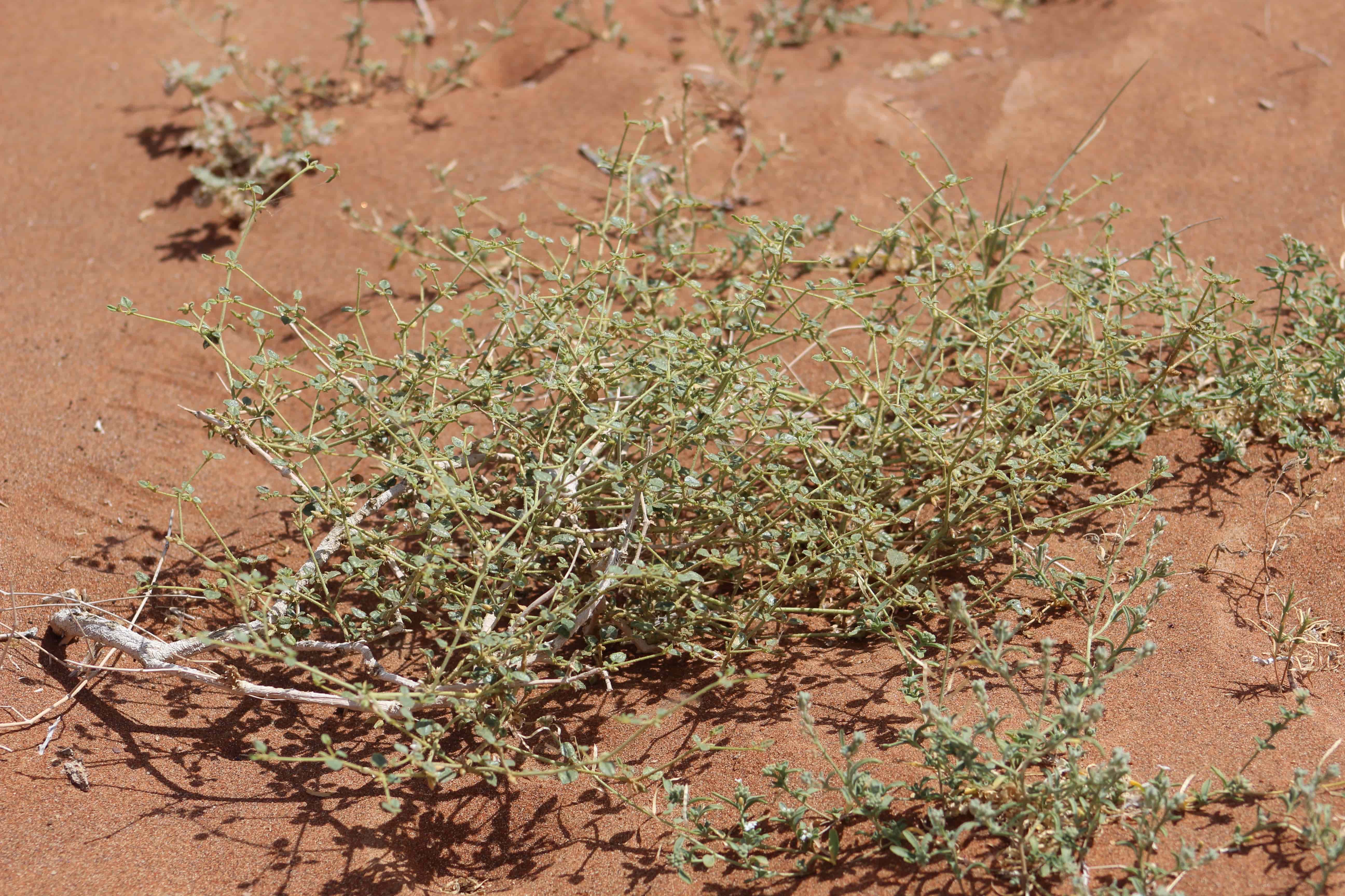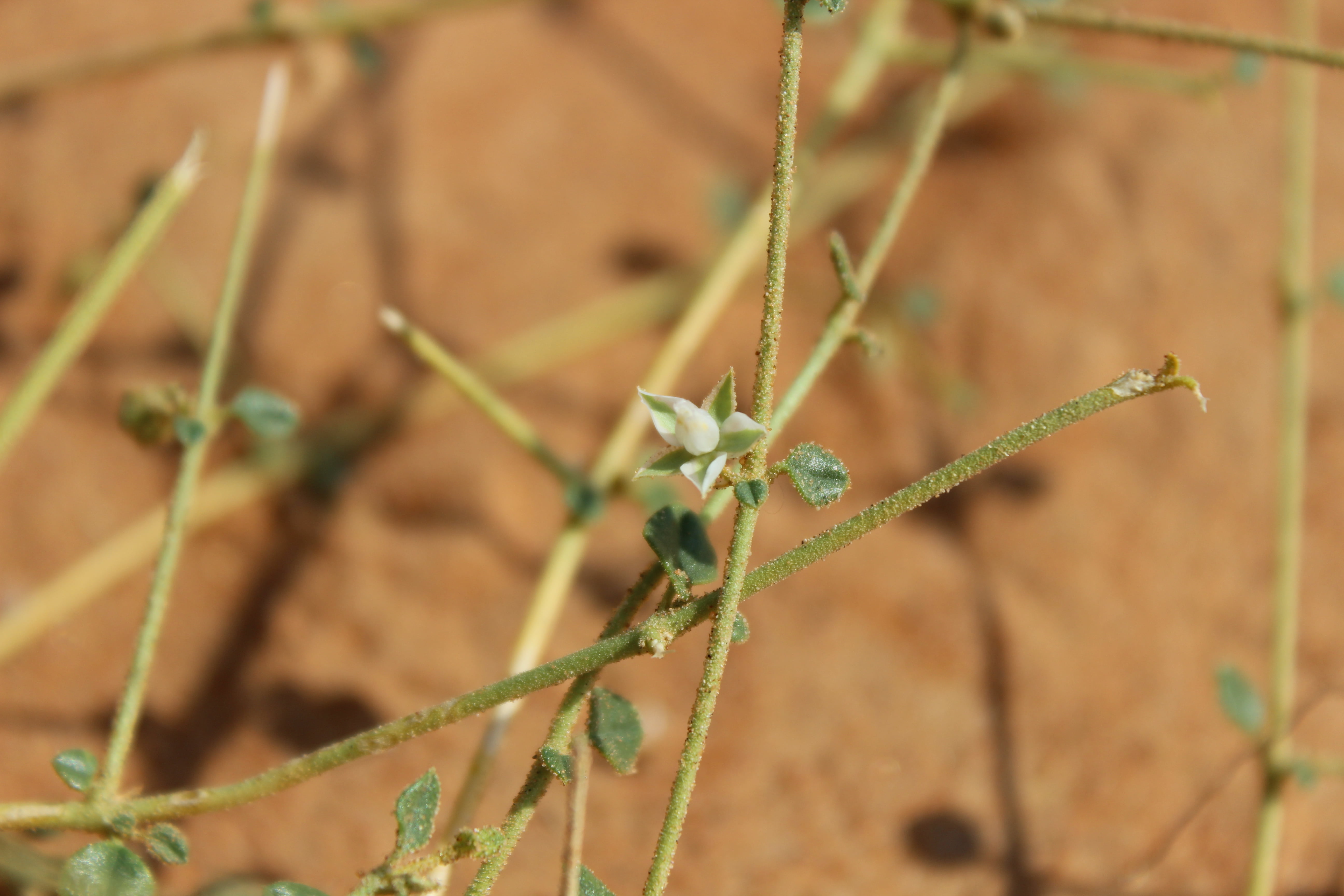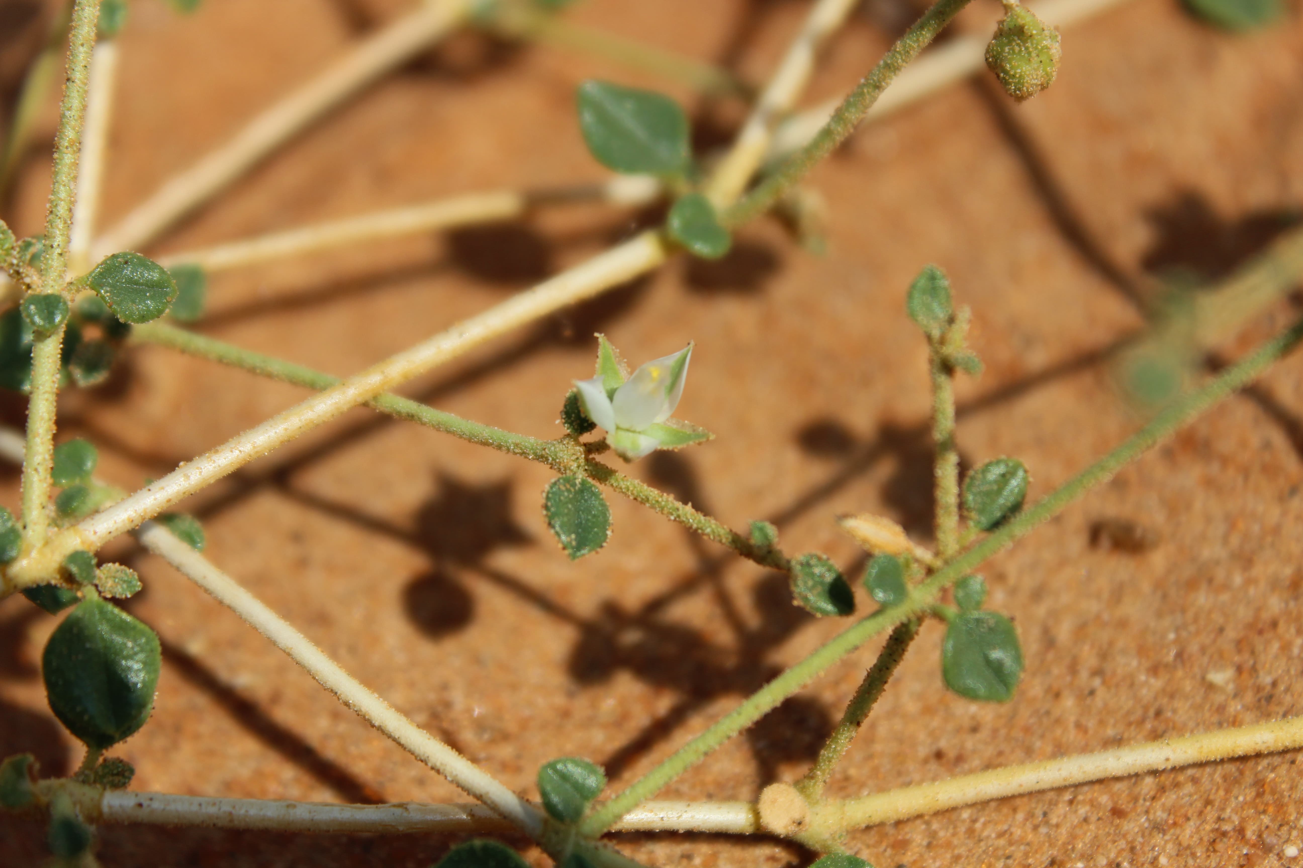 Intricately branched , annual herb or perennial subshrub ; up to 50 cm tall , forming cushion-shaped bush , glandular-hairy throughout . Stems ascending , somewhat zig-zag , branching intricate , glandular-hairy (often with sand sticking on the stems and leaves) . Leaves opposite to sub-opposite , 2-10 x 2-8 mm , ovate to elliptic to broadly ovate , apex obtuse or apiculate . Inflorescences solitary or paired , sessile , axillary . Flowers white ; sepals ovate , c . 5 mm ; petals absent ; stamens 7 ; staminodes petaloid . Fruit 2-3 mm , recurved , splitting into 1-seeded mericarps , greyish brown . (Ref . Flora of Oman ; vol . 1) .
