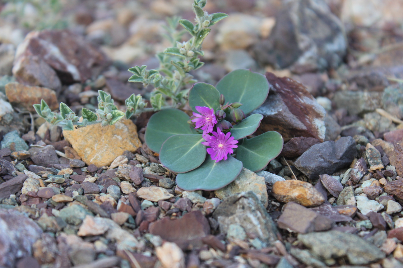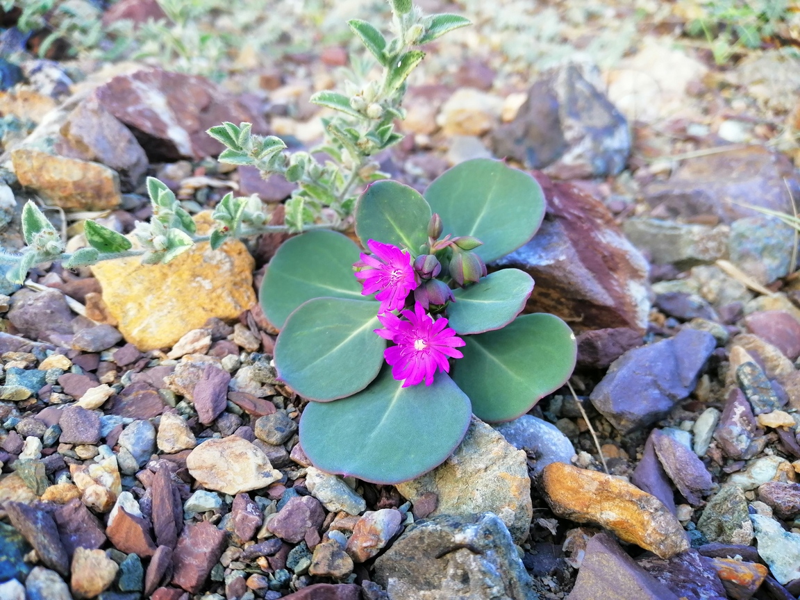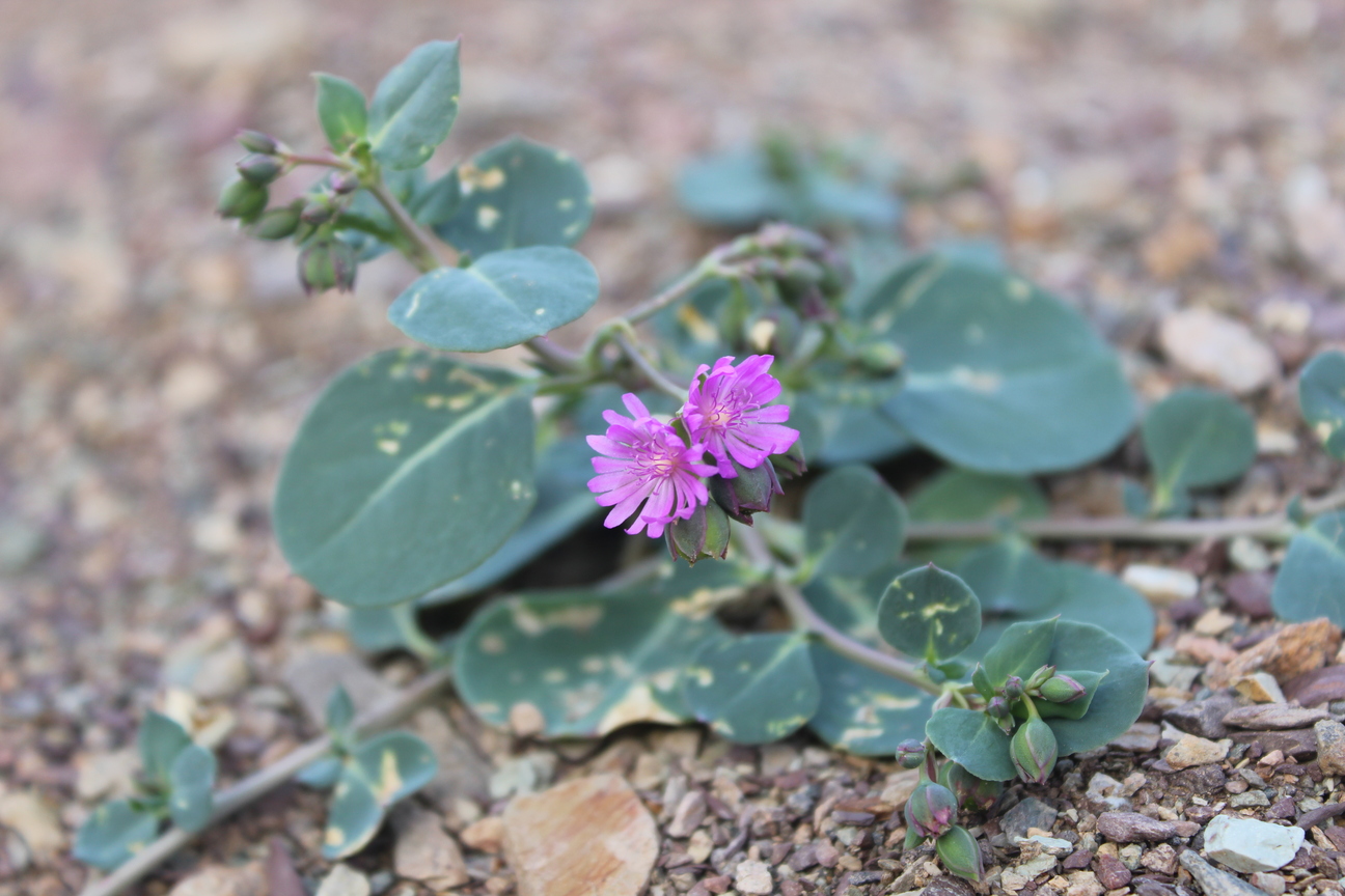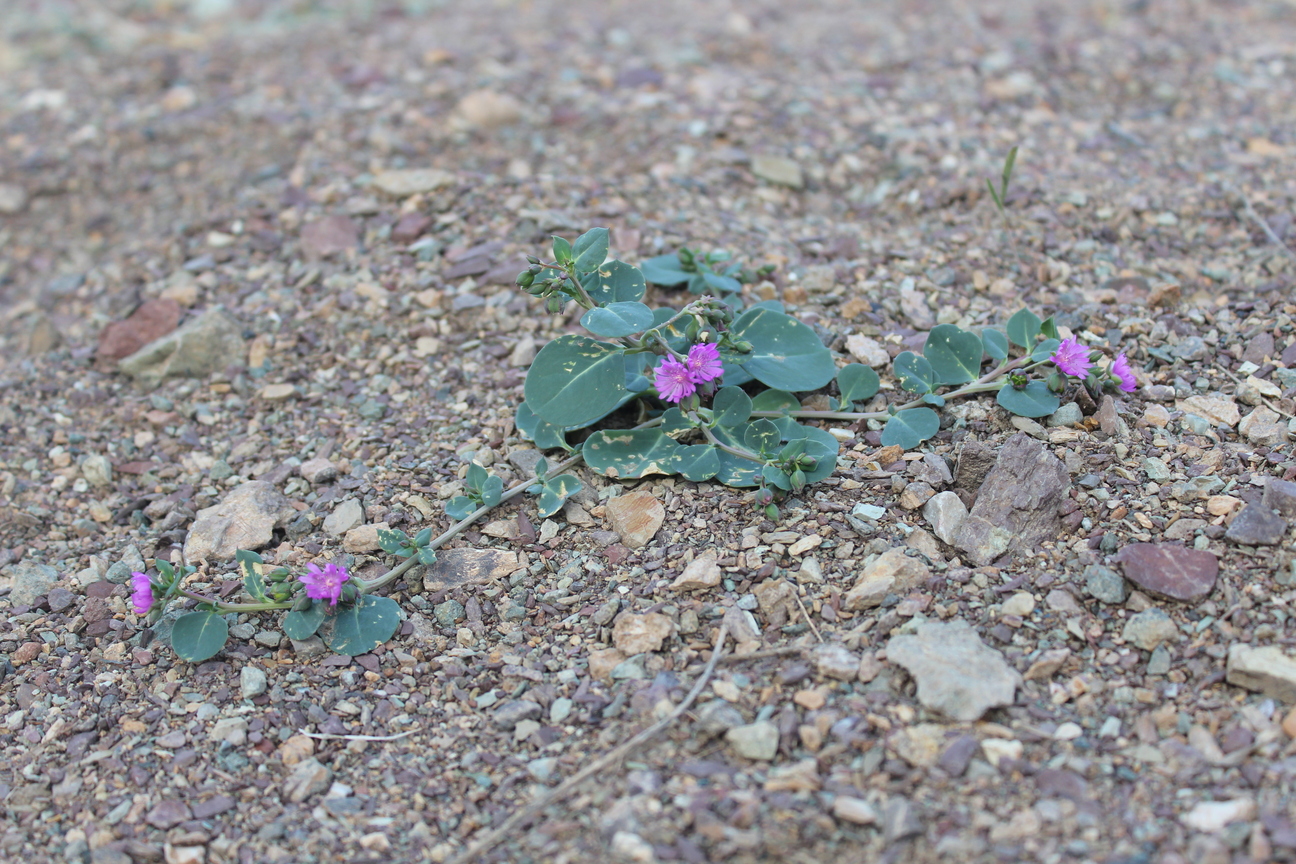 A semi prostrate herb , or short-lived perennial succulent herb ; up to 50 cm high , sometimes with woody rootstock . Stems erect to ascending , branched , often sub-woody at base , sometimes very long , smooth , somewhat succulent , often tinged red . Leaves alternate , 10-22 x 6-11 mm , fleshy , large , ovate to obovate-spatulate , apiculate tip , cuneate at base , entire margin , smooth ; petiole 1-4 mm . Inflorescences borne in lax , few- to many-flowered cymes , somewhat raceme-like . Flowers actinomorphic , bisexual , bright magenta-pink , 1 cm wide , shortly pedicellate ; sepals 4-8 mm , petaloid ; petals absent ; staminodes many , in 2 whorls , longer than the actual perianth , many , appearing as a large number of petals ; stamens free . Fruit capsule , 5-6 mm , yellowish-green , shining , dehiscing by 5 valves . Seeds purplish-black , concentrically ridged , with white aril . (Ref . Flora of Oman ; vol . 1) .