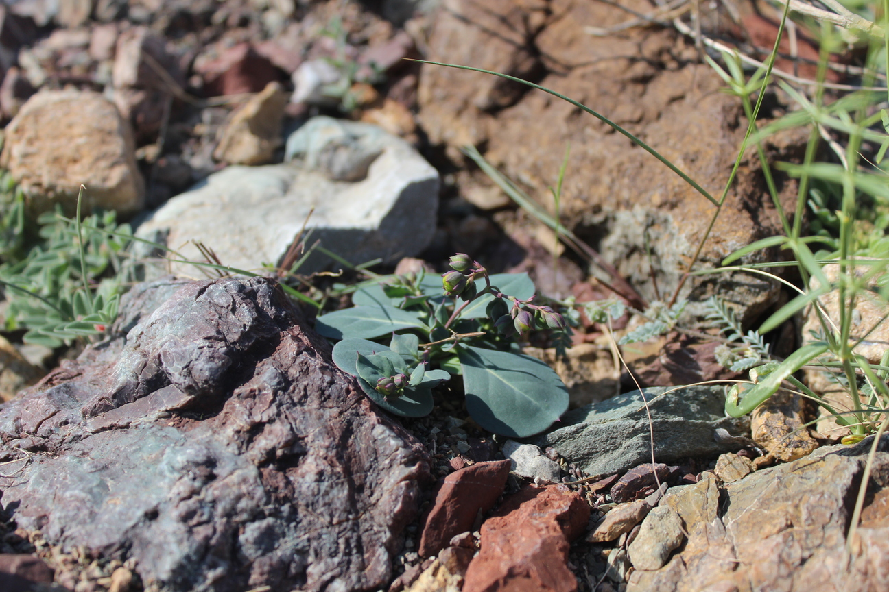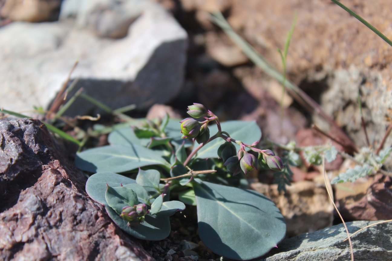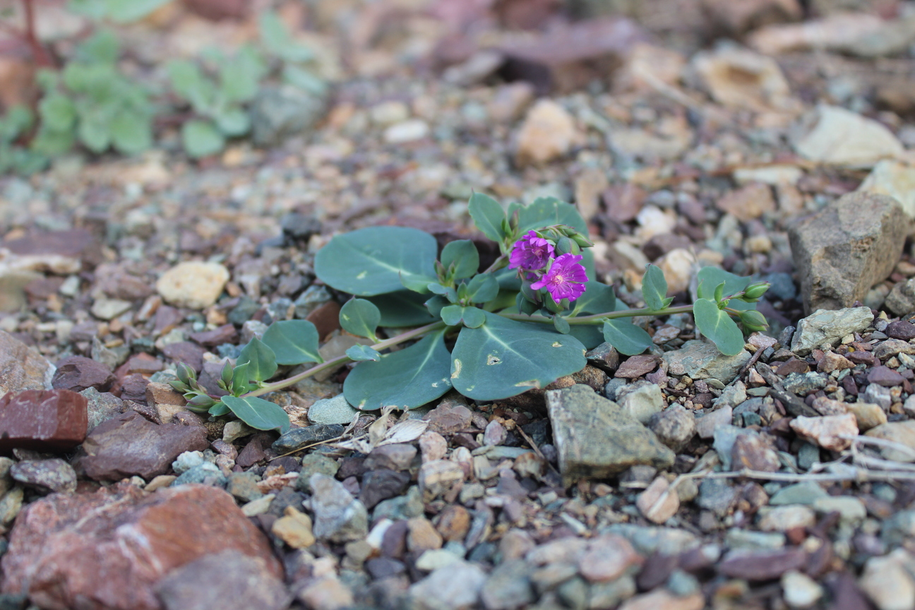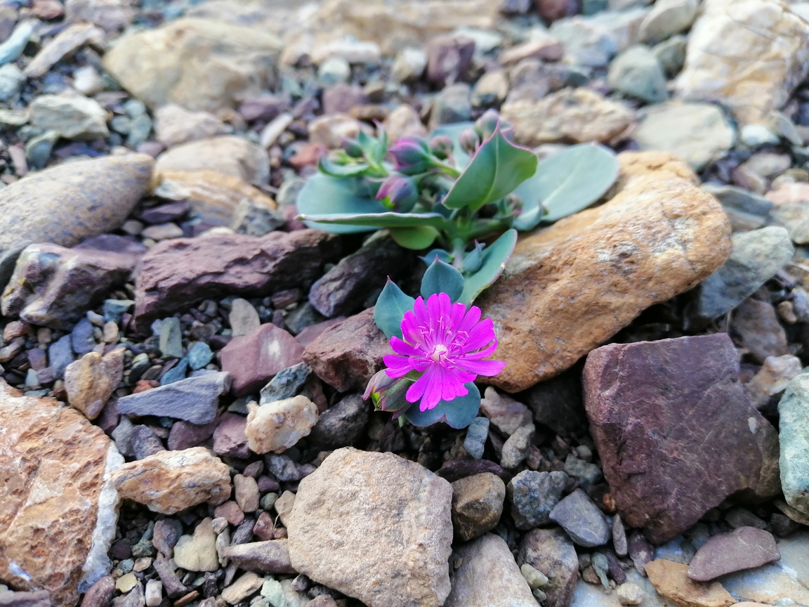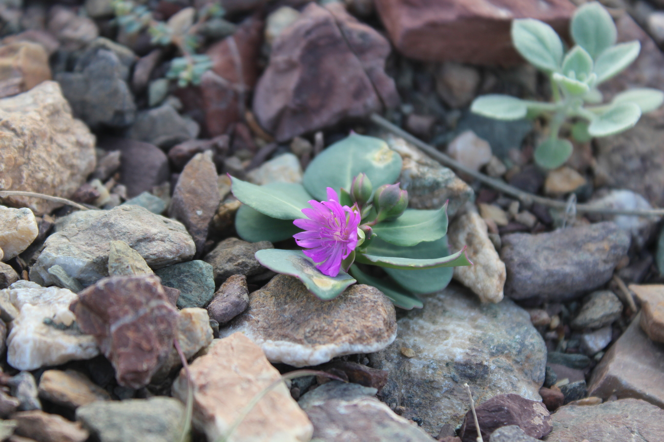 A semi prostrate herb , or short-lived perennial succulent herb ; up to 50 cm high , sometimes with woody rootstock . Stems erect to ascending , branched , often sub-woody at base , sometimes very long , smooth , somewhat succulent , often tinged red . Leaves alternate , 10-22 x 6-11 mm , fleshy , large , ovate to obovate-spatulate , apiculate tip , cuneate at base , entire margin , smooth ; petiole 1-4 mm . Inflorescences borne in lax , few- to many-flowered cymes , somewhat raceme-like . Flowers actinomorphic , bisexual , bright magenta-pink , 1 cm wide , shortly pedicellate ; sepals 4-8 mm , petaloid ; petals absent ; staminodes many , in 2 whorls , longer than the actual perianth , many , appearing as a large number of petals ; stamens free . Fruit capsule , 5-6 mm , yellowish-green , shining , dehiscing by 5 valves . Seeds purplish-black , concentrically ridged , with white aril . (Ref . Flora of Oman ; vol . 1) .