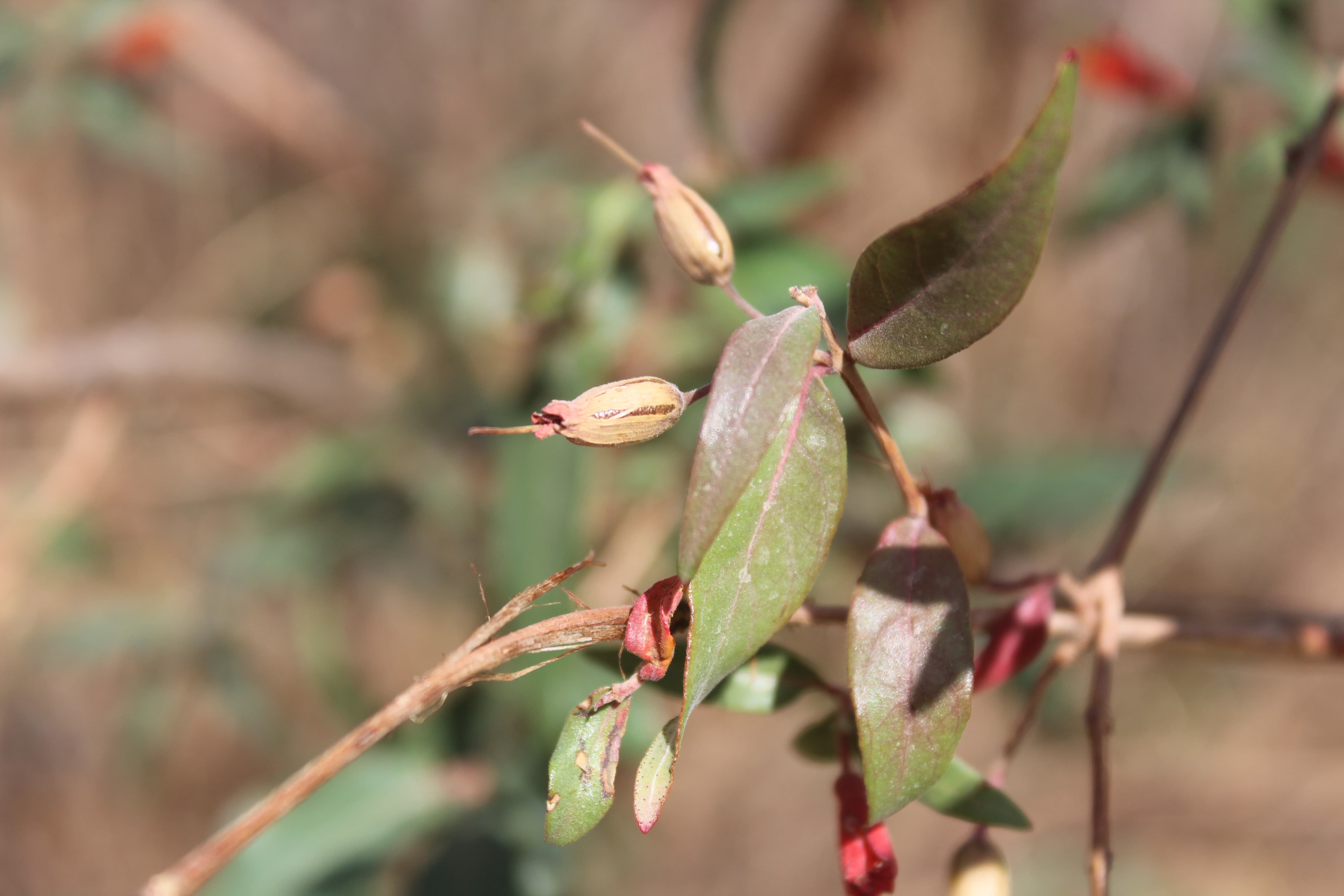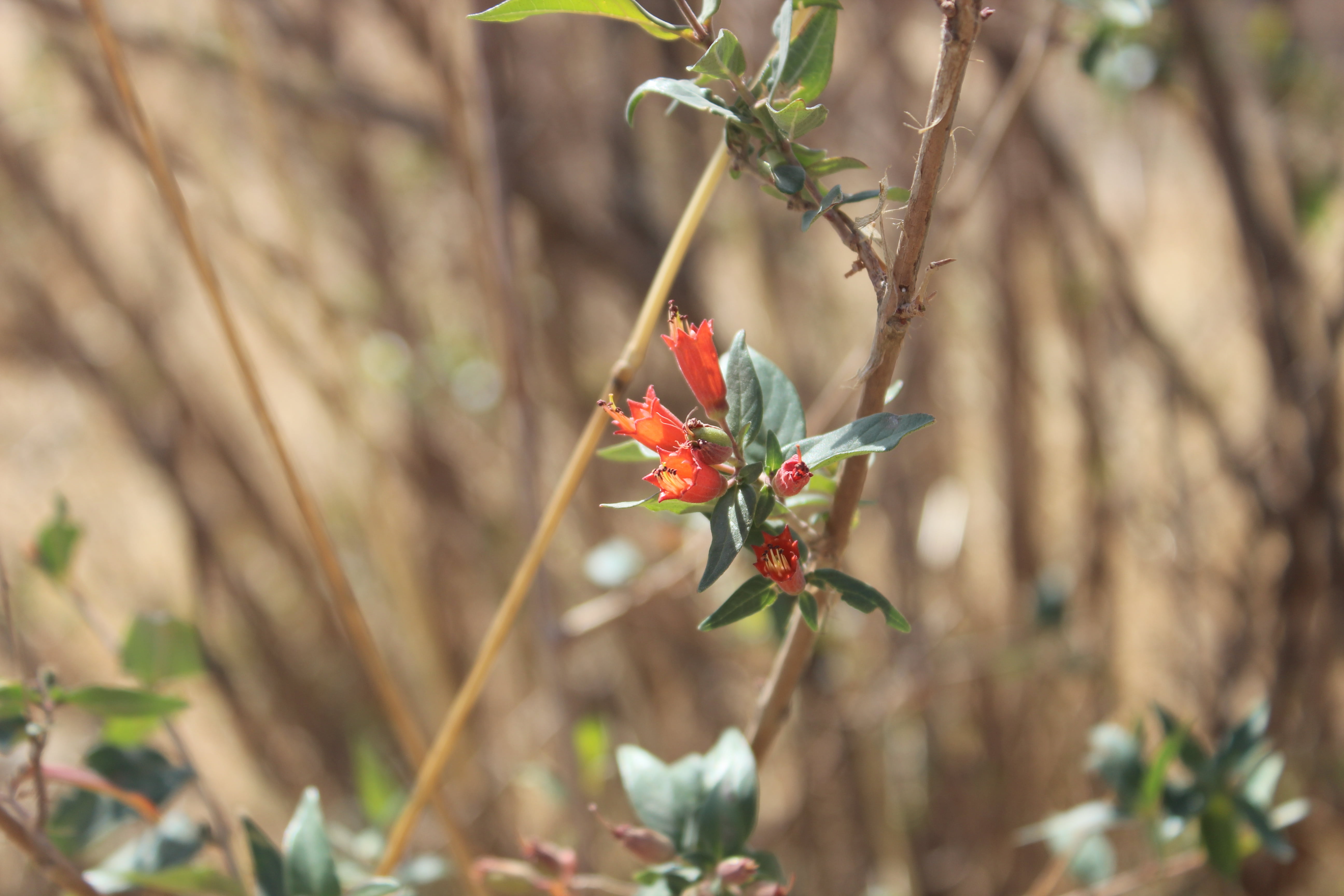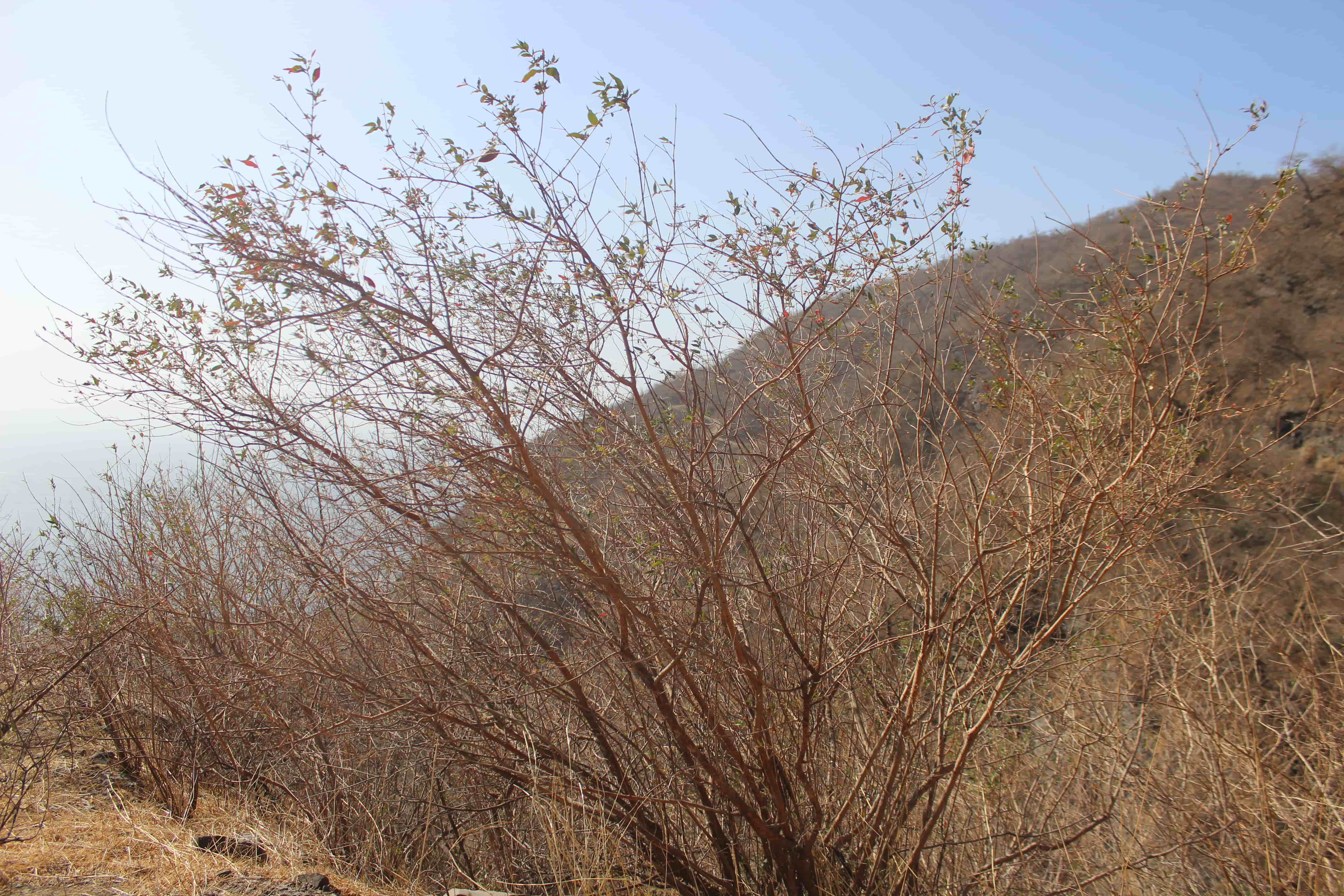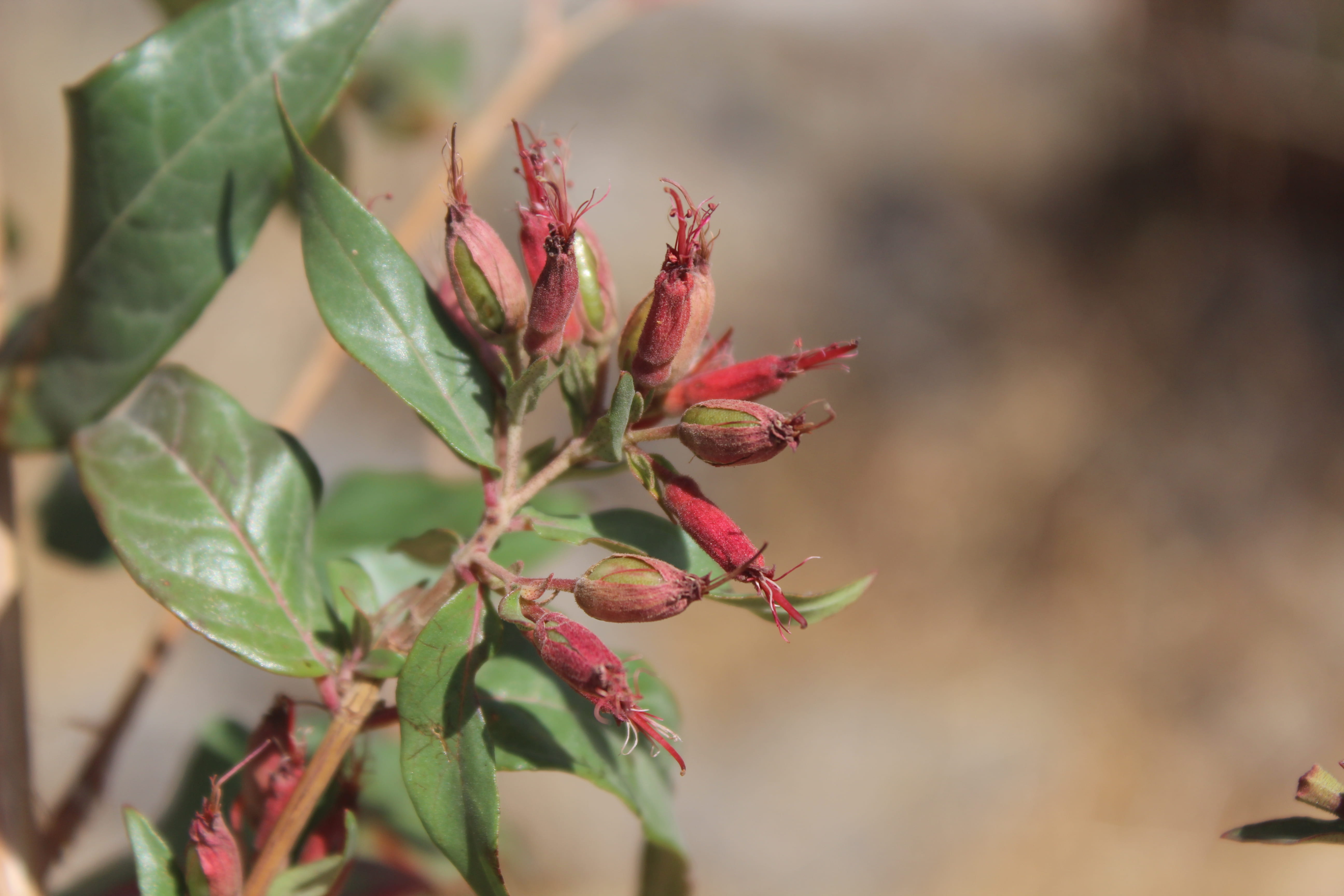 Small tree , often shrubby ; up to 2 m tall . Stems reddish to orange-brown ; bark flaky . Leaves opposite and decussate , sessile to shortly petiolate , 3-9 x 0 . 8-2 cm , ovate to elliptic-ovate , apex acute , base rounded , sparsely pubescent above , with conspicuous black to crimson glands on the undersurface . Inflorescences of short axillary cymes ; shortly pedicellate . Flowers slightly zygomorphic , red ; calyx 10-11 mm , tubular , 6-lobed , scarlet-red , pubescent on the outer surface ; petals 6 or absent , white or red , inserted in between on the calyx lobes ; stamens 12 ; filaments pinkish , inserted a third up on the calyx-tube ; anthers dark red , exserted . Fruit capsule , 12-13 mm , elliptic , pilose , many-seeded . (Ref . Flora of Oman ; vol . 2) .