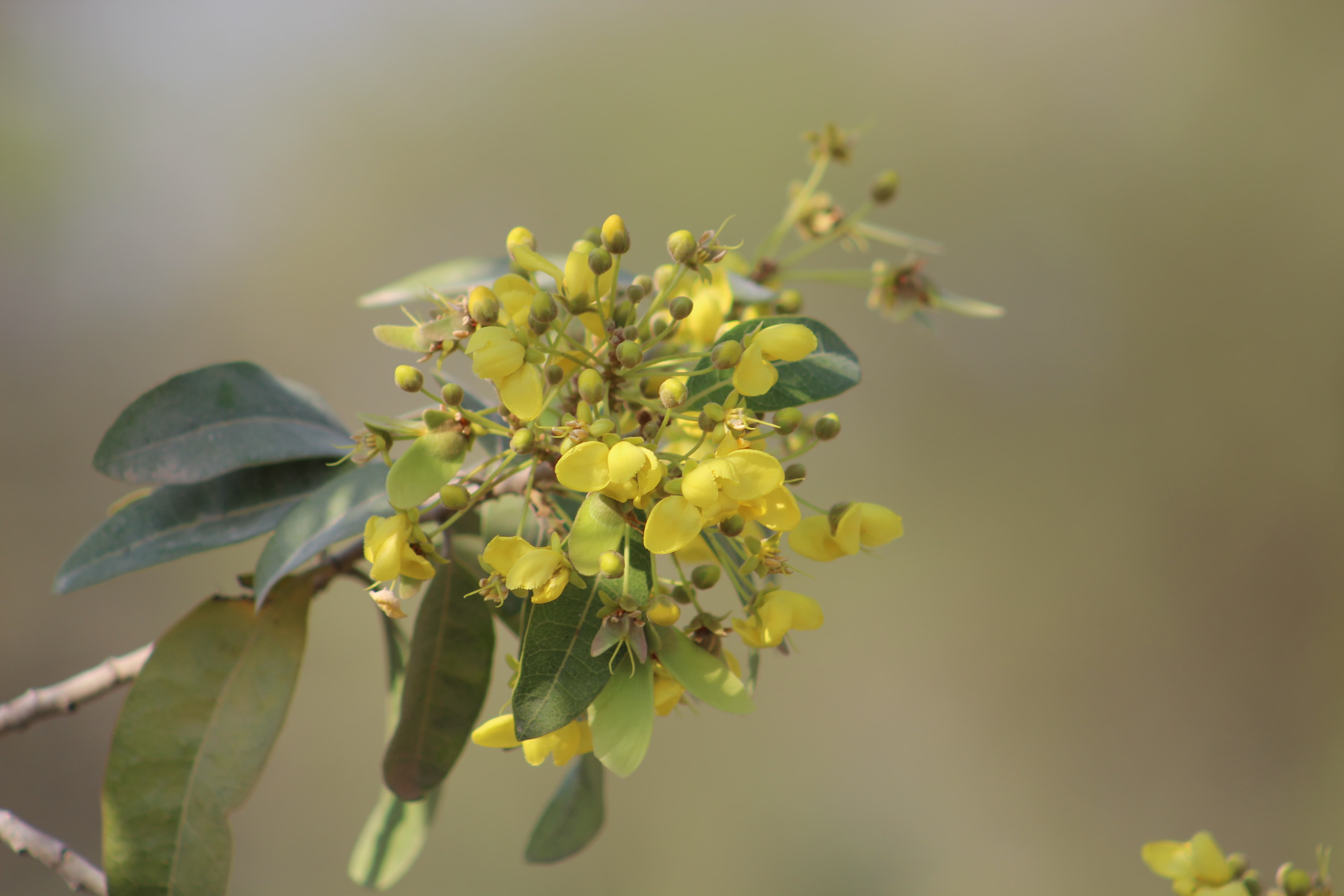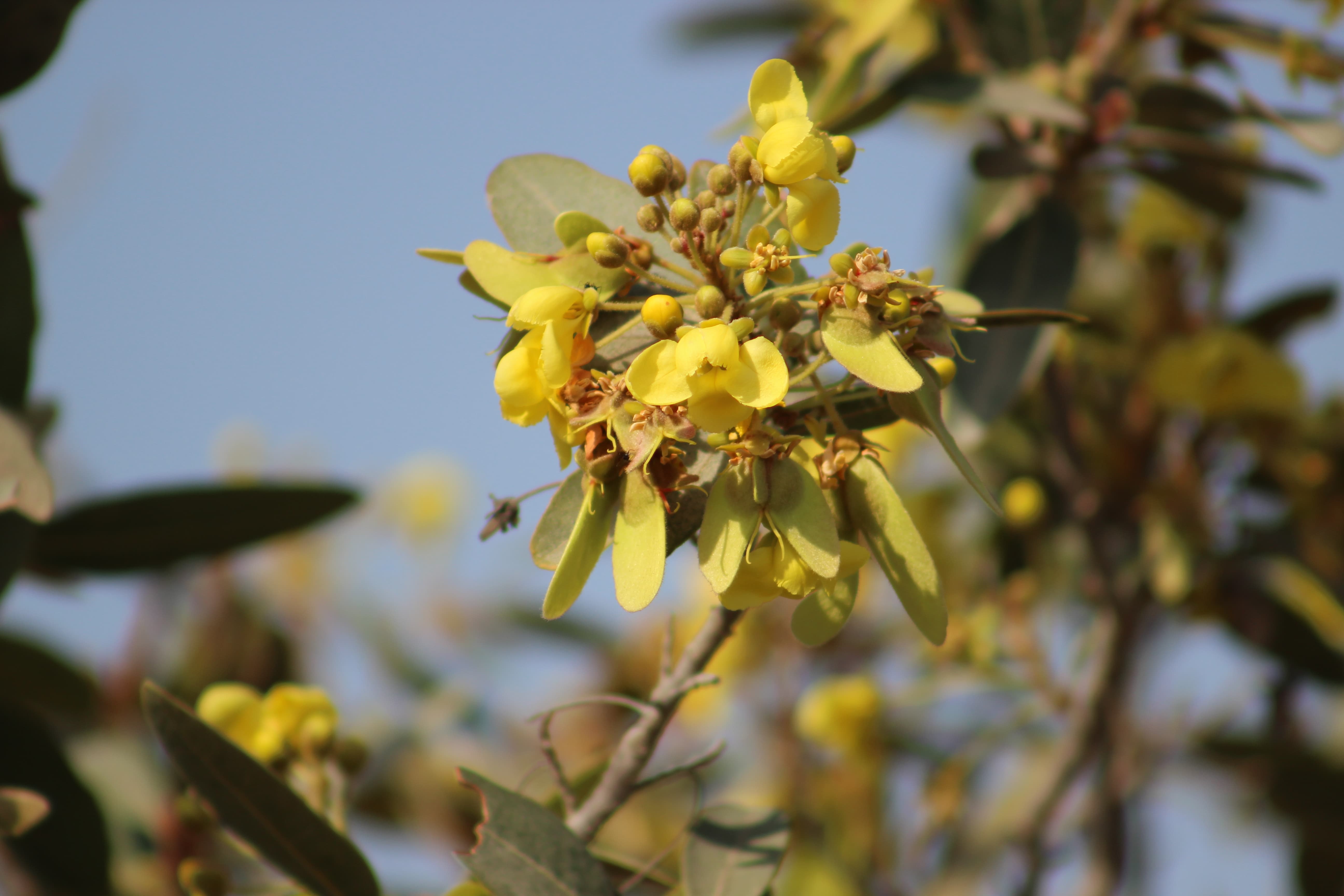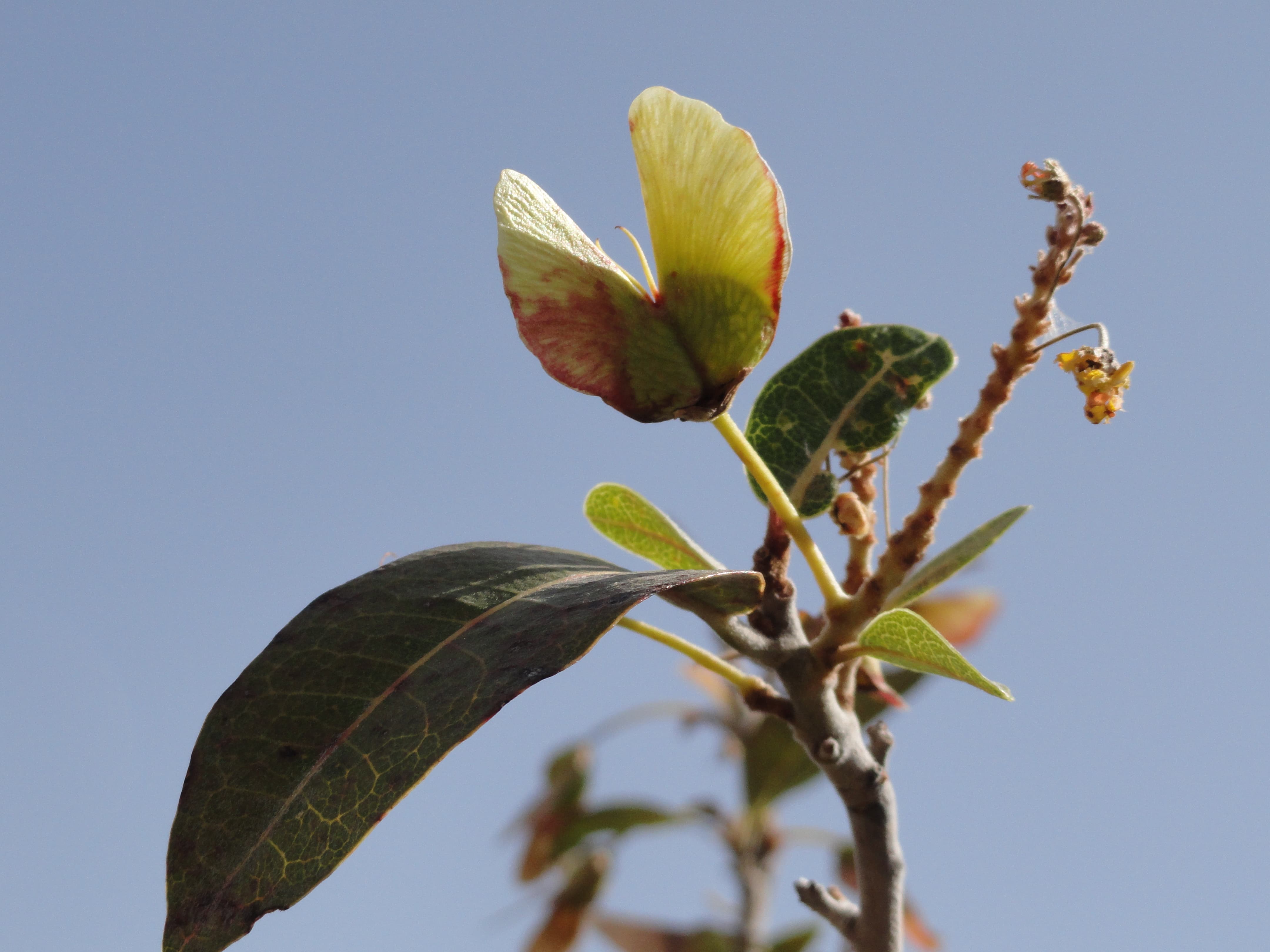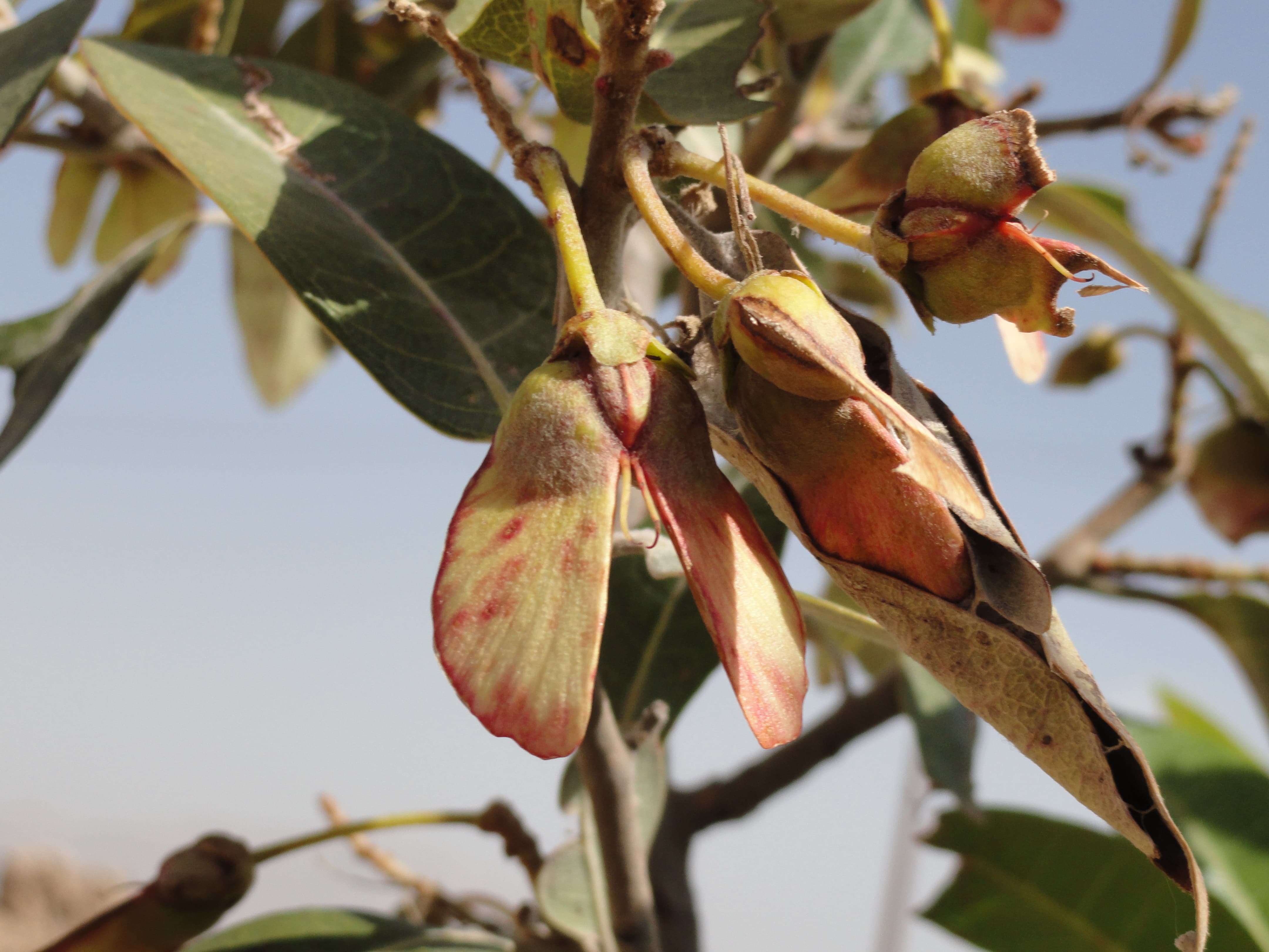 Large shrub ; up to 3 m tall , with whitish brown bark . Stems densely branched ; old bark grey . Leaves alternate , 6-12 x 2-4 cm , dark green , elliptic , tip acute or obtuse , base cuneate , margin entire , young leaves have reddish hair along the vines , older leaves are smooth but with prominent veins ; petiole 1-2 cm . Inflorescences in densely-flowered terminal racemes ; pedicels 2-2 . 5 cm long , densely reddish tomentose . Flowers bright yellow ; sepals 5 , free , oblong-ovate , 6 x 4 mm , tip rounded , with 1-2 glands at the base externally ; petals 5 , free , broadly ovate , shortly clawed at base , 12-17 x 7-10 mm , tip rounded and shortly fimbriate ; stamens 10 , anthers sessile ; styles 2 , curving upwards . Fruit 3 . 4-4 . 5 cm long , brown , paired with a single seed surrounded by a large pale brown hairy wing . (Ref . Flora of Oman ; vol . 2) .
