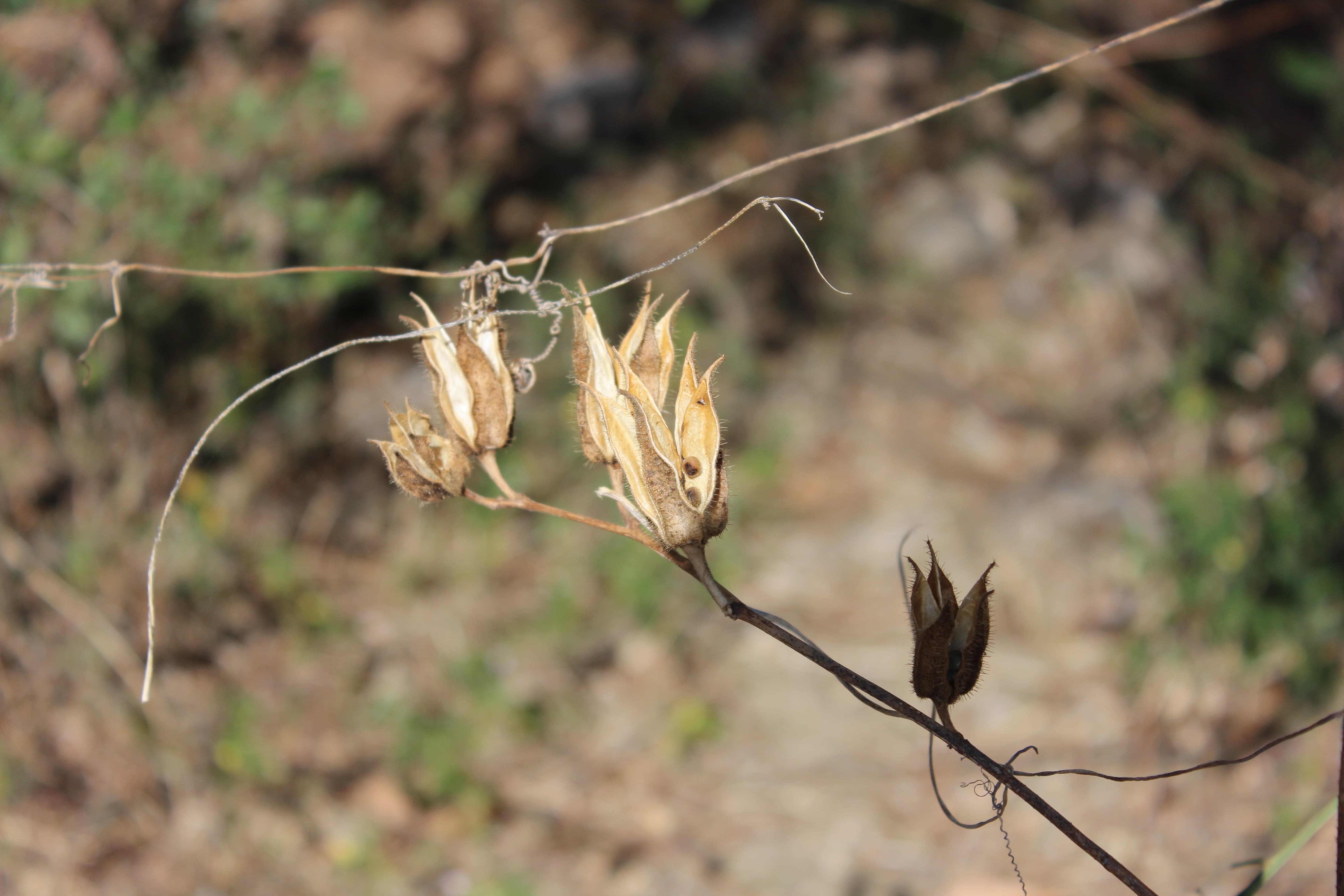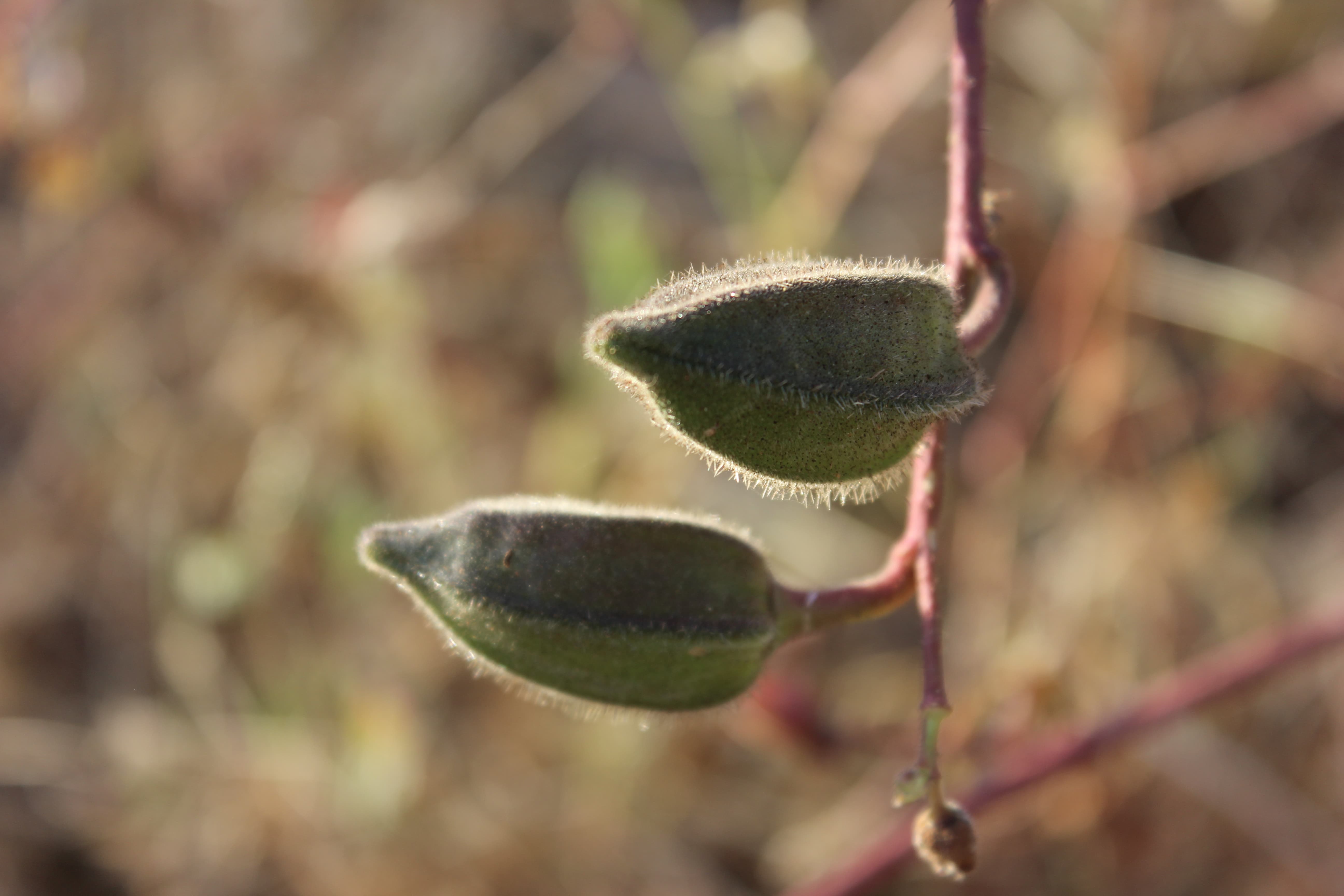 petals obovate , c . 25 x 12 mm ; staminal column ± 2 cm ; stamens numerous , filaments fused to form a tube enclosing the style ; ovary 5-celled , style simple ; stigma crimson , 5-lobed . Fruit capsule , 3-5 cm long x 1 . 5-2 cm in diameter , cylindrical to ovoid , densely strigose , many-seeded . Seeds 3 . 5-4 mm across , globose , dark brown , covered with soft pale brown hairs . (Ref . Plants of Dhofar) .