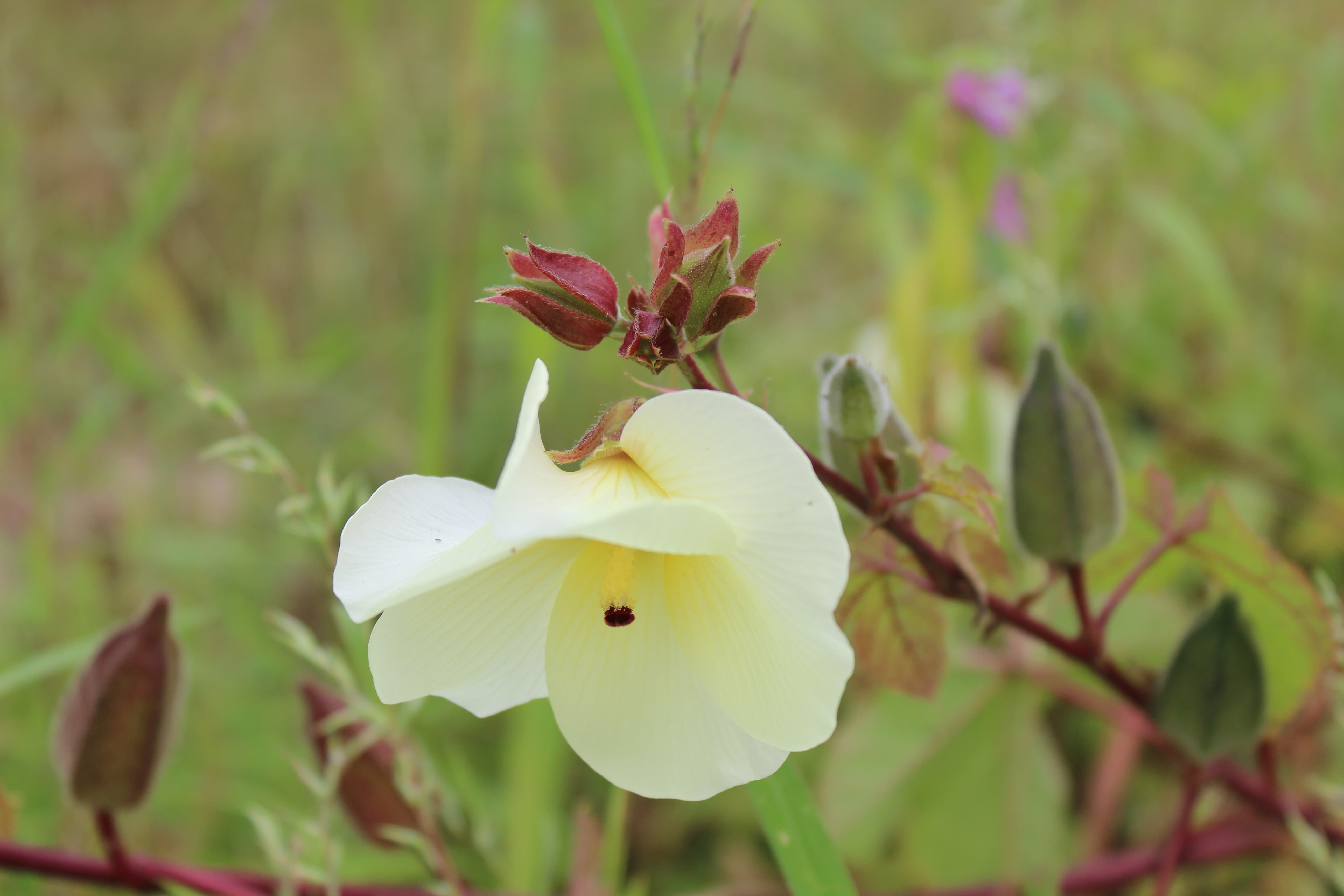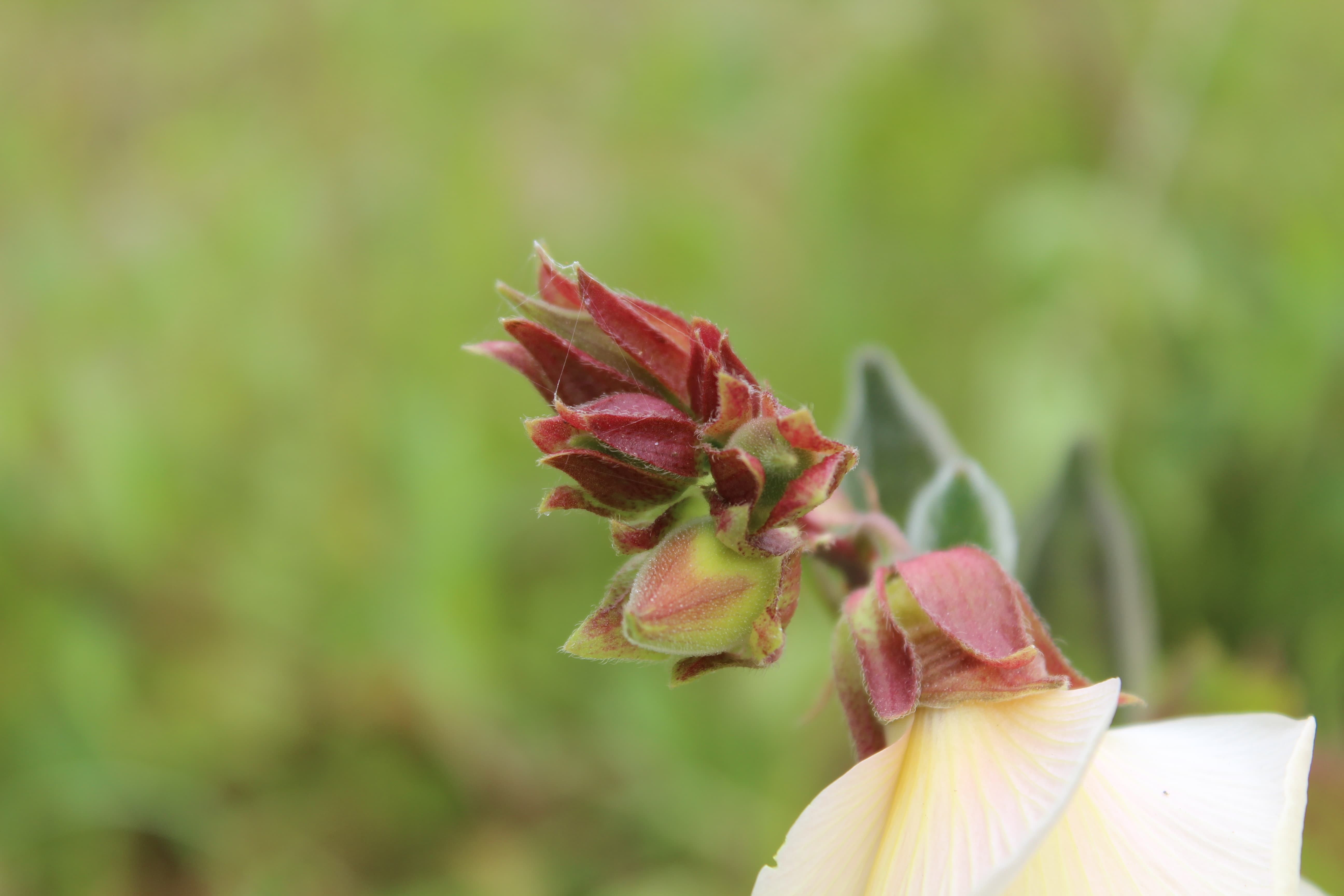Annual , erect herb ; up to 1 m tall . Stems erect , usually unbranched , tinged red , strigose with upwardly directed simple hairs . Leaves alternate , 10-20 cm , 5-angled below becoming deeply lobed higher up the stem , margin crenate to serrate , base cordate , covered with appressed simple hairs ; lower leaves 5-angled , up to 10 cm long x 12 cm across ; upper leaves , up to 20 cm long x 25 cm across , 3(-5)-lobed ; lobes oblong , up to 15 cm long x 5 cm across , acute ; petioles 3-15 cm . Inflorescences solitary , in the axils of leaves ; pedicels 5-12 mm , lenthening a liitle in fruit ; epicalyx lobes 8-13 , ovate , persistent . Flowers pale yellow with a dark red-crimson centre ; calyx 1 . 5-2 cm long , 5-toothed at tip , irregularly splitting into 2 lobes , attached to the corolla and falling along with it ; corolla pale yellow with a crimson centre , of five overlapping petals , attached at base to the staminal tube ;