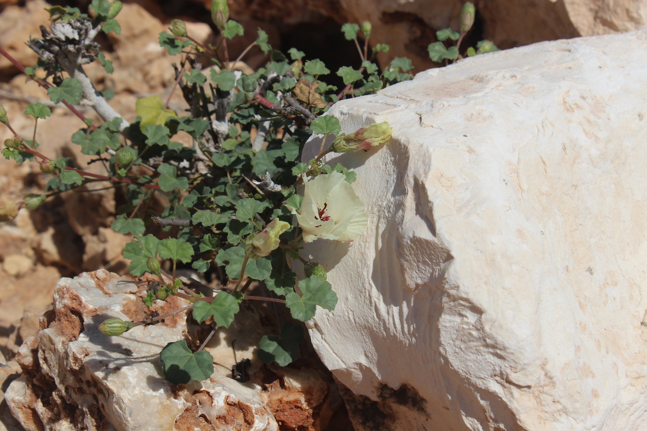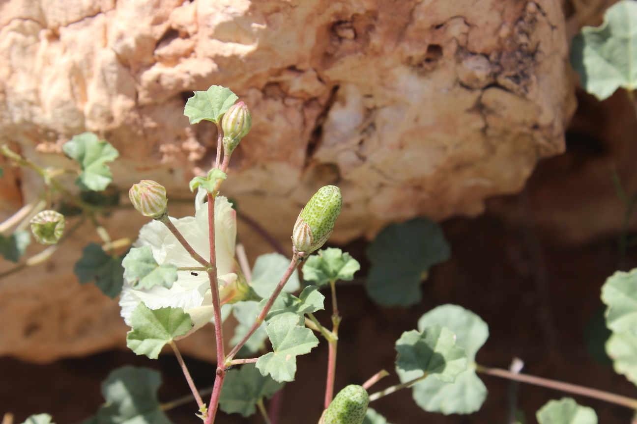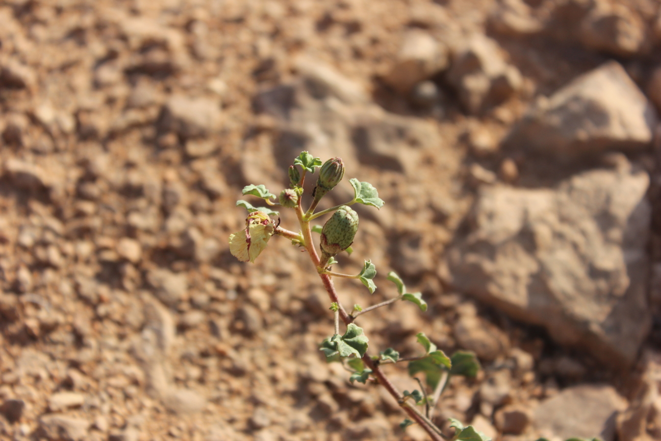 Annual or perennial herb , or subshrub ; up to 1 m tall , with a pungent smell . Stems erect to decumbent , glabrous or puberulous . Leaves ± 3 cm across , roughly orbicular in outline , shallowly 3-lobed with sinuate margins , glabrous to puberulous or scabrid on veins ; petiole about as long as the leaves . Inflorescences solitary , in leaf axils ; pedicels 0 . 3–6 cm long , glabrous or puberulous . Flowers about 3 cm across , yellow with crimson spots and a crimson centre ; calyx ± 3 mm , dark gland dotted along the veins ; petals 14-15 mm , obovate . Fruit capsule , 1 . 8-2 cm , green with crimson blotches , ellipsoid to subglobose , appressed pubescent or subglabrous . Seeds 4–5 mm long , densely covered with brownish hairs . (Ref . Flora of Oman ; vol . 1) .