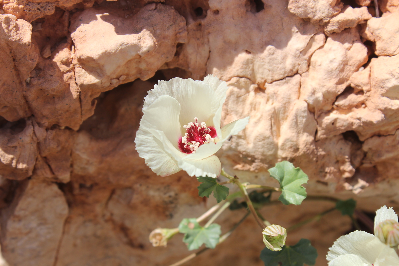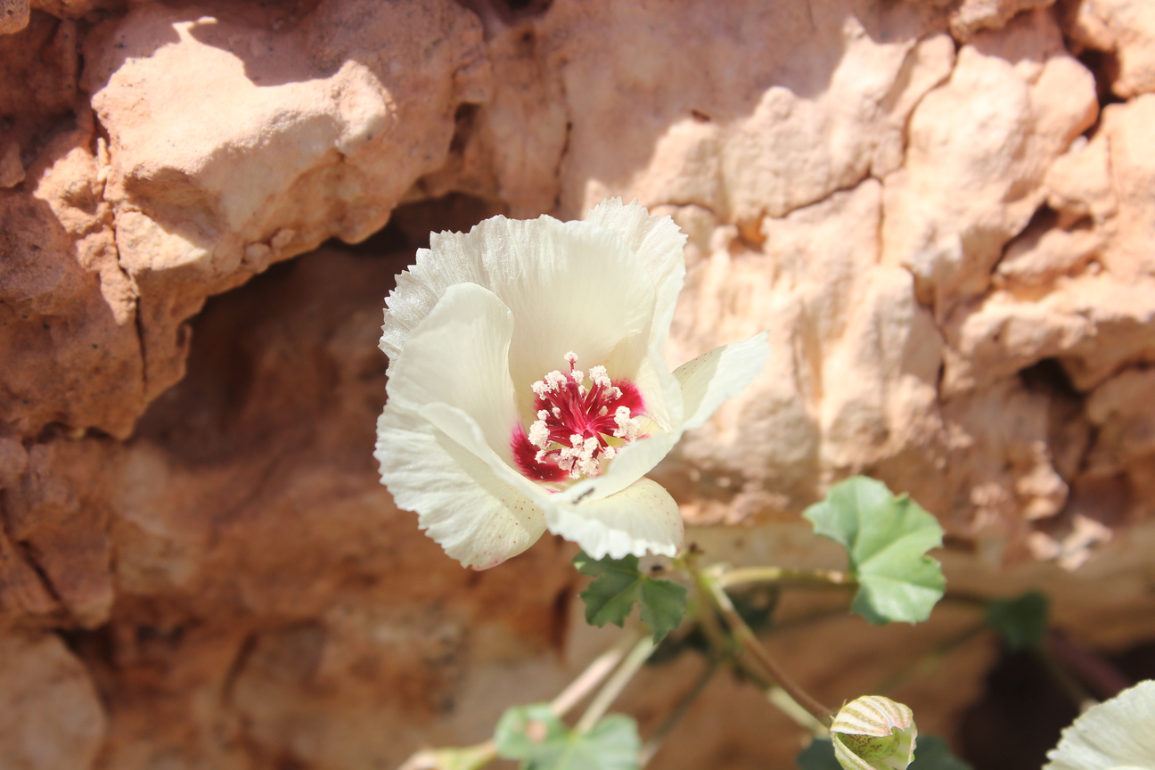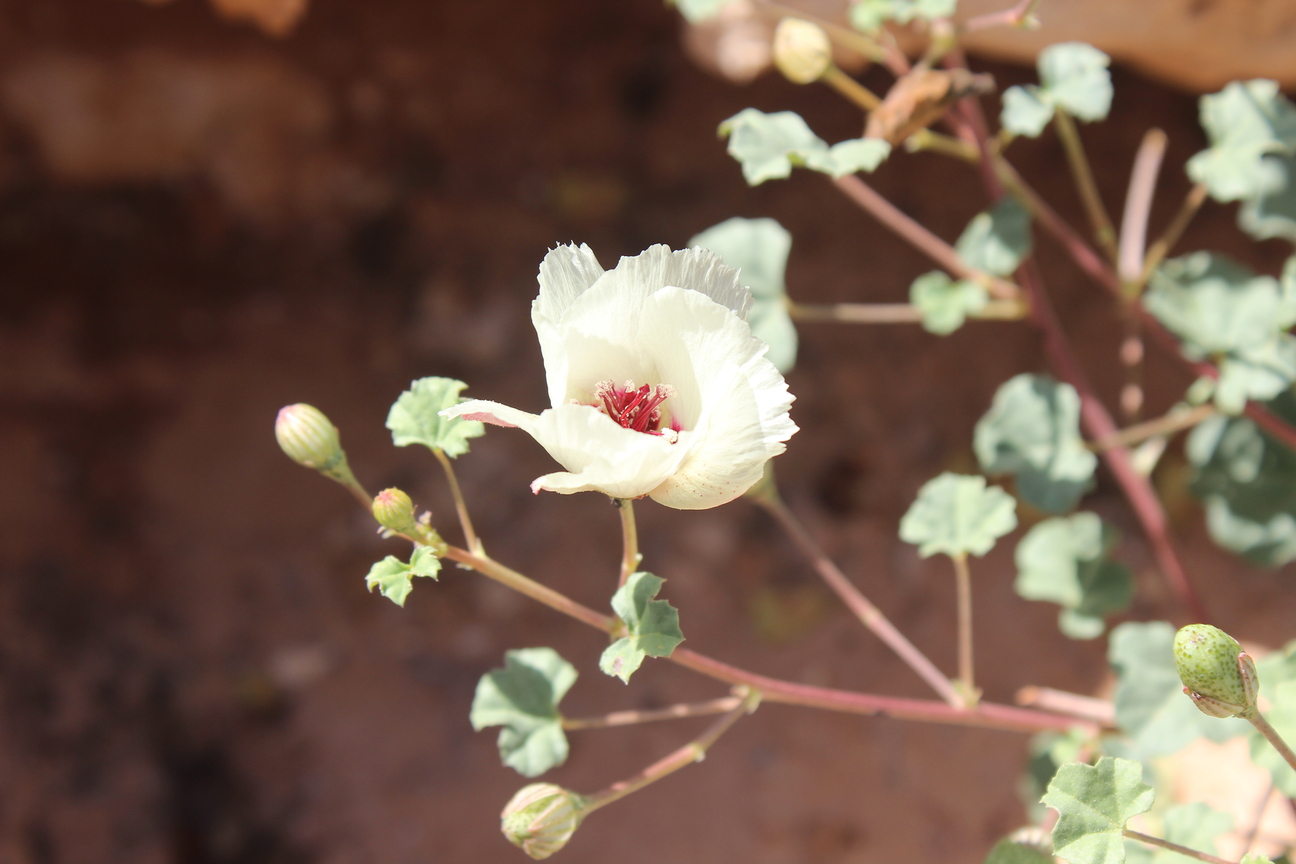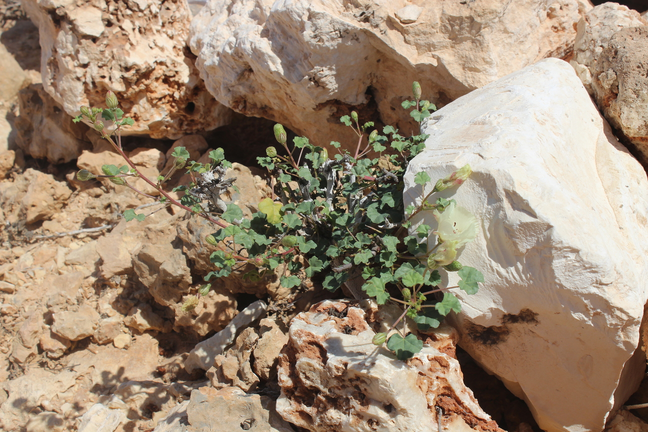 Annual or perennial herb , or subshrub ; up to 1 m tall , with a pungent smell . Stems erect to decumbent , glabrous or puberulous . Leaves ± 3 cm across , roughly orbicular in outline , shallowly 3-lobed with sinuate margins , glabrous to puberulous or scabrid on veins ; petiole about as long as the leaves . Inflorescences solitary , in leaf axils ; pedicels 0 . 3–6 cm long , glabrous or puberulous . Flowers about 3 cm across , yellow with crimson spots and a crimson centre ; calyx ± 3 mm , dark gland dotted along the veins ; petals 14-15 mm , obovate . Fruit capsule , 1 . 8-2 cm , green with crimson blotches , ellipsoid to subglobose , appressed pubescent or subglabrous . Seeds 4–5 mm long , densely covered with brownish hairs . (Ref . Flora of Oman ; vol . 1) .