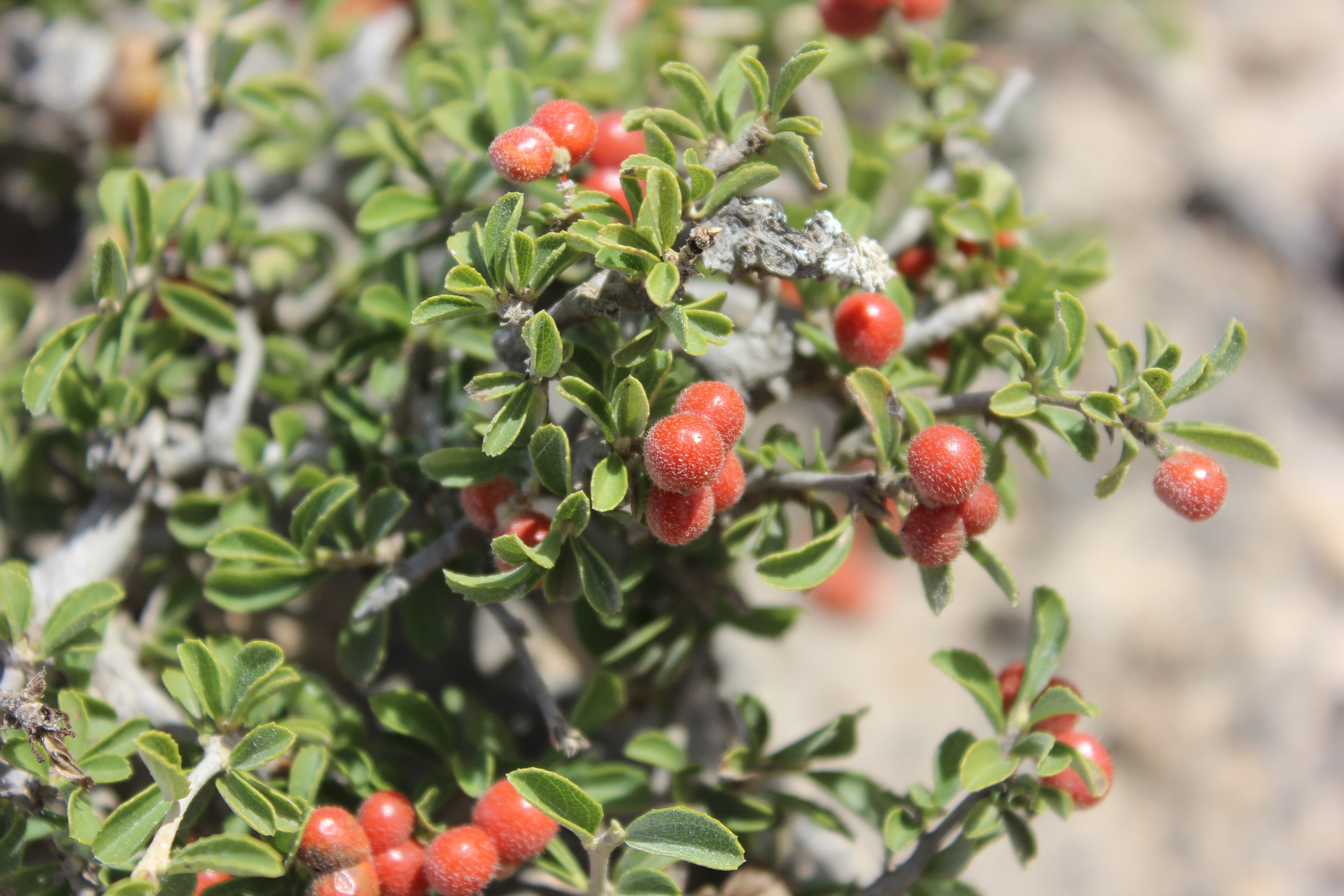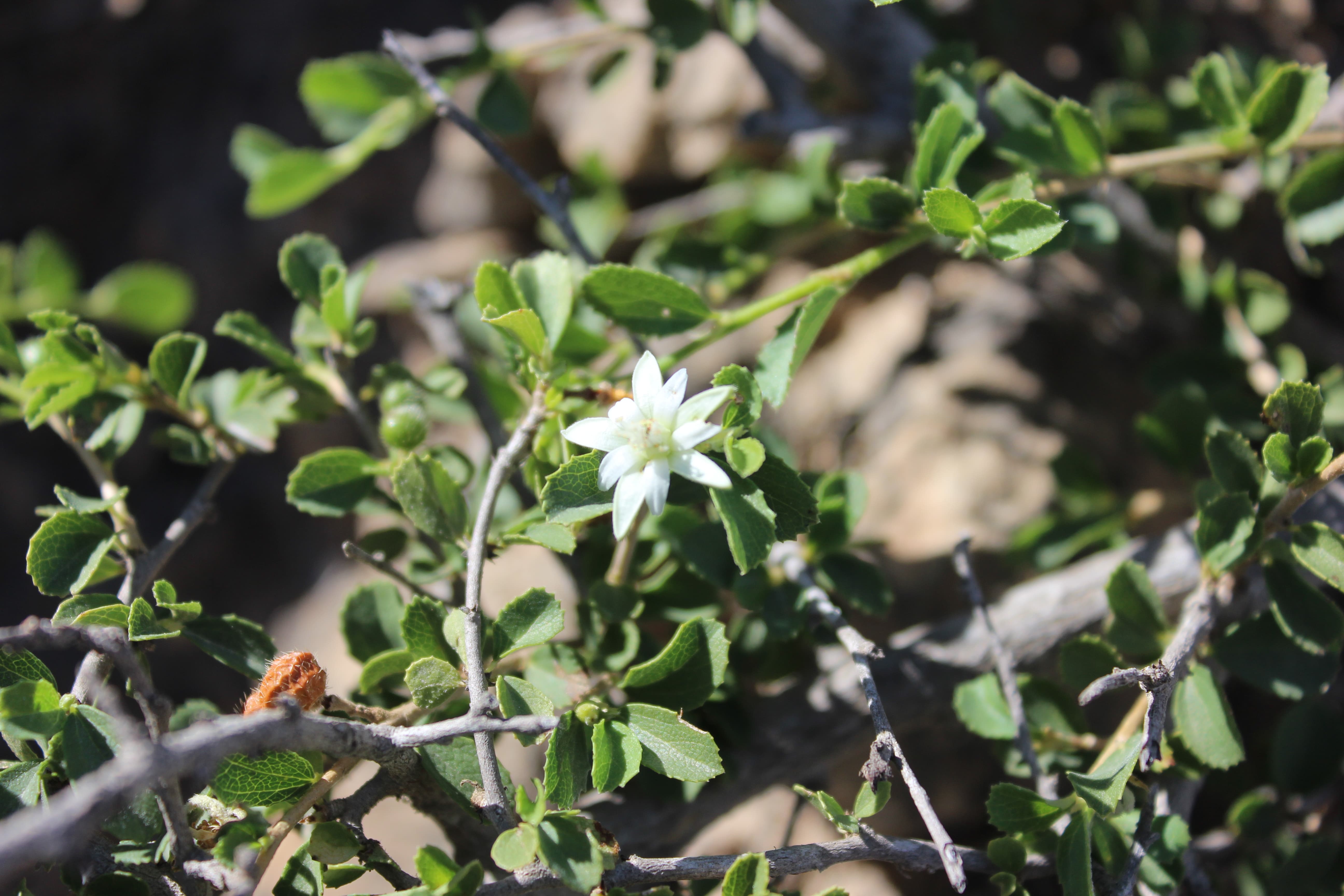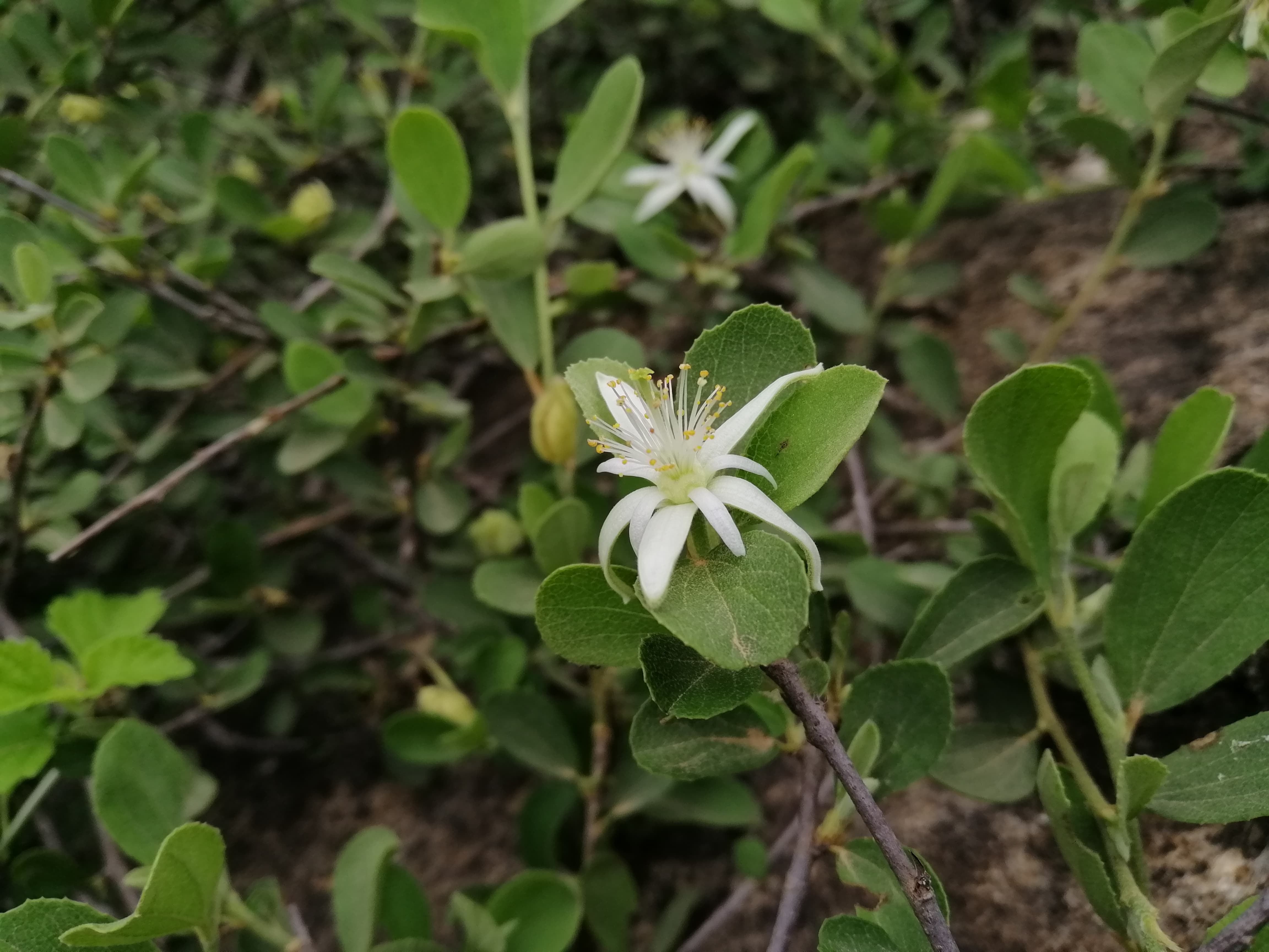 A prostrate dense , woody bush ; up to 1-2 m tall , stellate-hairy with grey bark . Stems and branches stunted , often straggling or growing prostrate . Leaves alternate , 1-2 x 0 . 4-0 . 7 mm , in fascicles , stipulate , elliptic to obovate , apex obtuse , base cuneate , serrated margins , 3-veined at the base , green on both surfaces ; petiole 2-3 mm . Inflorescences 1-2 , axillary ; pedicel 3-4 mm . Flowers white , fragrant ; sepals 9-10 mm , linear-oblong , stellate-hairy ; petals 5 , free , white , ± 6 mm , linear-oblong , shortly clawed , bent back ; stamens many , in 2 whorls , 5–6 mm long ; ovary 1-4-lobed , densely hairy , ± 1 mm long ; style 5–6 mm long . Fruit drupe , 5-8 mm , globose , (2-)4-lobed , with scattered long hairs , green turning orange as they mature . (Ref . Flora of Oman ; vol . 1) .