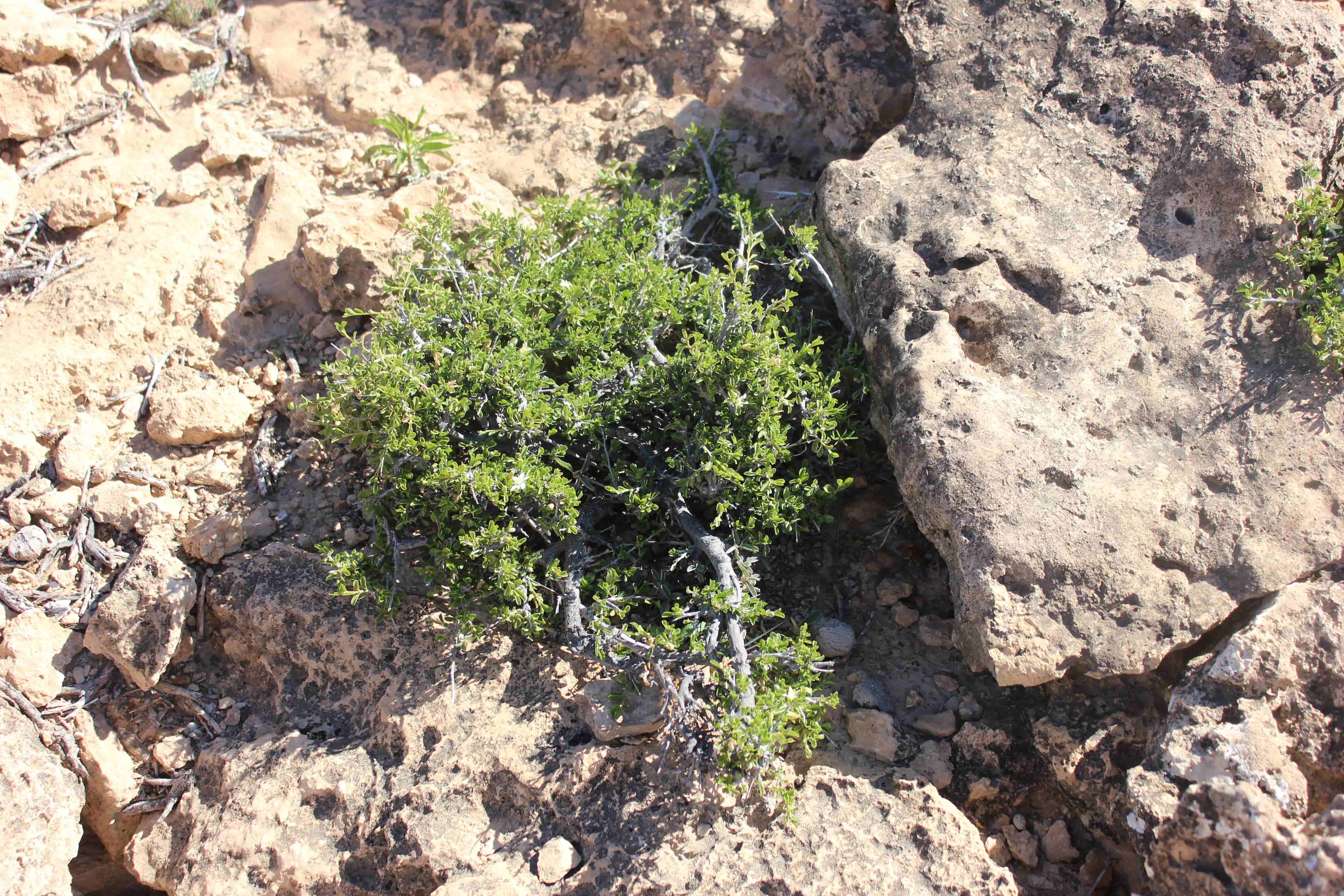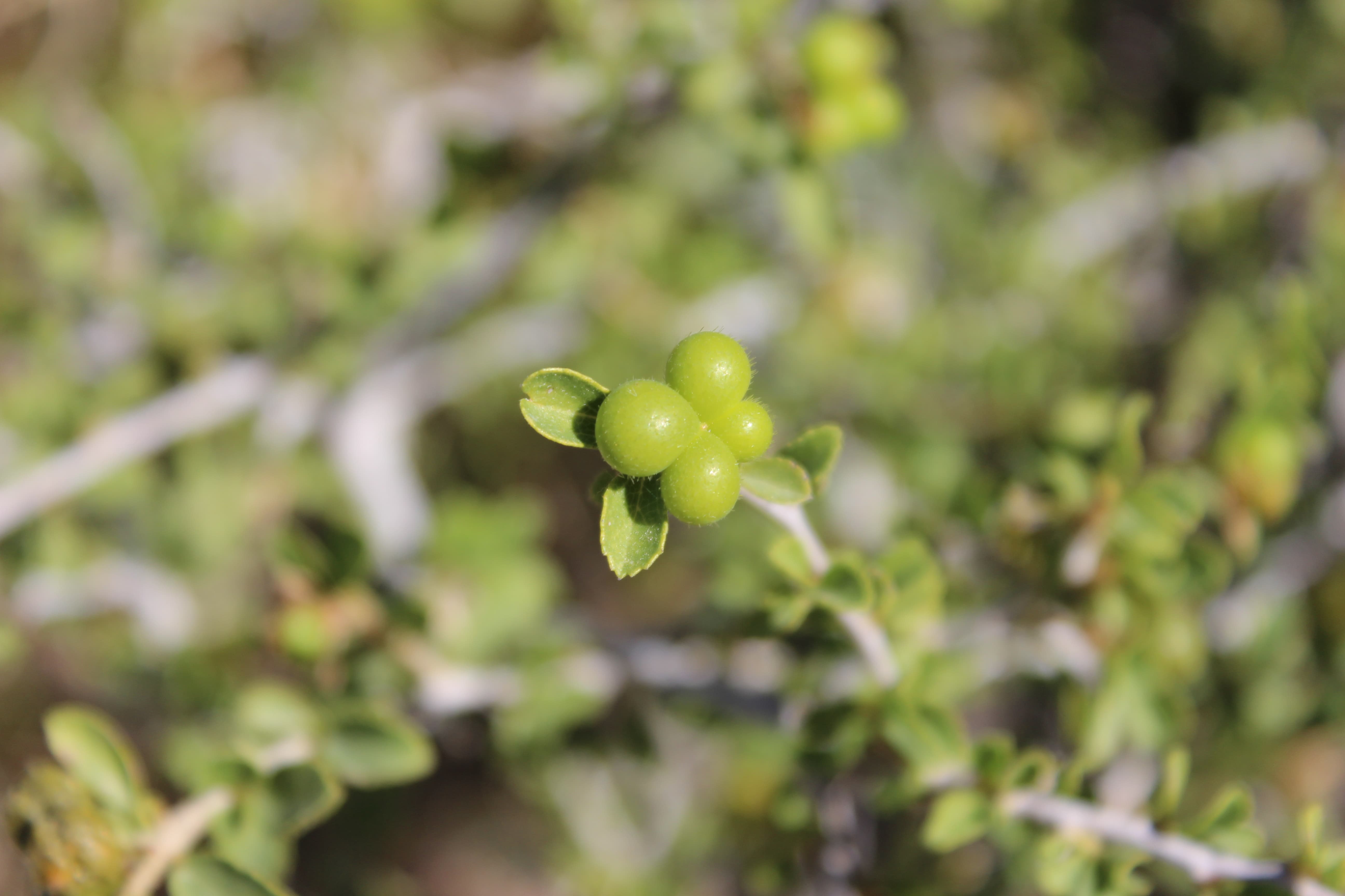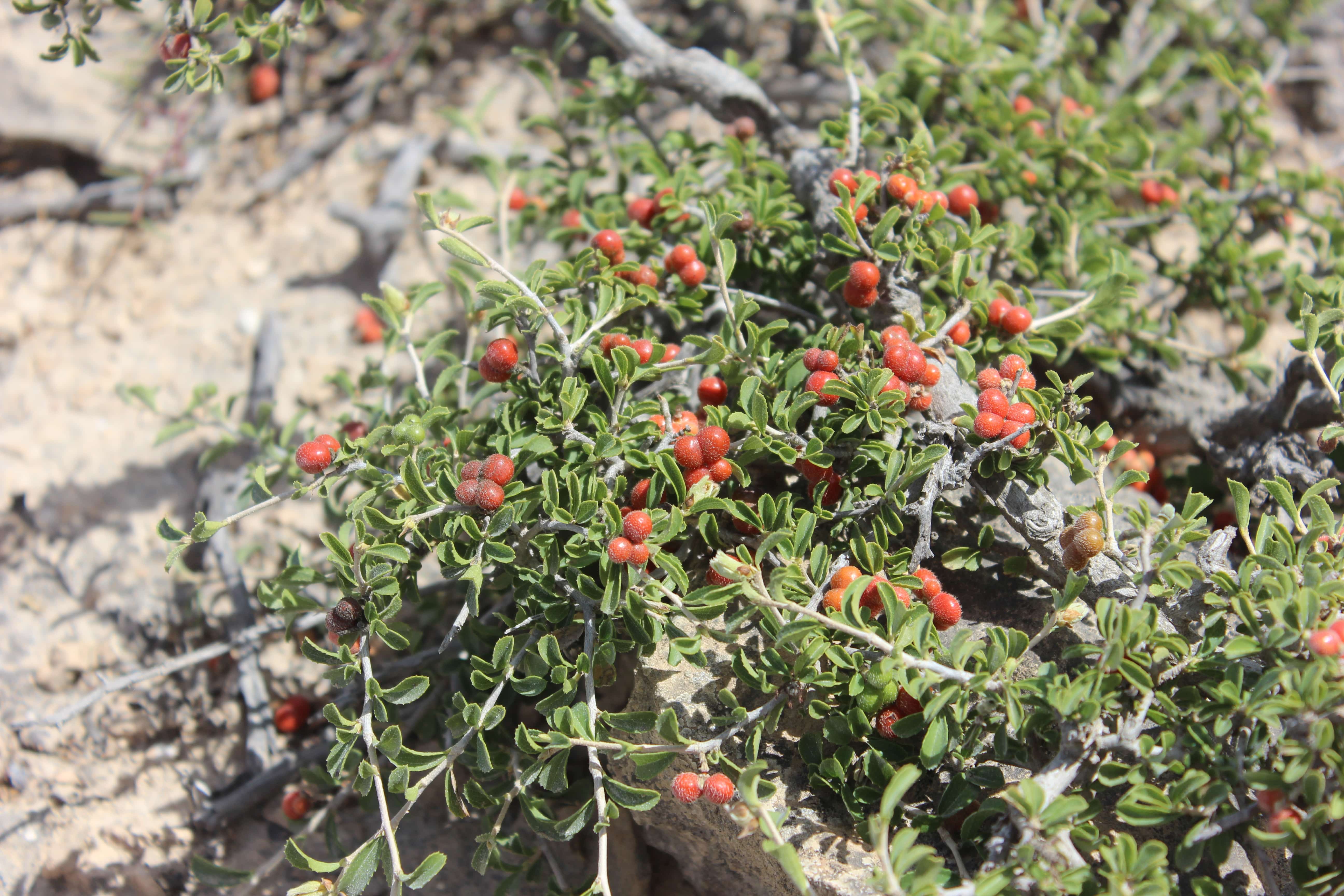 A prostrate dense , woody bush ; up to 1-2 m tall , stellate-hairy with grey bark . Stems and branches stunted , often straggling or growing prostrate . Leaves alternate , 1-2 x 0 . 4-0 . 7 mm , in fascicles , stipulate , elliptic to obovate , apex obtuse , base cuneate , serrated margins , 3-veined at the base , green on both surfaces ; petiole 2-3 mm . Inflorescences 1-2 , axillary ; pedicel 3-4 mm . Flowers white , fragrant ; sepals 9-10 mm , linear-oblong , stellate-hairy ; petals 5 , free , white , ± 6 mm , linear-oblong , shortly clawed , bent back ; stamens many , in 2 whorls , 5–6 mm long ; ovary 1-4-lobed , densely hairy , ± 1 mm long ; style 5–6 mm long . Fruit drupe , 5-8 mm , globose , (2-)4-lobed , with scattered long hairs , green turning orange as they mature . (Ref . Flora of Oman ; vol . 1) .