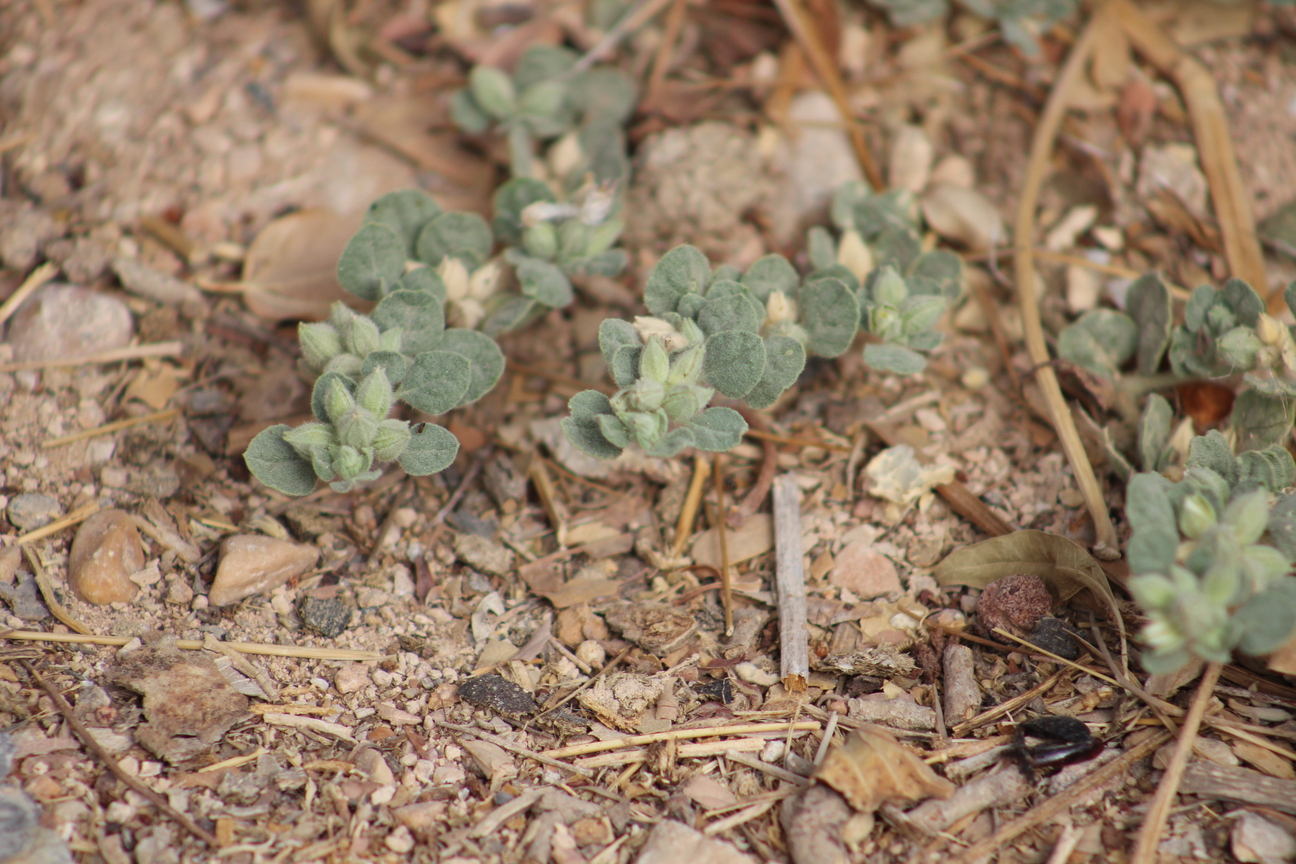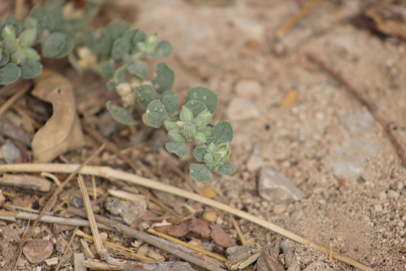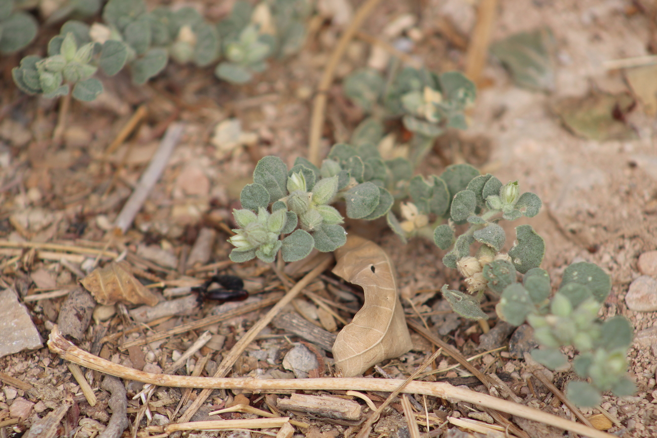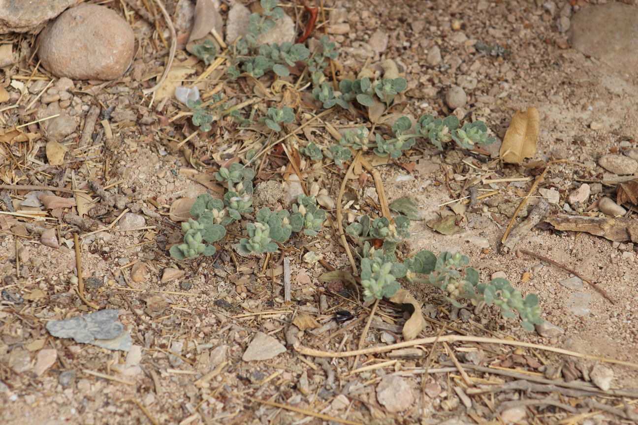 A decumbent to prostrate spreading herb ; up to 10 cm high , diffusely branched . Stems decumbent to prostrate , covered with soft whitish silky stellate hairs . Leaves opposite , alternate or appearing whorled , 8-40 x 5-20 mm , 3 or 4 at each node , elliptic to obovate , apex obtuse or rounded , base cuneate , margins sinuate , green when glabrous or glabrescent , whitish when densely covered with persistent stellate silky hairs . Inflorescences borne in stalkless clusters of 5-6 , in leaf axils ; pedicels 1-6 mm . Flowers greenish-white , sometimes with a pink tinge ; sepals 5 , accrescent , tinged pink , stellate-pubescent , 5-8 mm ; petals absent ; stamens many , staminodes linear , white , c . 15 in number , 2-fid at the apex ; ovary of (3)5 united carpels ; stigmas (3)5 . Fruit capsule , ± 5 x 3 mm , subglobose . Seeds many , dark brown , usually with ridges , with or without tubercles . (Ref . Flora of Oman ; vol . 1) .