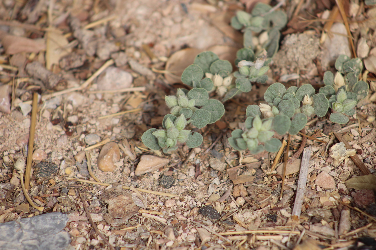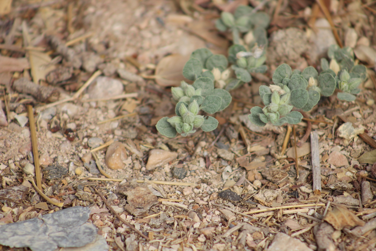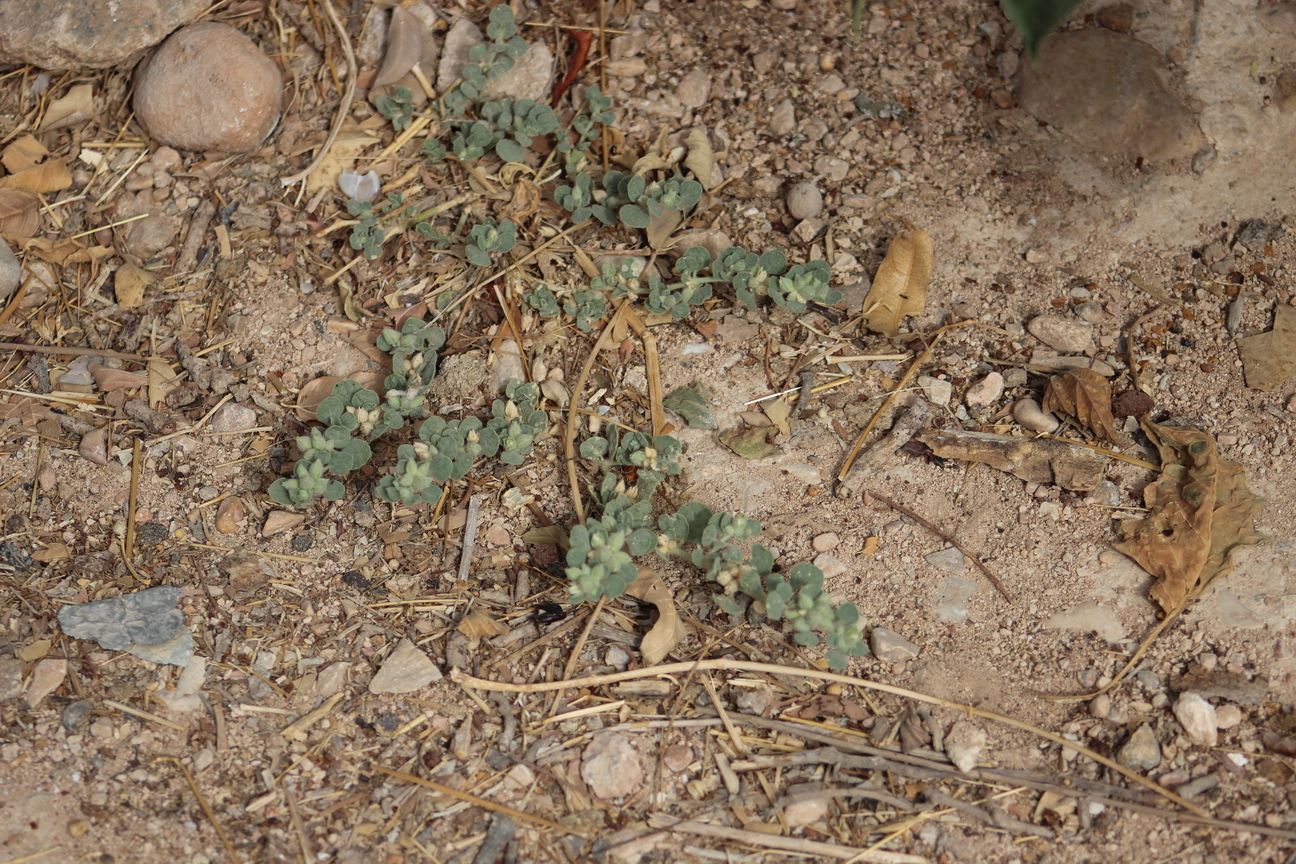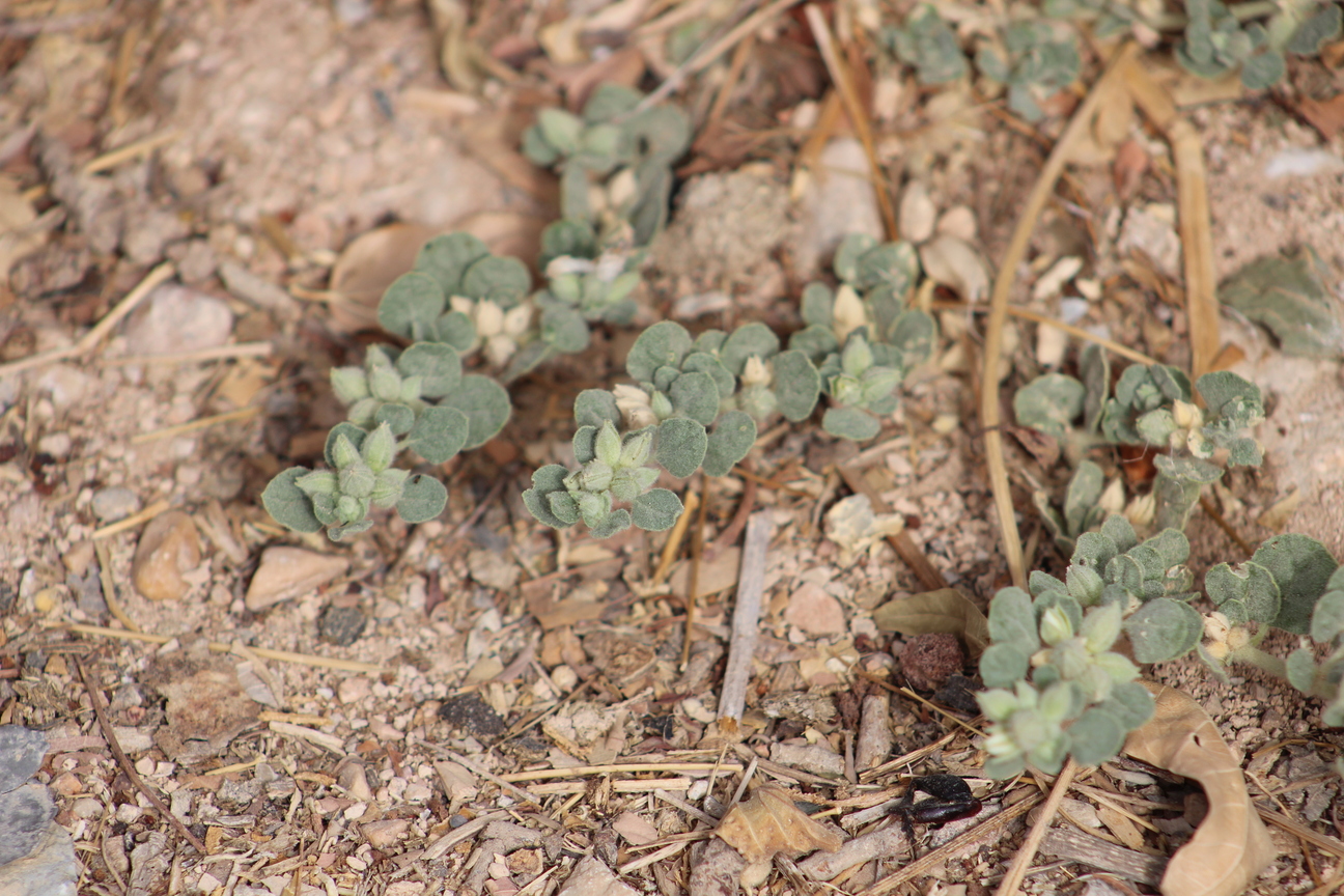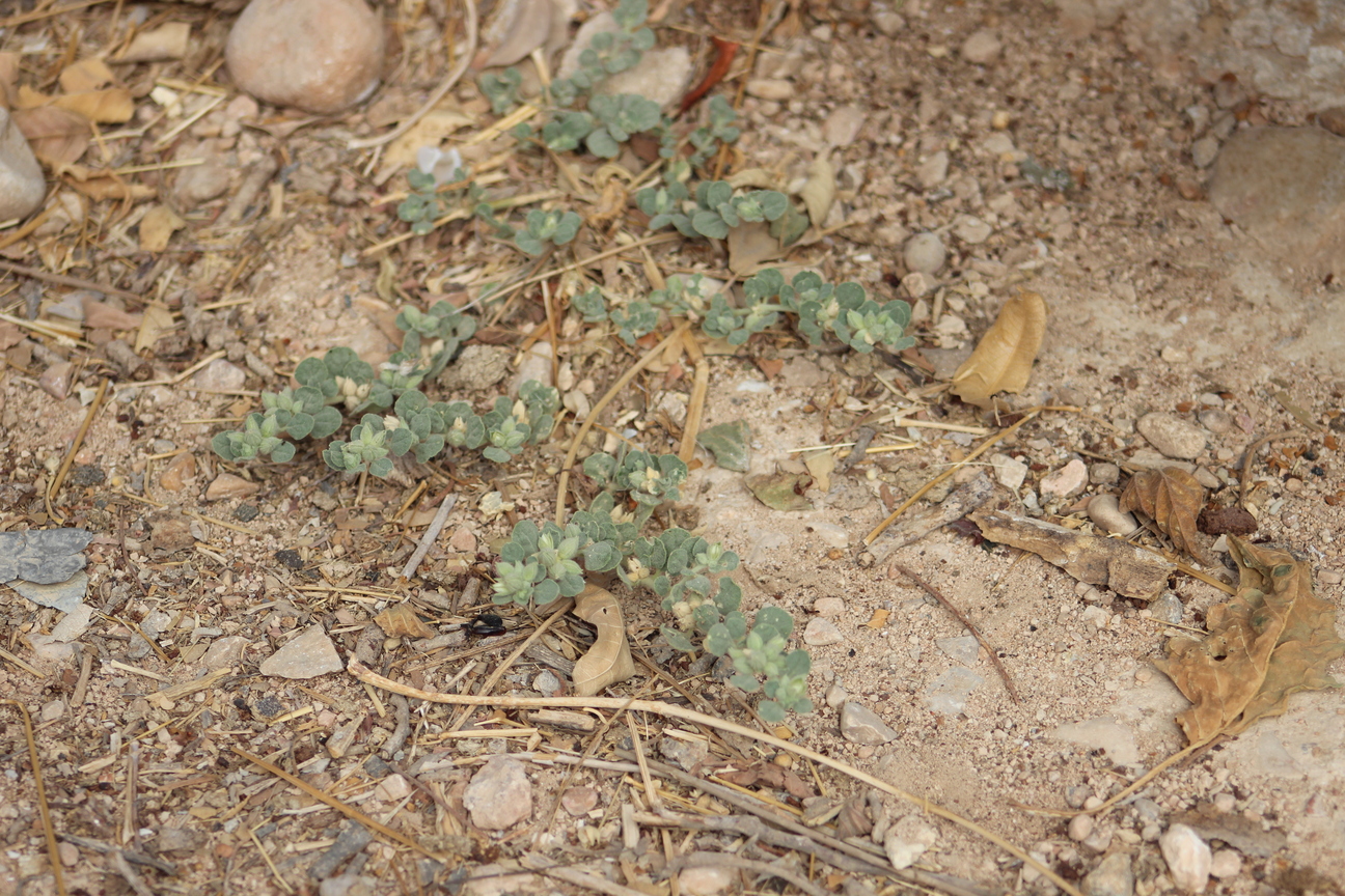 A decumbent to prostrate spreading herb ; up to 10 cm high , diffusely branched . Stems decumbent to prostrate , covered with soft whitish silky stellate hairs . Leaves opposite , alternate or appearing whorled , 8-40 x 5-20 mm , 3 or 4 at each node , elliptic to obovate , apex obtuse or rounded , base cuneate , margins sinuate , green when glabrous or glabrescent , whitish when densely covered with persistent stellate silky hairs . Inflorescences borne in stalkless clusters of 5-6 , in leaf axils ; pedicels 1-6 mm . Flowers greenish-white , sometimes with a pink tinge ; sepals 5 , accrescent , tinged pink , stellate-pubescent , 5-8 mm ; petals absent ; stamens many , staminodes linear , white , c . 15 in number , 2-fid at the apex ; ovary of (3)5 united carpels ; stigmas (3)5 . Fruit capsule , ± 5 x 3 mm , subglobose . Seeds many , dark brown , usually with ridges , with or without tubercles . (Ref . Flora of Oman ; vol . 1) .