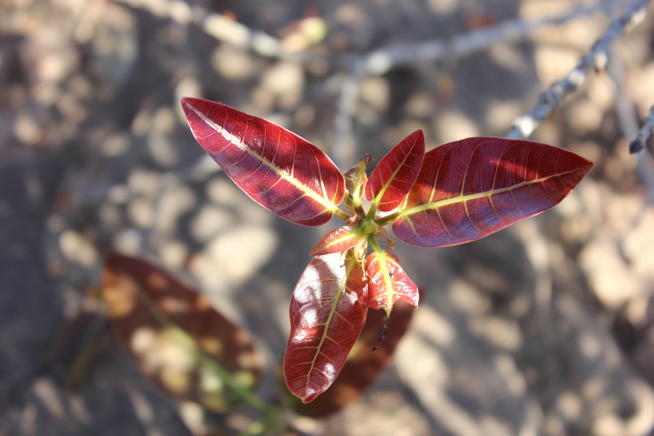 Shrub or small tree ; up to 10 m tall , with grey-brown bark , white latex and rounded , spreading crown . Stems smooth , grey-brown ; young branches with a yellow tinge . Leaves 9-20 x 3-8 cm , narrowly ovate to lanceolate to oblong-lanceolate , apex acute to acuminate , cordate or rounded to truncate at the base , margin entire , smooth , leathery , dull-green , bright red brown when young , sinuate , glabrous ; petiole 1-5 cm . Inflorescences (fig) 1-2 , in the leaf axils . Flowers minute , green , grow within the fruit , monoecious . Fruit fig , globose , glabrous to tomentose , sessile or pedunculated , white to reddish-pink when ripe . (Ref . Flora of Oman ; vol . 1) .