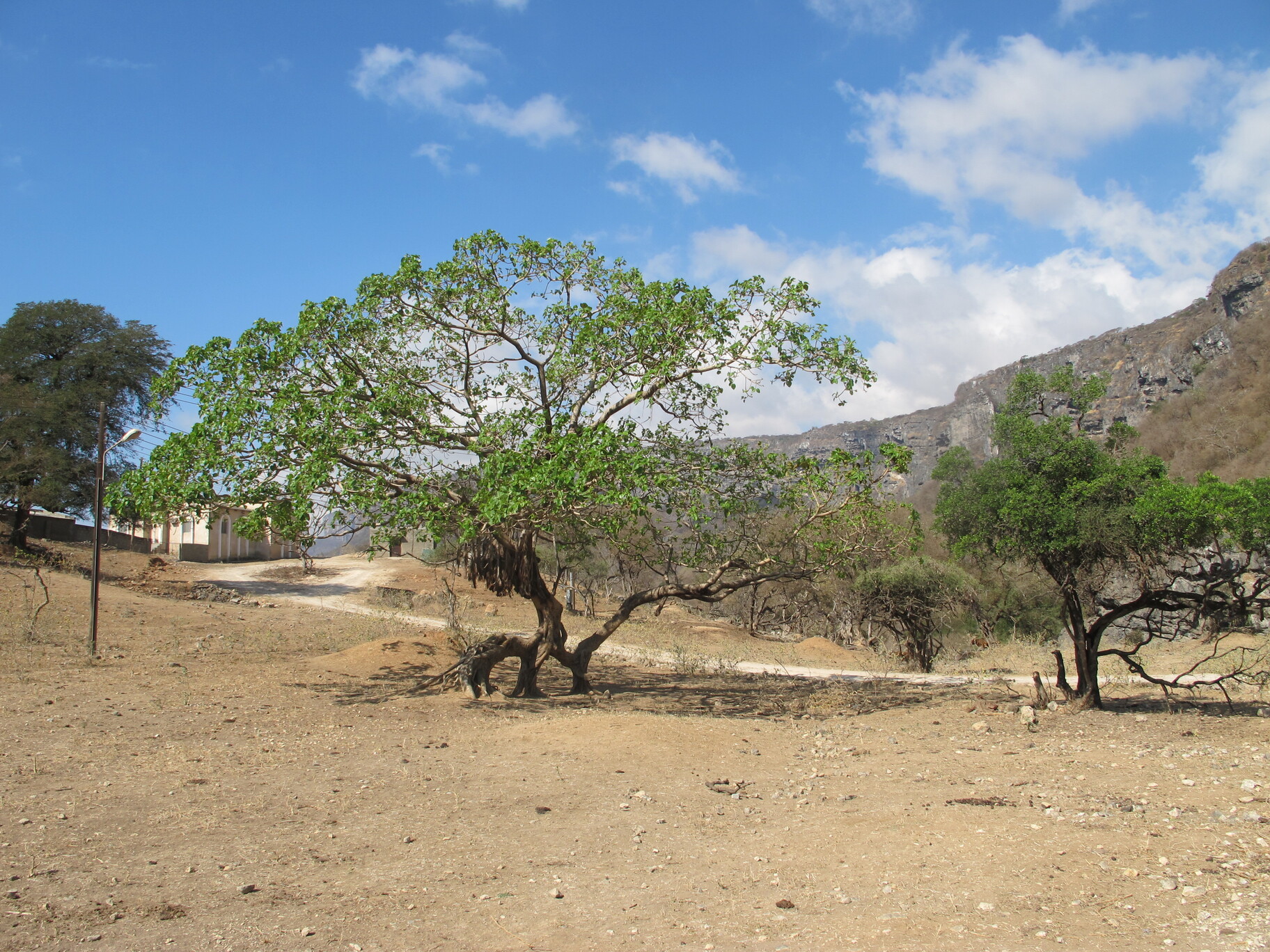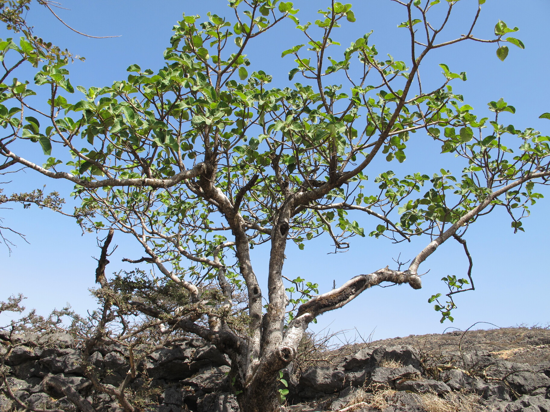 the site for the settlement had been selected to be built around an already existing tree as a central focal point. These settlement shade trees were the centre of activity within a village, where most of the daylight hours were spent outside the living quarters by those whose occupations kept them within the settlement. The fruits were gathered diligently, were spread out to dry, and then stored in a dry place for future consumption. Livestock too appreciated the fallen figs. Care was taken when harvesting the fruit not to damage the tree, although this fig can withstand rougher handling than F. sycomorus, which will not regrow if carelessly or badly cut, or if too much of the foliage is roughly stripped from it [J: xort] as fodder. F. vasta was important as a source of fiber [J: sheyur]. The underbark or bast was peeiled off and put to ret down in water - ideally stagnant or saline water - for as long as possible. If left long enough, the outer bark would separate quite easily from the softer underbark. This underbark was then separated into strands and rolled and twisted into threads, which could then be plaited, or doubled and twisted again until the rope had reached the desired thickness. Finally, the rough edges were smoothed off by beating the rope along its length with a rock, which also made the strands enmesh more tightly together. Such ropes were softer to the skin than those made from the coconut fiber [J: lif] available in the coastal towns, and did not cause the same skin abrasions when used for the harness of pack animals, so they were much used in the making of the roped that held on the udder-covers [J: seher], the girths and loading tackle for the baggage camels [J: meseddet], and also for the waist strings worn by all men from babyhood [J: hoko]. Worked strands were also woven to make a firm but soft support for the baby in the cradle [J: feddet], and to make the haynet [J: ki e, kiyeb] for the pens of young stock. The strong but pliable 'roots' of the fig that grew above ground [J: ol: ebli] were used in the manufacture of the curved parts of the cradle, being first heated over the fire, and then bowed to the required shape, tied firmly into position, and left to cool. Threads made from this underbark were interwoven with threads made from the fiber of the desert palm Nannorrhops ritchieana [J: arm] to provide contrast in colour and texture. For more personal articles or to make something which was beautiful as well as practical - as a gift, for instance - a triple plait would be made of two strands of thread made from Dracaena serrulata [J: ayrob], which makes a very white threads, and one made from the under bark of this fig, which makes a dark, reddish thread. Cordage made from the fig underbark was especially highly regarded for its tensile strength and its suppleness and was used in the manufacture of the sling shots and bow strings which were mainly used in guarding the rain fed agricultural plots in the hills, and the fields around the wells on the Salalah plain from birds and other predators. The slingshot usually consisted of four or five strands joined together at the ends, a single short thread being attached to one end, and a longer thread to the other, the longer being held fast while the shorter was released to send a pebble or other projectile singing through the air. The underbark was also pulled off in strips to be chewed - it is filling and also yields a sweet, refreshing liquid. The leaves, like those of other figs, were eaten by livestock only in times of hunger, such as during the dry season preceding the monsoon rains when this and the other figs are coming into new leaf. Such fodder was mainly fed to the dry cows [J: ekebis] to keep them going until the rains, the more palatable fodders and the dried sardines being given to the milkers or those in calf. Goats in particular appreciated the new reddish growth, called [J: forog] - a name given to the new growth of all figs. The young fruit are called [J: feseget] (literally, 'spittle, saliva') because of the sticky liquid which oozes out of them as soon as they are bruised or damaged in any way. This sticky juice could be used as a depilatory, as could the resin which exudes from the tree during the midday heat. These exudations were also used as an adhesive, and were applied to the site of a snake bite. The underbark was also stripped off and worked into threads by women who then dyed them with indigo or lamp-black, and used them to bind and extend their plaits when dressing their hair. The resin [J: josot] was used as a haemostatic, and was formerly much used to treat the bleeding that followed circumcision, sometimes with added powdered indigo [J: nuz] or pulverised soft limestone [J: koso. The sap was collected and put on the fire with a little water, heated, and then strained and poured into a large or deep wound to dry it out and prevent infection. Slices cut from the under bark were used to bind a damaged or fractured limb. The juice that exudes from the under bark also has a disinfectant action and speeds up the healing process. This treatment was particularly used for fractures (both in man and in livestock) where the break has occurred below the knee, but only when the bone has not pierced the skin. In smaller livestock, a leather 'stocking' [J: ensiyot] made of two strips of leather soaked in sap from the fig was sewn tightly round the leg to act as a support while the bone knitted. The ash of the burned bark [J: kizfot etik] was used as a snuff, or to extend a limited amount of tobacco-snuff. The fresh resin was the most favoured treatment for broken skin, especially for the scalp wounds resulting from blows delivered by the knobbed club [J: tekeso], heavy staff [J: xotrok], or the throwing stick [J: ekit], - the commonest wound folloing a dispute in earlier times with such weapons. During the monsoon and early 'serb' season when the many biting insects [J: arnut, xanyut, sedhayf and ot