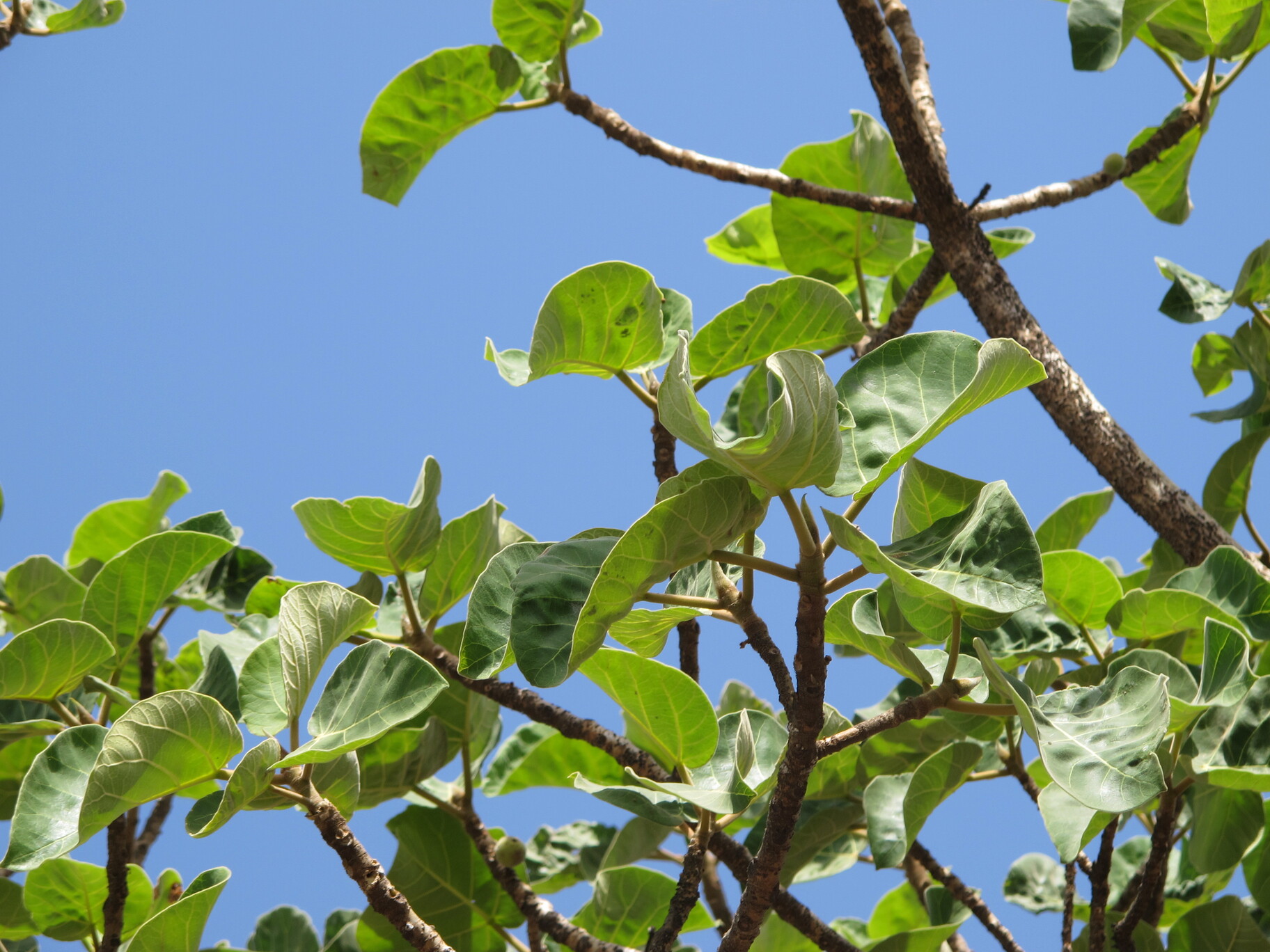Tree ; up to 20 m tall , epiphytic when young , with with spreading crown , smooth , white bark , often with reddish-brown aerial roots and white latex . Stems thick , yellowish to whitish or brownish hirsute to hirtellous ; bark smooth pale grey , flaking and scaly below . Leaves 12-16 x 11-15 cm , alternate , spirally arranged , broadly ovate to suborbicular , apex acute to rounded with a short acute tip , base cordate , margin entire or obscurely undulate , pubescent , above thinly velutinous becoming glabrous with age , beneath tomentose to velutinous , 3-5-nerved at the base , petiolate . Inflorsecences (figs) axillary , solitary or grouped , borne amongst the leaves . Flowers minute , yellowish greent , monoecious ; male flowers shortly pedicellate , subtended by two subulate bracts , perianth membranous , stamen solitary ; female flowers sessile , perianth lobes long acuminate , style long , stigma clavate ; gall flowers shortly pedicellate , perianth 2-lobed . Fruit fig , sessile or pedunculate , with a whorl of tomentose bracts , globose to subglobose , glabrous to puberulous-tomentose , green