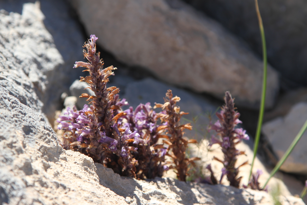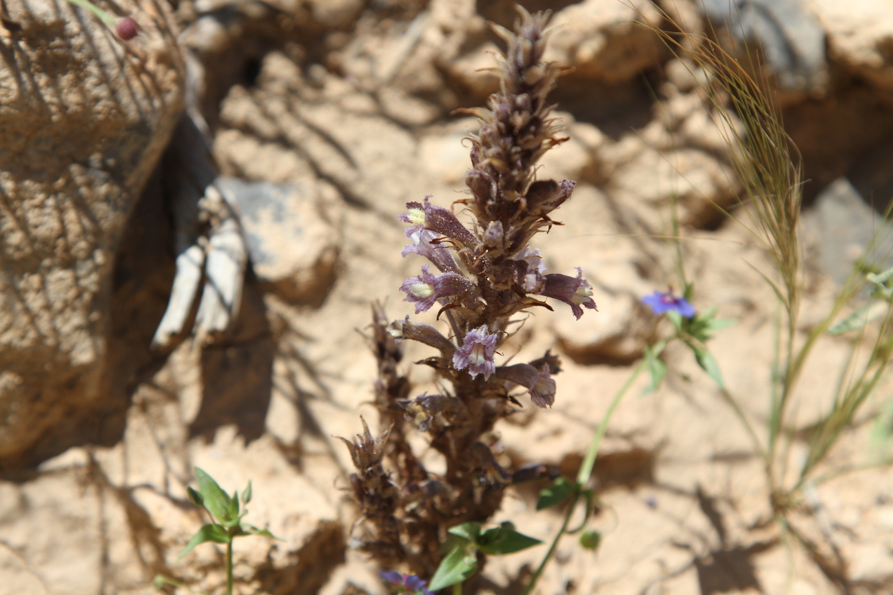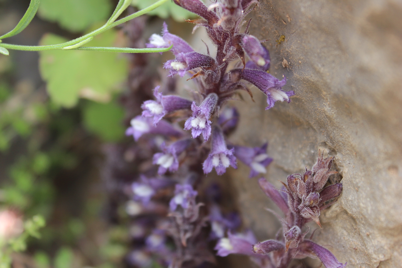 Annual or perennial parasitic herb ; up to 15-30 cm tall . Stems erect , simple , short , rather slender varying to thick , rather fleshy , yellow to pale violet , ± glandular-pubescent . Leaves 5–10 × ± 5 mm , ovate-lanceolate , yellowish , sparsely glandular-pubescent . Inflorescences spicate , dense ; bracts 8–10 mm , ovate , yellow , glandular-pubescent . Flowers cream , tinged blue-mauve to purple , usually prominently curved ; calyx 7–12 mm , calyx divided into two bifid lateral segments , teeth acuminate , pale yellow-blue , glandular-pubescent ; corolla 12–15 mm , erect to patent , tubular , inflated proximally , curved , the tube cream , tinged blue-mauve to purple , sparsely glandular-pubescent ; upper lip slightly bilobed ; lower lip 3-lobed , lobes rounded , margins ± entire ; stamens 4 , glabrous above , ± hairy below ; anthers glabrous or hairy ; stigma lobes cream-white ; style glandular-pilose . Fruit capsules , 5-7 mm long , ovoid-ellipsoid , the valves remaining apically united when ripe . (Ref . Flora of Oman ; vol . 3) .