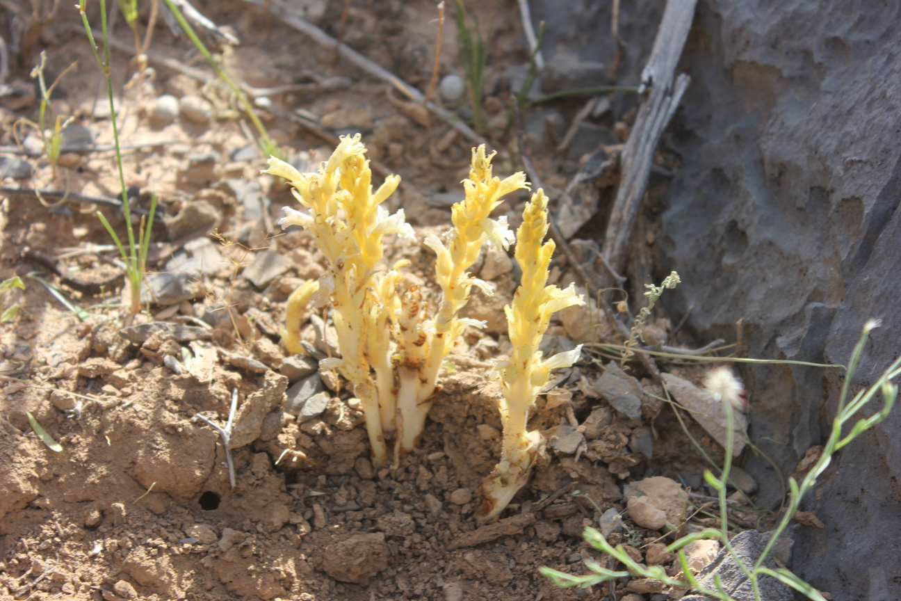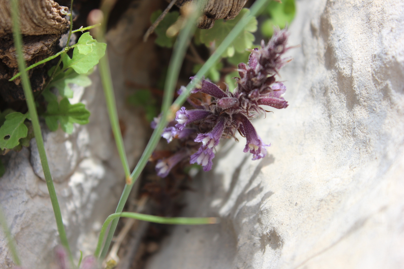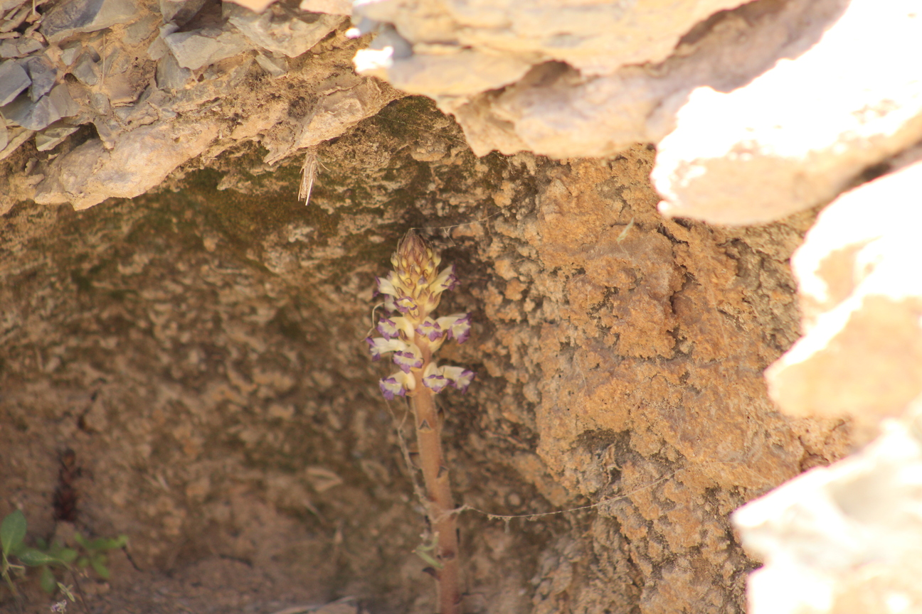 Annual or perennial parasitic herb ; up to 15-30 cm tall . Stems erect , simple , short , rather slender varying to thick , rather fleshy , yellow to pale violet , ± glandular-pubescent . Leaves 5–10 × ± 5 mm , ovate-lanceolate , yellowish , sparsely glandular-pubescent . Inflorescences spicate , dense ; bracts 8–10 mm , ovate , yellow , glandular-pubescent . Flowers cream , tinged blue-mauve to purple , usually prominently curved ; calyx 7–12 mm , calyx divided into two bifid lateral segments , teeth acuminate , pale yellow-blue , glandular-pubescent ; corolla 12–15 mm , erect to patent , tubular , inflated proximally , curved , the tube cream , tinged blue-mauve to purple , sparsely glandular-pubescent ; upper lip slightly bilobed ; lower lip 3-lobed , lobes rounded , margins ± entire ; stamens 4 , glabrous above , ± hairy below ; anthers glabrous or hairy ; stigma lobes cream-white ; style glandular-pilose . Fruit capsules , 5-7 mm long , ovoid-ellipsoid , the valves remaining apically united when ripe . (Ref . Flora of Oman ; vol . 3) .