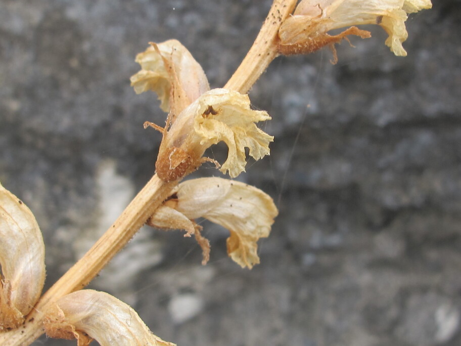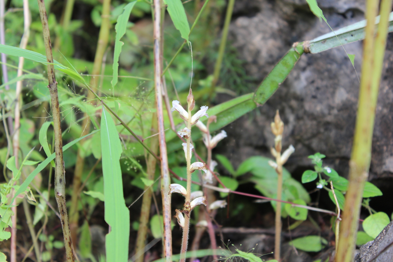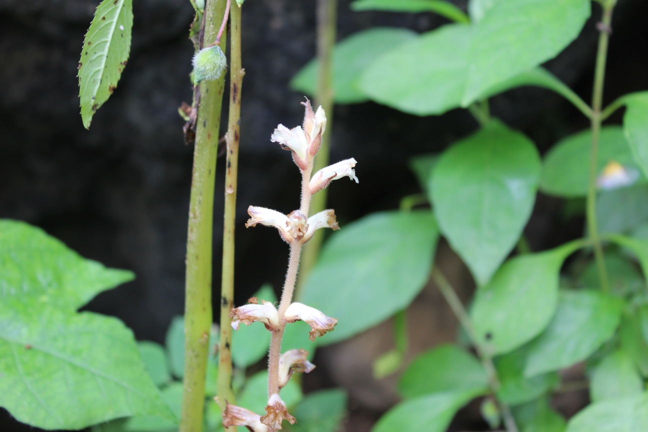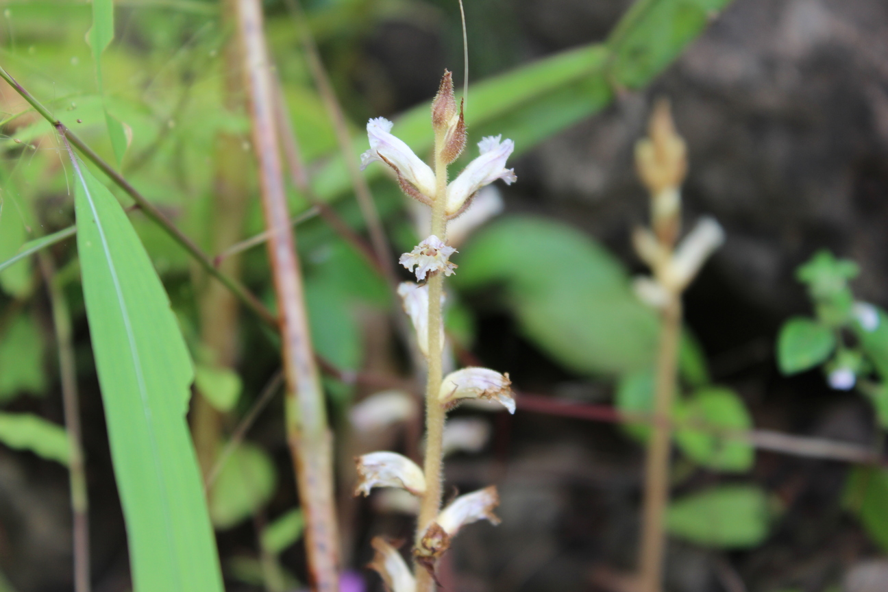 Erect annual or perennial parasitic herb ; up to 10-40 cm high . Stems erect , simple , slender , pinkish , ± glandular-pubescent . Leaves absent . Inflorescences very lax , flowers spaced alternately on the stem ; bracts lanceolate . Flowers funnel shaped ; calyx segments divided into two bifid lateral segments with acuminate teeth , ± glandular-pubescent ; corolla ± campanulate , ± 12 mm , curved , the tube white to cream , margins of lobes prominently erose-denticulate ; stamens 4 , glabrous above , ± hairy below ; stigma lobes pink or white . Fruit capsule , containing many dust-like seeds . (Ref . Flora of Oman ; vol . 3) .