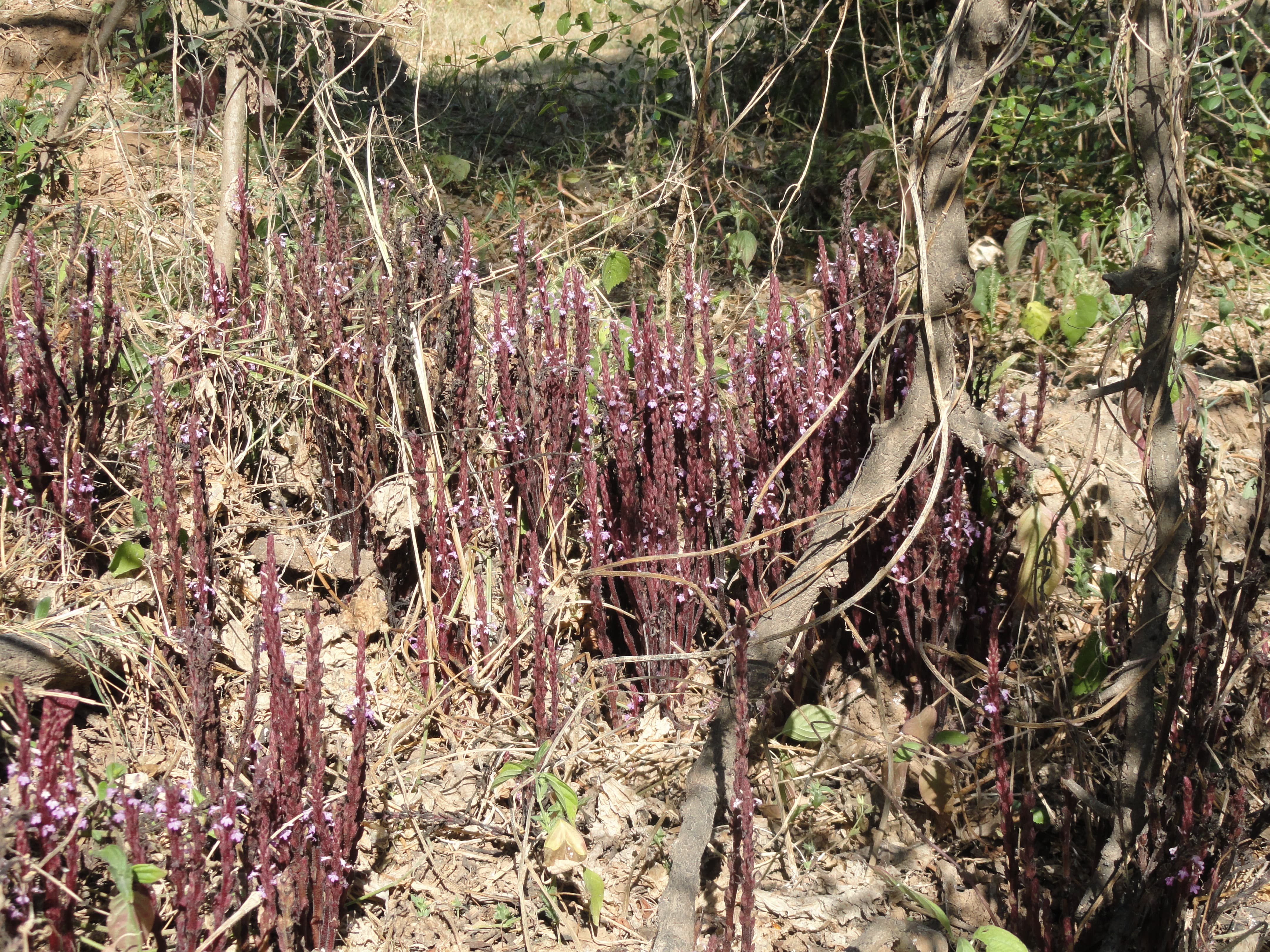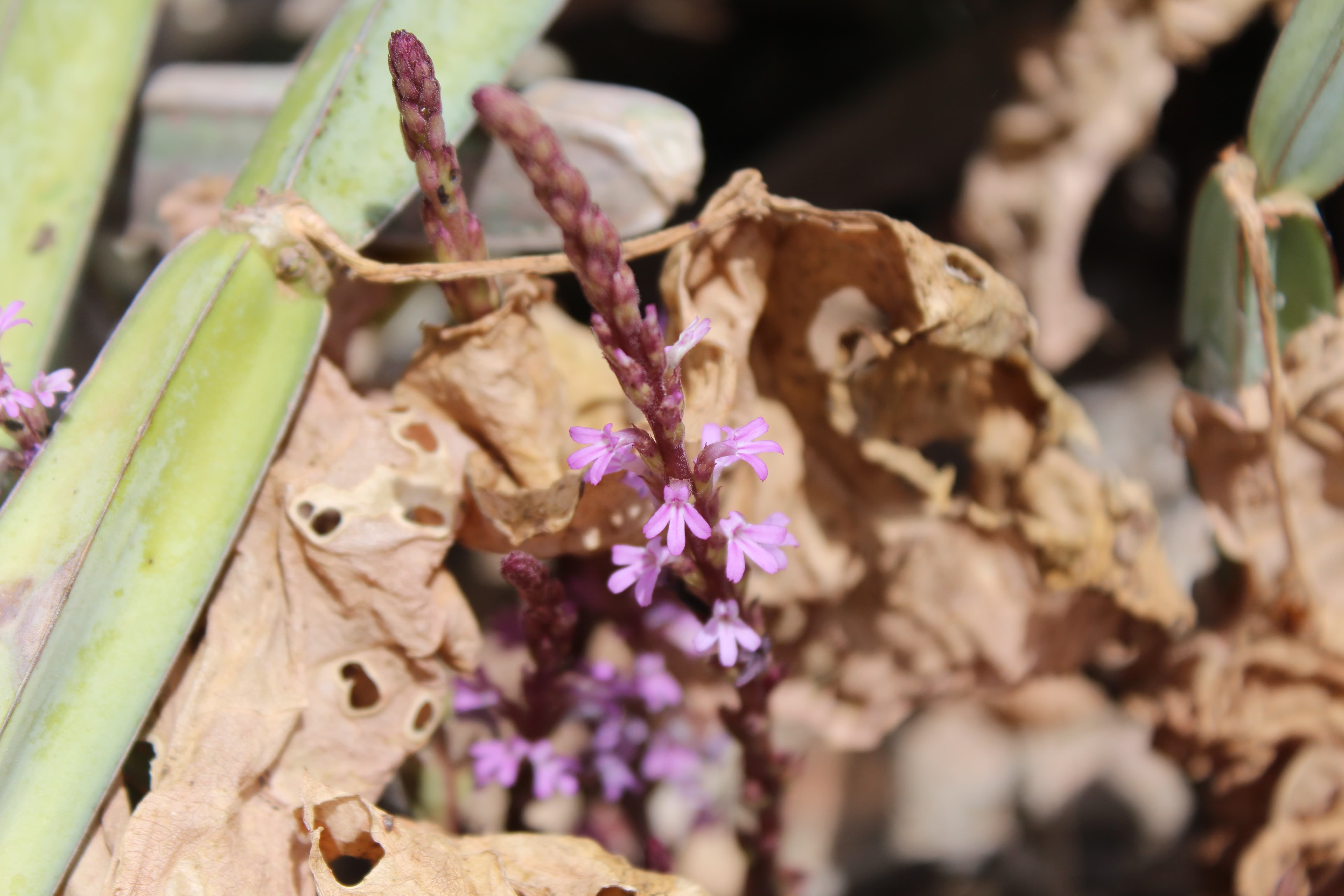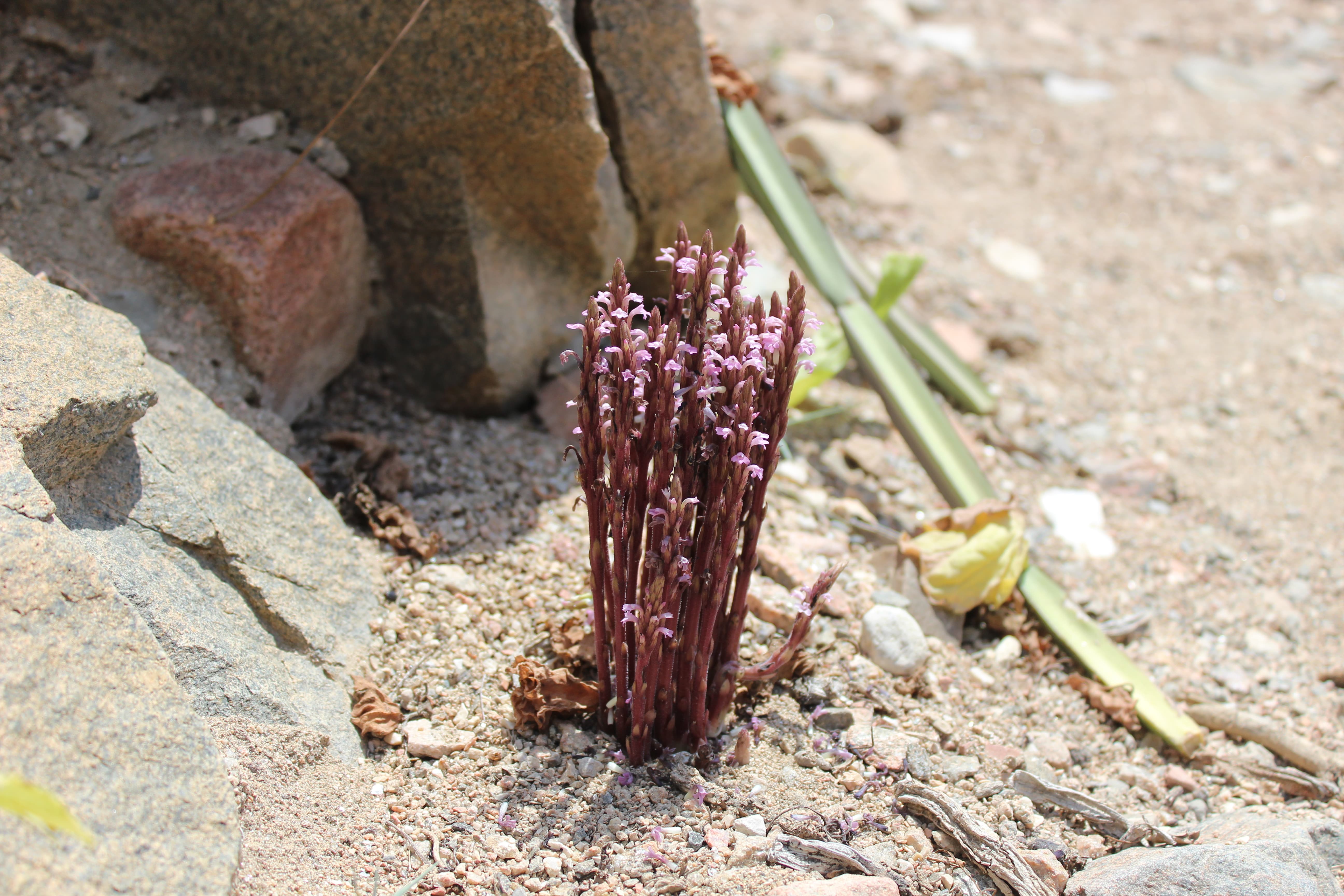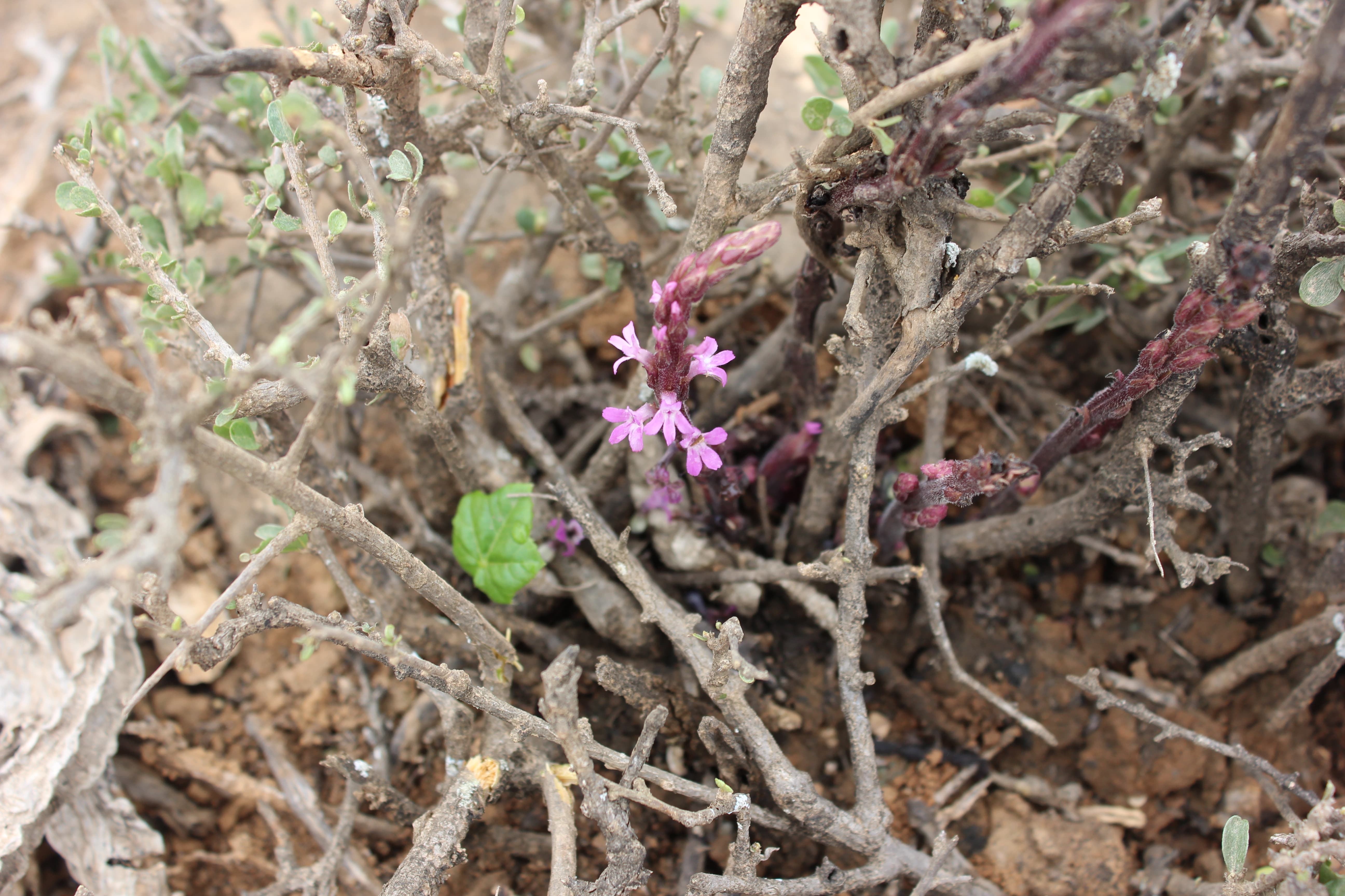 Erect annual or perennial dark reddish herb ; up to 10–45 cm tall , parasitic on the roots of other plants . Stems erect , several , succulent , square , angular , simple or branched , usually branching from base , reddish-purple , drying black . Leaves scale-like , appressed to stem , 0 . 5-1 cm long , inconspicuous , reddish like the stems . Inflorescences in clusters along the stems , sessile , 2(–3) per node ; bracts usually the same length and width as calyx , acuminate ; bracteoles minute . Flowers pink , not fragrant ; calyx 5 ribbed , narrow , 4–8 mm (including the teeth) ; teeth linear , acuminate , shorter than the calyx tube ; corolla light blue , pink or dark purple , 10–15 mm ; tube 8–11 mm , bent just below limb , glandular , and pubescent with small hairs , sometimes papillae-like ; upper lobes 2–3 mm , sharply recurved , lower ± 3 mm ; stamens 4 , included in the corolla . Fruit capsule , 1–2 mm , oblong-ellipsoid . Seeds minute , numerous . (Ref . Flora of Oman ; vol . 3) .