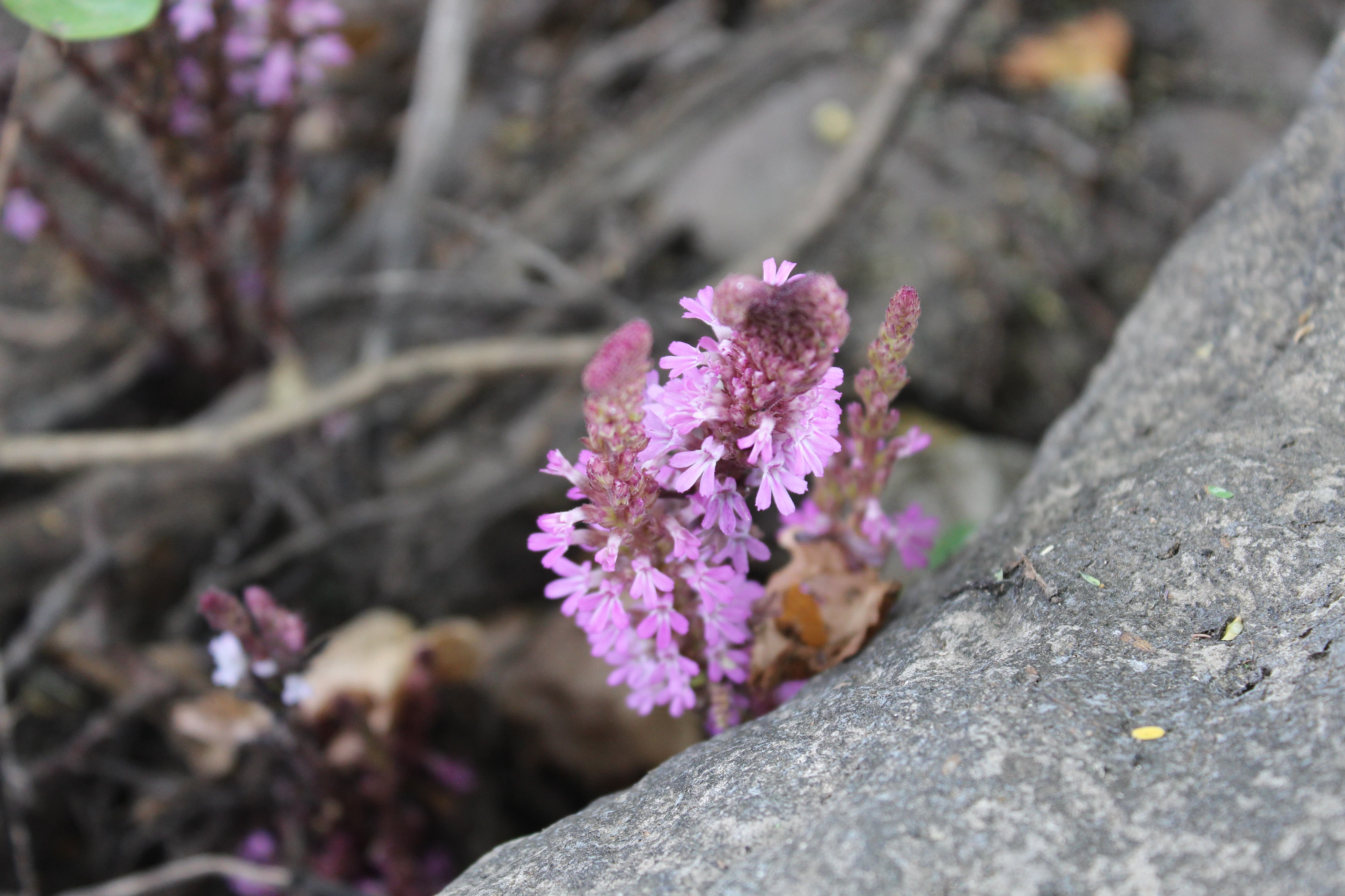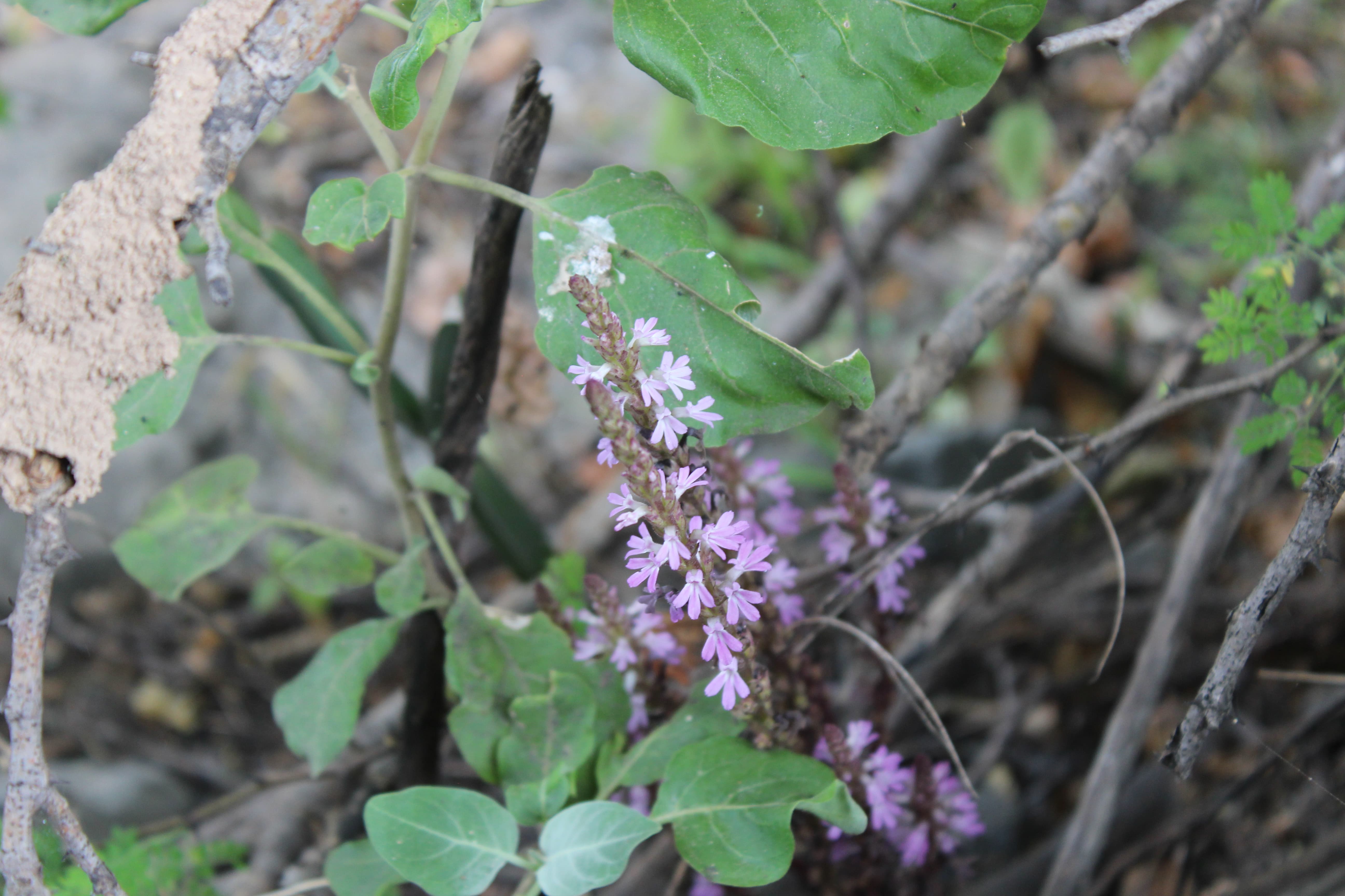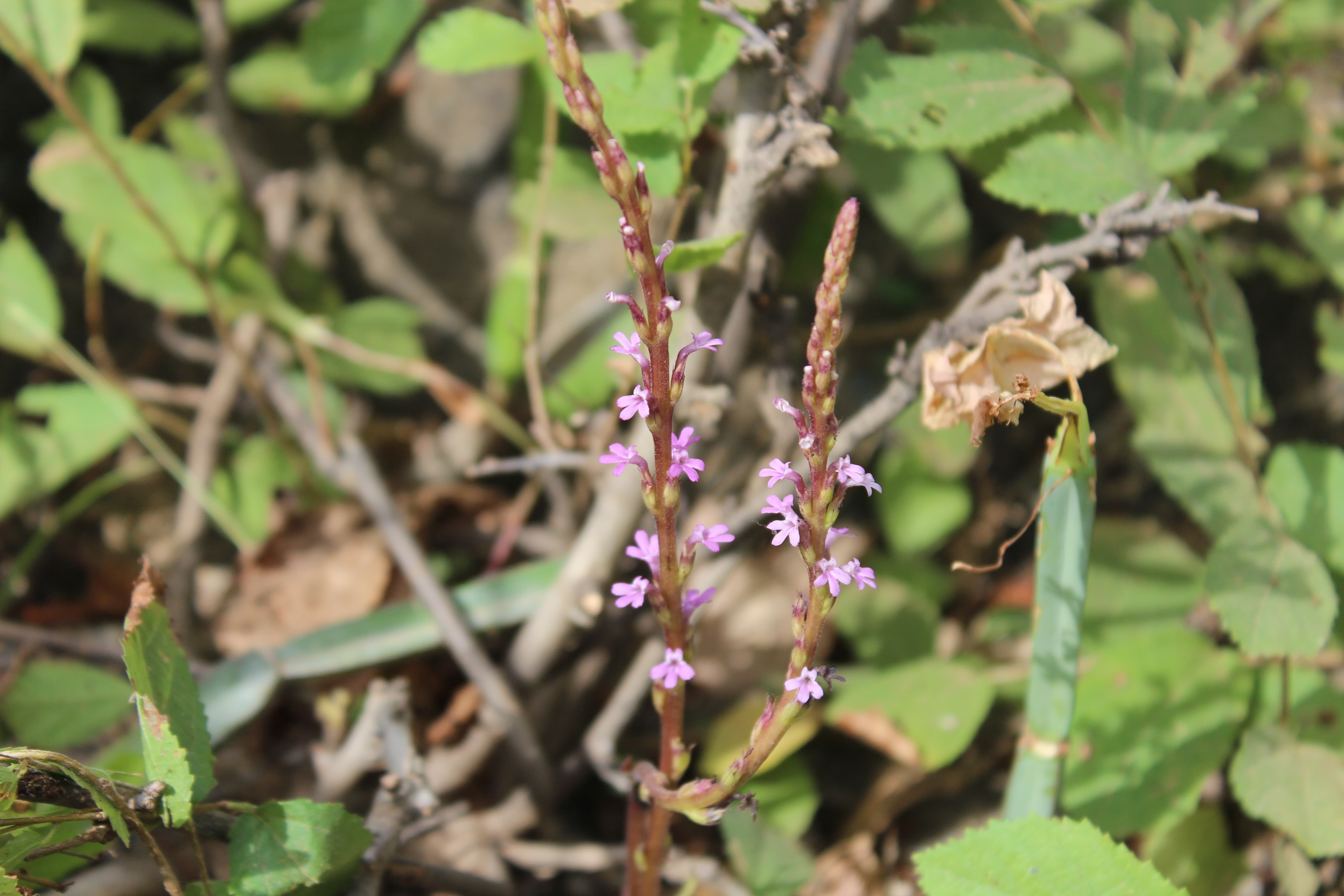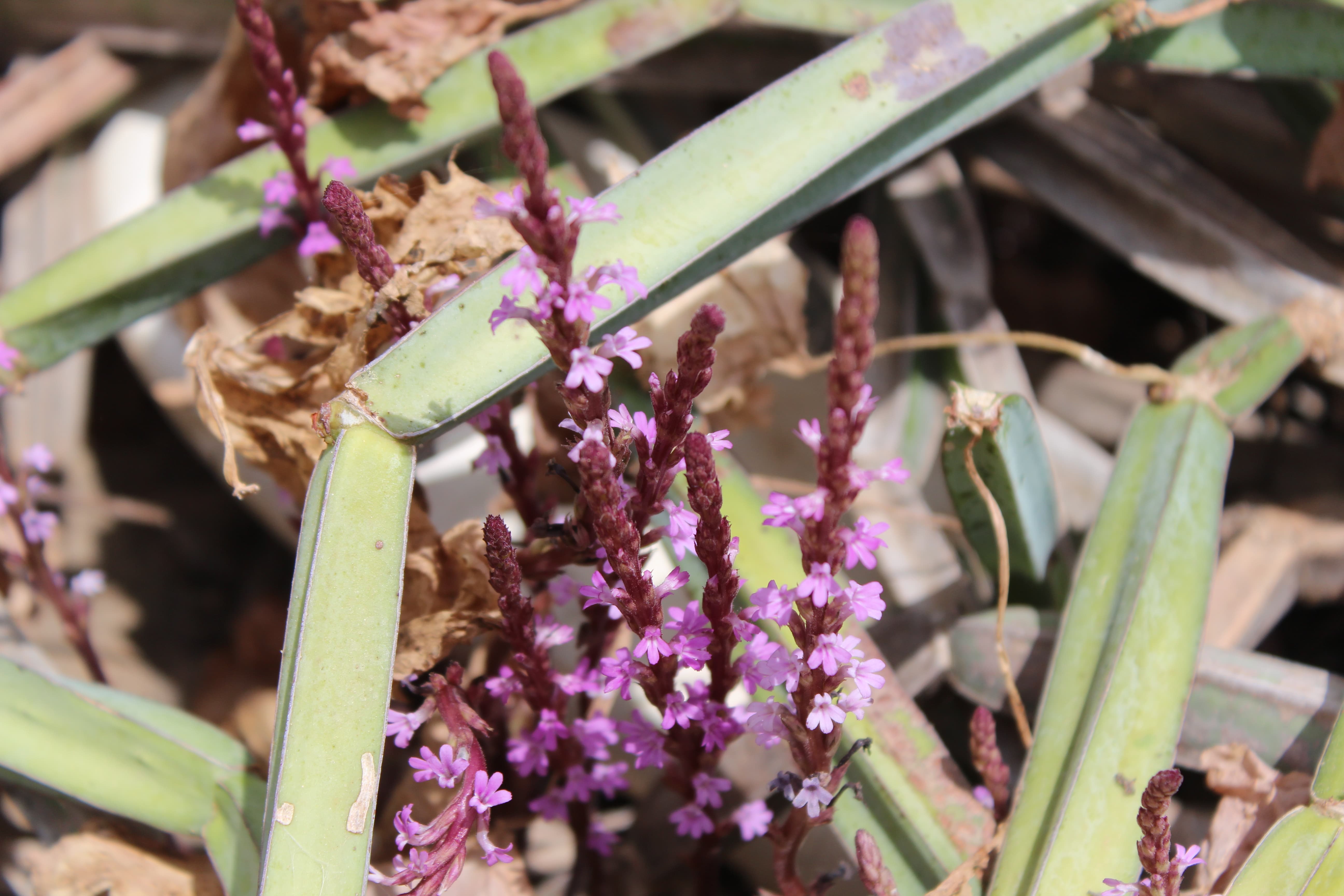 Erect annual or perennial dark reddish herb ; up to 10–45 cm tall , parasitic on the roots of other plants . Stems erect , several , succulent , square , angular , simple or branched , usually branching from base , reddish-purple , drying black . Leaves scale-like , appressed to stem , 0 . 5-1 cm long , inconspicuous , reddish like the stems . Inflorescences in clusters along the stems , sessile , 2(–3) per node ; bracts usually the same length and width as calyx , acuminate ; bracteoles minute . Flowers pink , not fragrant ; calyx 5 ribbed , narrow , 4–8 mm (including the teeth) ; teeth linear , acuminate , shorter than the calyx tube ; corolla light blue , pink or dark purple , 10–15 mm ; tube 8–11 mm , bent just below limb , glandular , and pubescent with small hairs , sometimes papillae-like ; upper lobes 2–3 mm , sharply recurved , lower ± 3 mm ; stamens 4 , included in the corolla . Fruit capsule , 1–2 mm , oblong-ellipsoid . Seeds minute , numerous . (Ref . Flora of Oman ; vol . 3) .