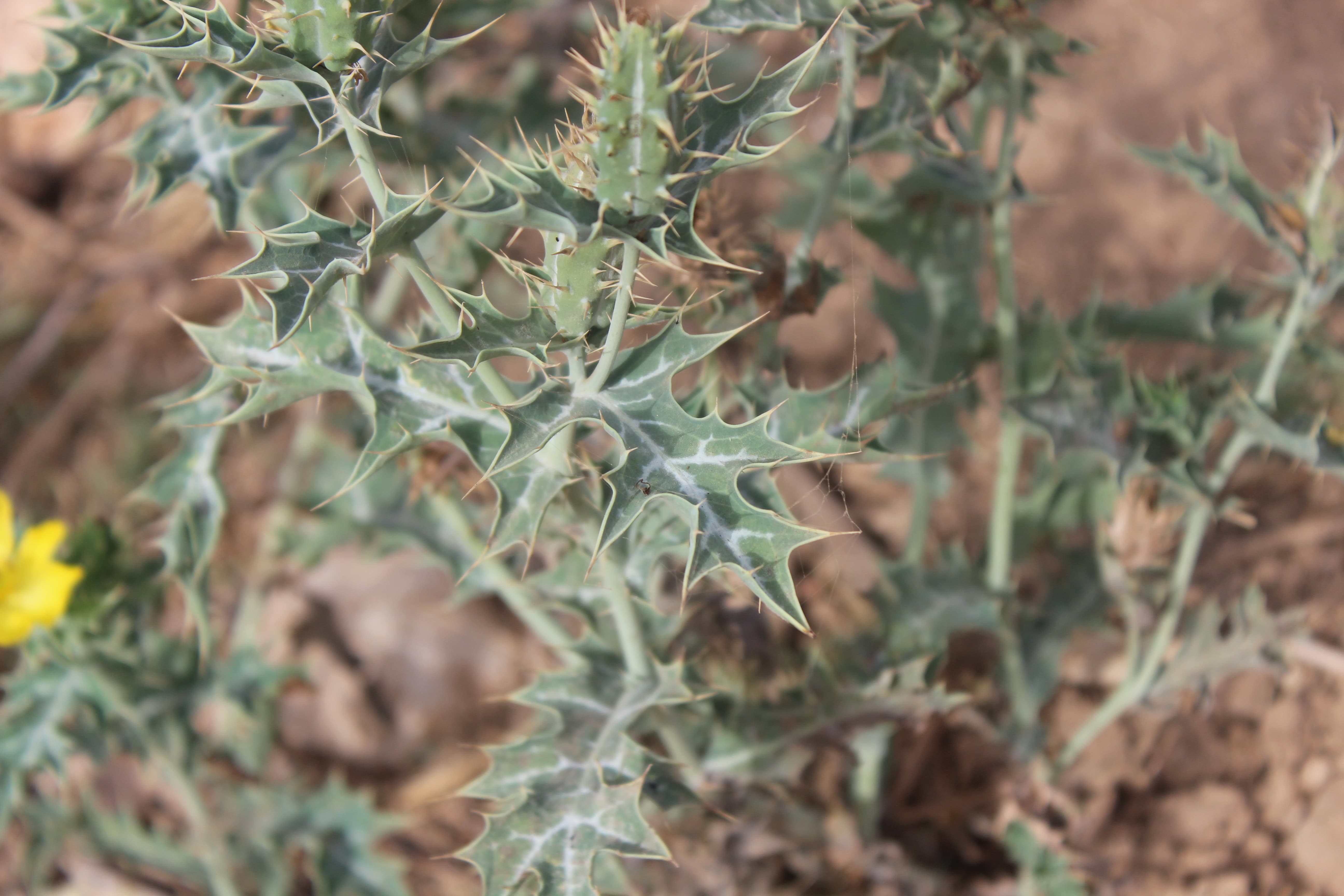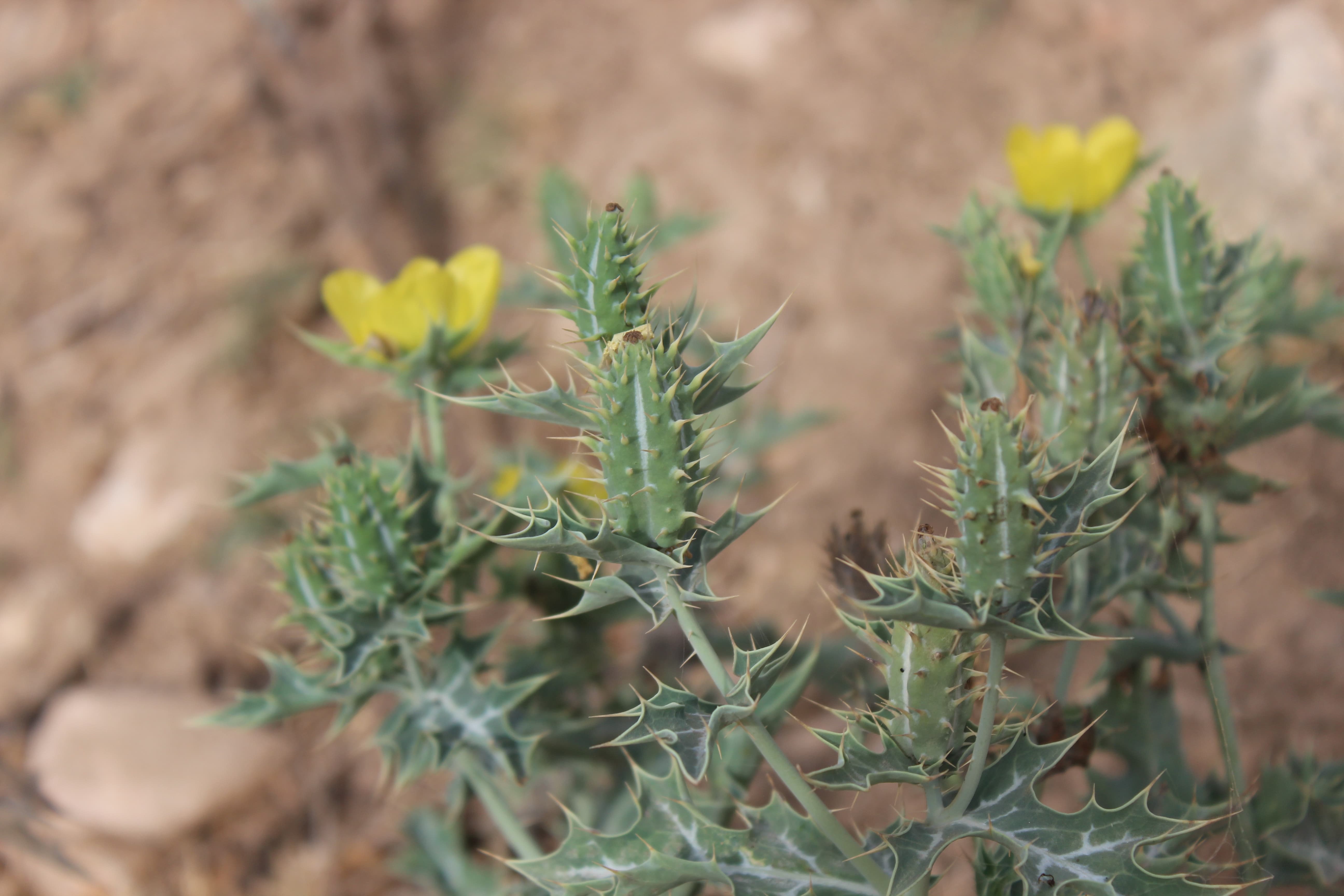 Erect , spiny annual or a short-lived perennial herb ; up to 1m , often branching near the base . Stems erect , branched , with yellow latex . Leaves alternate , 12 x 5 cm , sessile , elliptic to oblong in outline , somewhat fleshy , blue/green , with a distinctive white stripe down the centre and along the veins , deeply lobed with sharp , spiny margins . Inflorescences solitary , terminal . Flowers golden yellow , papery , sessile , subtended by 1 or 2 foliaceous bracts ; sepals 3 , concave , imbricate ; petals 4-6 , obovate , 2-3 . 5 x 1 . 5-2 . 5 cm , delicate , soon falling ; stamens numerous . Fruit capsule , 3-4 x 1 . 5-2 cm , oblong , erect , ribbed with sharp prickles , splitting by 3-6 valves . Seeds ± 2 mm , subglobose , with a small beak at one end , black , many , covered with rounded tubercles . (Ref . Flora of Oman ; vol . 1) .