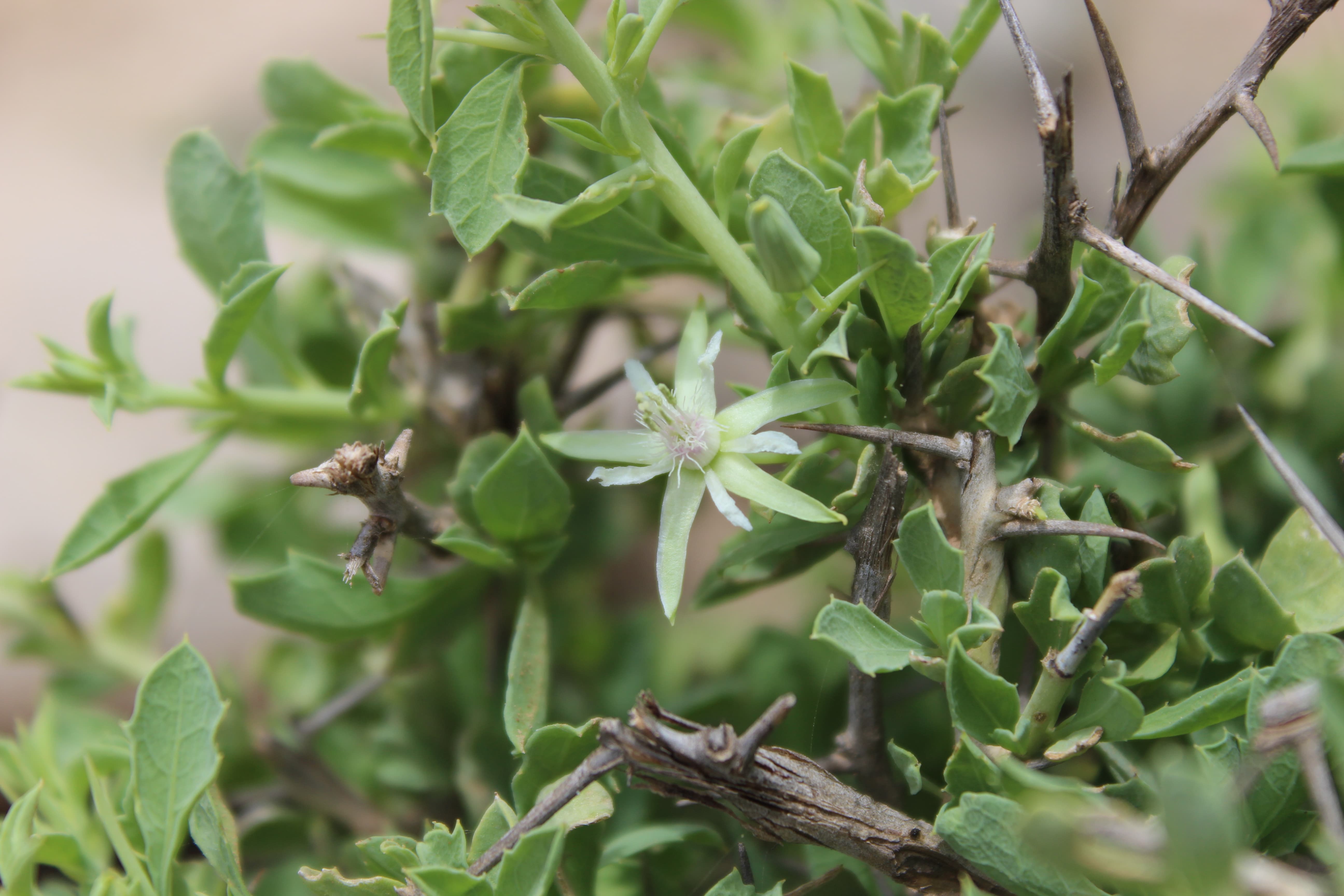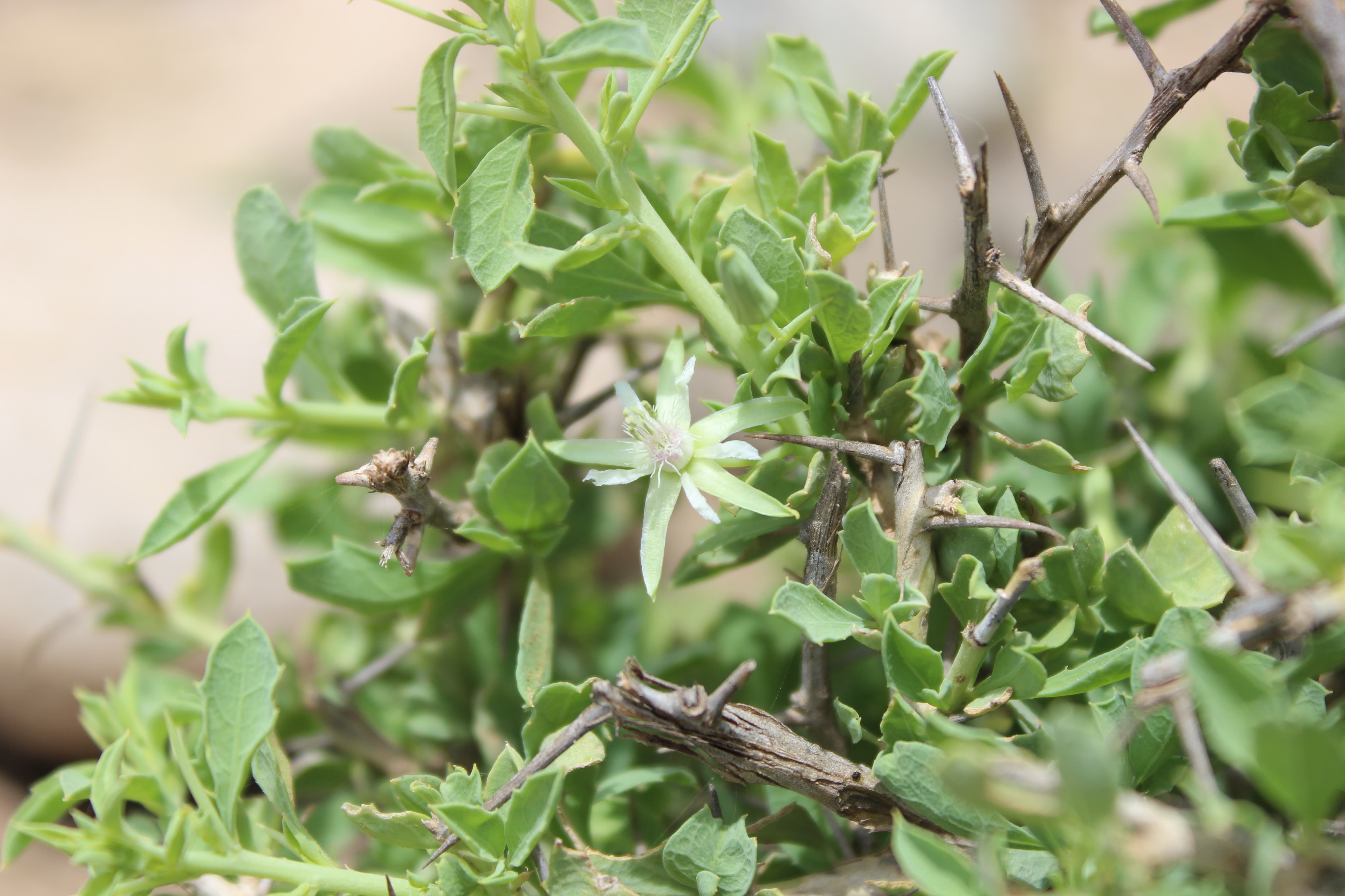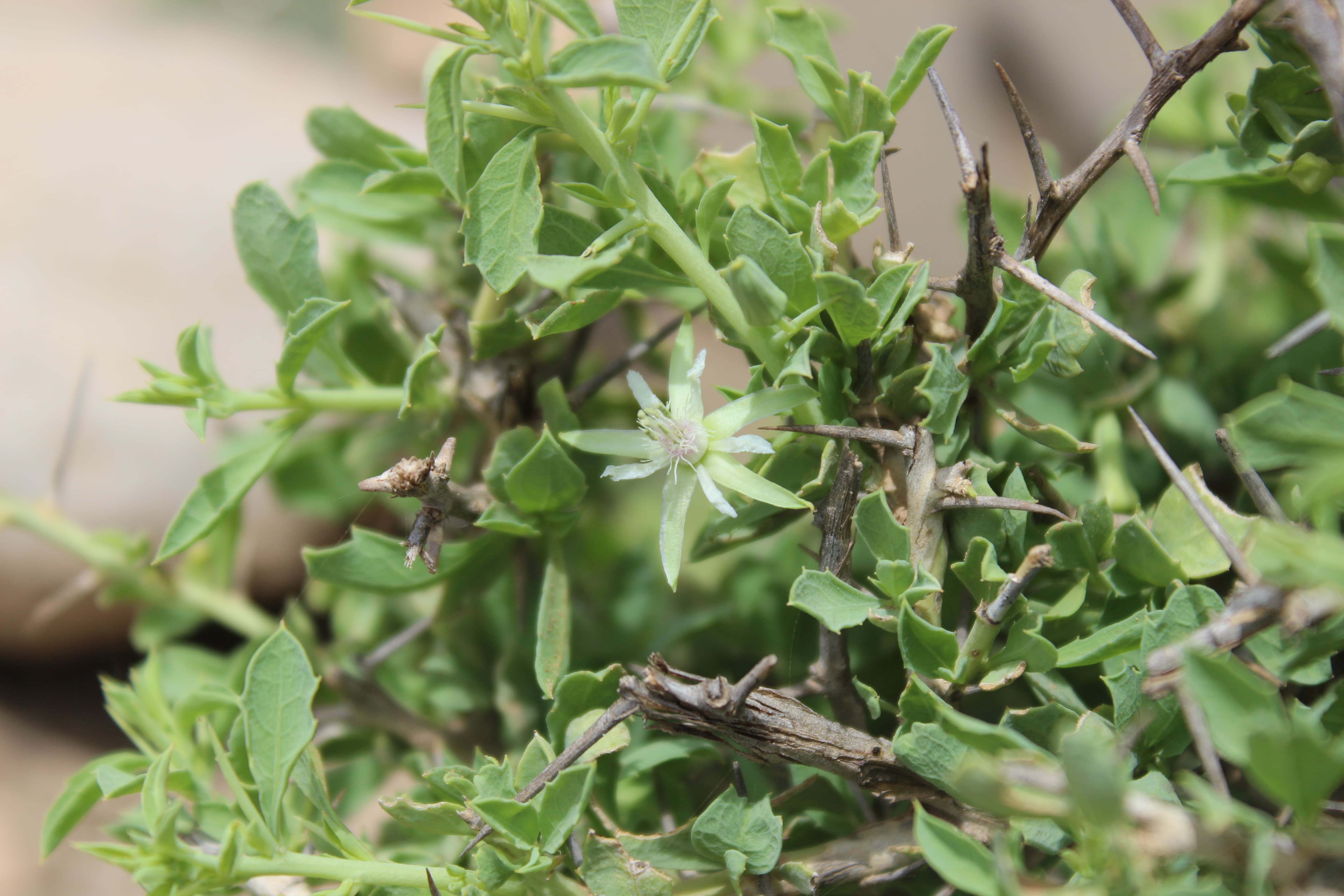 Spiny shrubs ; up to 50 cm tall , scabrid without tendrils and with a strong pleasant lemony-resin-like scent of all plant parts . Stems branched , rigid ; spines 0 . 5–2 cm long . Leaves 0 . 2–1 cm long , ovate to obovate or oblong , acute tip , margin entire or minutely dentate ; stipules 1–1 . 5 mm long ; petiole up to 1 . 5 mm long . Inflorescences solitary or in small clusters on small short-shoots . Flowers white cream ; sepals 6–9 mm long ± hispid ; petals 4–6 mm long ; styles 1 . 5–3 . 5 mm long , united for half the length or more . Fruit 1 . 2–1 . 8 cm long . Seeds 2–3 , 8–10 mm long . (Ref . POWO ; 2023) .