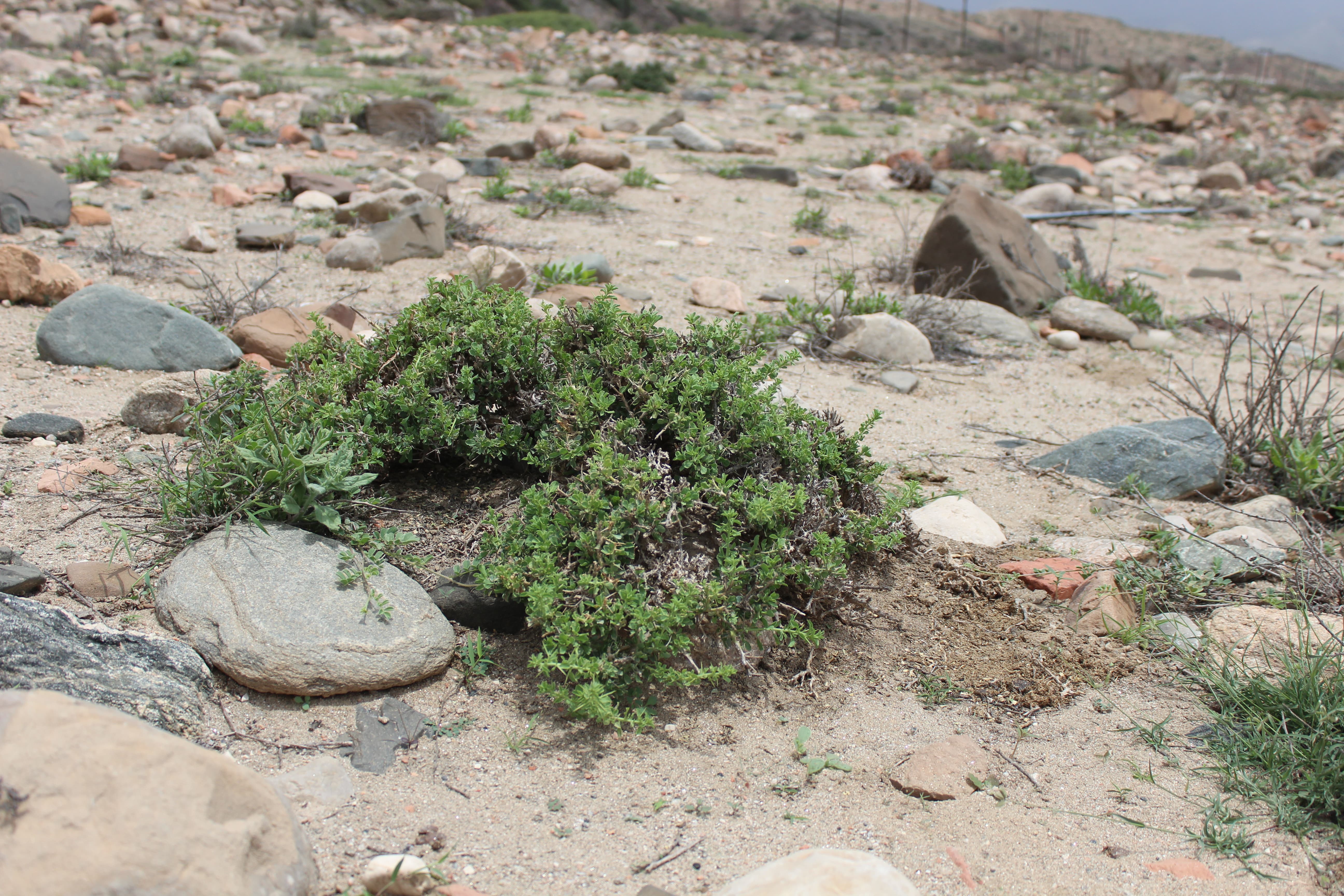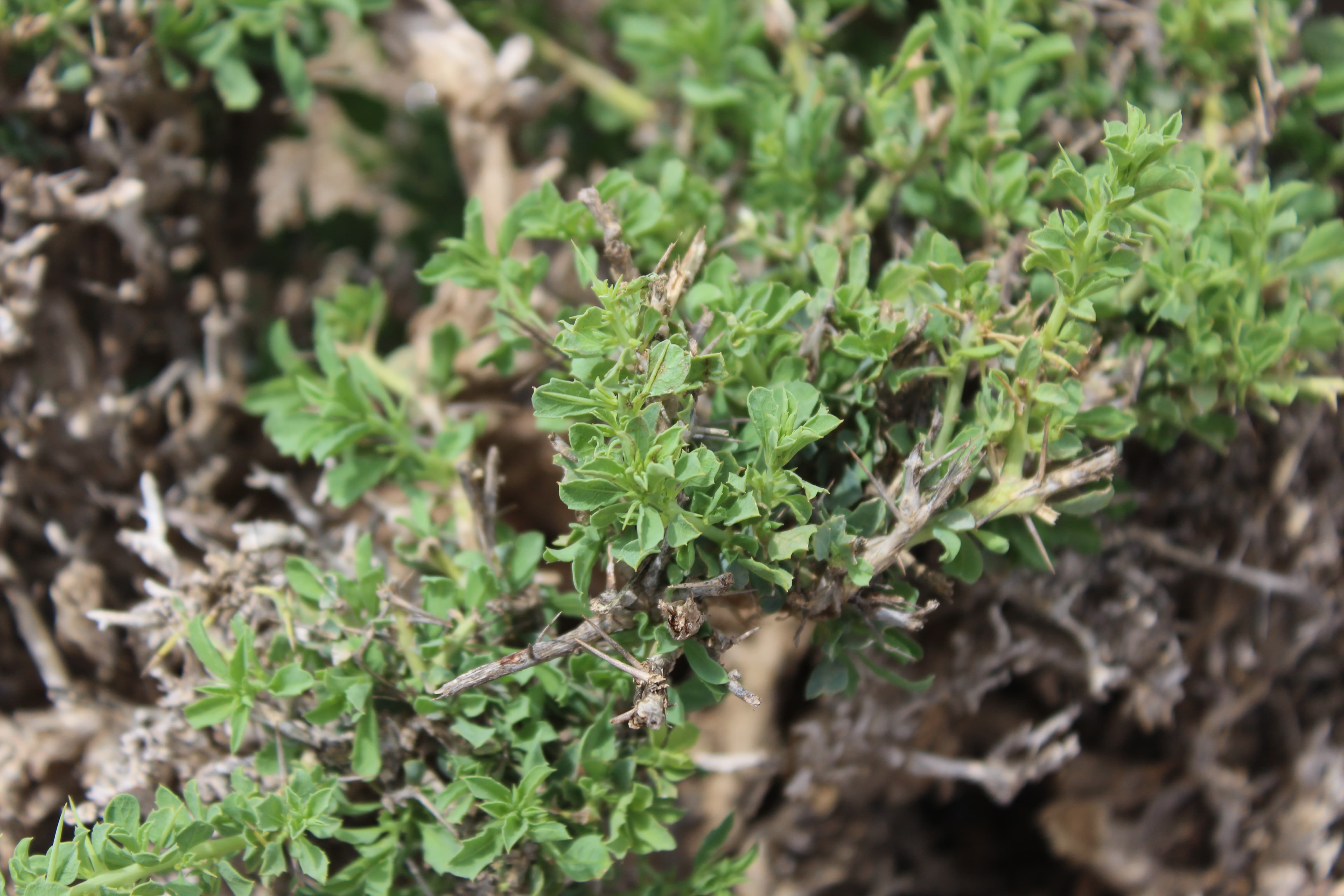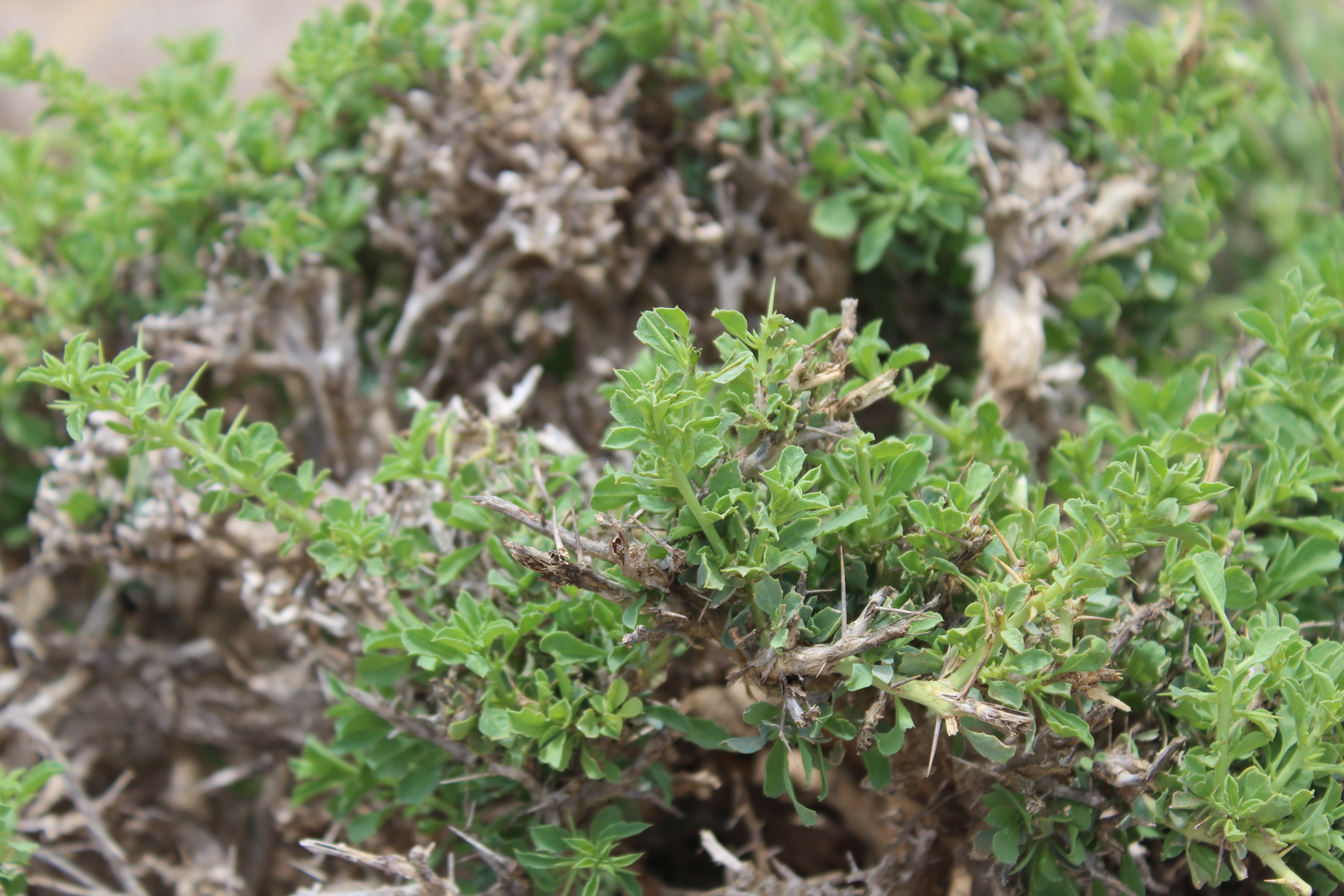 Spiny shrubs ; up to 50 cm tall , scabrid without tendrils and with a strong pleasant lemony-resin-like scent of all plant parts . Stems branched , rigid ; spines 0 . 5–2 cm long . Leaves 0 . 2–1 cm long , ovate to obovate or oblong , acute tip , margin entire or minutely dentate ; stipules 1–1 . 5 mm long ; petiole up to 1 . 5 mm long . Inflorescences solitary or in small clusters on small short-shoots . Flowers white cream ; sepals 6–9 mm long ± hispid ; petals 4–6 mm long ; styles 1 . 5–3 . 5 mm long , united for half the length or more . Fruit 1 . 2–1 . 8 cm long . Seeds 2–3 , 8–10 mm long . (Ref . POWO ; 2023) .