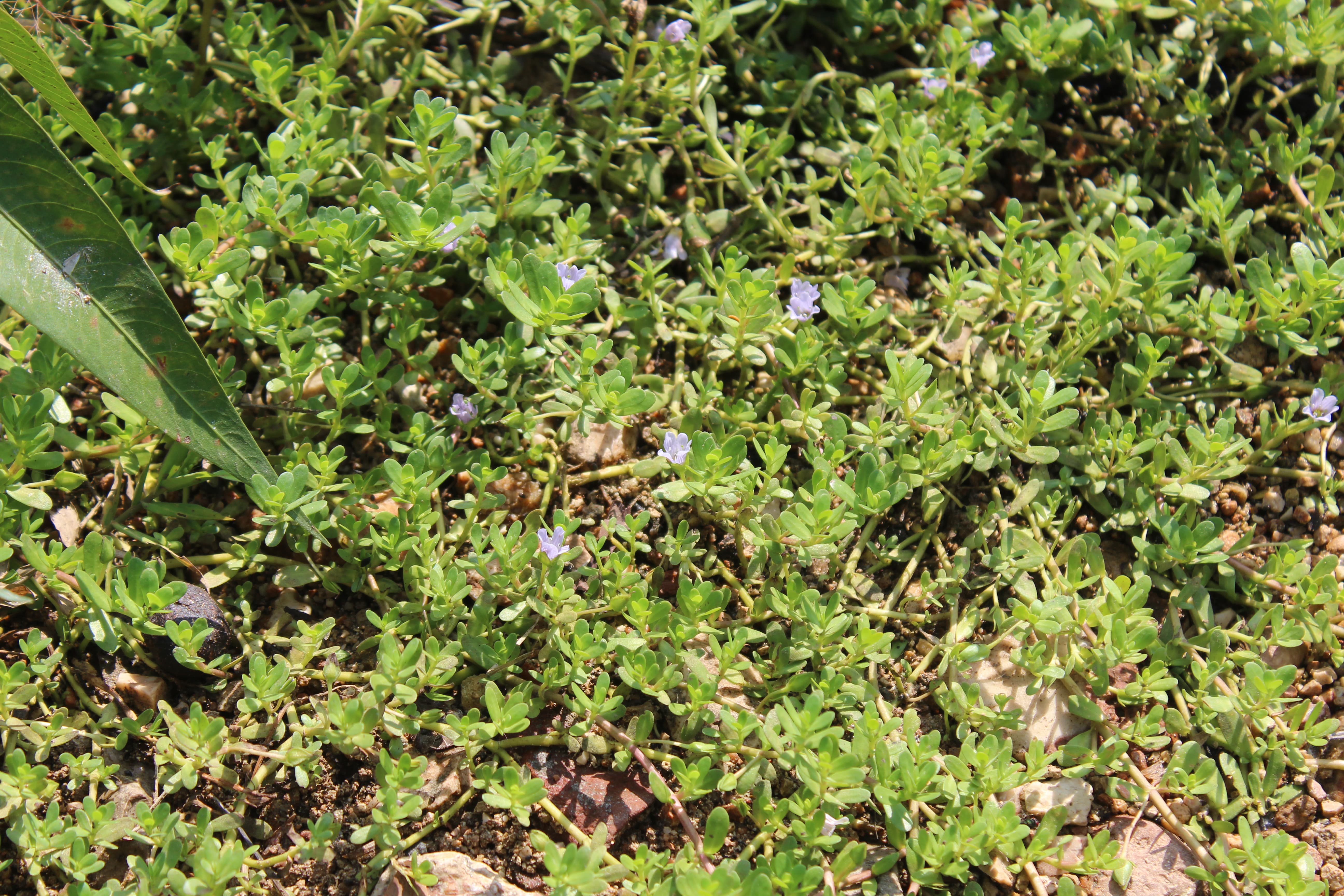 A small creeping perennial herb ; up to 40 cm high . Stems branched , ascending to prostrate and creeping , rooting at nodes , 4-angled , glabrous . Leaves opposite , sessile , 8–20 × 3–6 mm , oblong to spathulate , apex obtuse , margins entire , succulent . Inflorescences solitary in the axils of leaves ; pedicels 5–30 mm long ; bracteoles ± 5 mm , ovate , present below the calyx . Flowers small , actinomorphic , blue violet to white ; calyx 5-lobed to the base , ± 5 mm , glabrous , the outer 3 lobes broadly ovate , with the upper lobe largest ; 2 lateral lobes smallest , lanceolate ; corolla blue-violet to white , subrotate ; tube ± 5 mm , upper lip emarginate , 3–5 mm , lower lip equally 3-lobed ; stamens 4 , 2 long and 2 short . Fruit capsule ± 4 mm , ovoid , glabrous . (Ref . Flora of Oman ; vol . 3) .