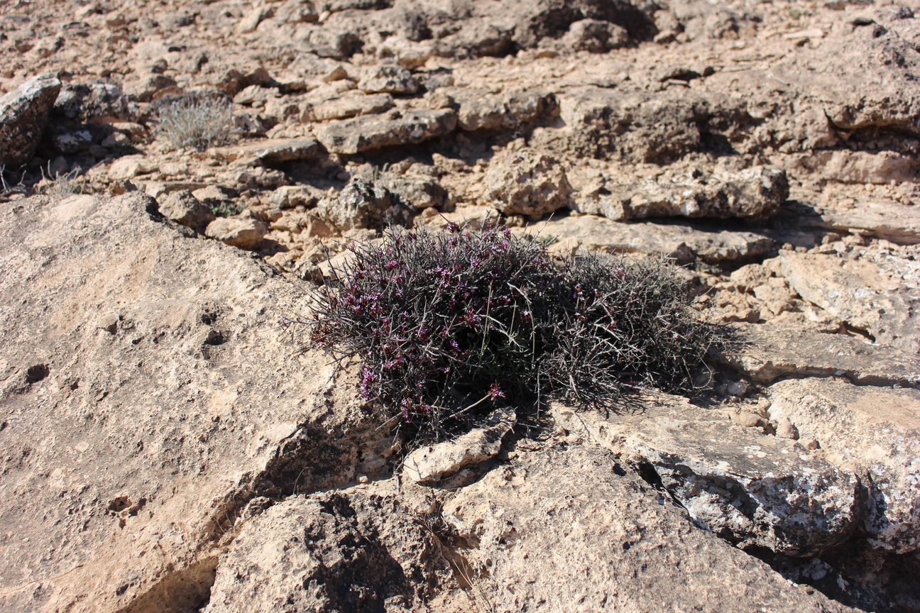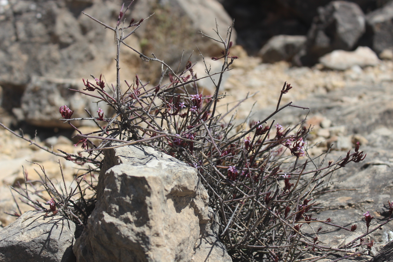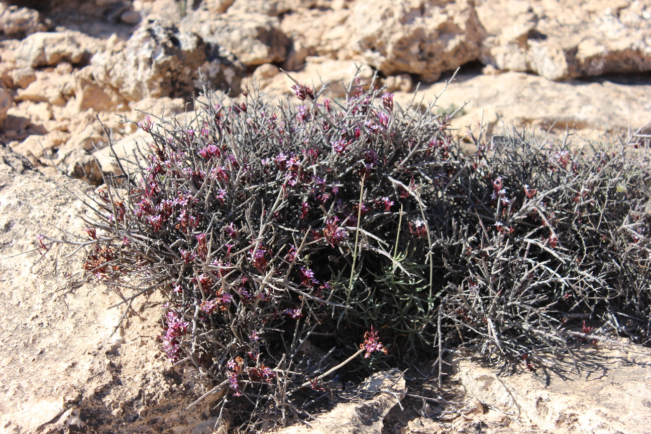 Subshrub or small shrub ; up to 1 m tall . Stems branched , semi-succulent , more or less leafless , grey-green , spinescent , glabrous to scabrid at base . Leaves sessile , 1–6 × 0 . 2–0 . 5 mm , linear to subulate , acute tip , glabrous , usually leafless . Inflorescences in terminal racemes ; pedicels ± 1 mm , glabrous ; bracts and bracteoles 0 . 5–1 . 5 mm , glabrous to ciliate . Flowers purple to reddish-purple to blue or white ; calyx 5-lobed , lobes 2–5 mm , linear , acute , ciliate ; corolla purple to reddish-purple to blue or white , glabrous outside ; tube 8–10 mm , bent in the lower third part , glabrous outside ; lobes 2–4 mm , ovate , acute , glabrous ; stamens 2 ; filaments glabrous ; anthers confluent . Fruit capsule , 4–5 mm , globose , reddish-brown . Seeds many , black . (Ref . Flora of Oman ; vol . 3) .