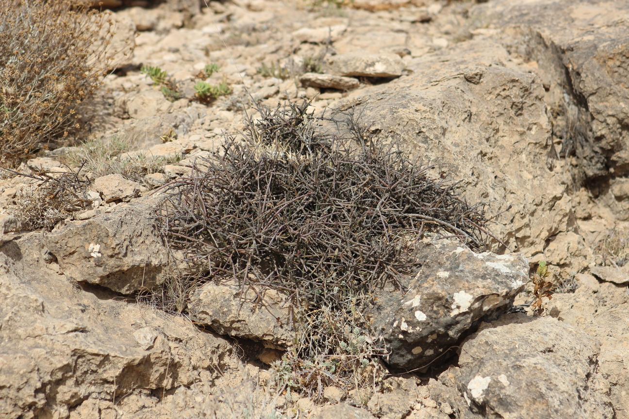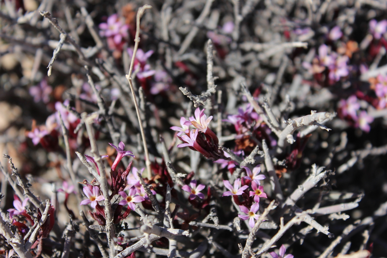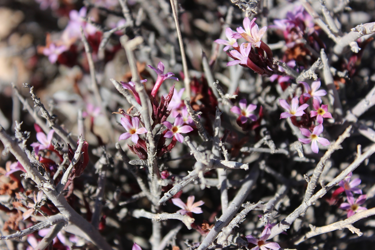 Subshrub or small shrub ; up to 1 m tall . Stems branched , semi-succulent , more or less leafless , grey-green , spinescent , glabrous to scabrid at base . Leaves sessile , 1–6 × 0 . 2–0 . 5 mm , linear to subulate , acute tip , glabrous , usually leafless . Inflorescences in terminal racemes ; pedicels ± 1 mm , glabrous ; bracts and bracteoles 0 . 5–1 . 5 mm , glabrous to ciliate . Flowers purple to reddish-purple to blue or white ; calyx 5-lobed , lobes 2–5 mm , linear , acute , ciliate ; corolla purple to reddish-purple to blue or white , glabrous outside ; tube 8–10 mm , bent in the lower third part , glabrous outside ; lobes 2–4 mm , ovate , acute , glabrous ; stamens 2 ; filaments glabrous ; anthers confluent . Fruit capsule , 4–5 mm , globose , reddish-brown . Seeds many , black . (Ref . Flora of Oman ; vol . 3) .