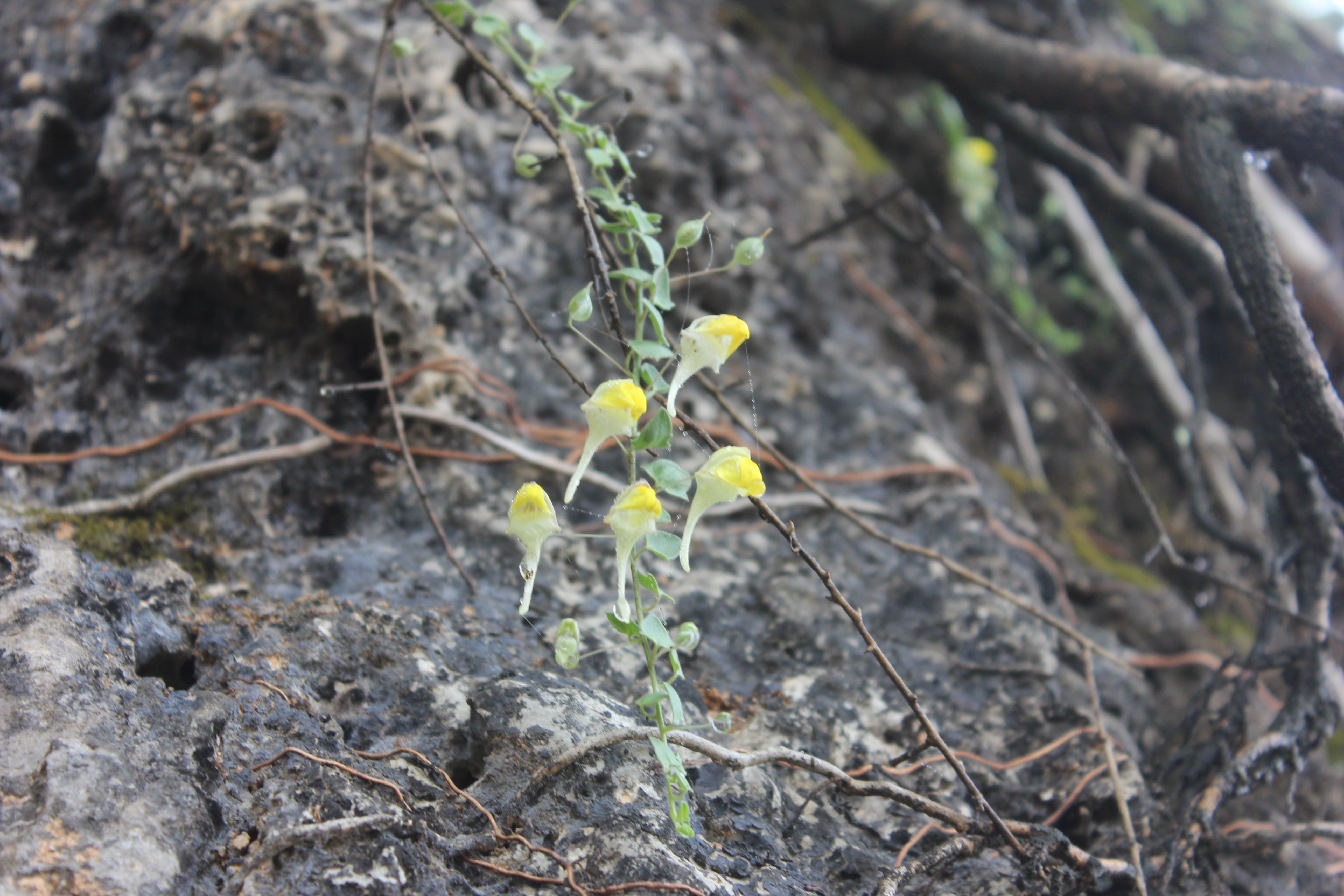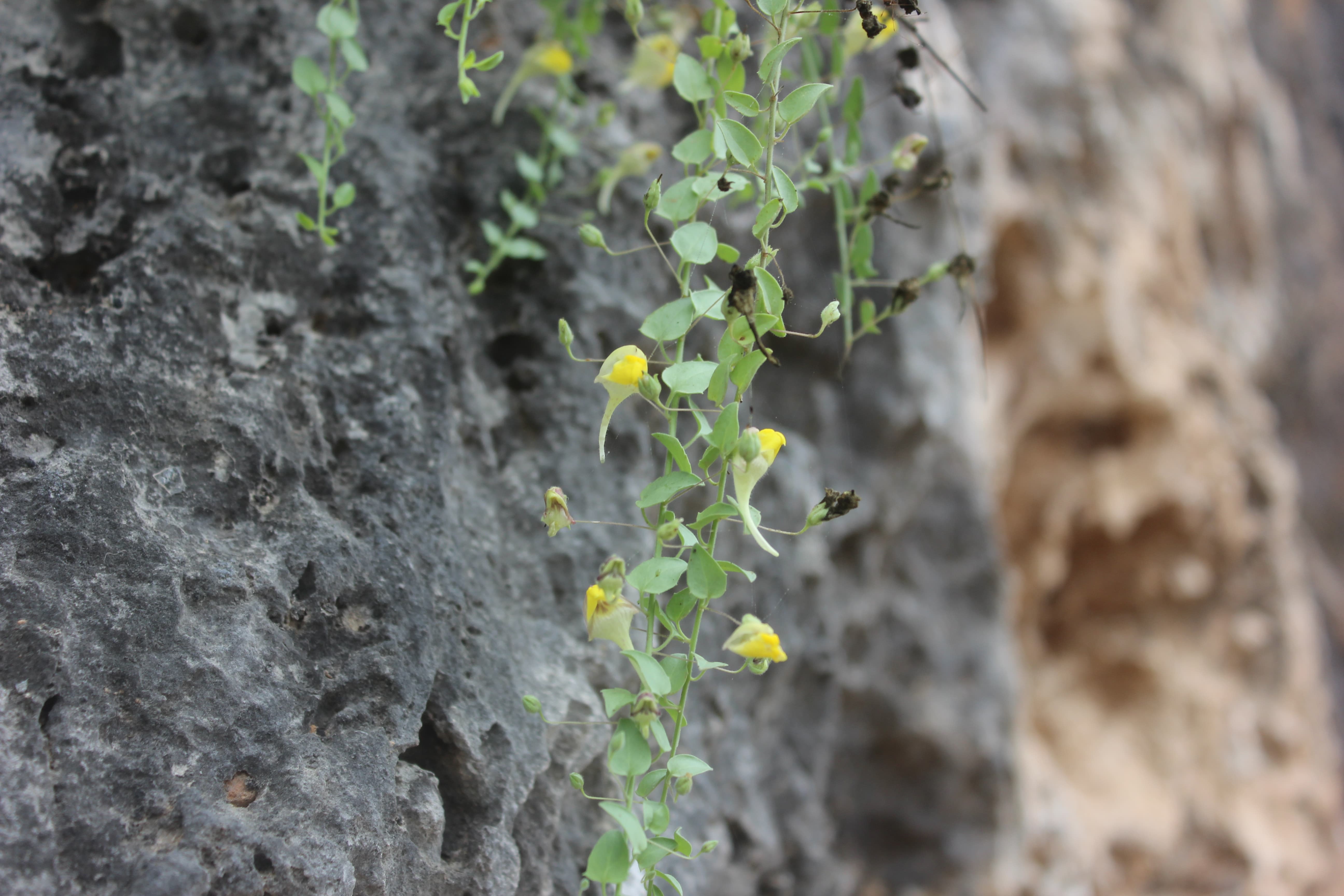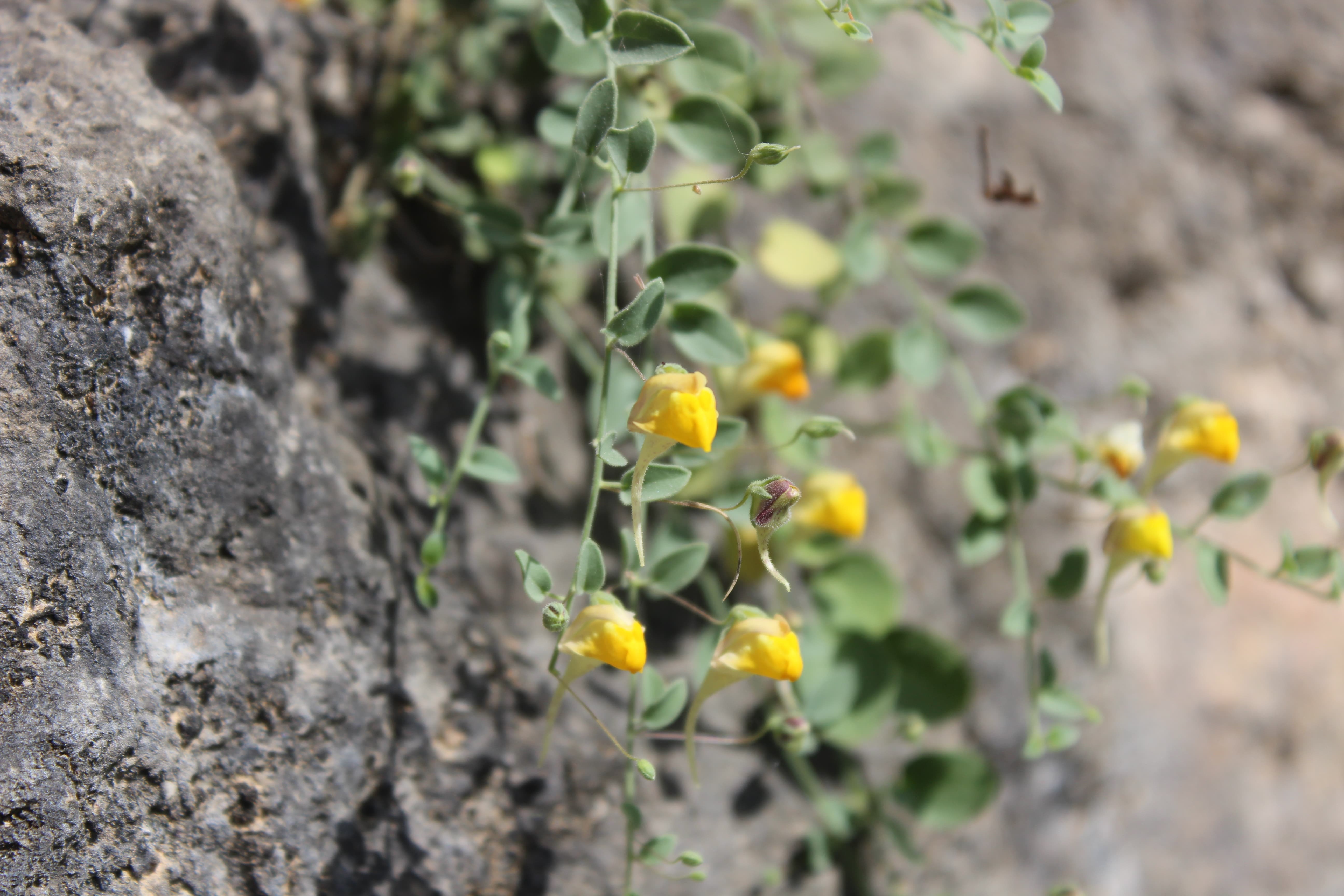 Perennial herb ; up to 25 cm high , glabrous or scabrid . Stems ± woody at base , much-branched , ascending , slender and spinescent above , scabrid to velutinous , sometimes glandular below . Leaves basal and upper ; basal leaves falling soon , (2–)5–12 × (1 . 5–)2 . 5–8 mm , ovate to oblong-elliptic , entire , apex obtuse , base rounded ; upper leaves 5–12 × 2–8 mm , decreasing in size upwards , deltate to lanceolate , sometimes linear , entire to shallow dentate , acute , base sagittate to hastate ; petiole 1–8 mm . Inflorescences axillary , present all along the stem on reddish , slender , stout pedicels 10–30 mm . Flowers greenish-yellow ; calyx 5-lobed , lobes 3–5 mm , narrow ovate with scarious margins , glandular-pubescent ; corolla 2-lipped , 17–24 mm long including spur , greenish-yellow , the lower lip darker yellow , occasionally the upper lip tinged red or purplish , glandular-pubescent , lower lip white-woolly inside ; tube 5–8 mm ; spur 13–16 mm , straight , glandular ; stamens 4 ; filaments hairy . Fruit capsule , 3–4 mm , oblong-ovoid , sparsely glandular . Seeds 0 . 5–0 . 7(–1) mm long ,