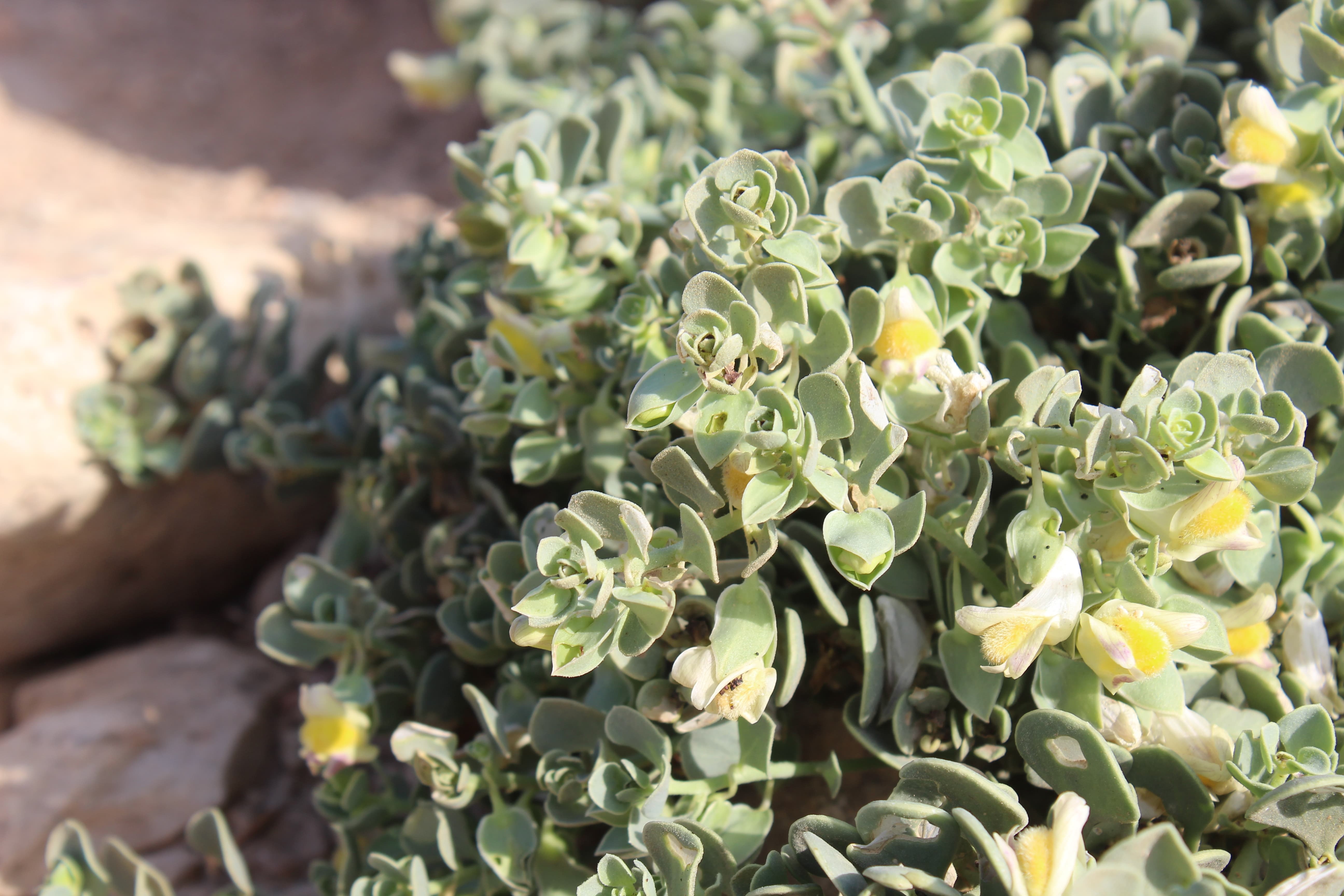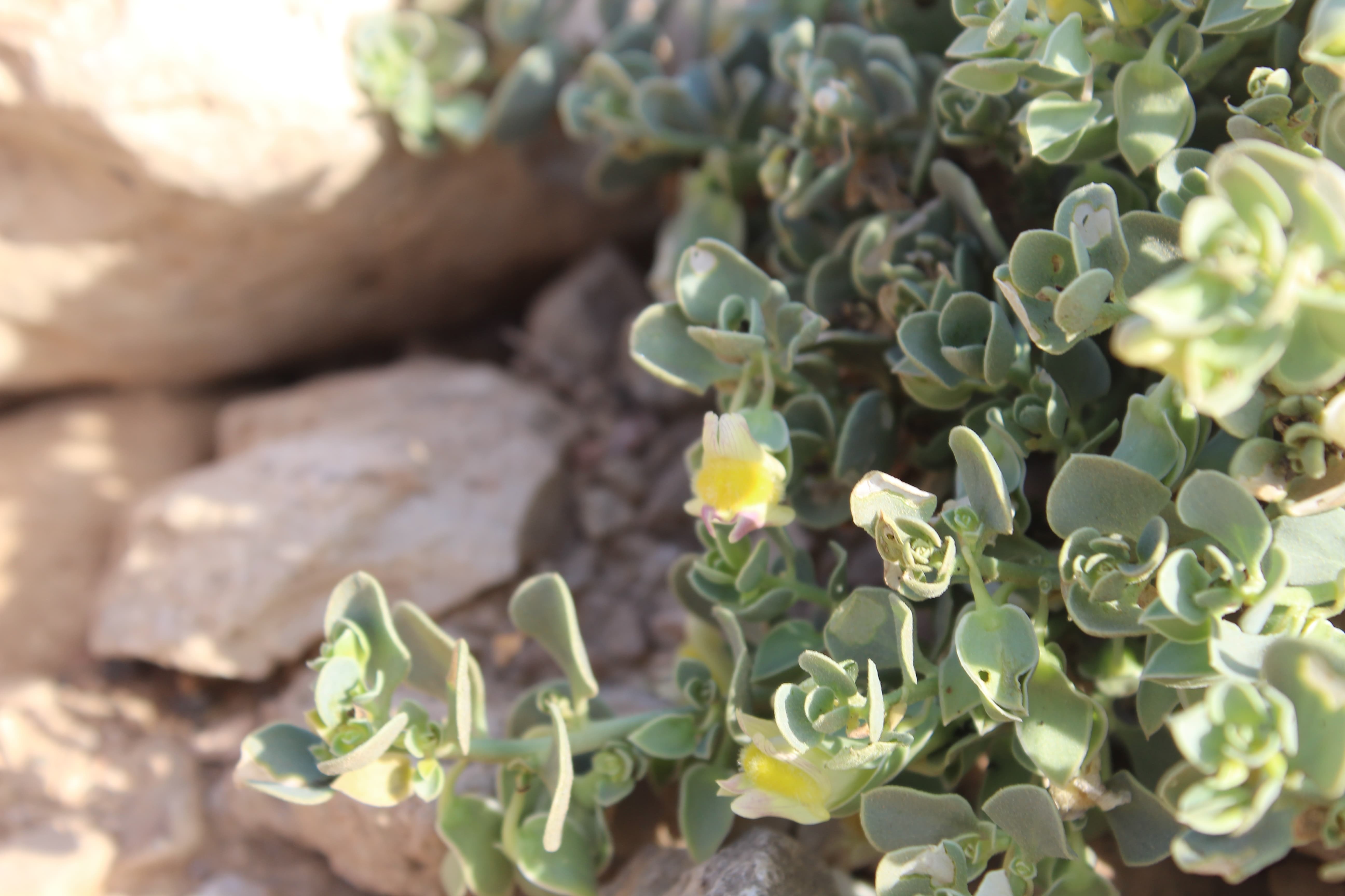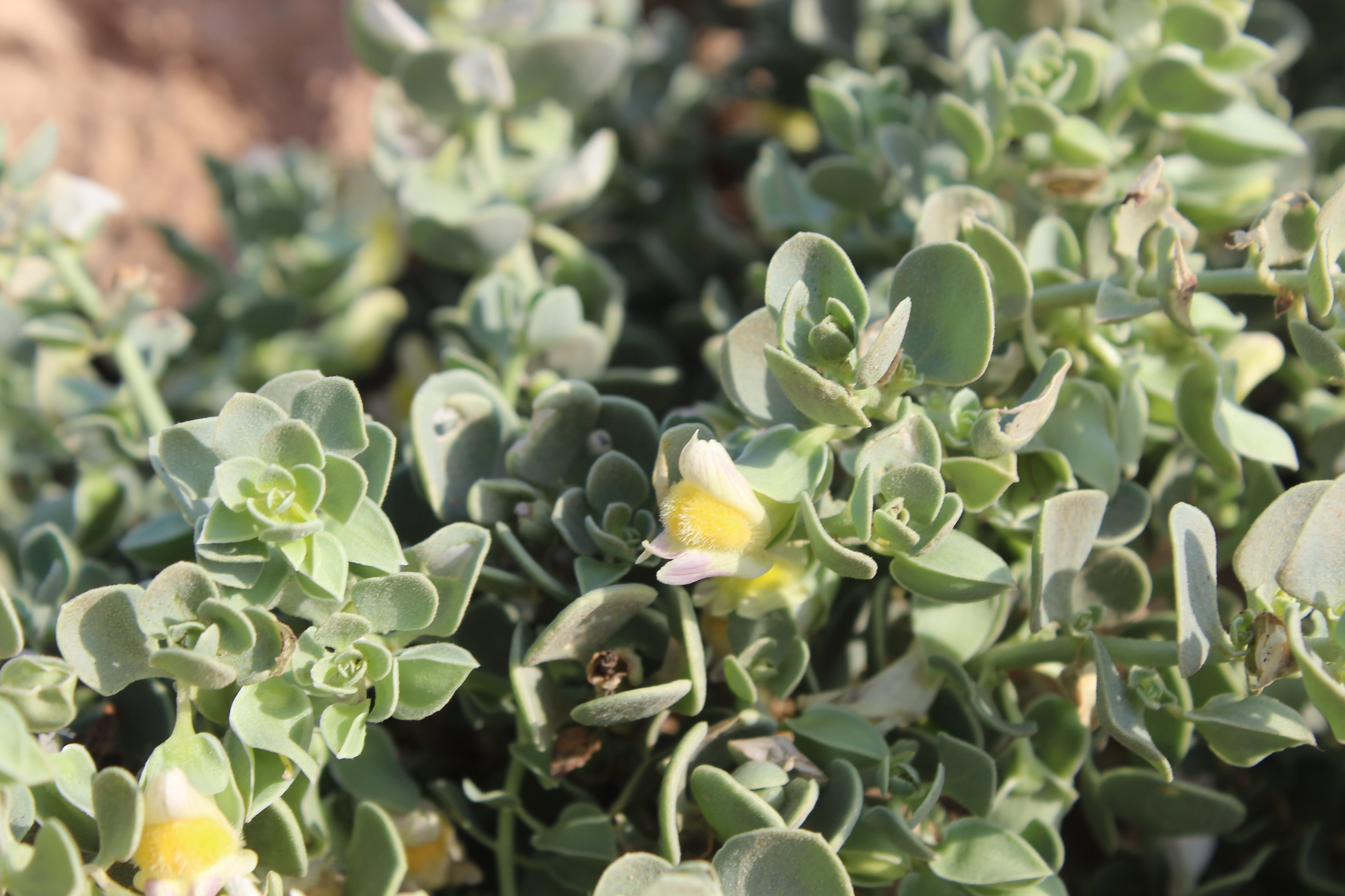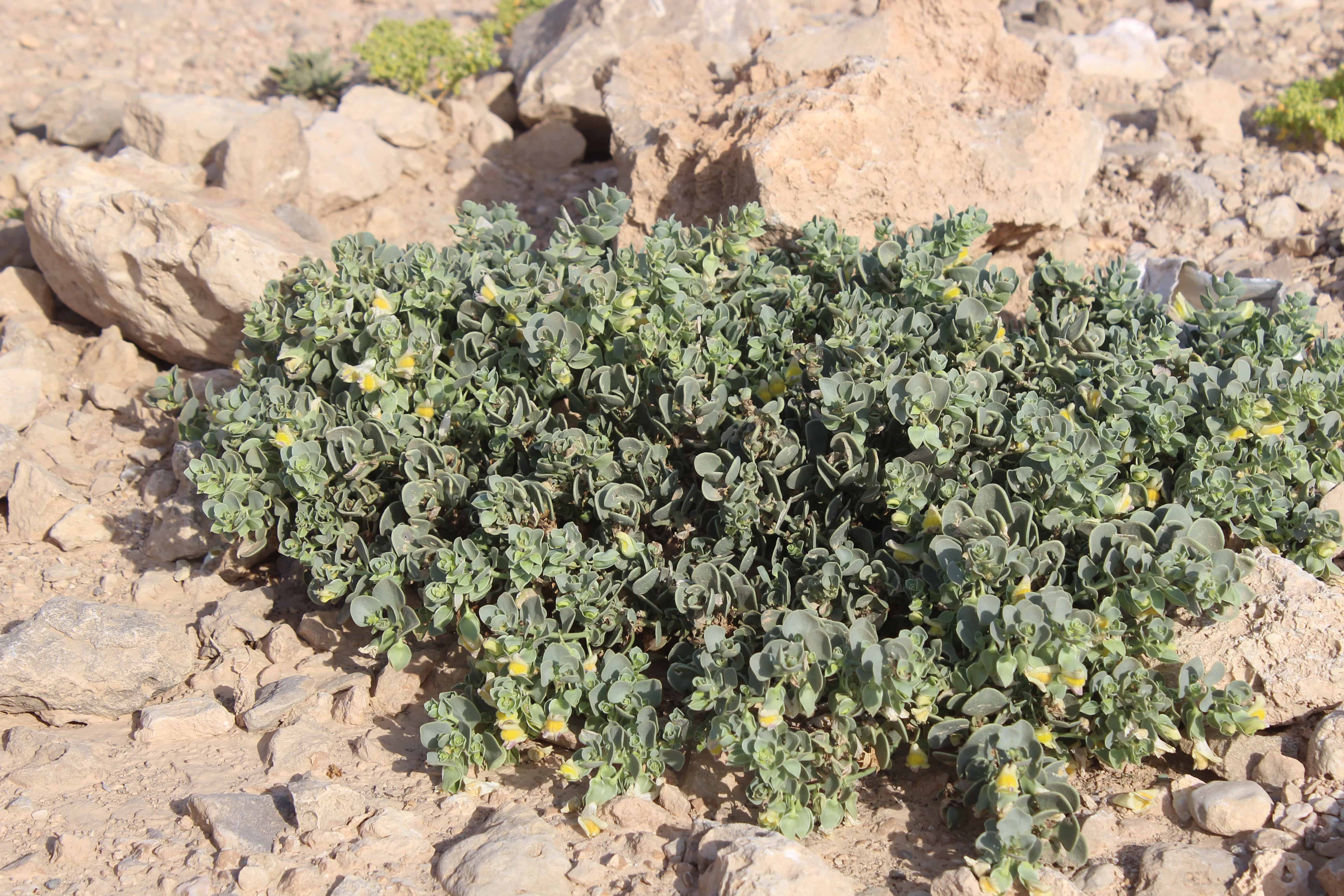 Erect annual herb ; up to 20–40 cm high . Stems branching profusely . Leaves opposite below , alternate above , 10–40 × 0 . 5–3(–5) mm , linear , somewhat fleshy , glabrous , obtuse , base gradually tapering into the petiole , ± 3–12 mm . Inflorescences solitary ; pedicels filiform , 8–14 mm , only the upper part recurving . Flowers pale lilac or pink with yellow palate ; calyx lobes unequal , 3–5 mm long , the upper longest , ovate-lanceolate , acute ; corolla pale lilac or pink with yellow on the palate , ± 7 mm , upper lip 2-fid , lower lip 3-fid with a prominent palate and with central lobe overlapping the laterals ; stamens 4 . Fruit capsule , 6 mm in diameter , nodding , with unequal locules , globose , dehiscing by irregular basal pore in the large locule . Seeds 1–1 . 5 mm long , ridged . (Ref . Flora of Oman ; vol . 3) .