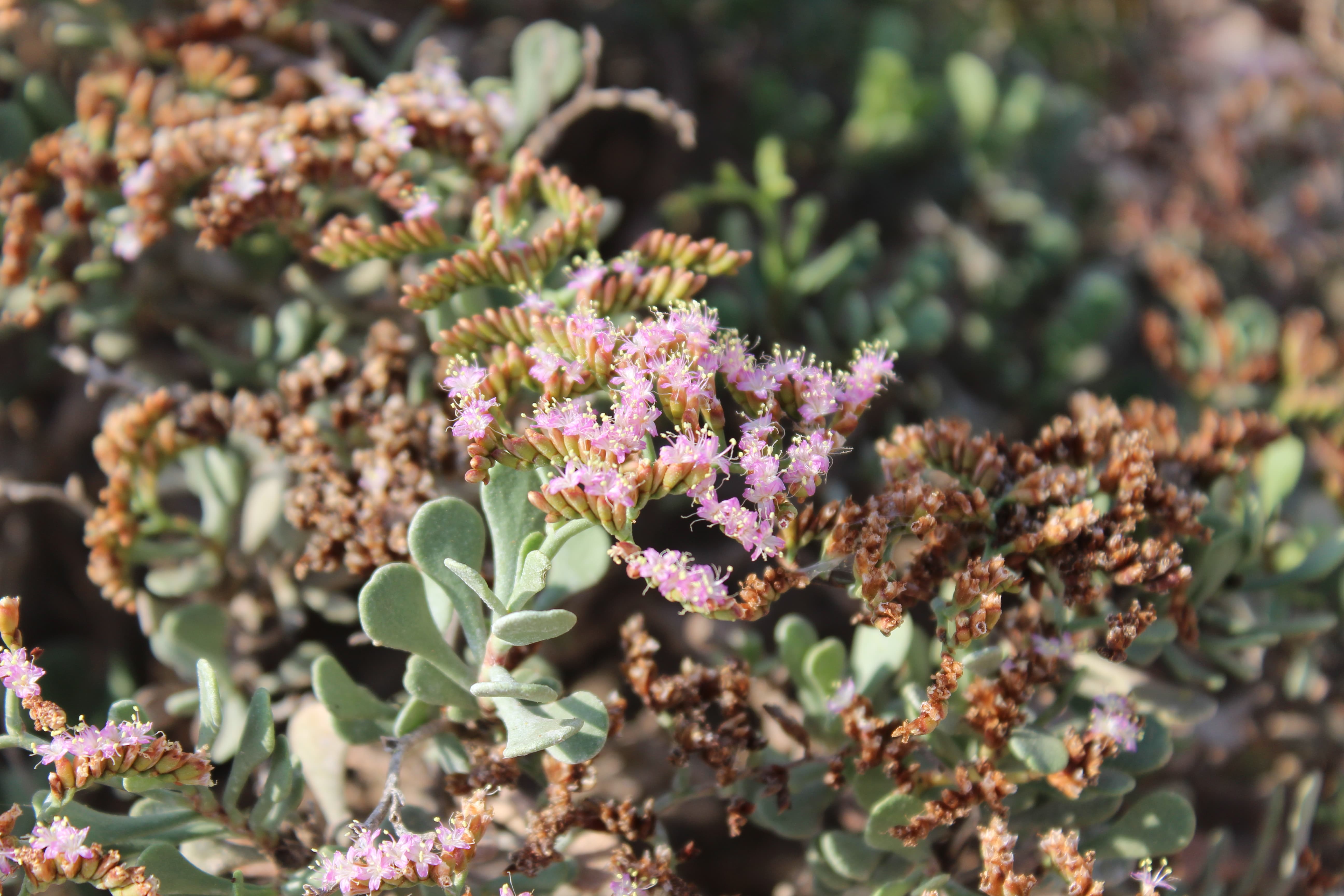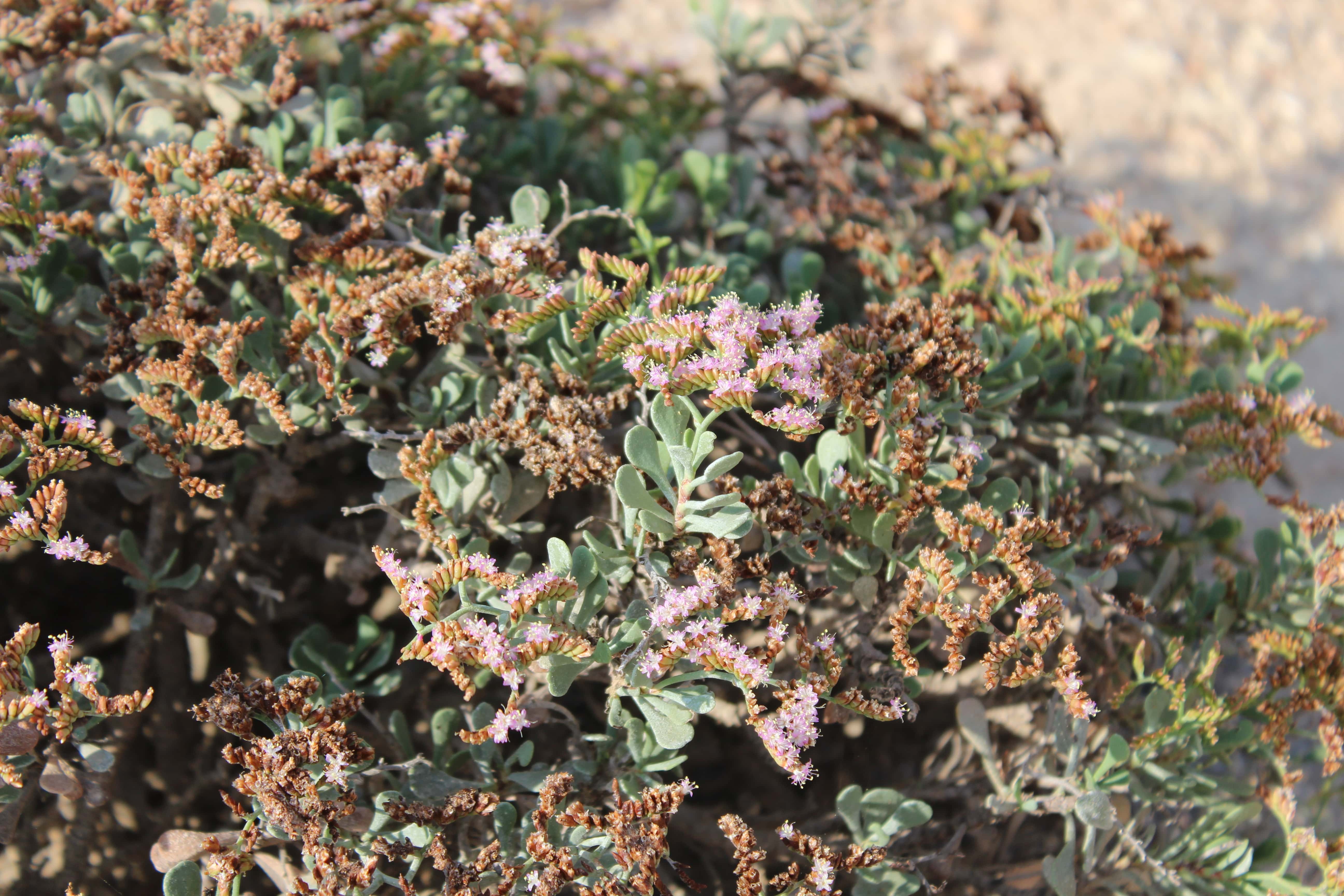 Perennial subshrub or shrub ; up to 30 cm high . Stems erect to ascending , woody , branched , spreading , older branches twisted and gnarled and leafless ; basal part of stems covered with old leaf bases . Leaves alternate , sessile to subpetiolate , 5-12 x 5-7 mm , saptulate to obovate , apex obtuse , base tapering , grey-green , covered with powdery salt . Inflorescences in small panicles of up to 3 cm . Flowers purple-pink , arranged in 2-flowered spikelets along the inflorescence ; each spikelet subtended by 2 bracts ; outer bract ± 1 mm , ovate , pink-brown ; bract subtending the two flowers c . 3 mm , glabrous , brown with a scarious margin ; inner flower subtended by another bract slightly shorter than the outer ; calyx infundibuliform , 1 . 5-2 mm , scarious , shallowly 5-lobed above , with 5 reddish-brown veins , pubescent ; petals purple-pink , 5 mm , oblong , fused below ; stamens 5 exceeding the petals . Fruit ± 1 mm , ovoid , enveloped by the persistent calyx , 1-seeded . (Ref . Flora of Oman ; vol . 1) .