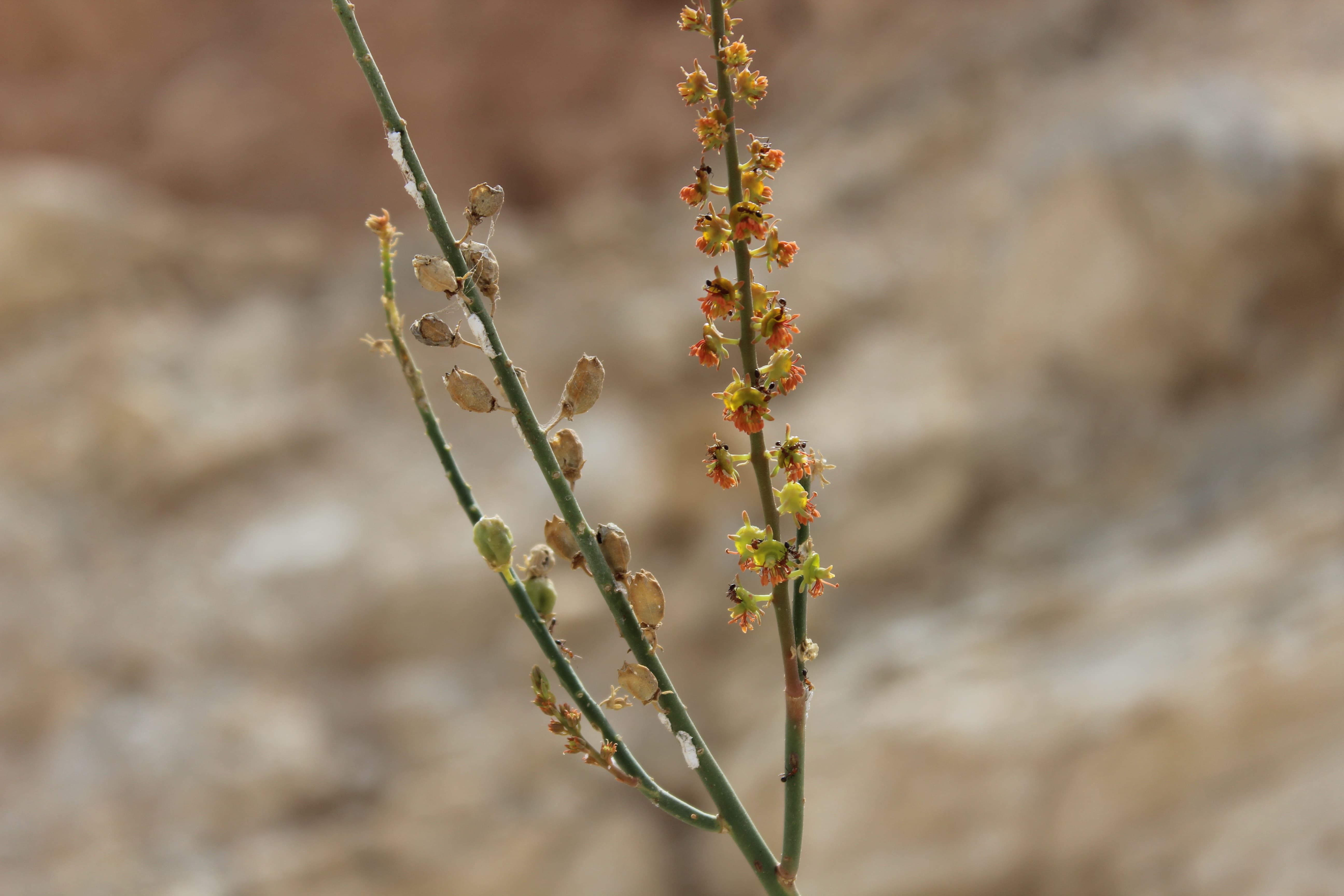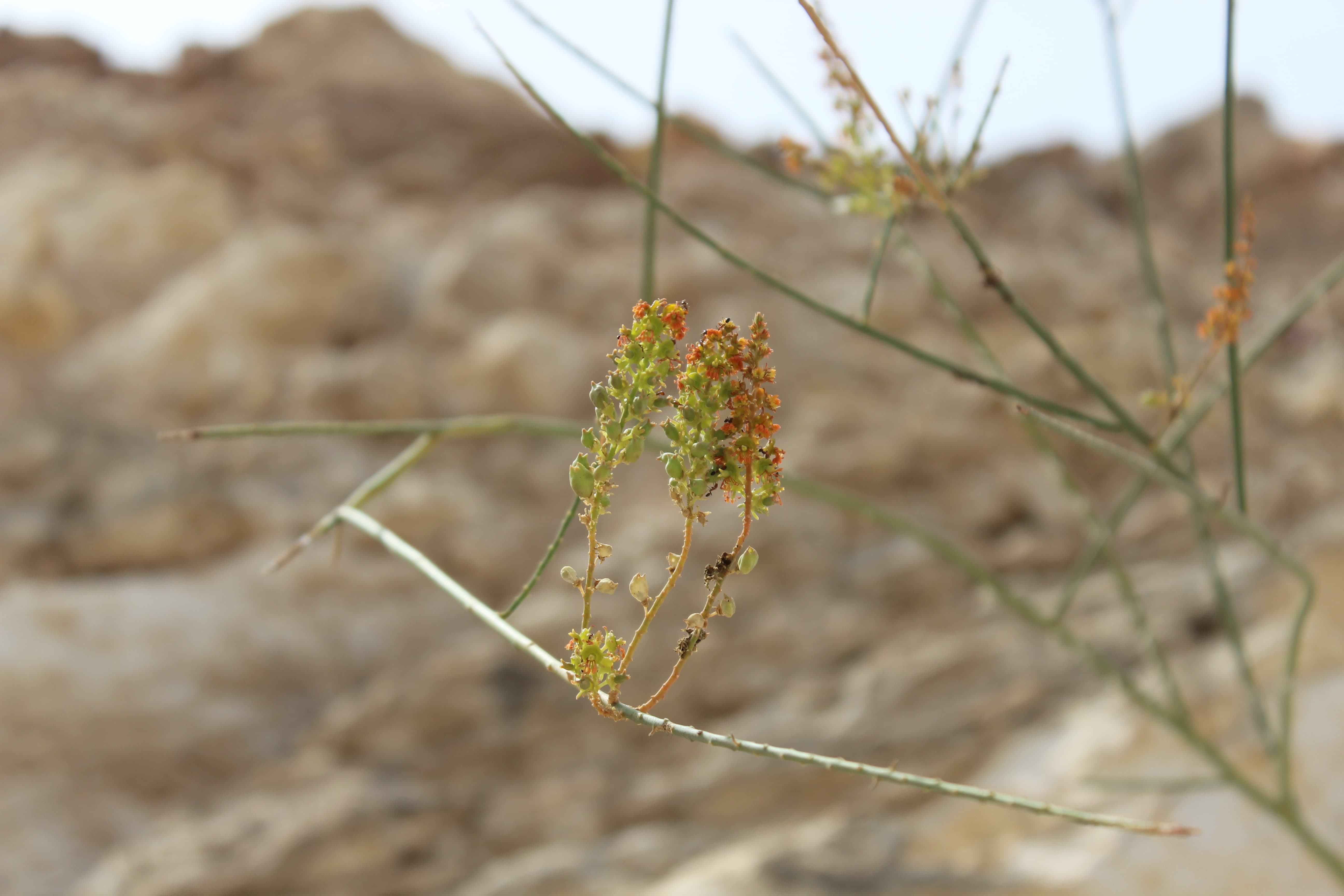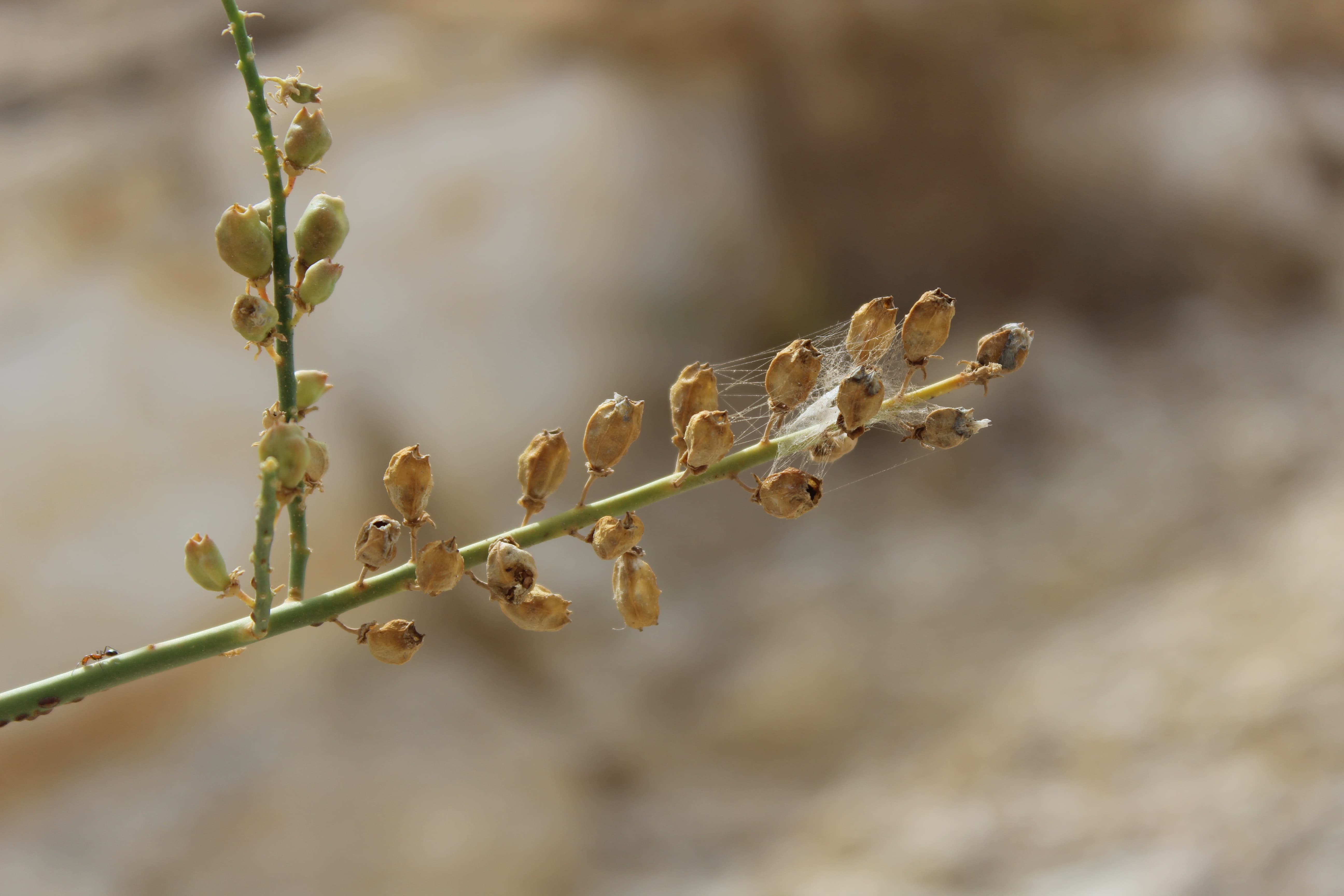 Deciduous , slender shrub ; up to 2 m tall . Stems and branches straight , ascending , glabrous throughout . Leaves 7-17 mm , rapidly deciduous , linear , sessile , with an acute apex . Inflorescences grouped in loose terminal racemes , 15-40 cm long . Flowers bisexual , sepals 6 , oblong ; petals 4 , with an ovate appendage ; disc double , cup-shaped , the inner part membranous , the outer fleshy ; stamens c . 25 . Fruit capsule , leathery , obovoid or subglobose , erect or ascending on a 4-5 mm pedicel . Seeds c . 1 . 5 x 1mm , dark-brown to black , dull , tuberculate . (Ref . Flora of Oman ; vol . 1) .