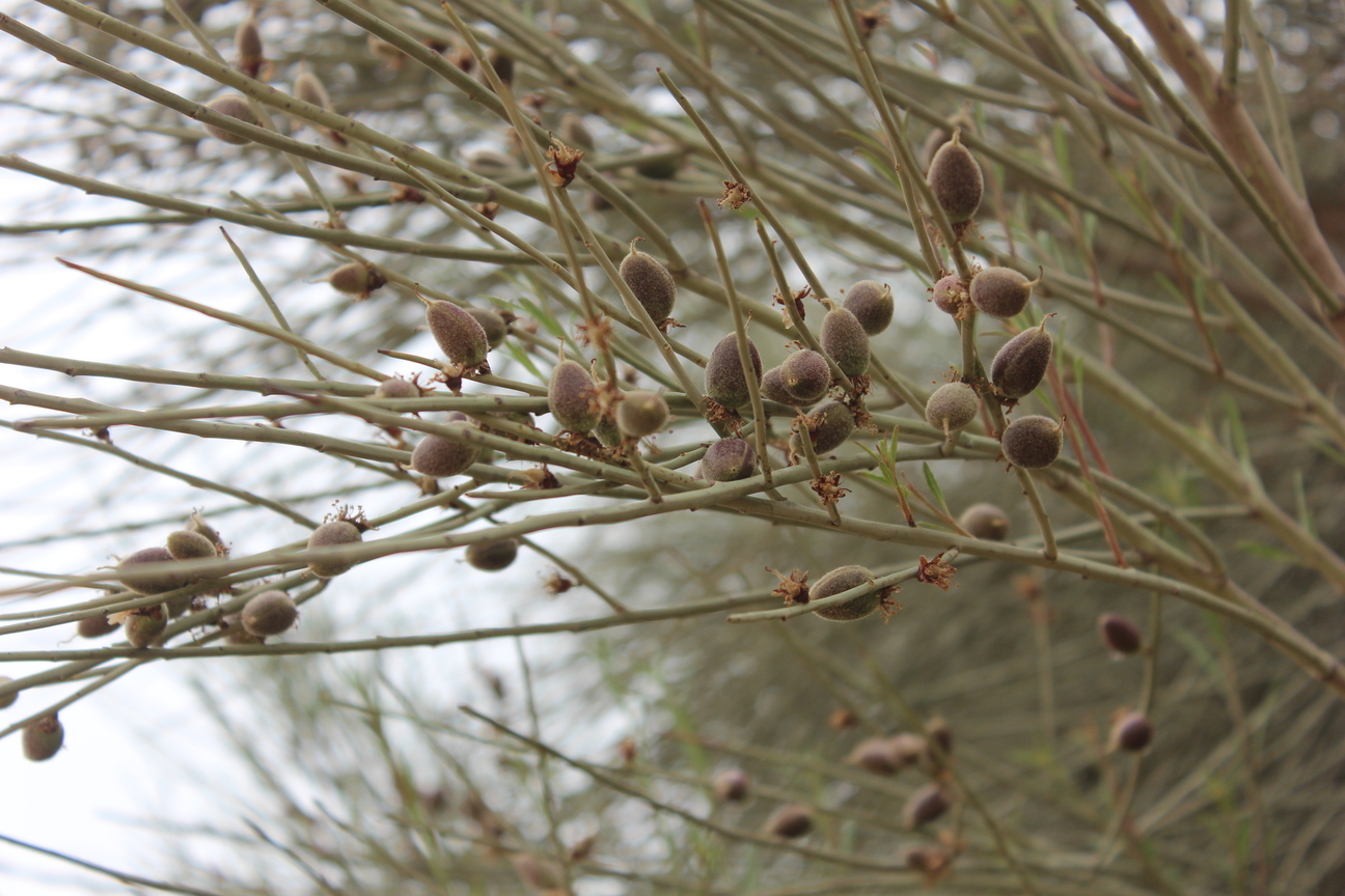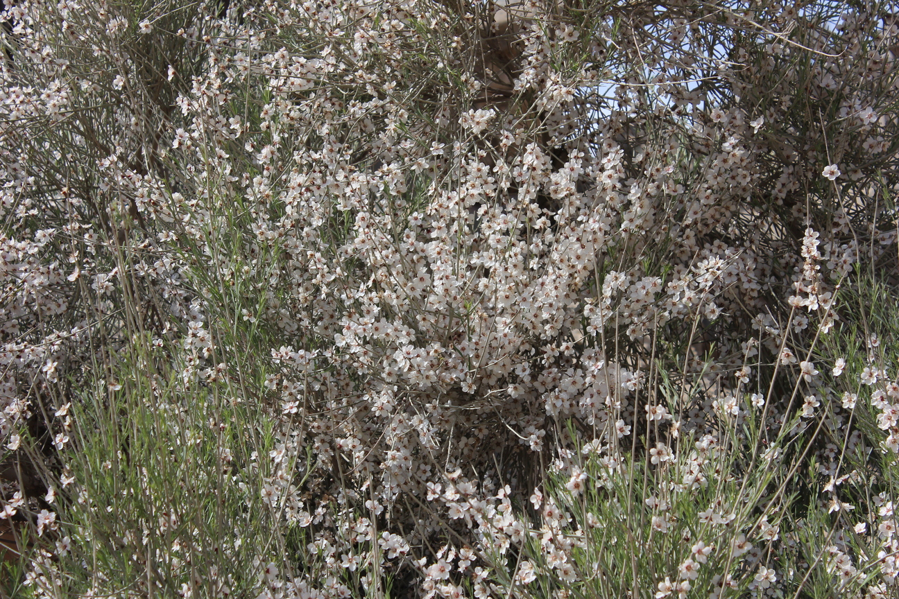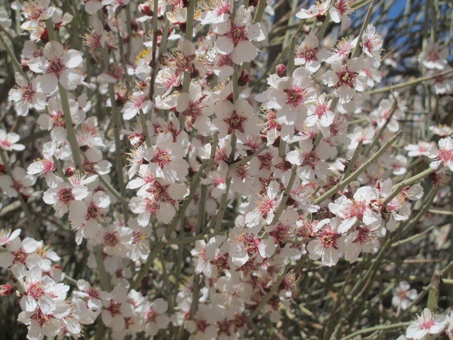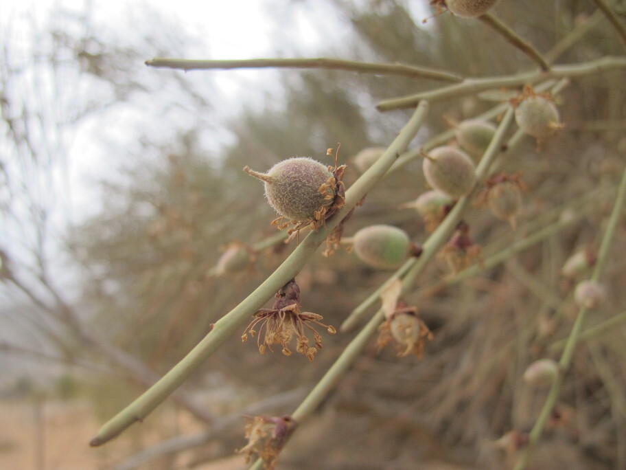 Unarmed broom-like shrub or small tree ; up to 2 . 5-4 m tall , with brown bark . Stems with green , glabrous , angled branches and ribbed twigs . Leaves falling soon , 10-30 x 1-3 mm , linear-lanceolate to linear-spathulate , tip acute , margin entire to irregularly crenate , glabrous or sparsely pubescent . Inflorescences solitary , sessile , appearing before the leaves . Flowers white or pale pink , 5-10 mm ; sepals 3-4 mm , ovate , deciduous ; petals pink to pale pink , 5-10 mm , obovate . Fruit drupe , ovoid , 1 . 5-2 . 5 cm , ovoid , apiculate , grey-green to brown-green , pubescent , leathery ; stone smooth . (Ref . Flora of Oman ; vol . 2) .