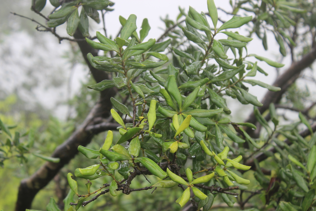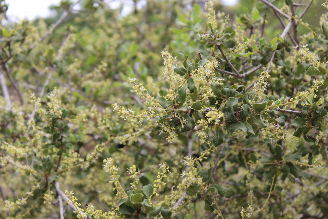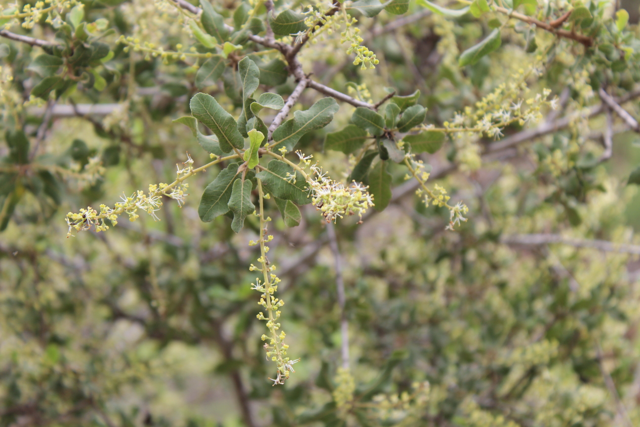 Small tree ; up to 5m . Bark grey . Leaves alternate , simple , oblong or obovate to oblong-lanceolate , margin sharply crenate , entire and undulate , apex shortly acuminate , base oblique , glabrous with pubescent on the nerves , pubescent beneath . Flowers cream , monoecious , in axillary spikes . Fruit 3-lobed , with usually only one of the three lobes developing , globose , pubescent , reddish brown , dehiscing along a longitudinal ridge .