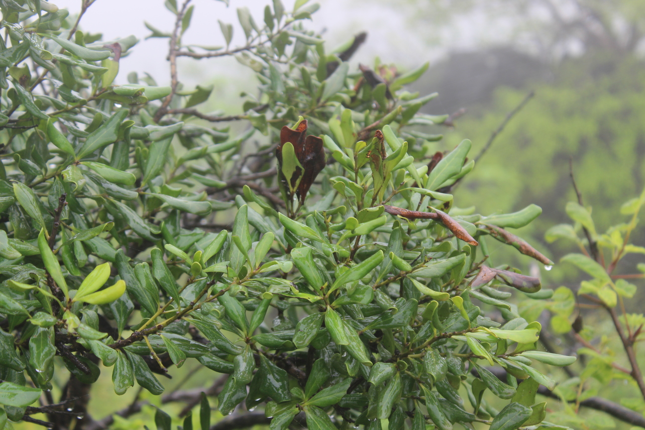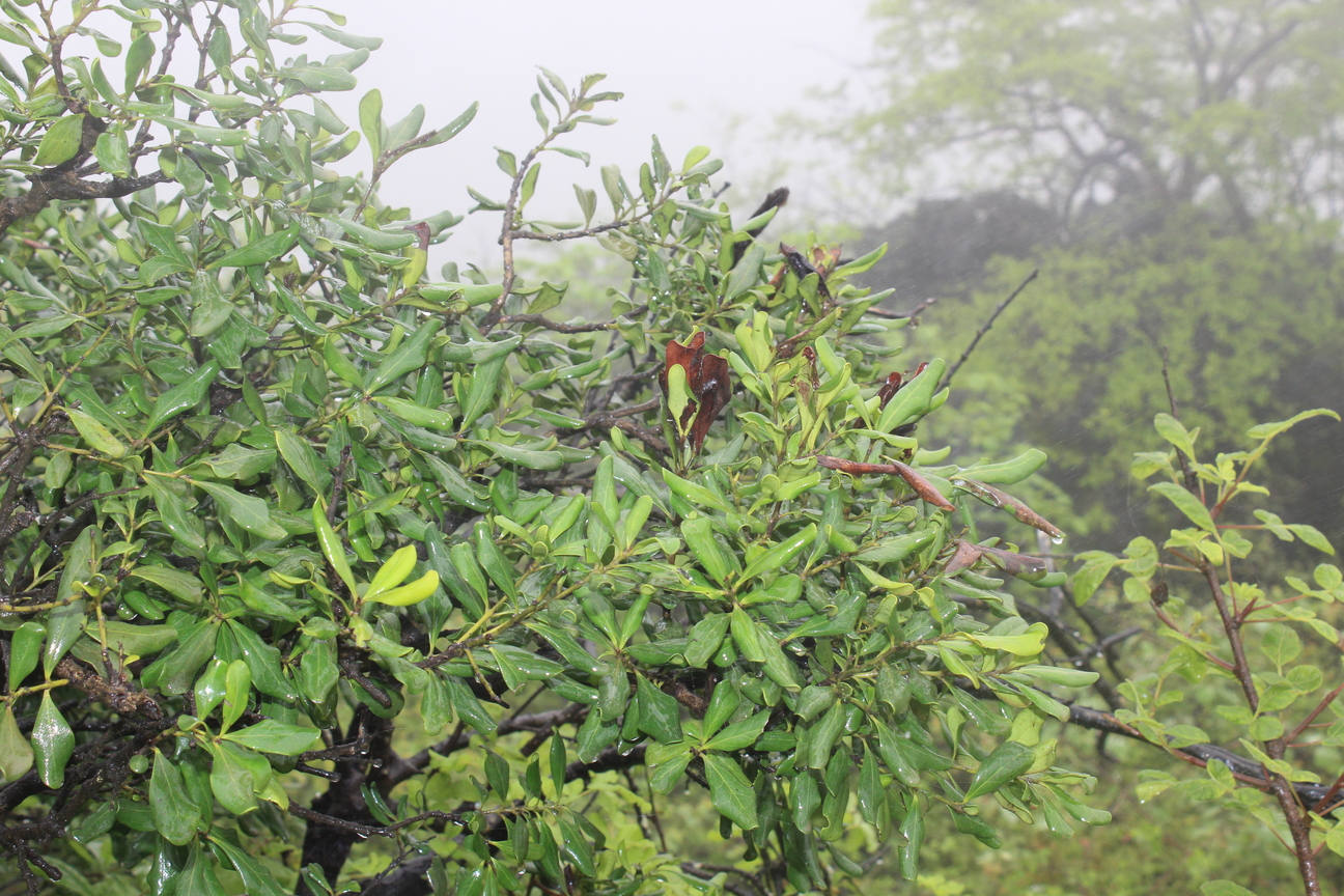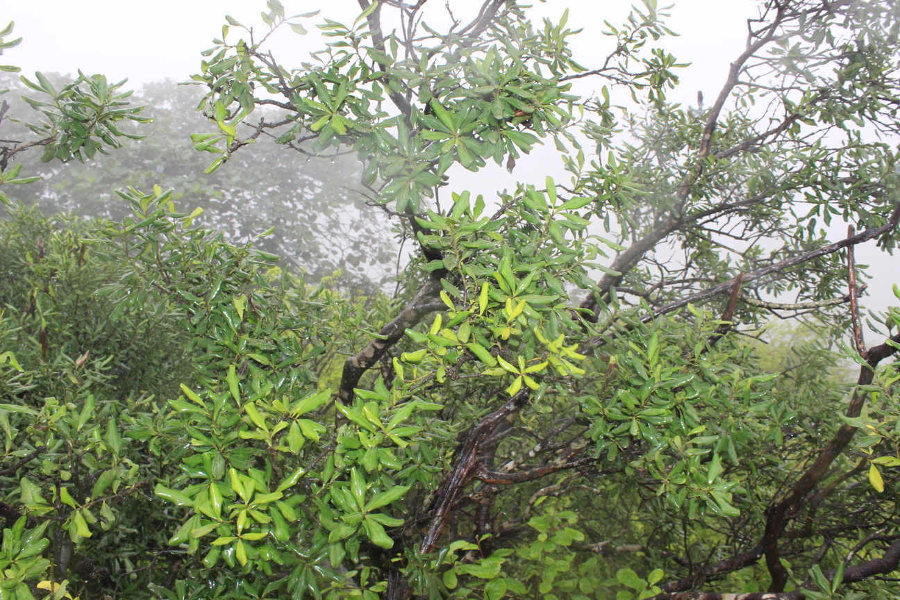 Small tree ; up to 5m . Bark grey . Leaves alternate , simple , oblong or obovate to oblong-lanceolate , margin sharply crenate , entire and undulate , apex shortly acuminate , base oblique , glabrous with pubescent on the nerves , pubescent beneath . Flowers cream , monoecious , in axillary spikes . Fruit 3-lobed , with usually only one of the three lobes developing , globose , pubescent , reddish brown , dehiscing along a longitudinal ridge .
